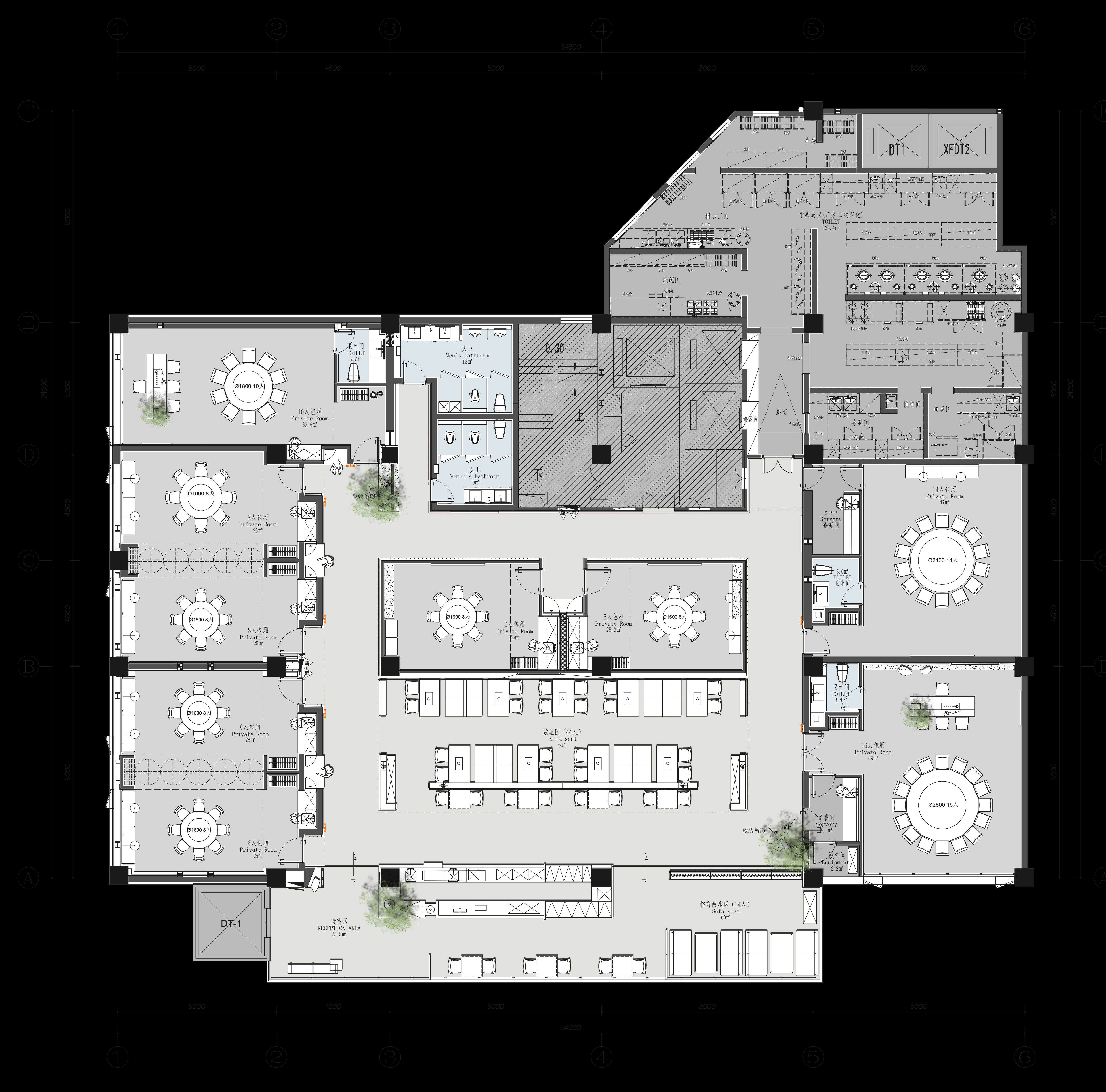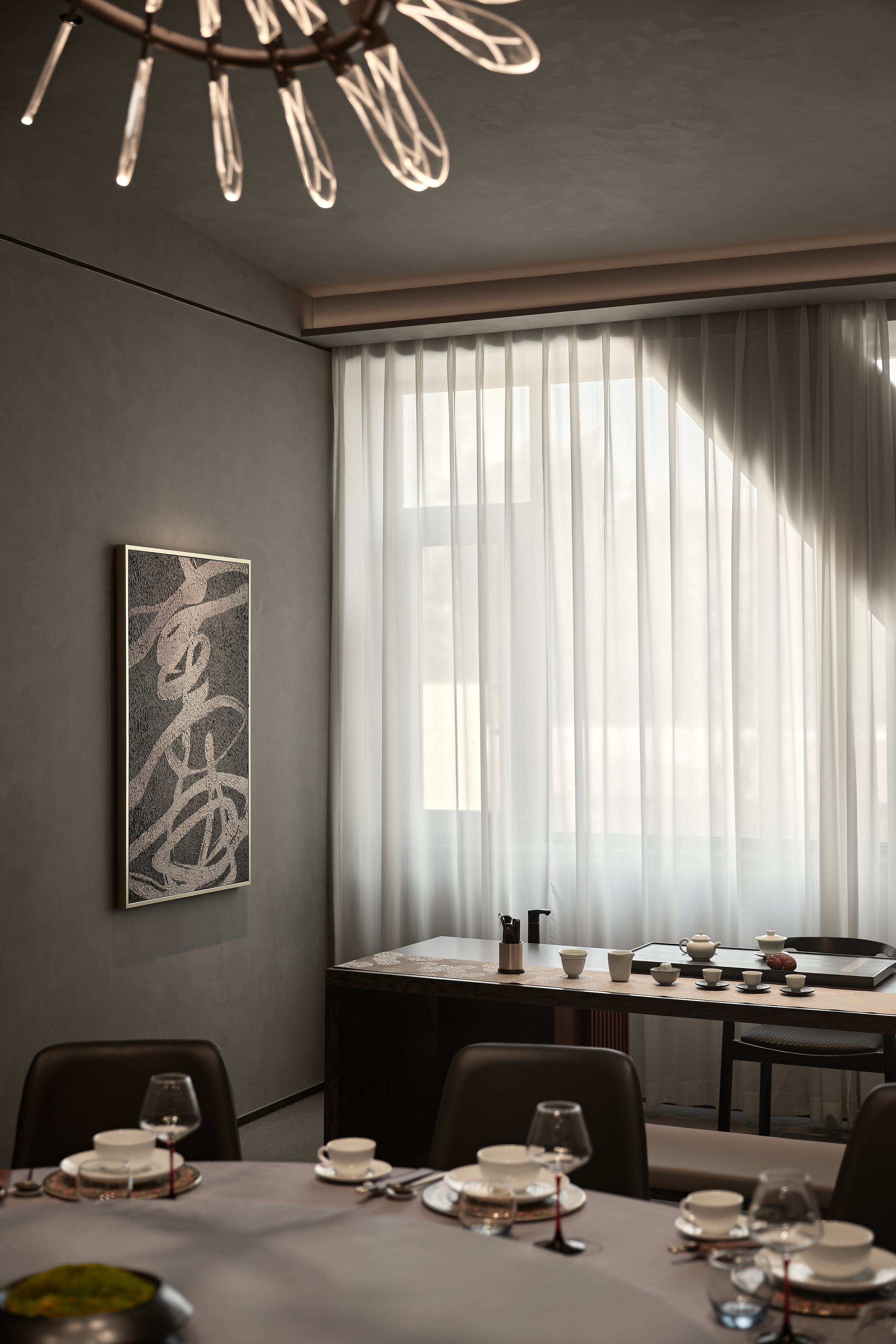 空间意境:通过空间的自然光影以及现场条件,局部融入了建筑手法和绿植元素穿插,以精致而高级的细节,奢华与厚重的对比,让空间的气质更加浓厚,带来一种艺术之美。从颜色的配比到材质的使用,再到线条的细节打磨,在承袭经典文化特征的同时,融合了城市新的生活风尚,为其营造出一个既在意料之中,又在意料之外的就餐环境,每一处场景都随着情感的层层递进。