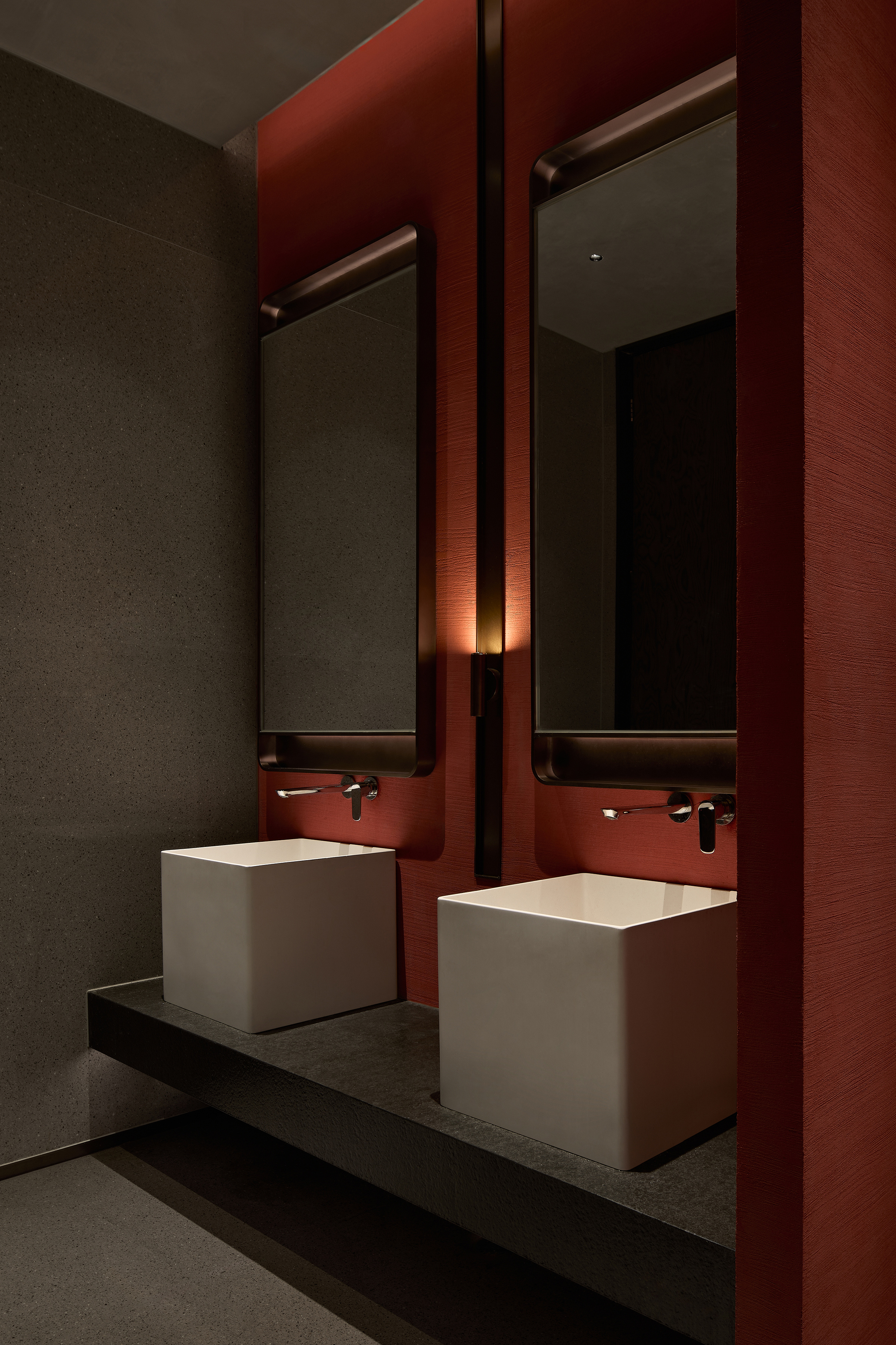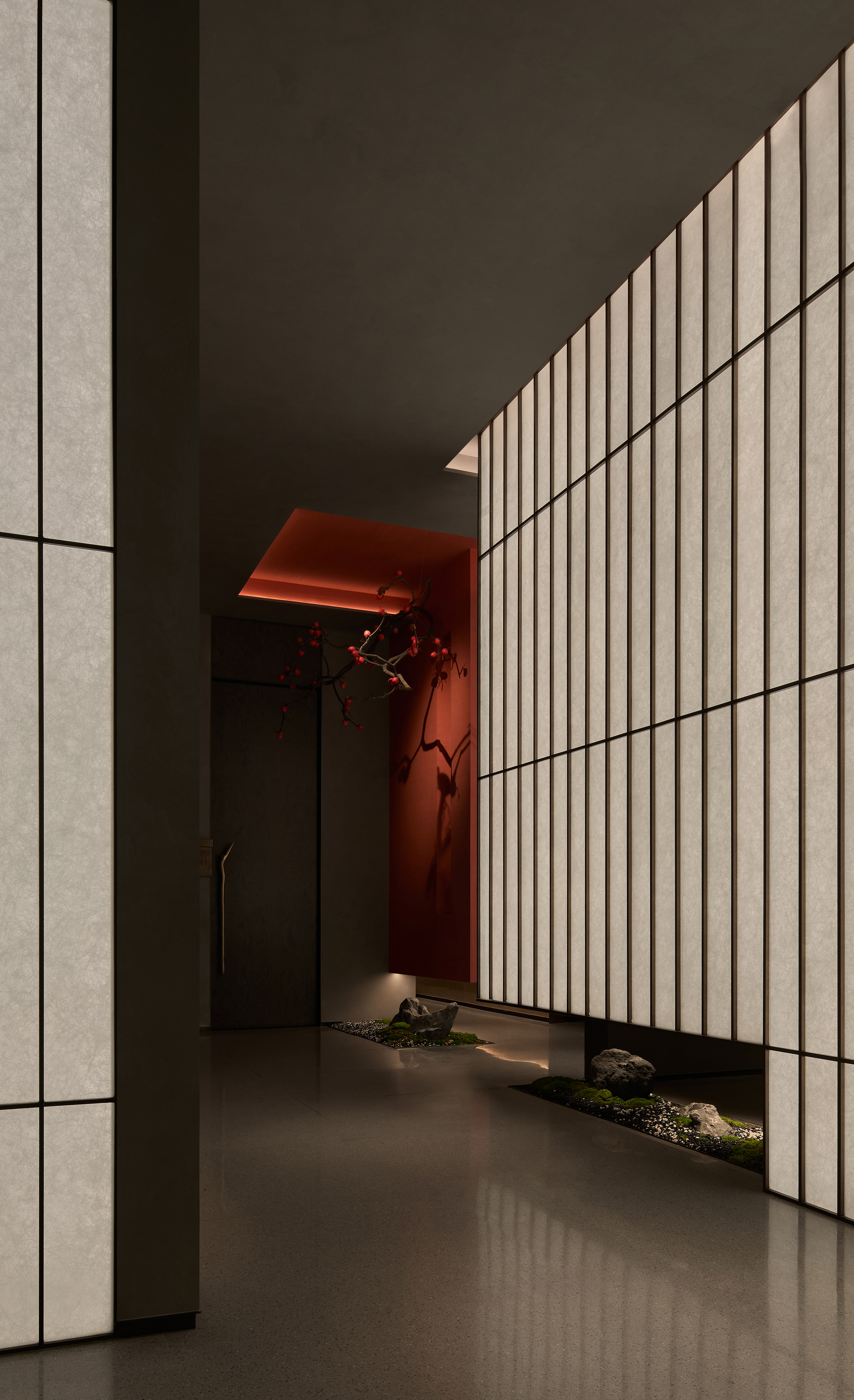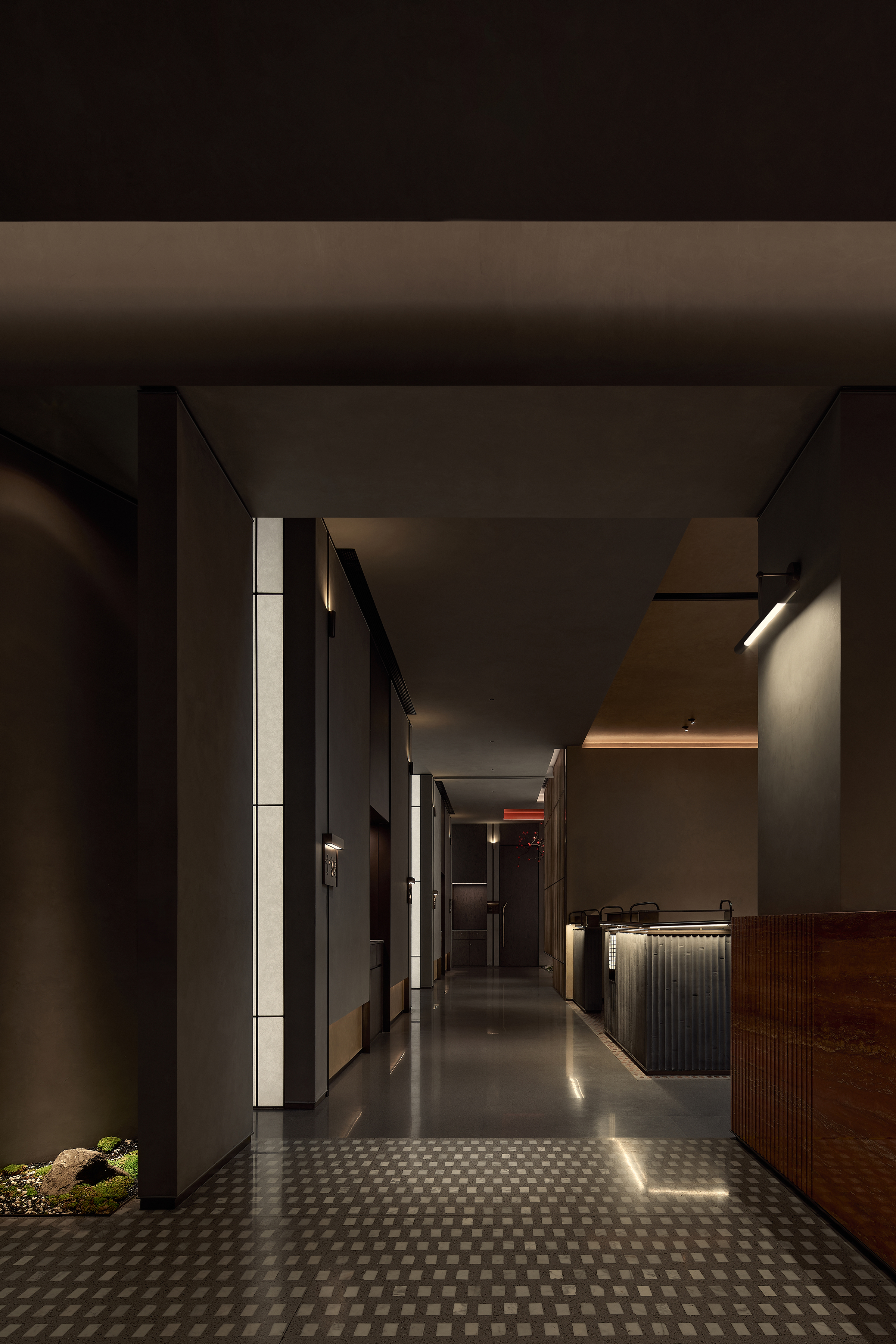 设计选材:本案提取西安斑驳历史里的乌金黑、鎏金、厚重灰、赭石红等传统东方元素作为空间的色彩体系,并以此为切入点保证造价可控的情况下,结合材质本身的特质选取了柔和的红洞石、细腻的仿铜材质和粗犷的灰色竹模混凝土板;共同构成了去繁从简、内敛含蓄的空间印象。