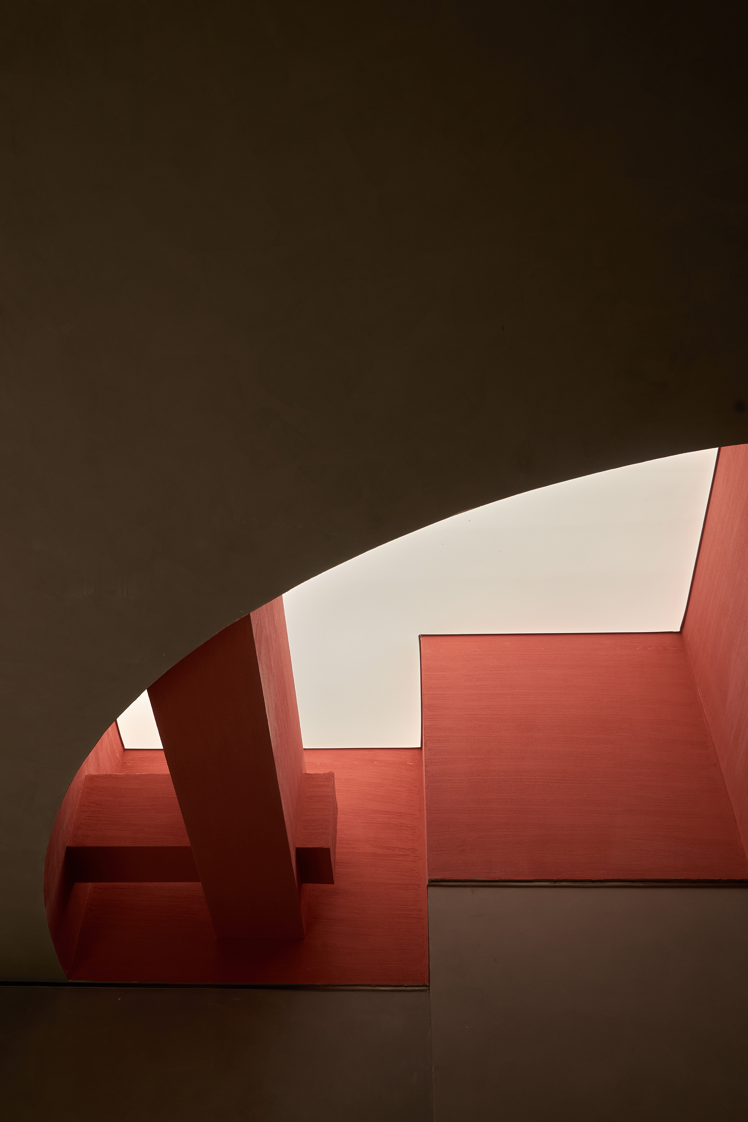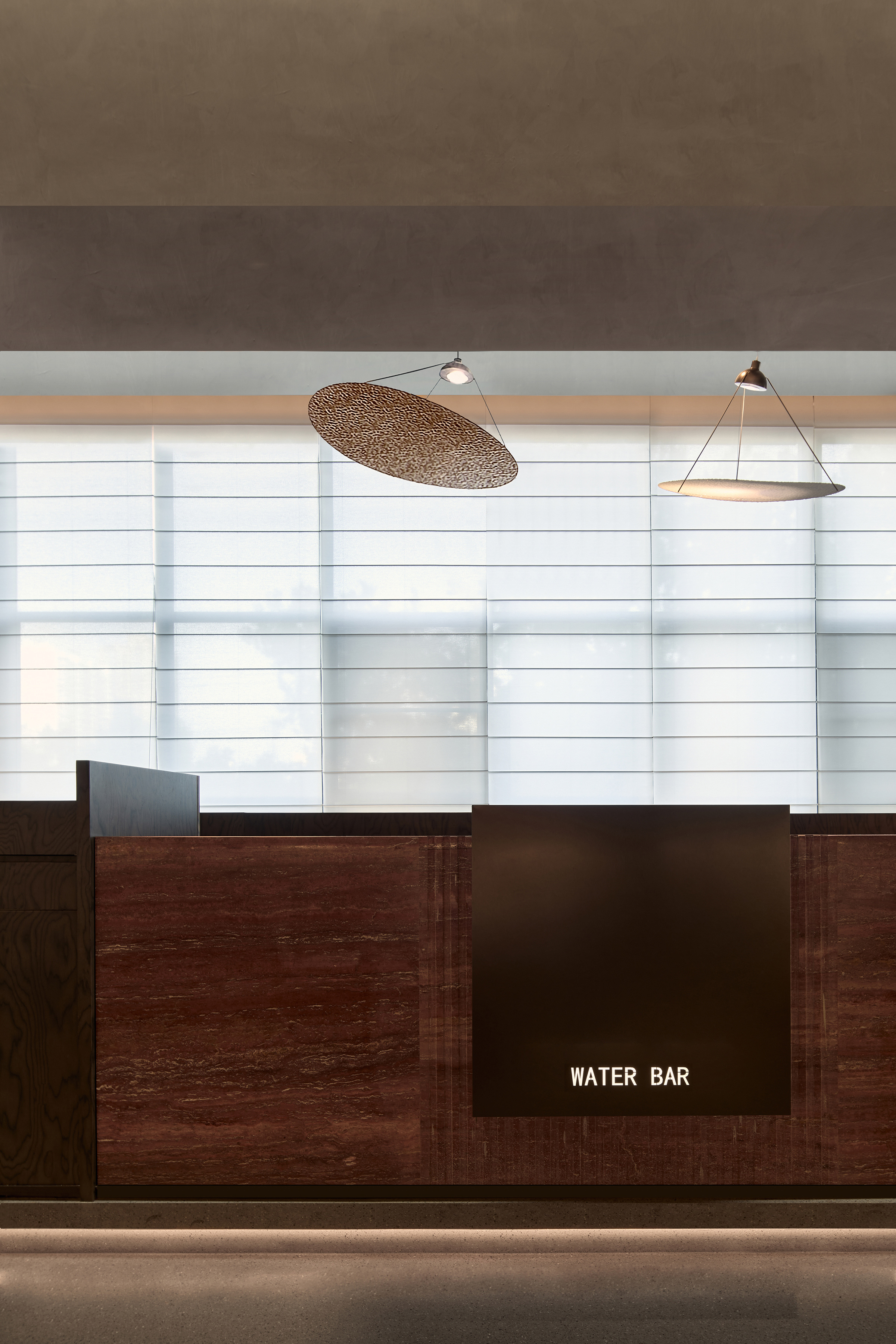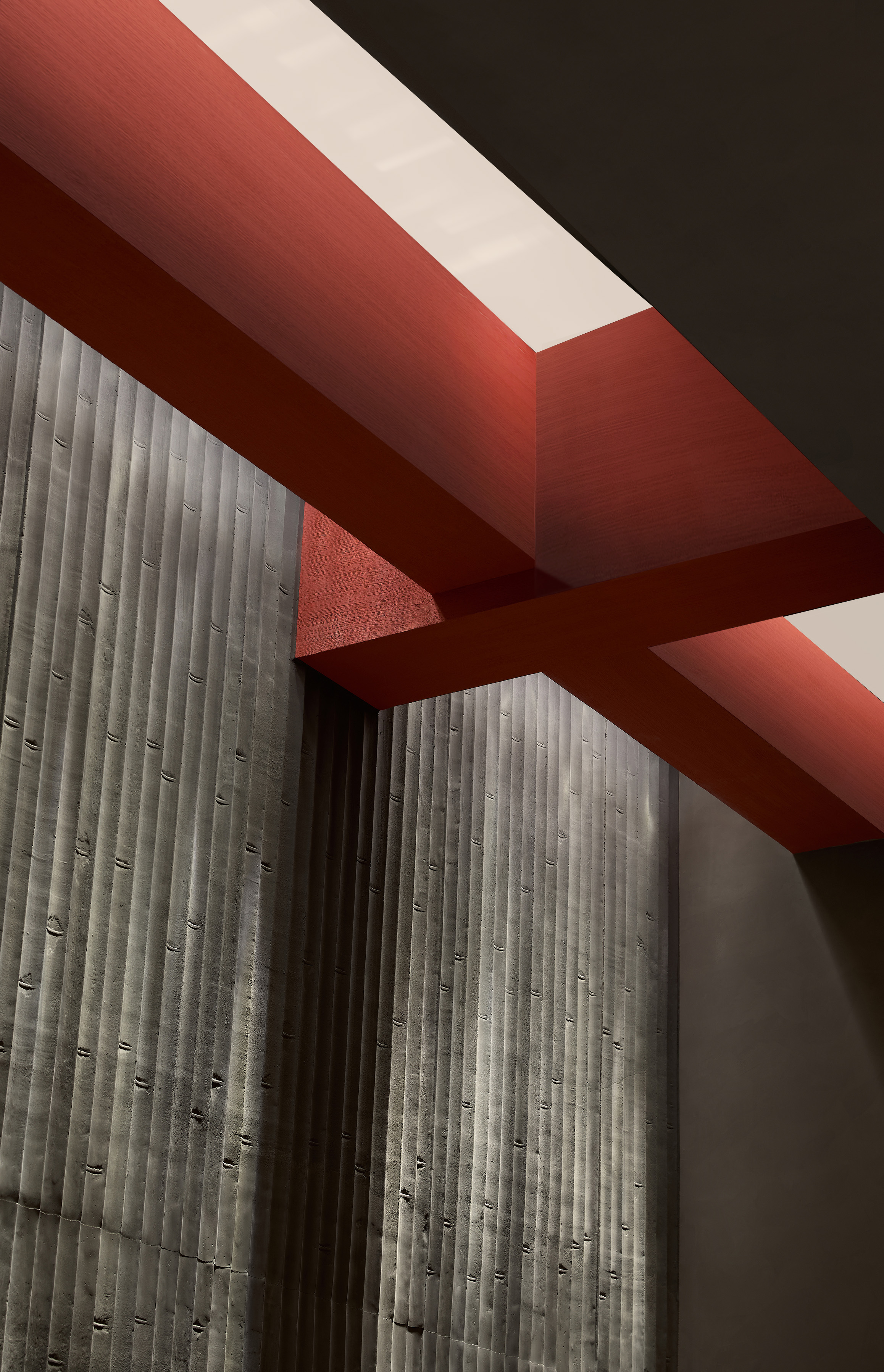设计选材:本案提取西安斑驳历史里的乌金黑、鎏金、厚重灰、赭石红等传统东方元素作为空间的色彩体系,并以此为切入点保证造价可控的情况下,结合材质本身的特质选取了柔和的红洞石、细腻的仿铜材质和粗犷的灰色竹模混凝土板;共同构成了去繁从简、内敛含蓄的空间印象。