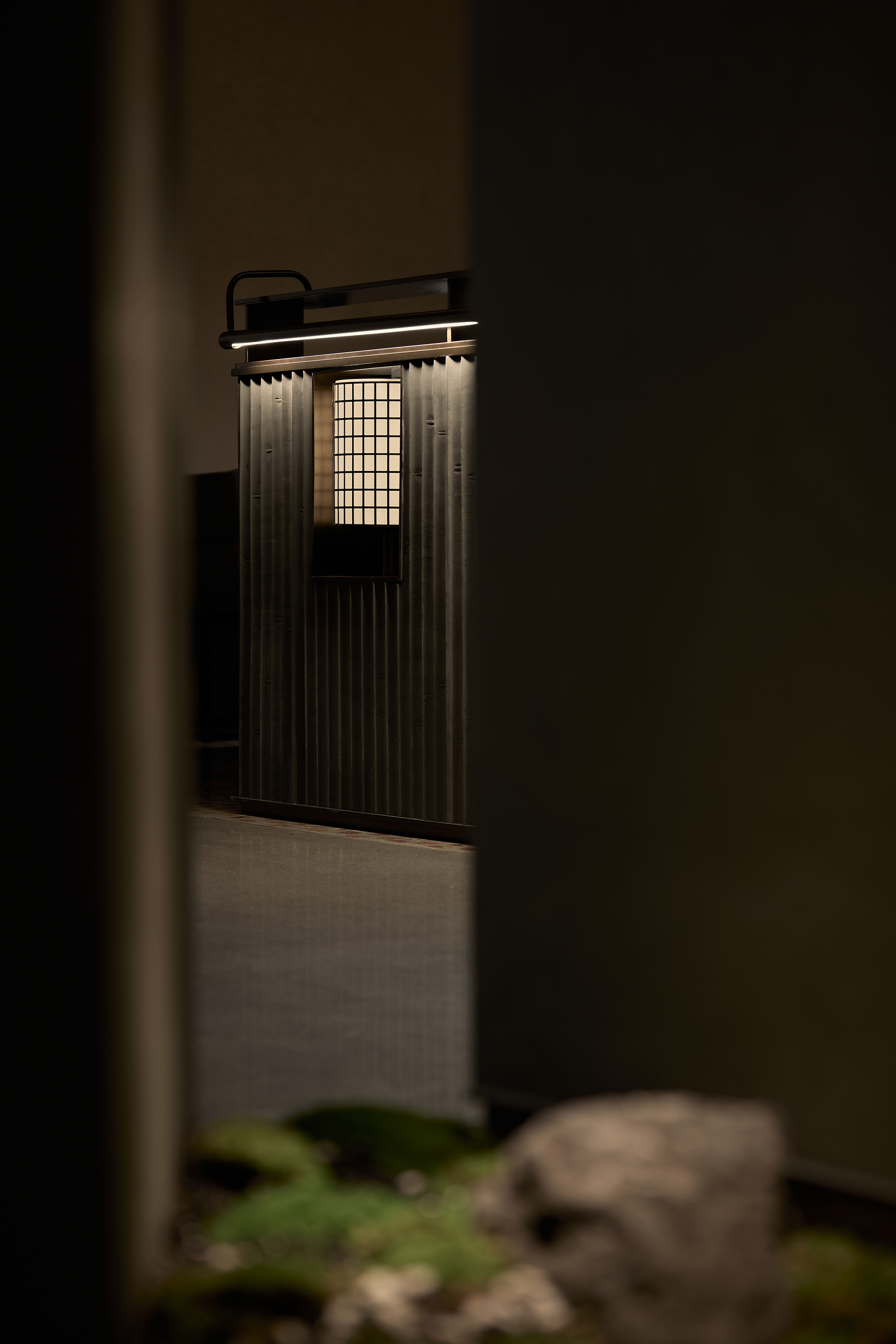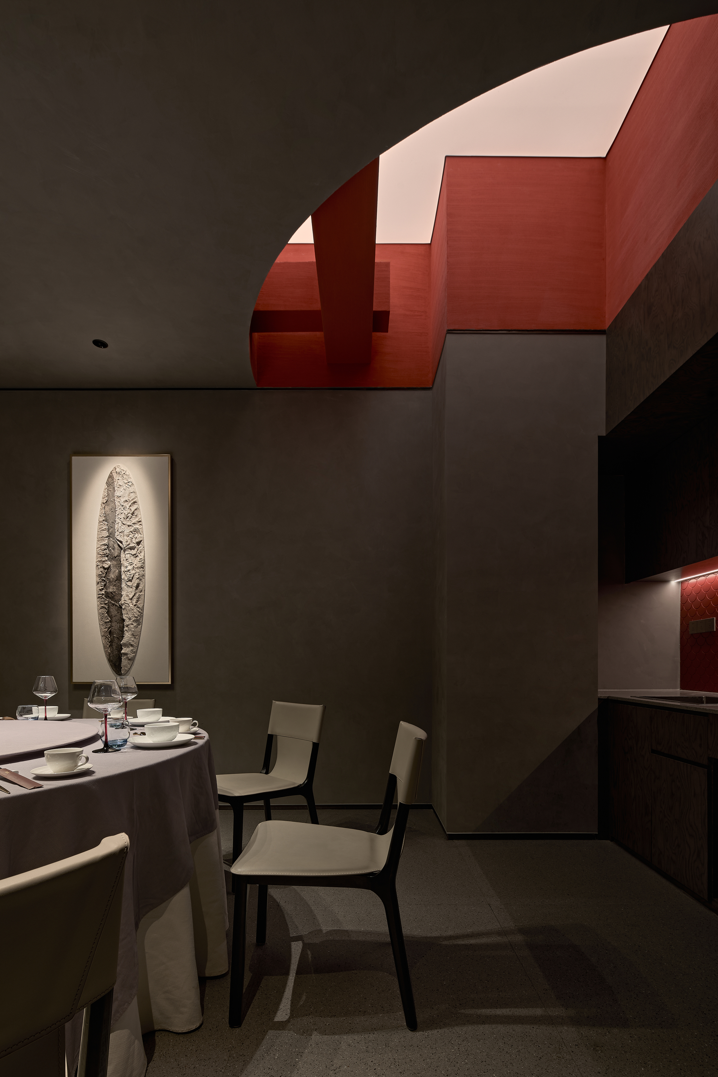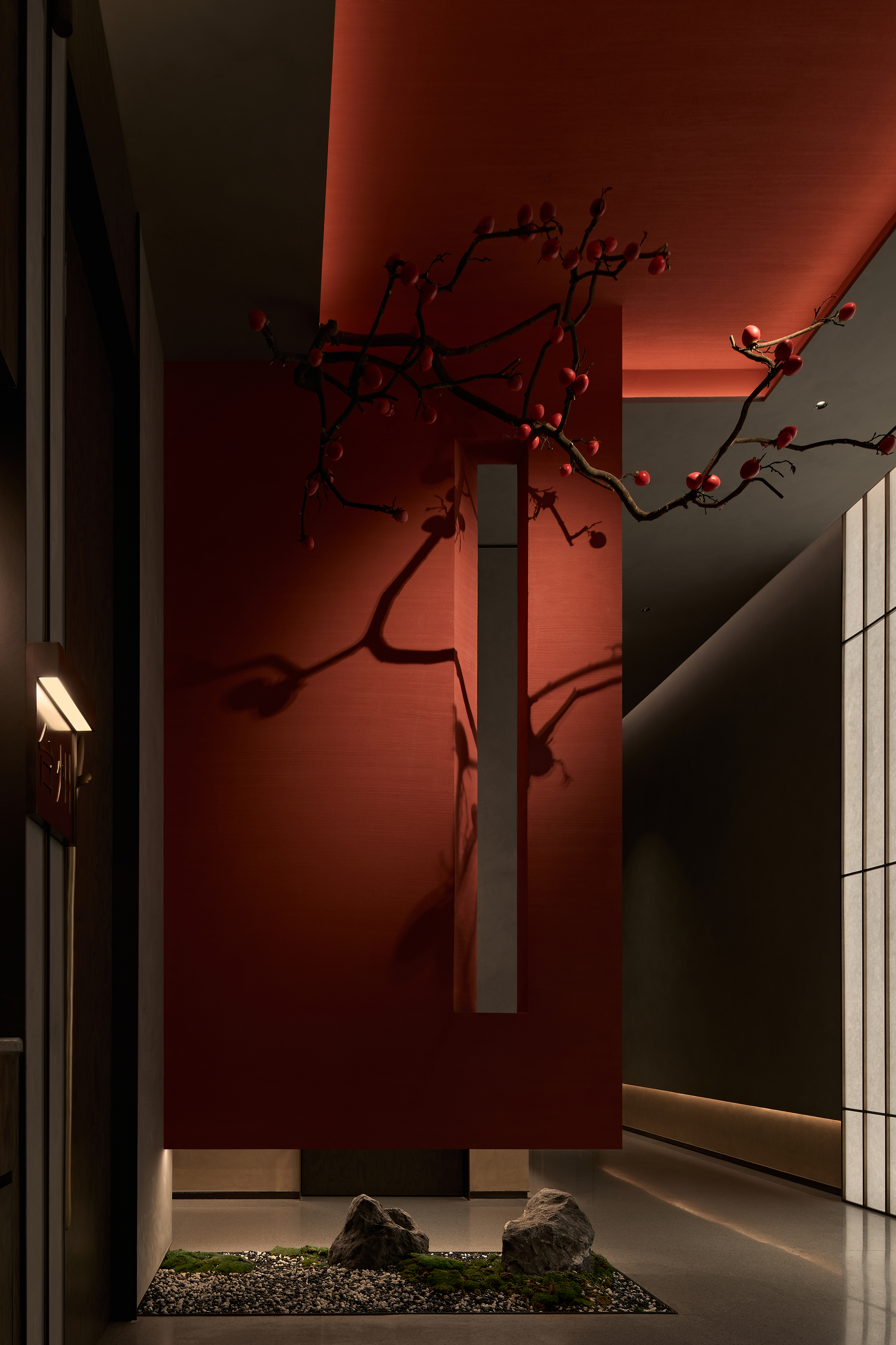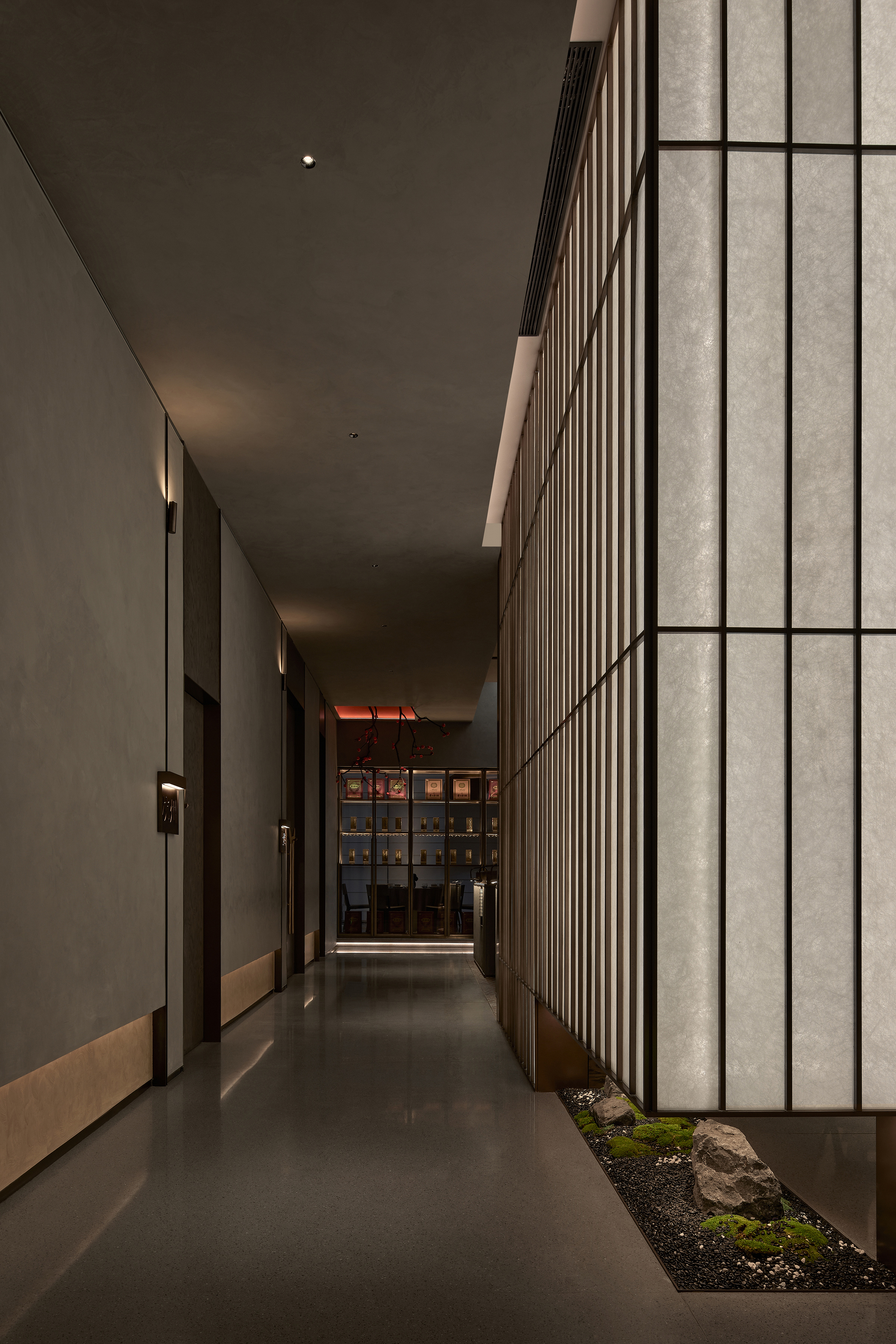 空间布局:整体以引景、造景、置景入室的思路打开空间序章,前厅处在暗调的轻缓之下,一抹绿意为空间带来了优雅气质,淡化了人造距离感的紧张性。餐包区域形成了一个独立又相互映衬的漂浮灯笼盒子,底部以苔藓景观托起,弱化了传统墙体的概念,形成视觉感官趣味的同时营造通透且私密的用餐体验;尽头的倒挂模块更将人情气韵聚拢,呈现出光、艺术、空间虚实相照的自然之妙