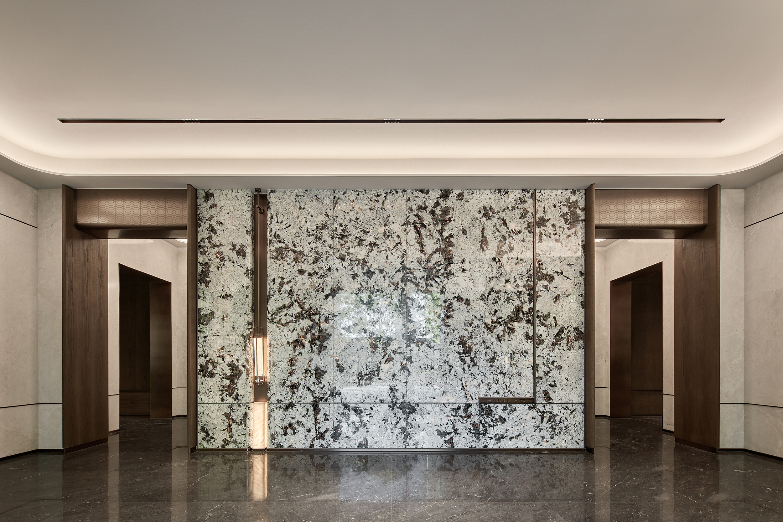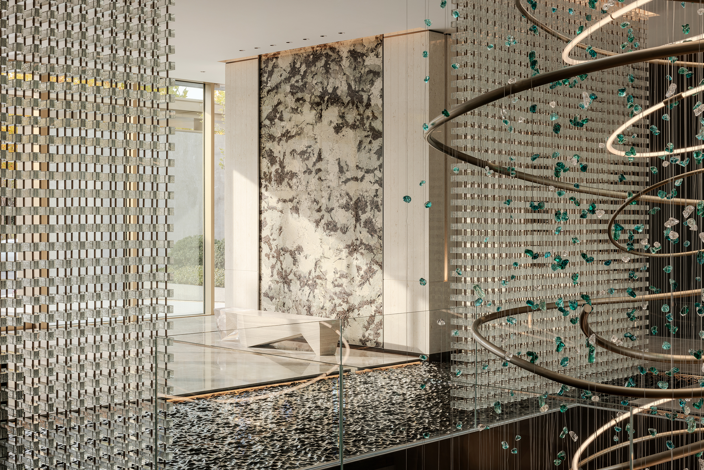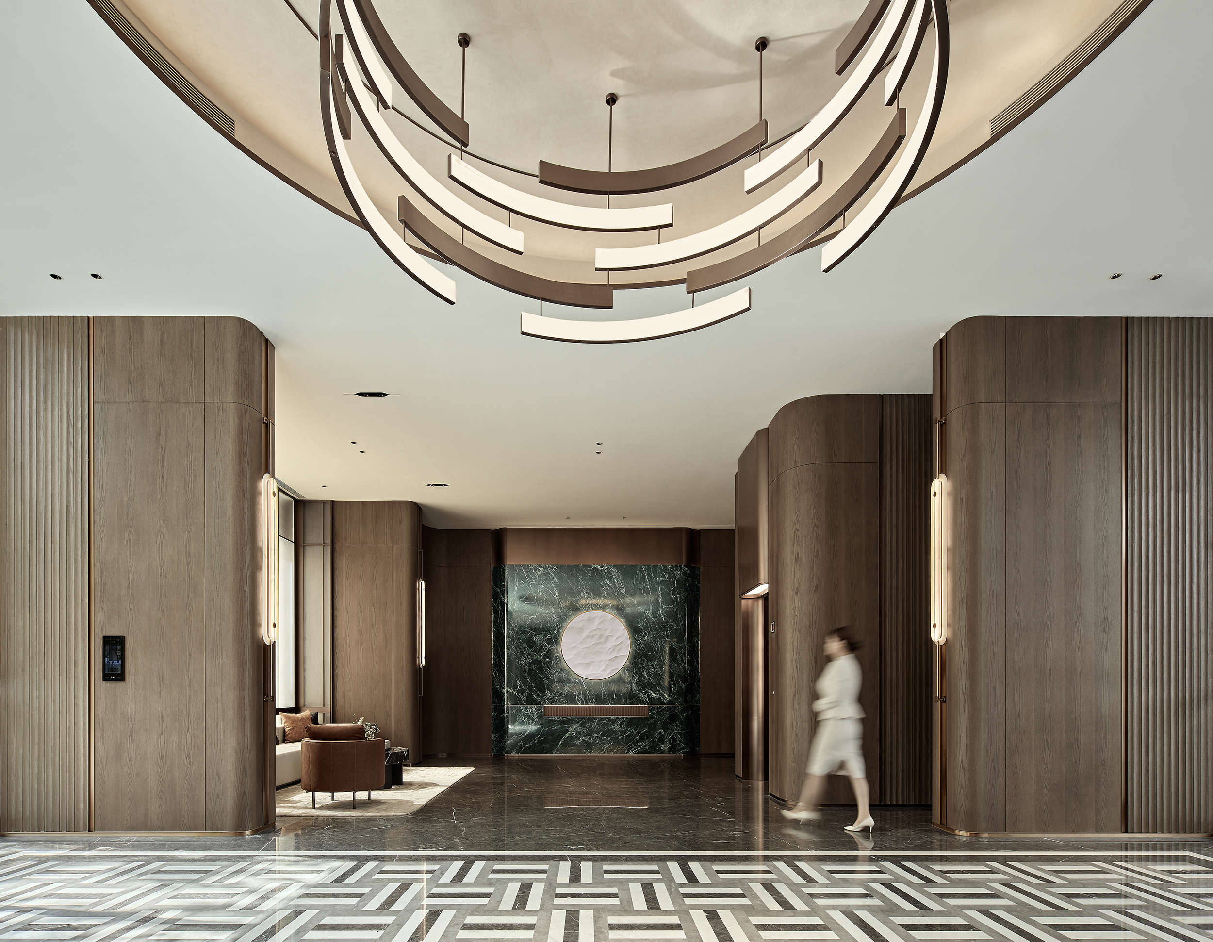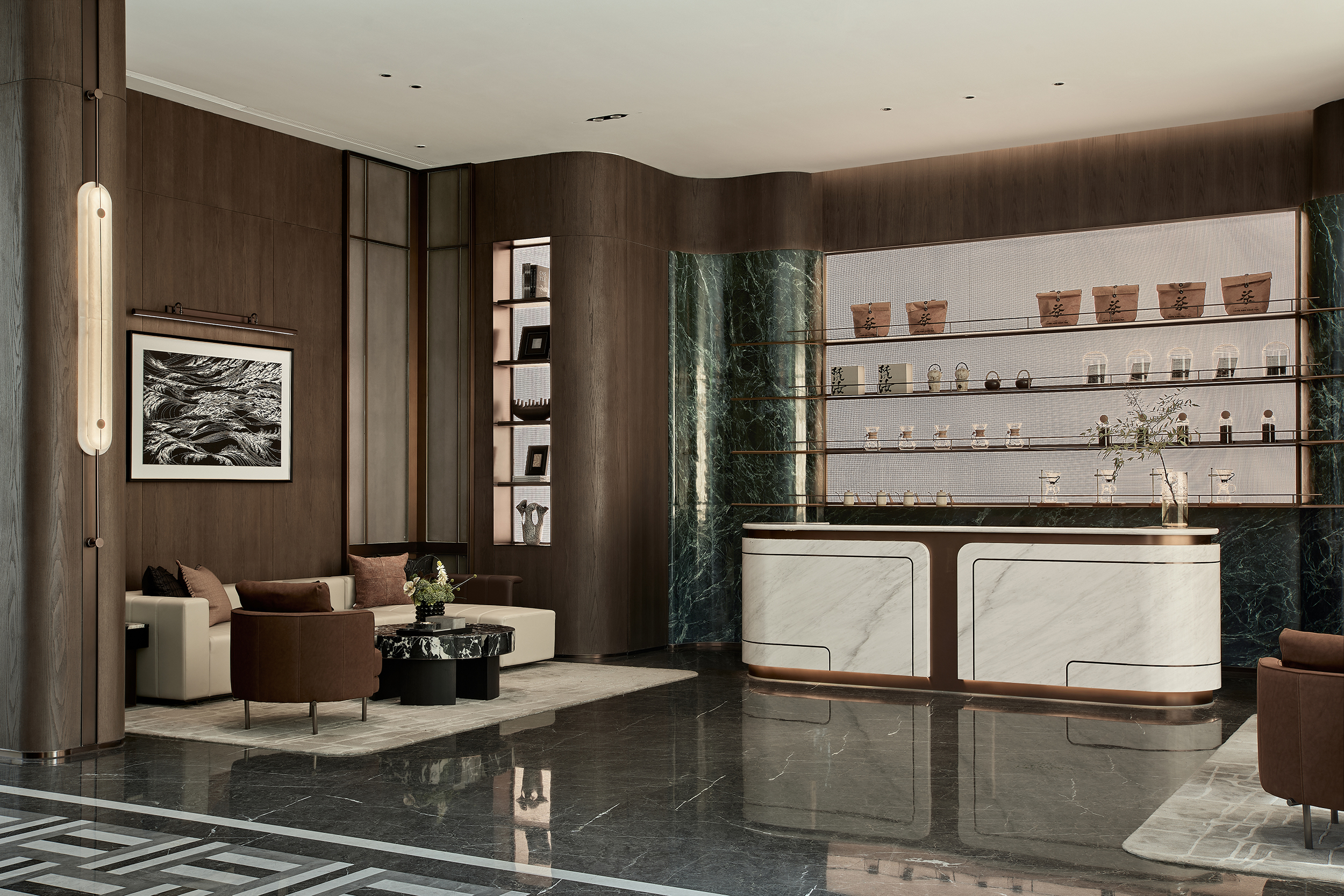 环保理念与高端质感的巧妙融合:选材方面,注重低碳环保与艺术感的平衡,展现自然与艺术的和谐。环保选材:普拉达绿石材作为入园大堂主色调材质,天然环保且传递沉稳高端的气质,黑白石材地面拼花通过阵列手法,增加艺术表现力。泛会所架空层选材上注重环保与质感的统一,使用低碳材料木饰面、水波纹玻璃和环保涂料,同时在细节上点缀金属线条装饰,结合趣味雕塑,增强空间的艺术氛围。