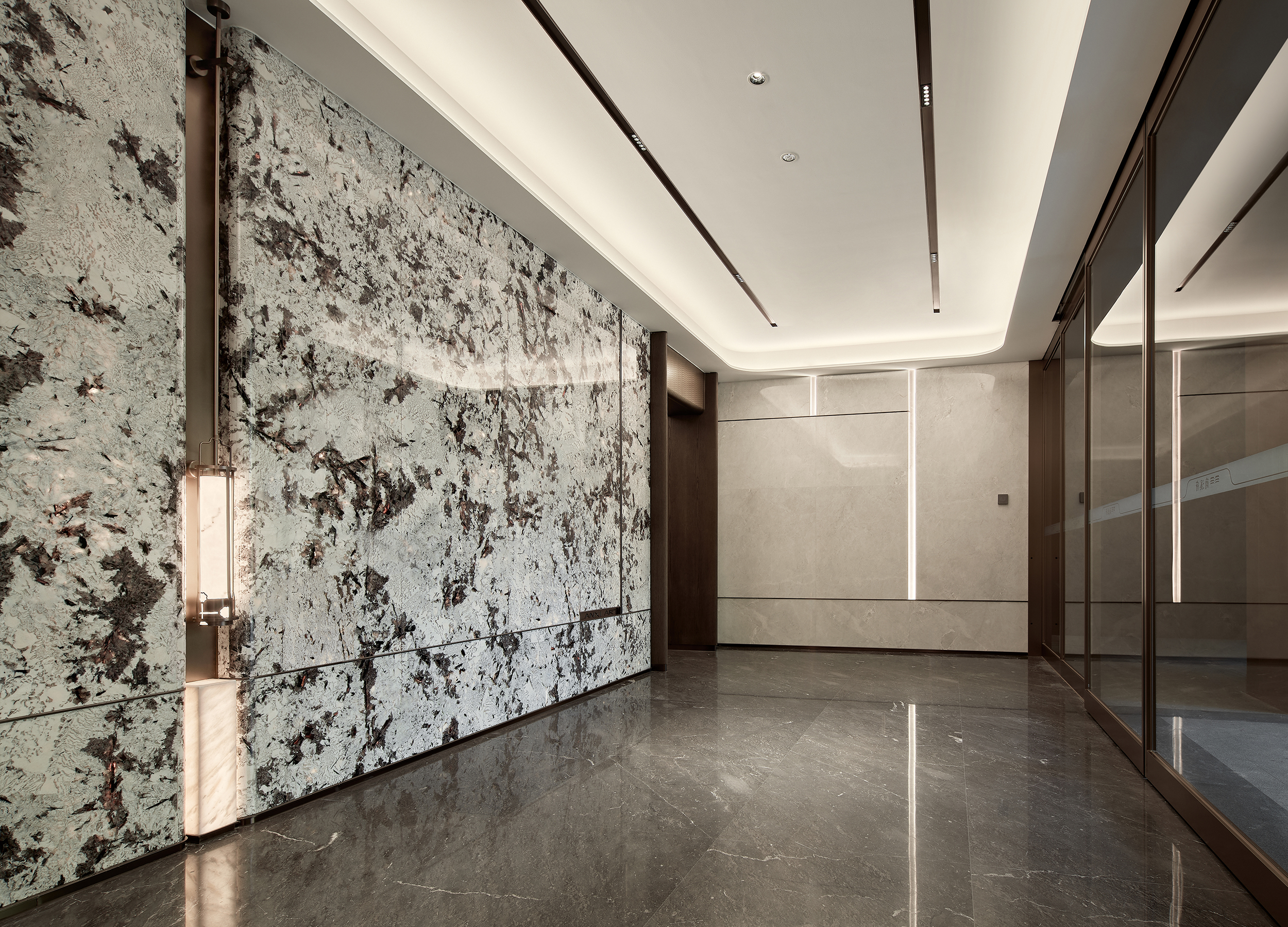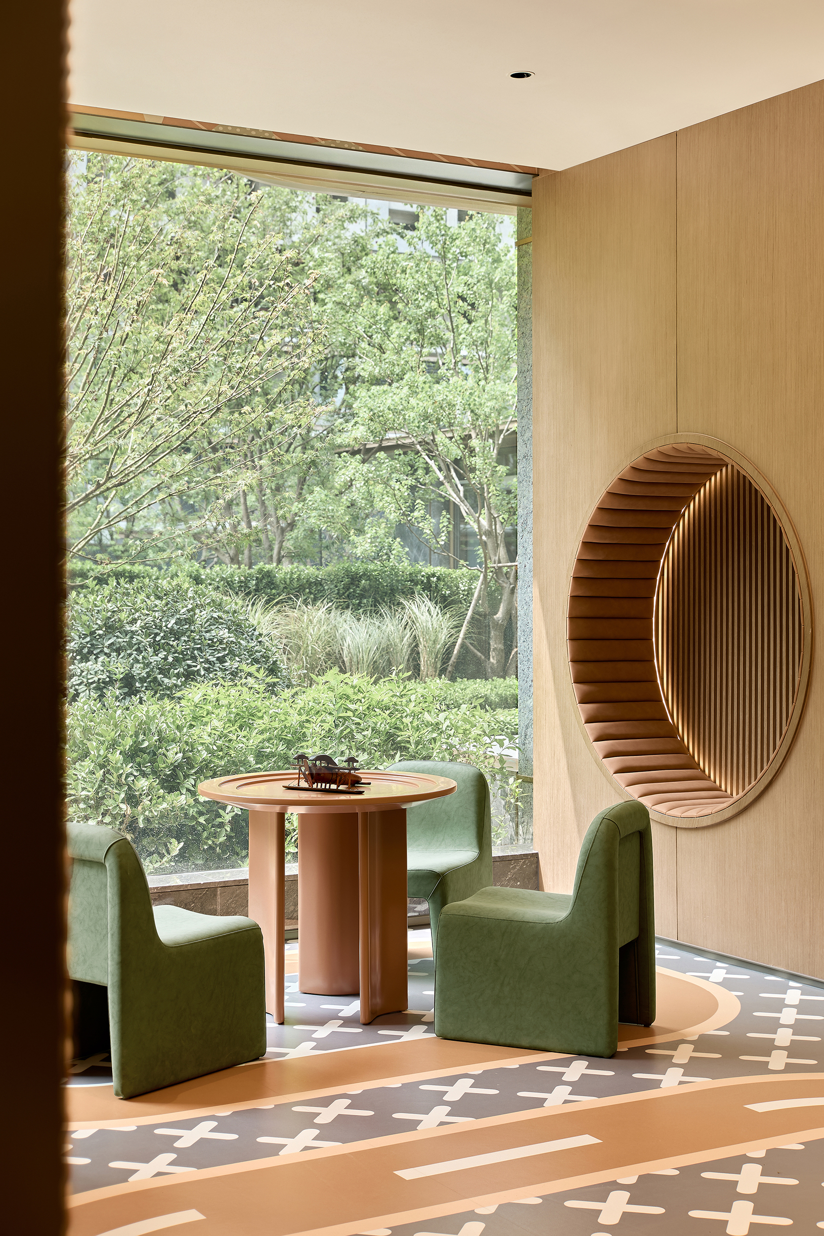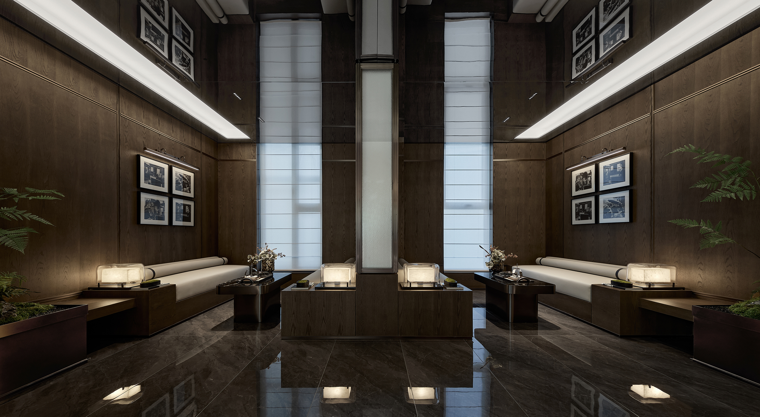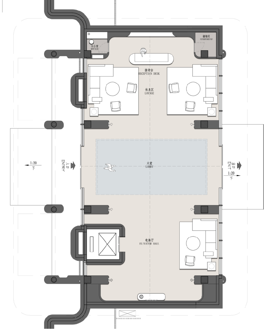环保理念与高端质感的巧妙融合:选材方面,注重低碳环保与艺术感的平衡,展现自然与艺术的和谐。环保选材:普拉达绿石材作为入园大堂主色调材质,天然环保且传递沉稳高端的气质,黑白石材地面拼花通过阵列手法,增加艺术表现力。泛会所架空层选材上注重环保与质感的统一,使用低碳材料木饰面、水波纹玻璃和环保涂料,同时在细节上点缀金属线条装饰,结合趣味雕塑,增强空间的艺术氛围。