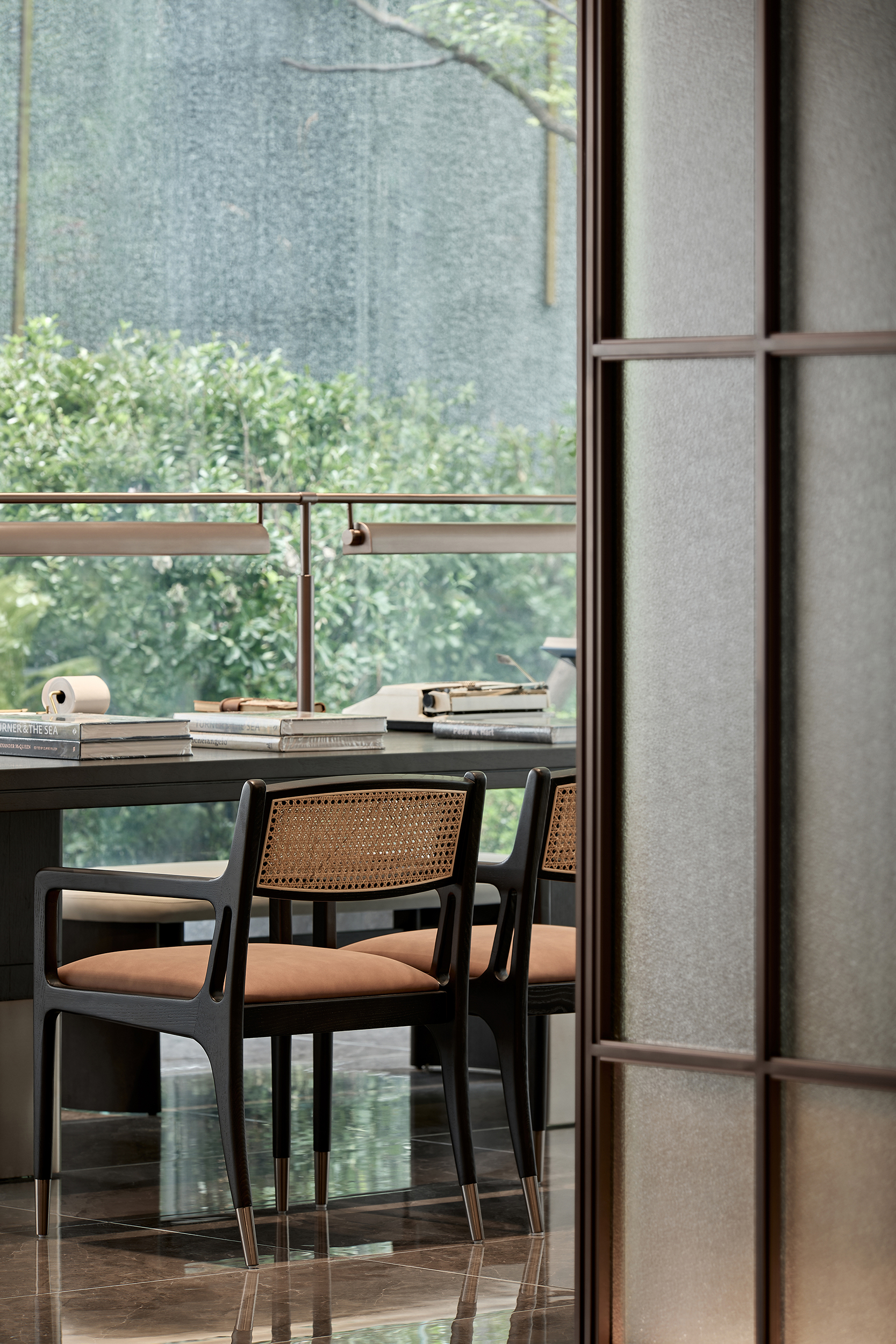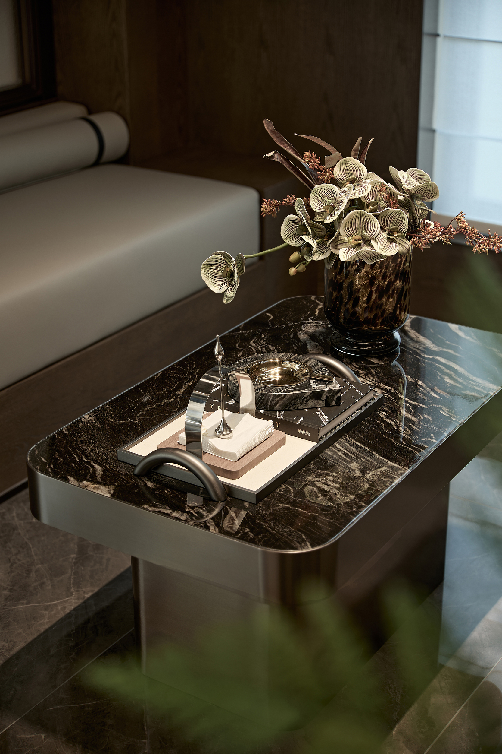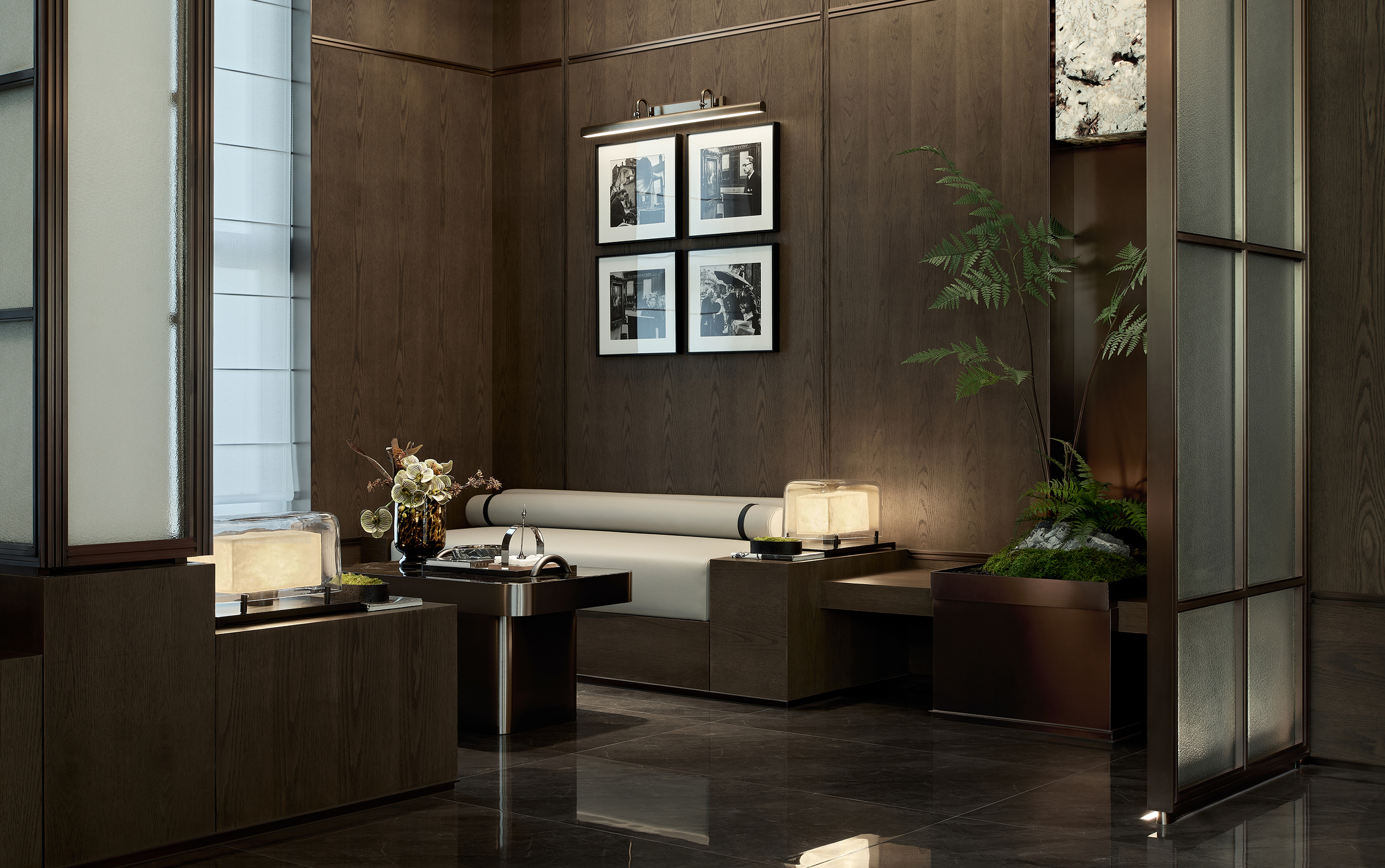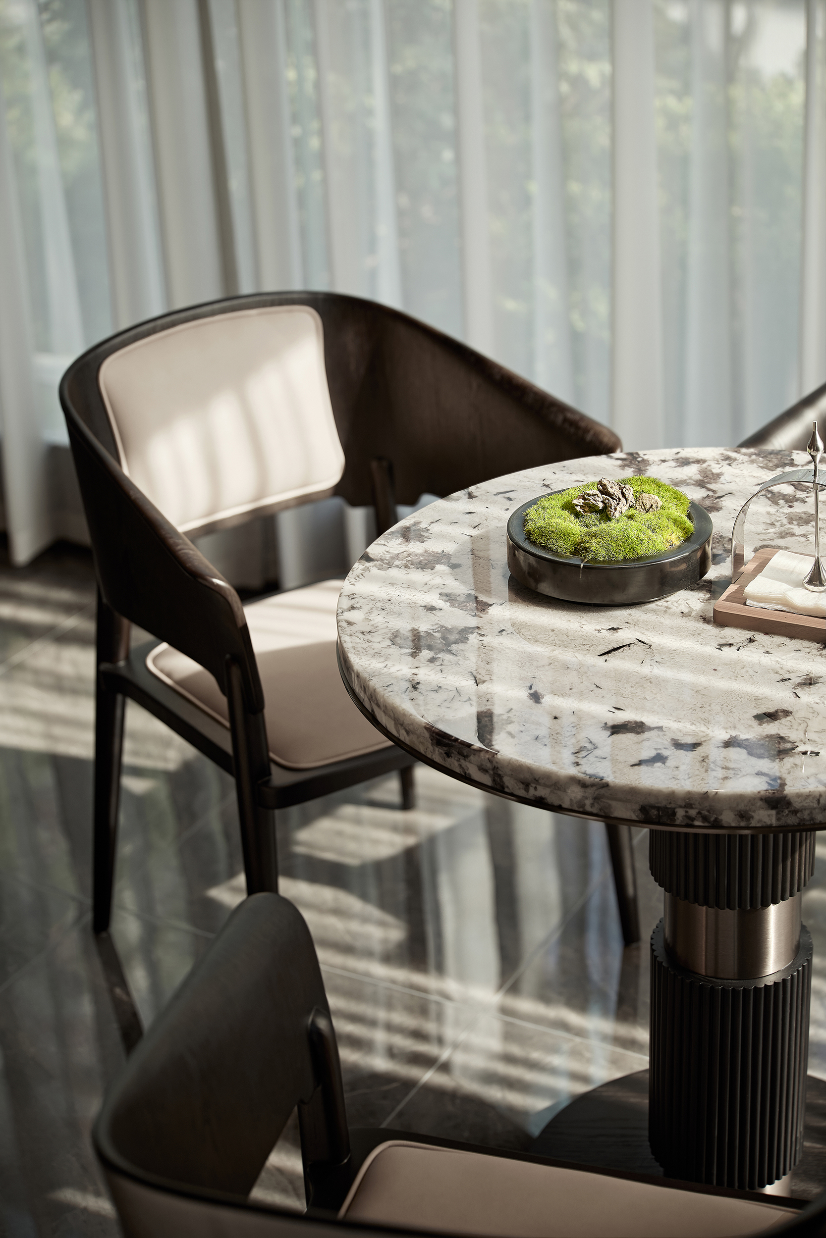 环保理念与高端质感的巧妙融合:选材方面,注重低碳环保与艺术感的平衡,展现自然与艺术的和谐。环保选材:普拉达绿石材作为入园大堂主色调材质,天然环保且传递沉稳高端的气质,黑白石材地面拼花通过阵列手法,增加艺术表现力。泛会所架空层选材上注重环保与质感的统一,使用低碳材料木饰面、水波纹玻璃和环保涂料,同时在细节上点缀金属线条装饰,结合趣味雕塑,增强空间的艺术氛围。