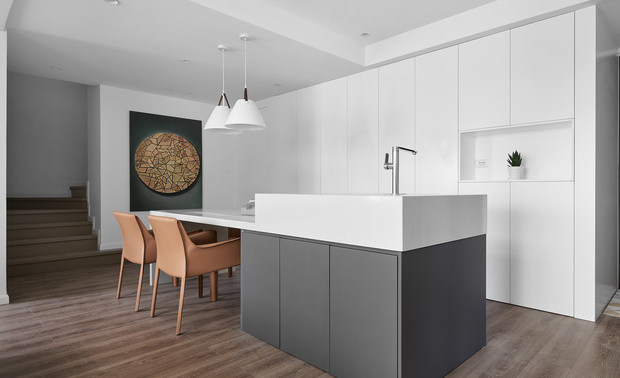 并以柔和的曲线和圆润的轮廓为基础,与有着纹理的墙面、定制橱柜和圆润的家具相协调。