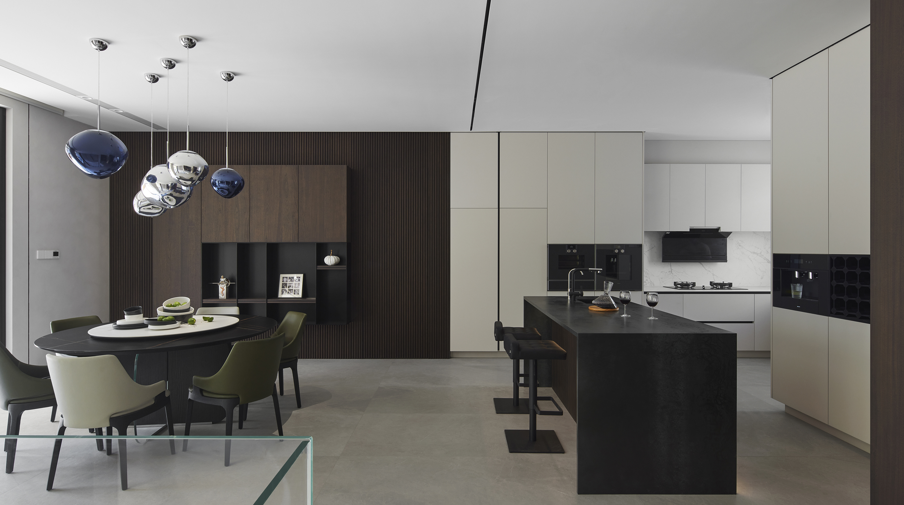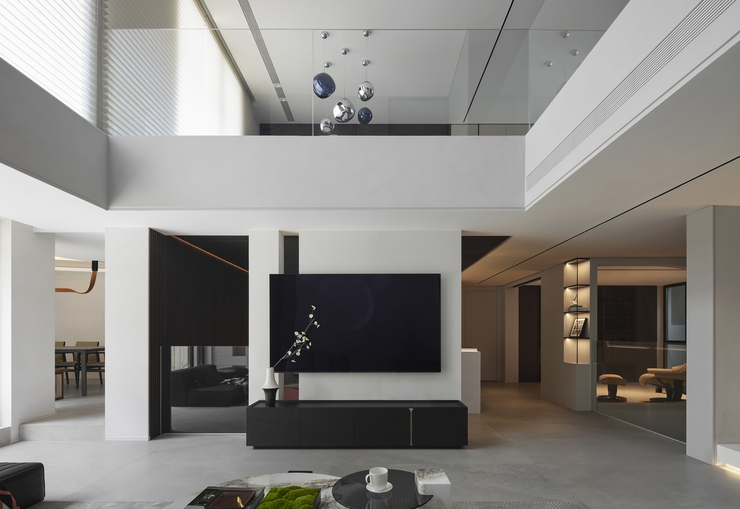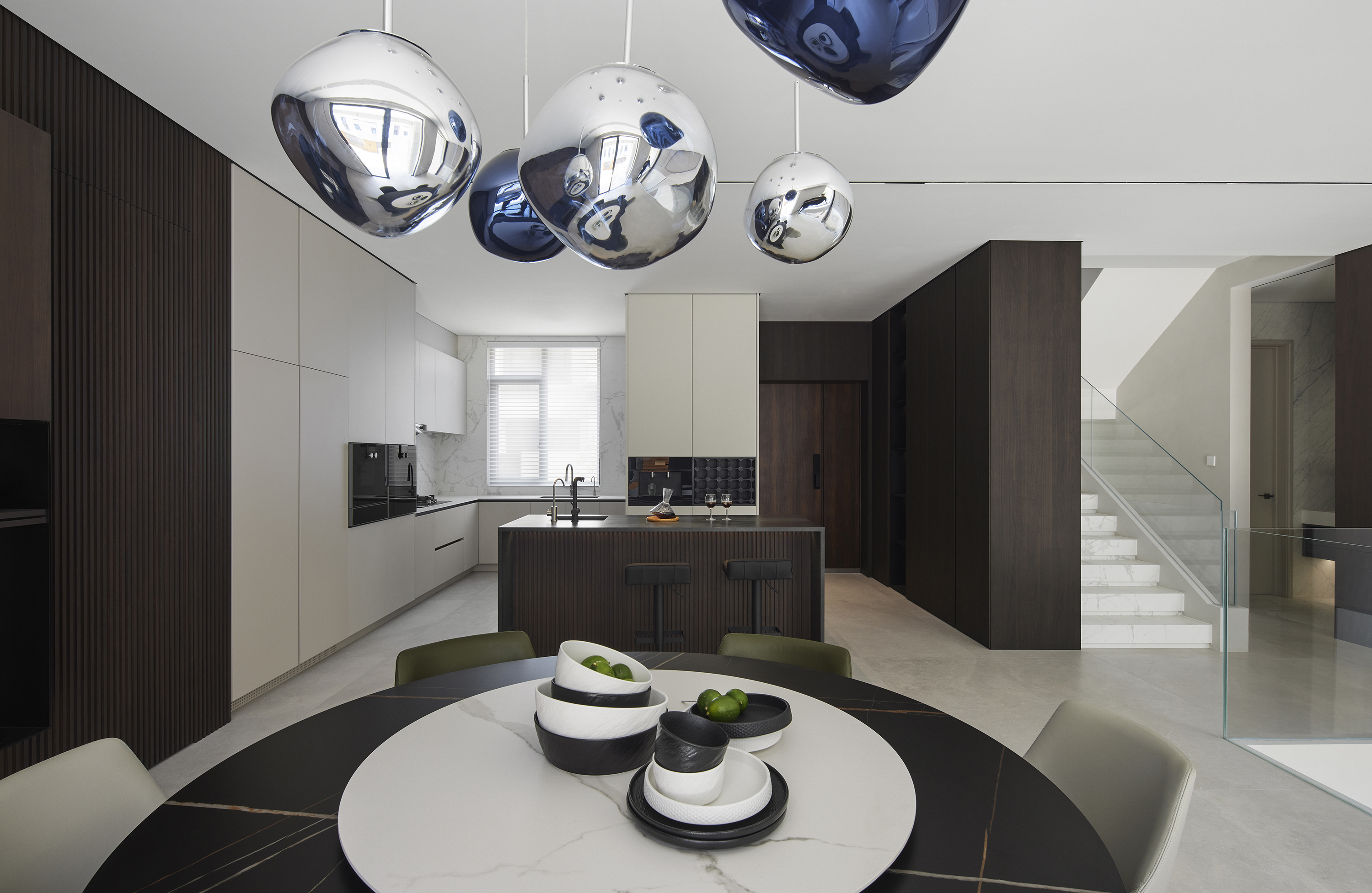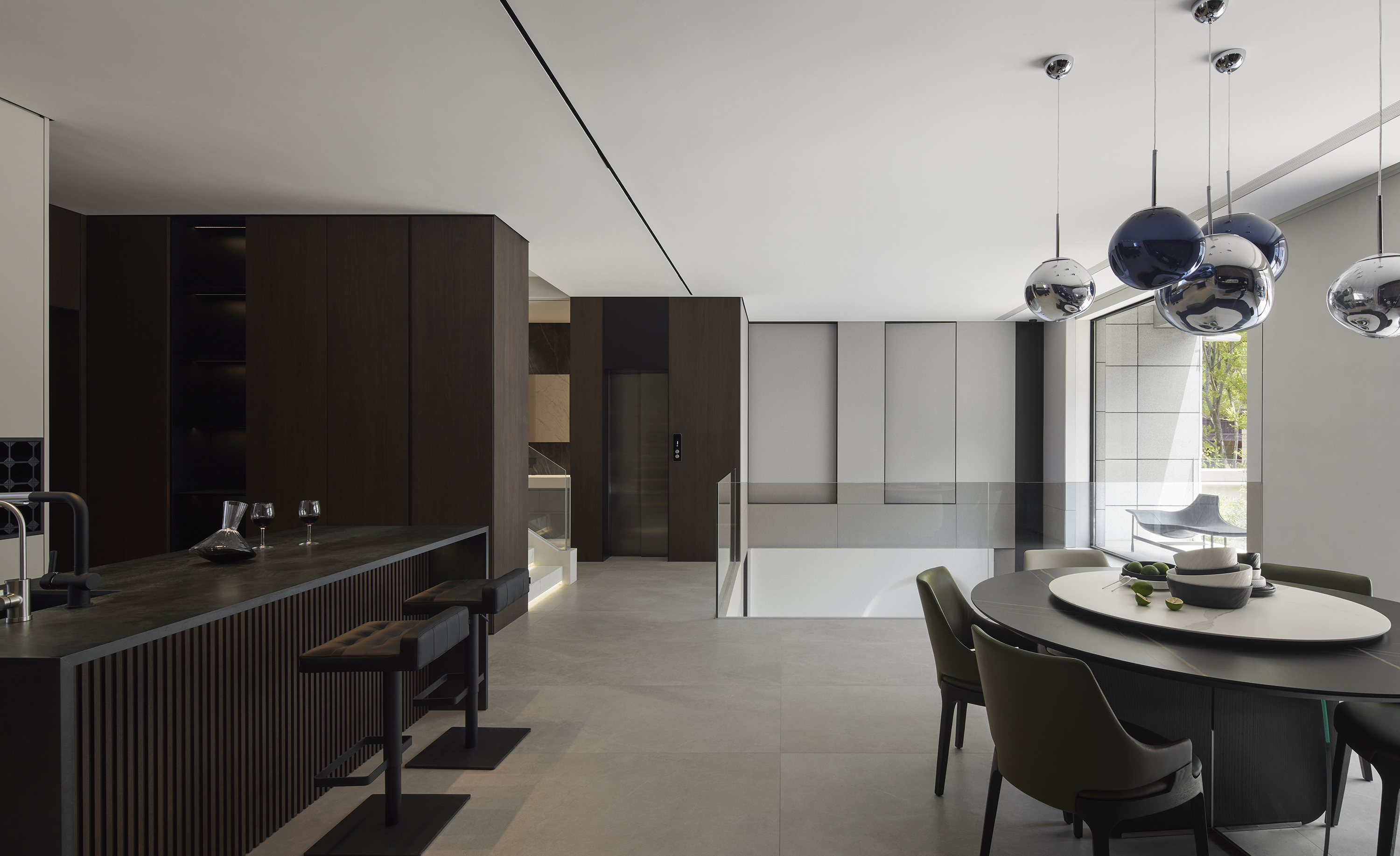 空间布局:再次将地下一层与一层结构挑空,将客厅与餐厅交错放在两个楼层,使两者相互独立,使用起来不拥挤,空间更开阔舒适。