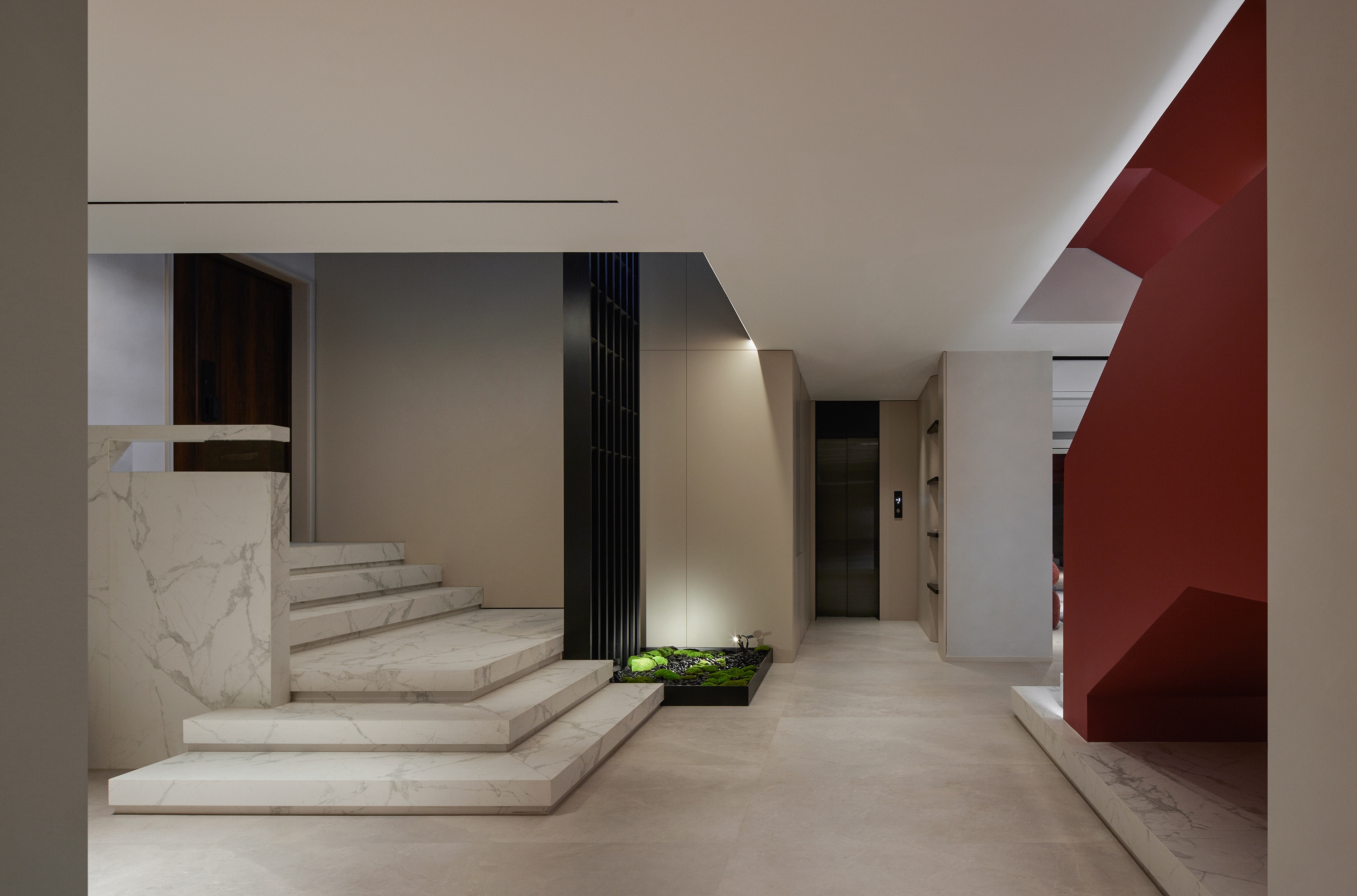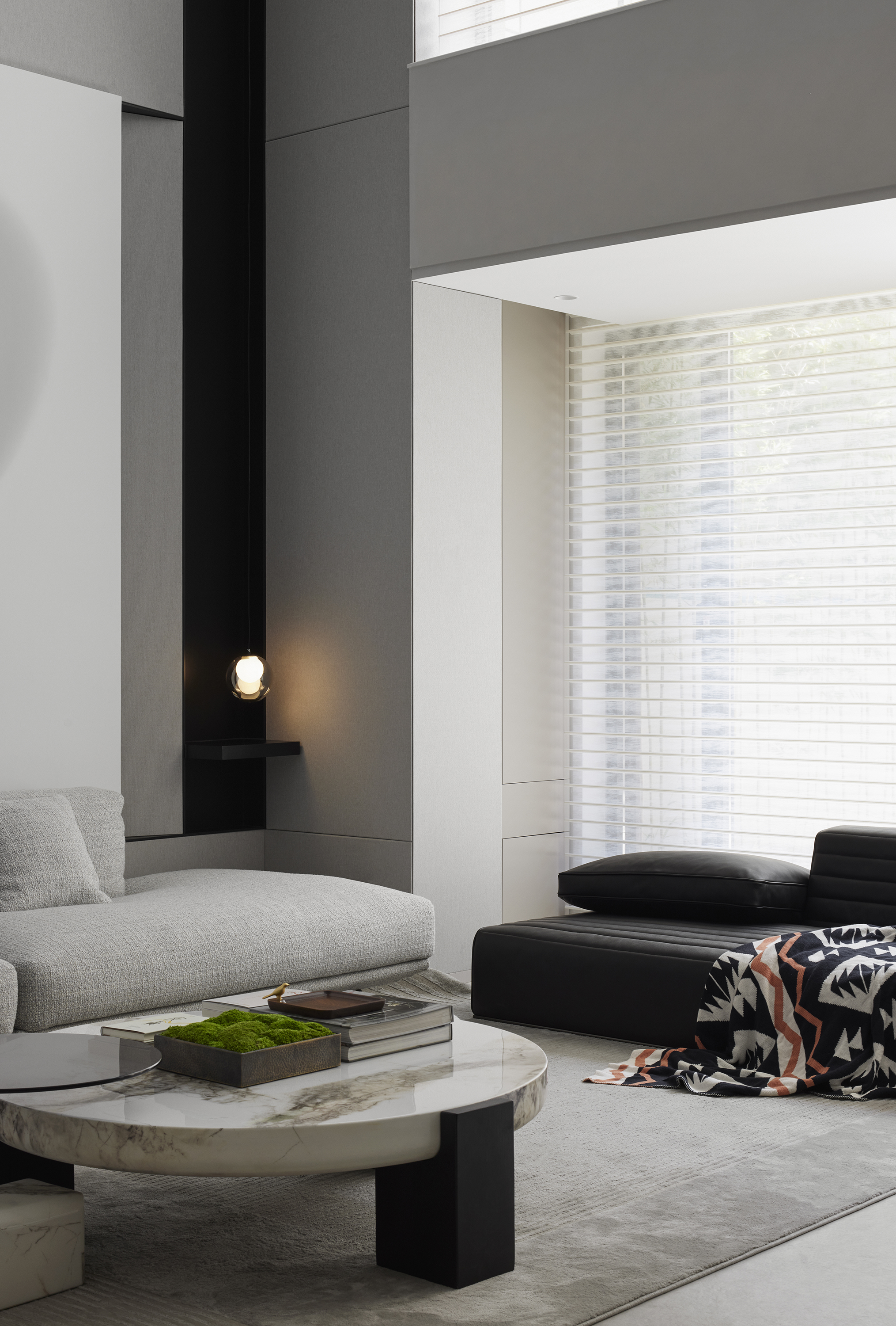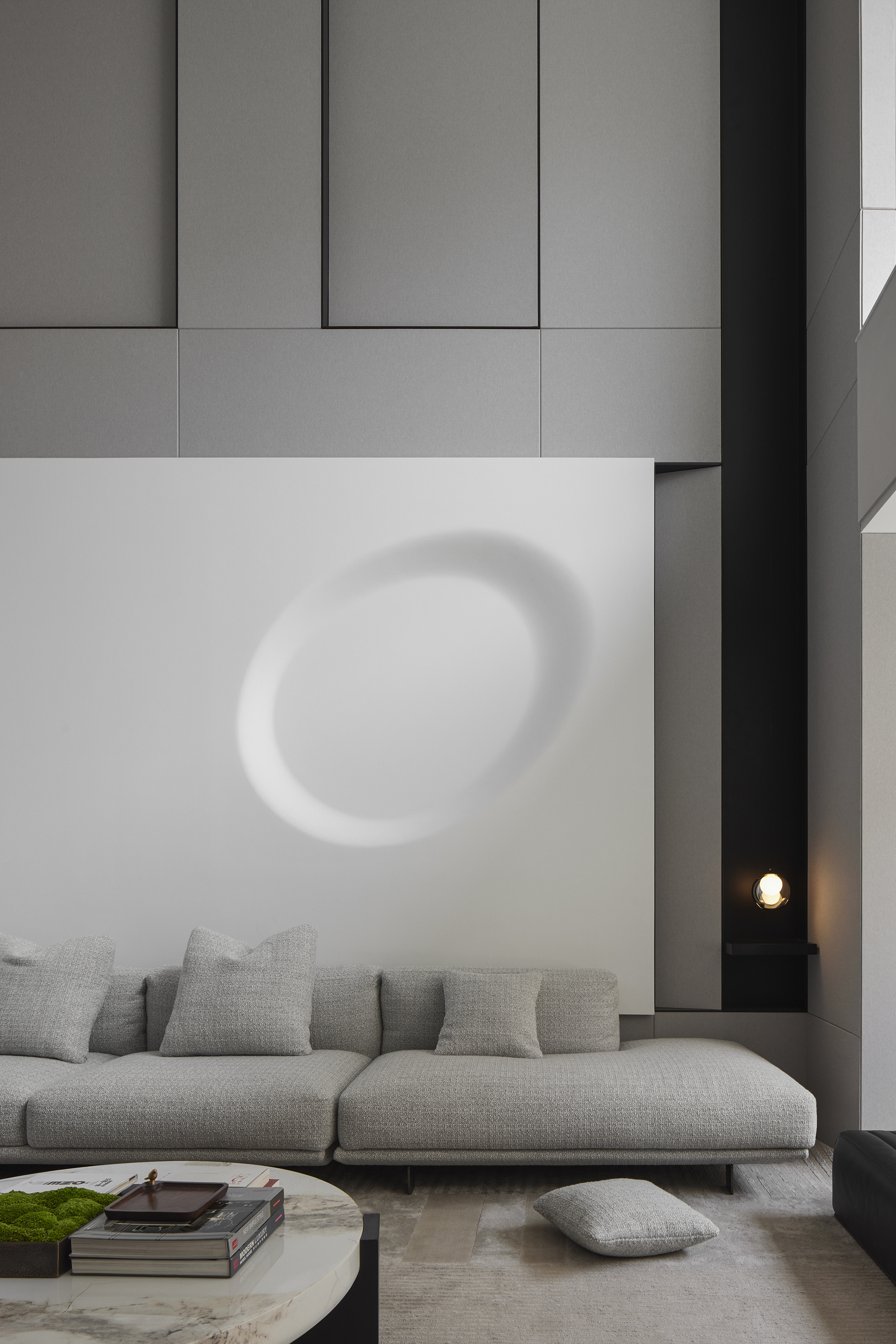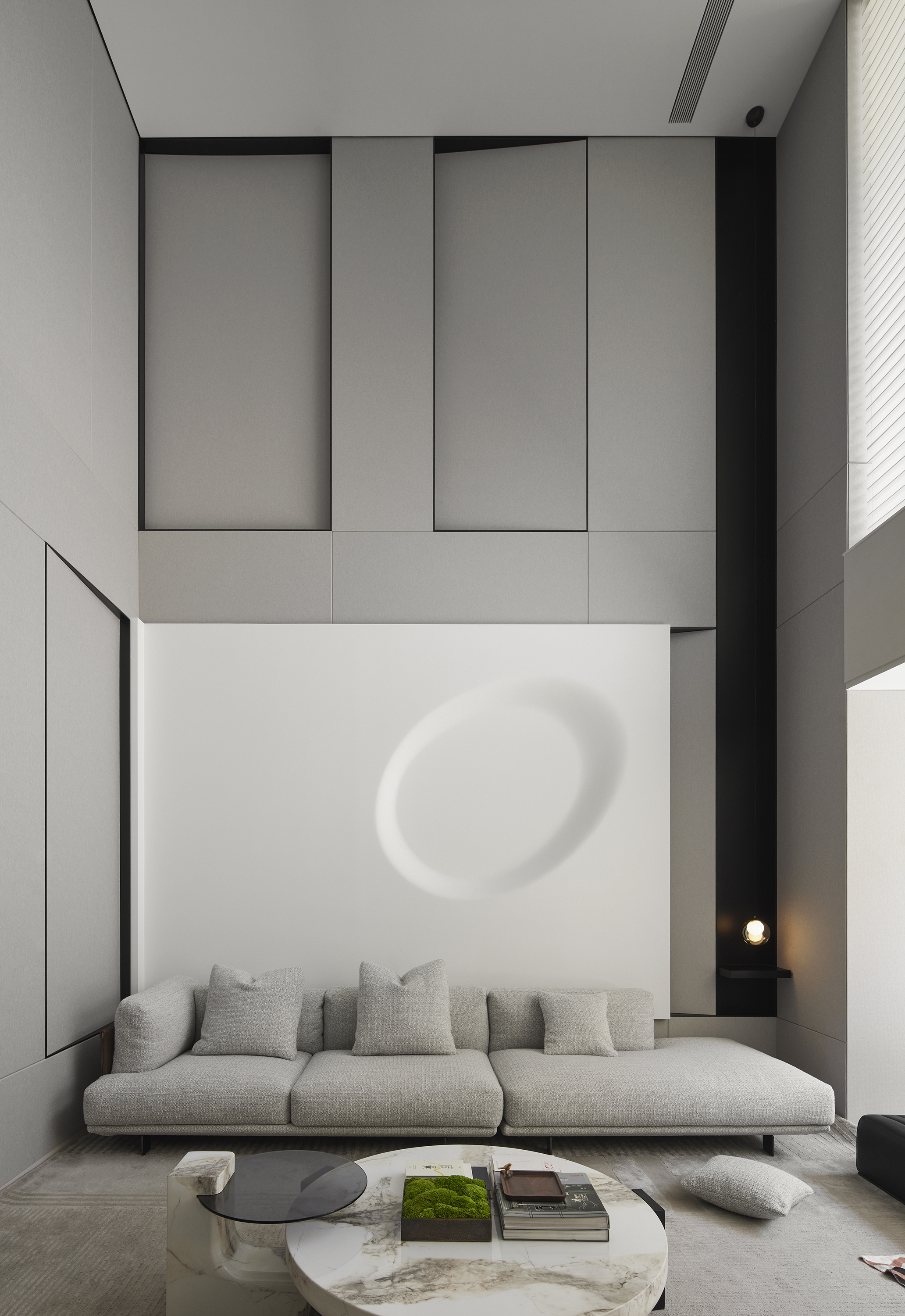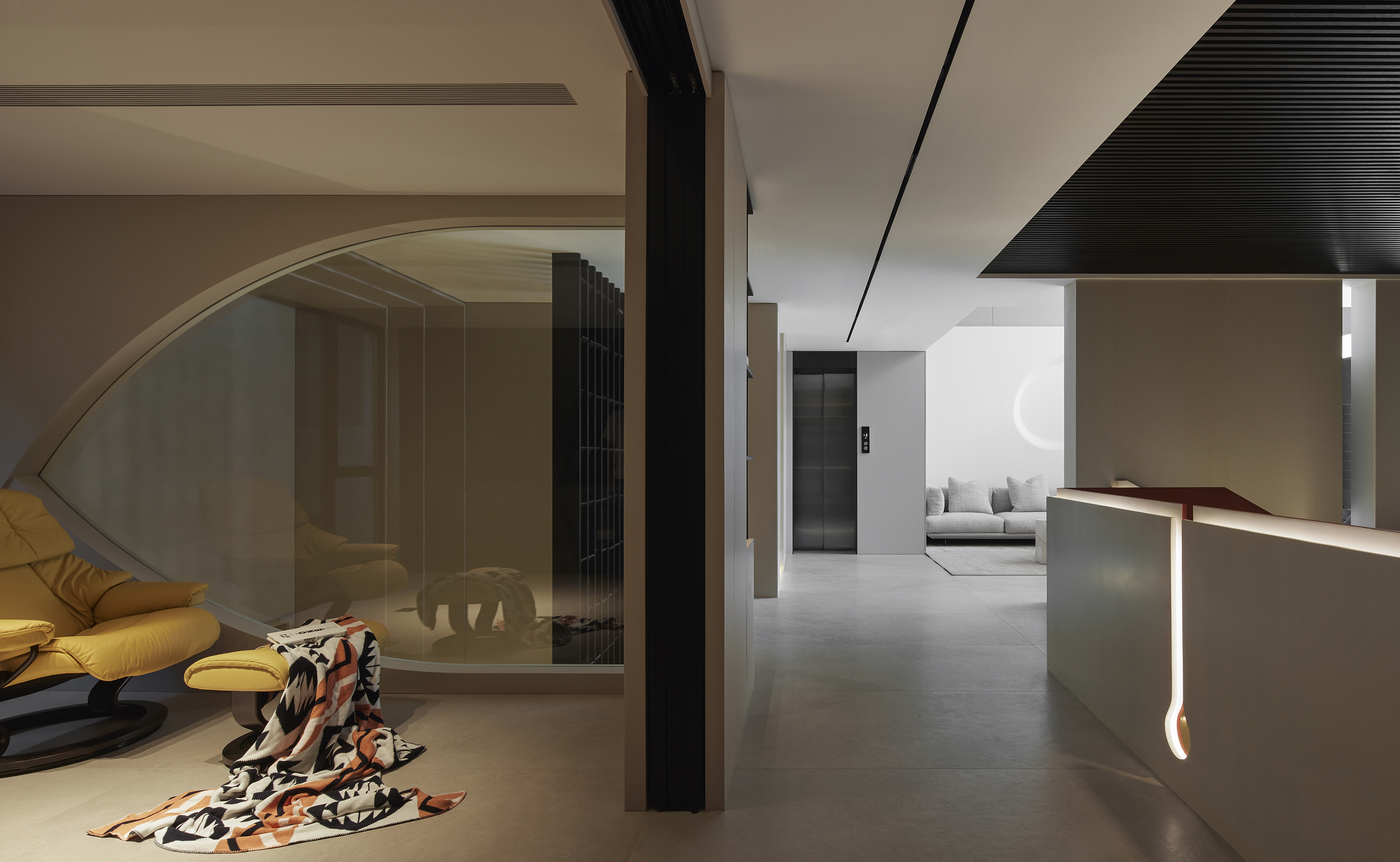 设计选材:设计中,公共空间多处使用镂空透景的设计手法,满足各空间独立的同时将空气和自然光引入地下空间,甚至在中午前后的四五个小时里日光都能从南侧直接照射到负二层北入户的门口,减少了地下空间对灯光的需求。入户的金属玄关做了可以旋转的拨片,避免引入地下的光对人眼产生不适的眩光。且通透的空间调用了地下空间的温度,在夏日与冬日对地上空间温度进行平衡调节。