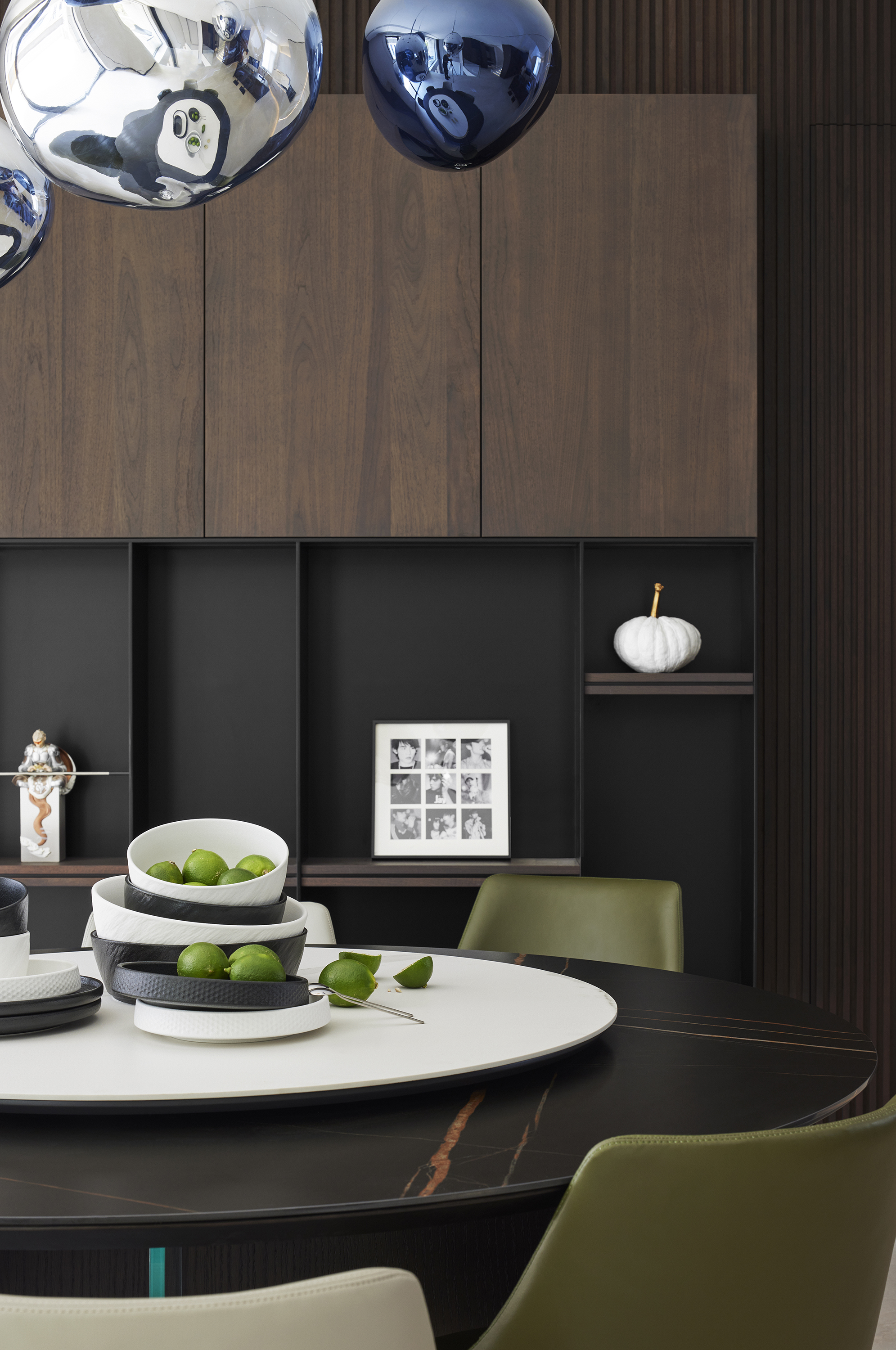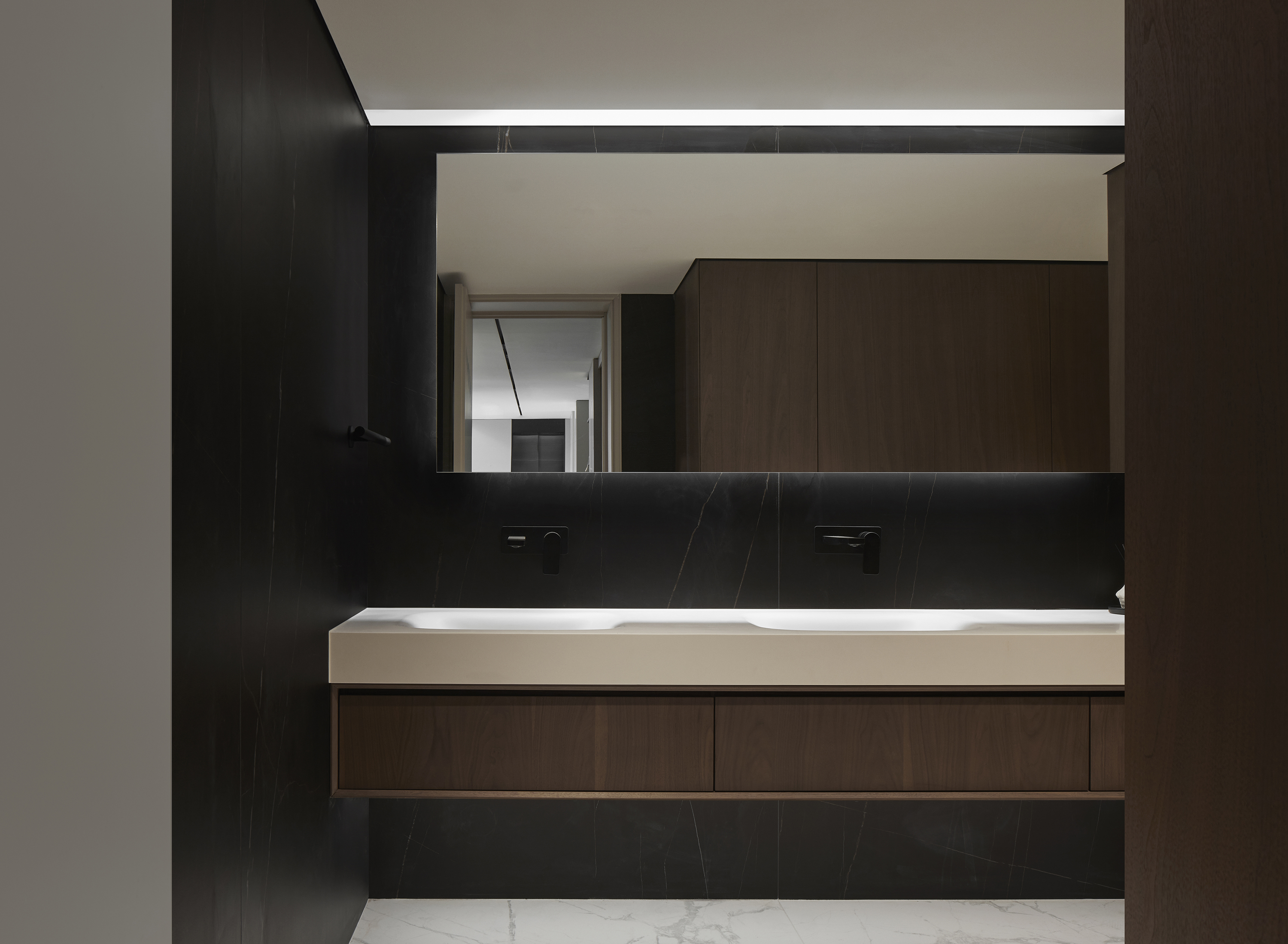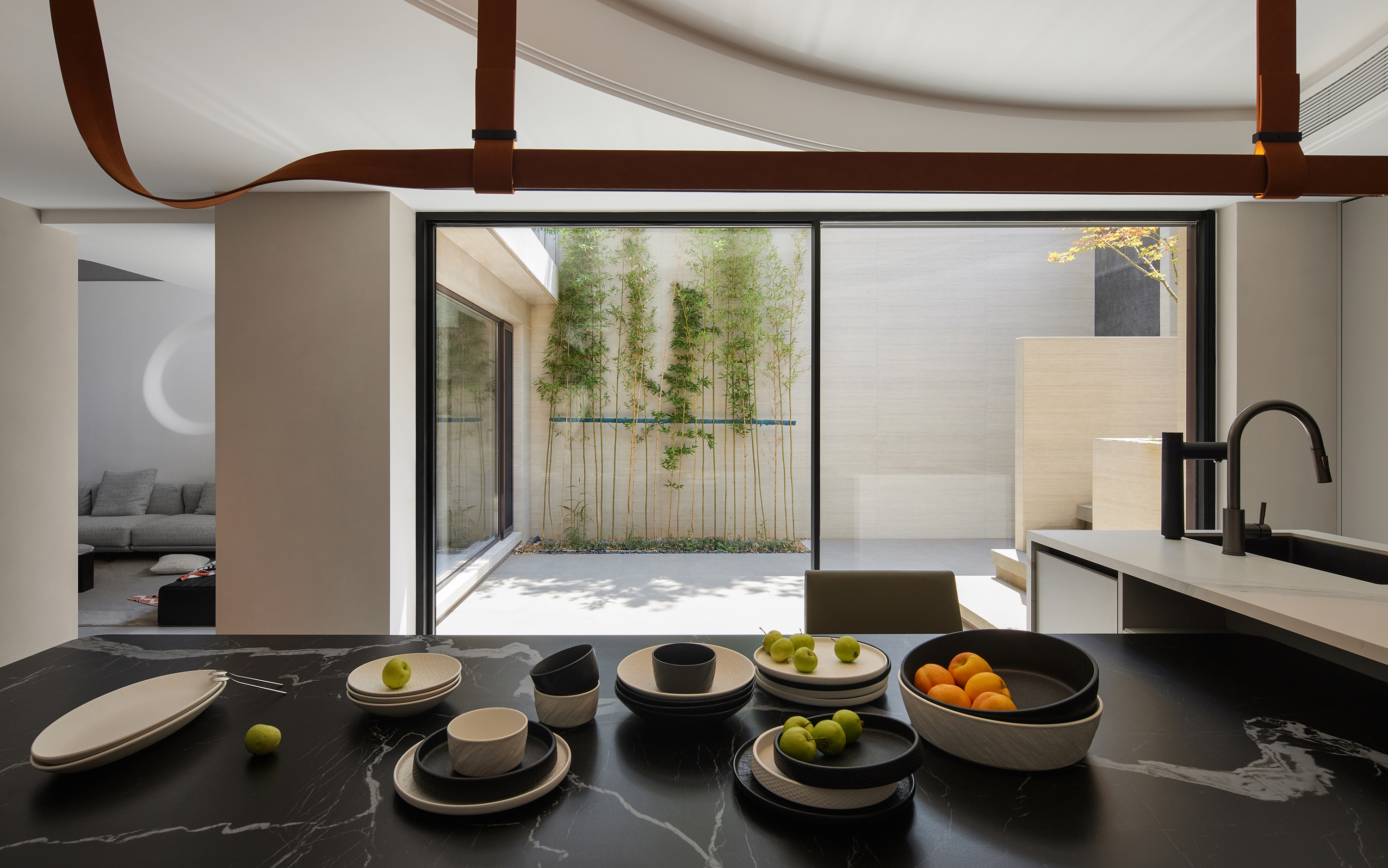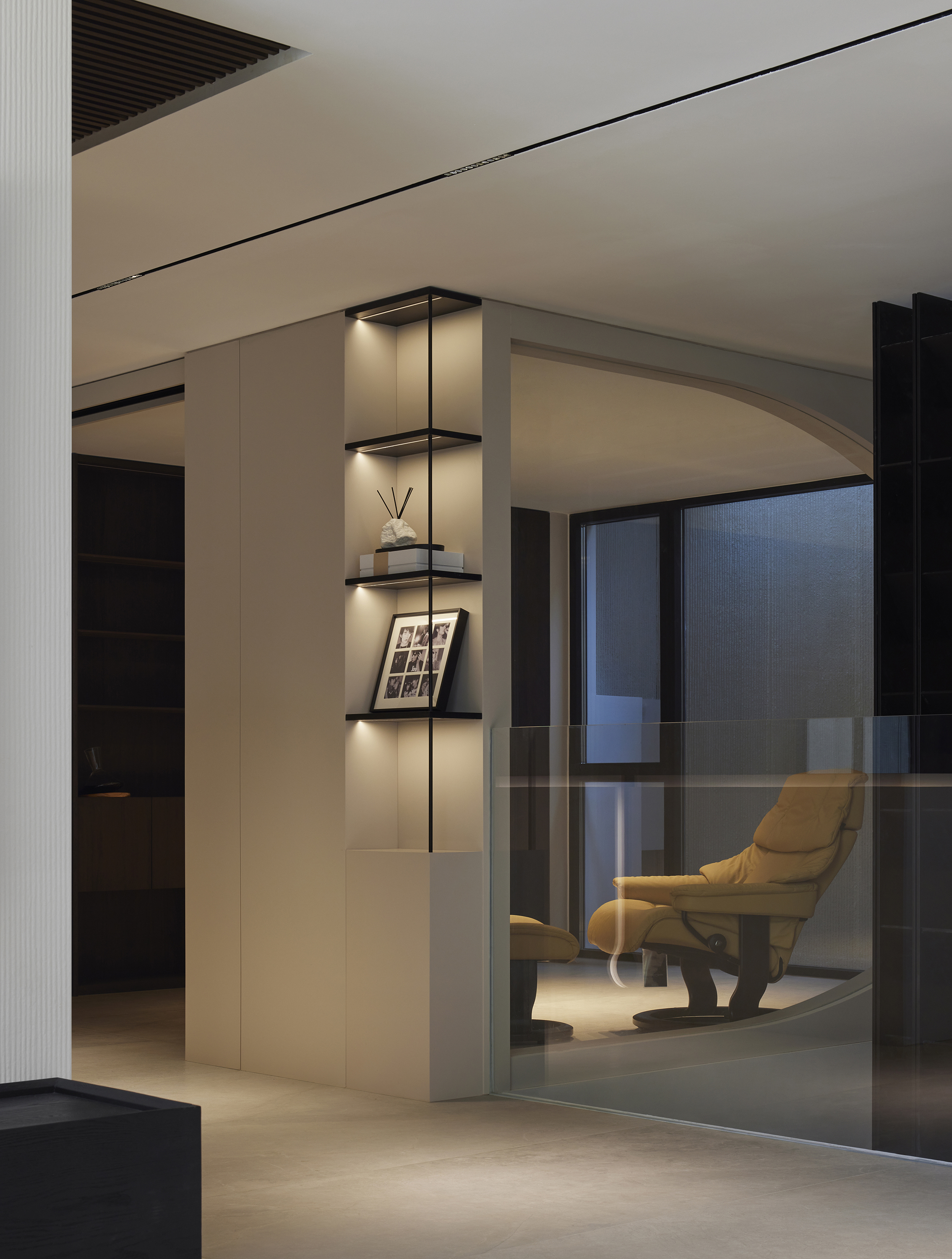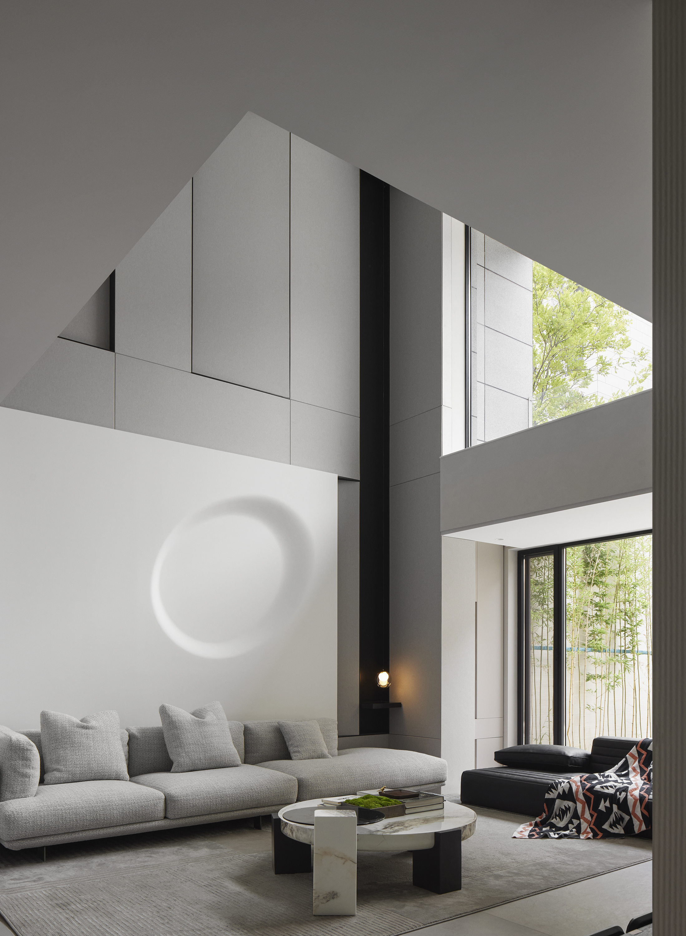 设计选材:设计中,公共空间多处使用镂空透景的设计手法,满足各空间独立的同时将空气和自然光引入地下空间,甚至在中午前后的四五个小时里日光都能从南侧直接照射到负二层北入户的门口,减少了地下空间对灯光的需求。入户的金属玄关做了可以旋转的拨片,避免引入地下的光对人眼产生不适的眩光。且通透的空间调用了地下空间的温度,在夏日与冬日对地上空间温度进行平衡调节。