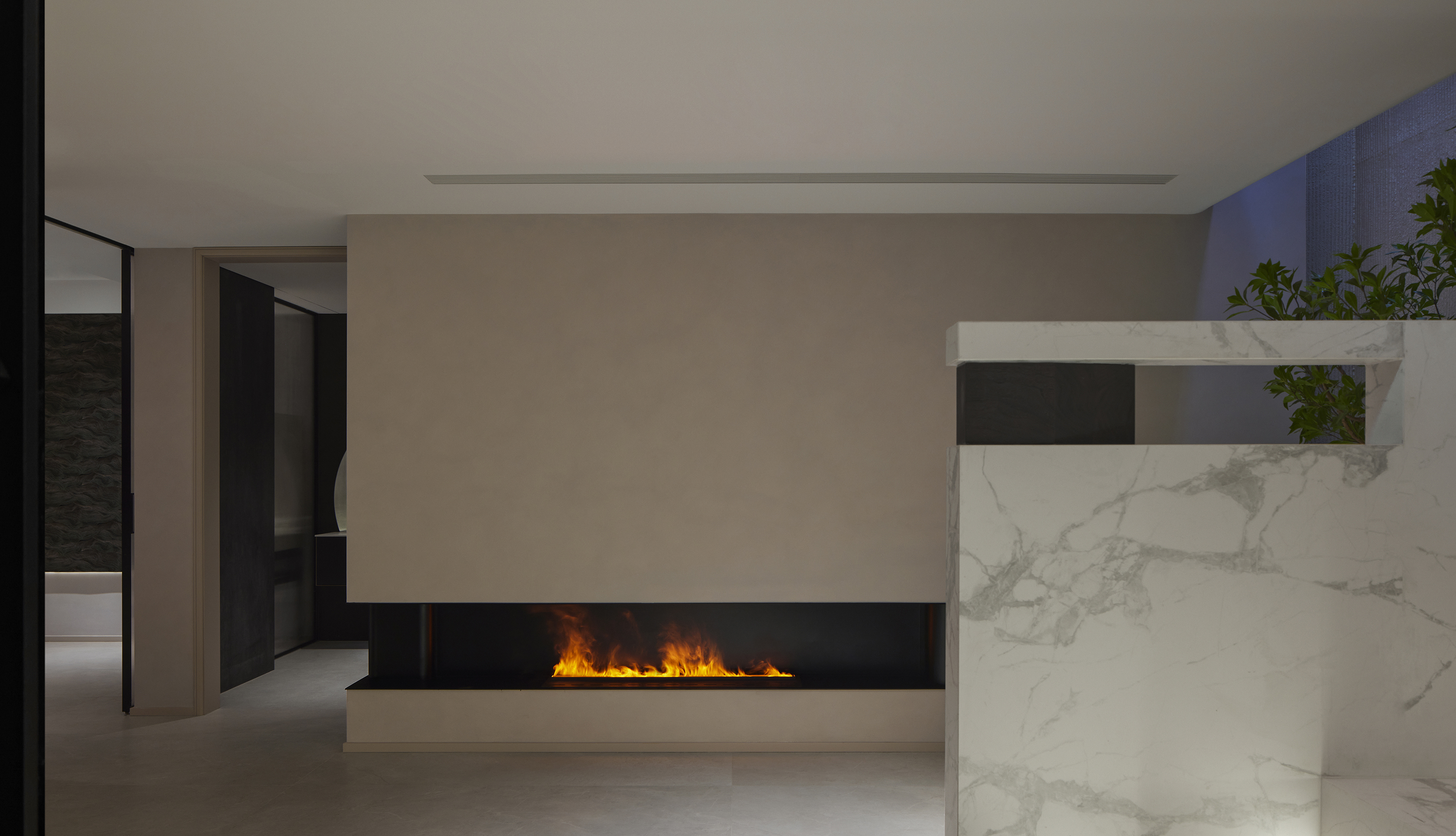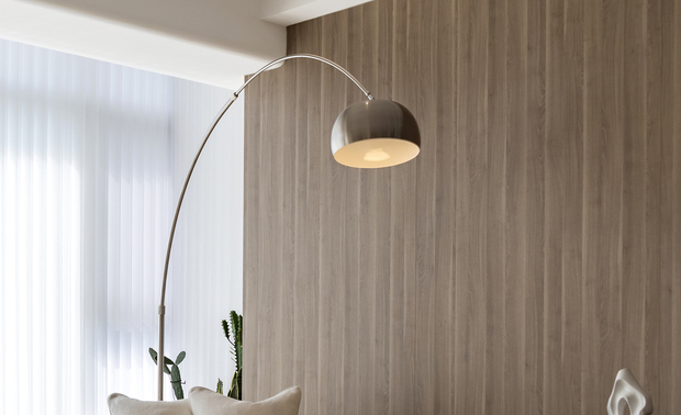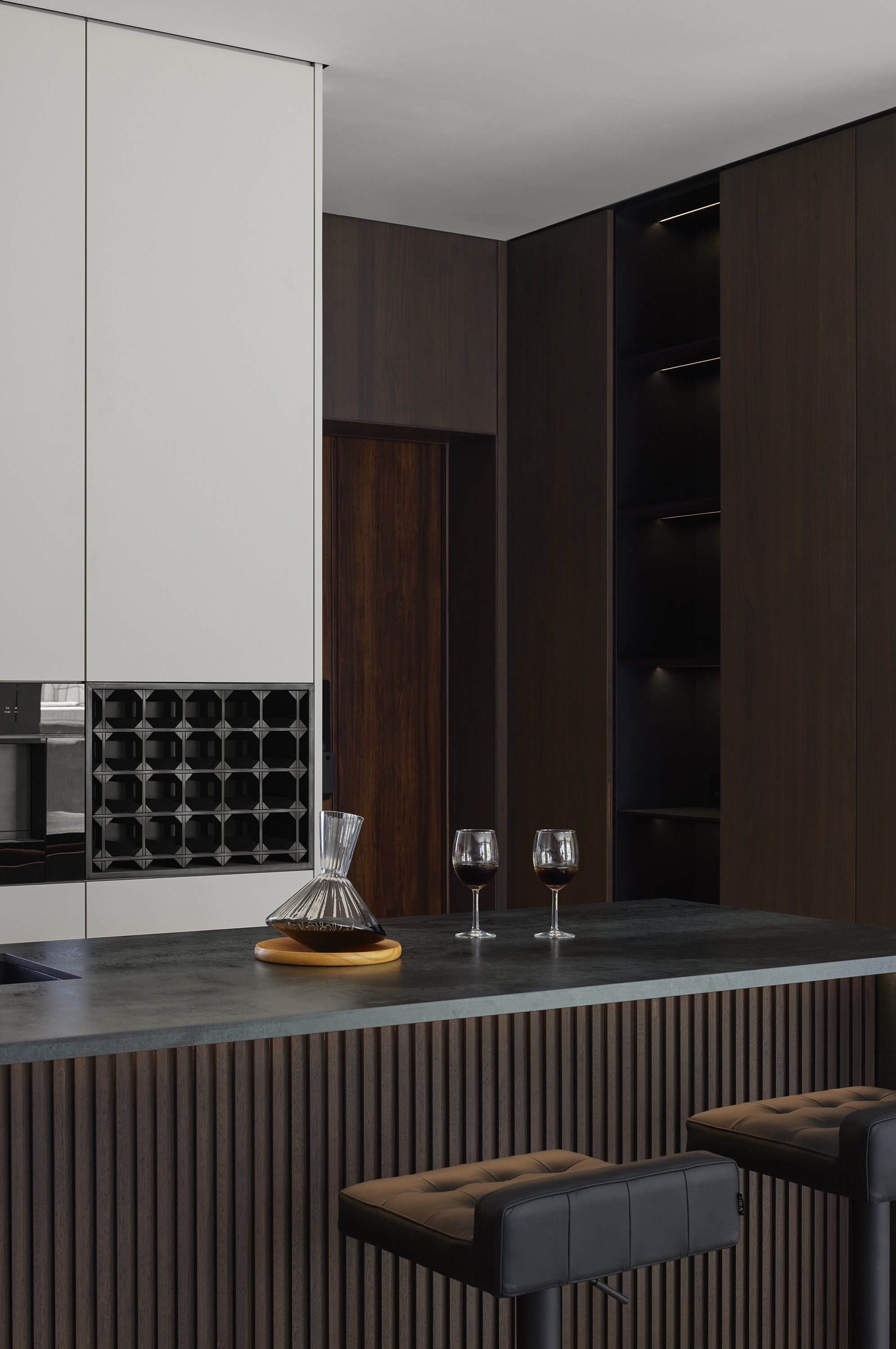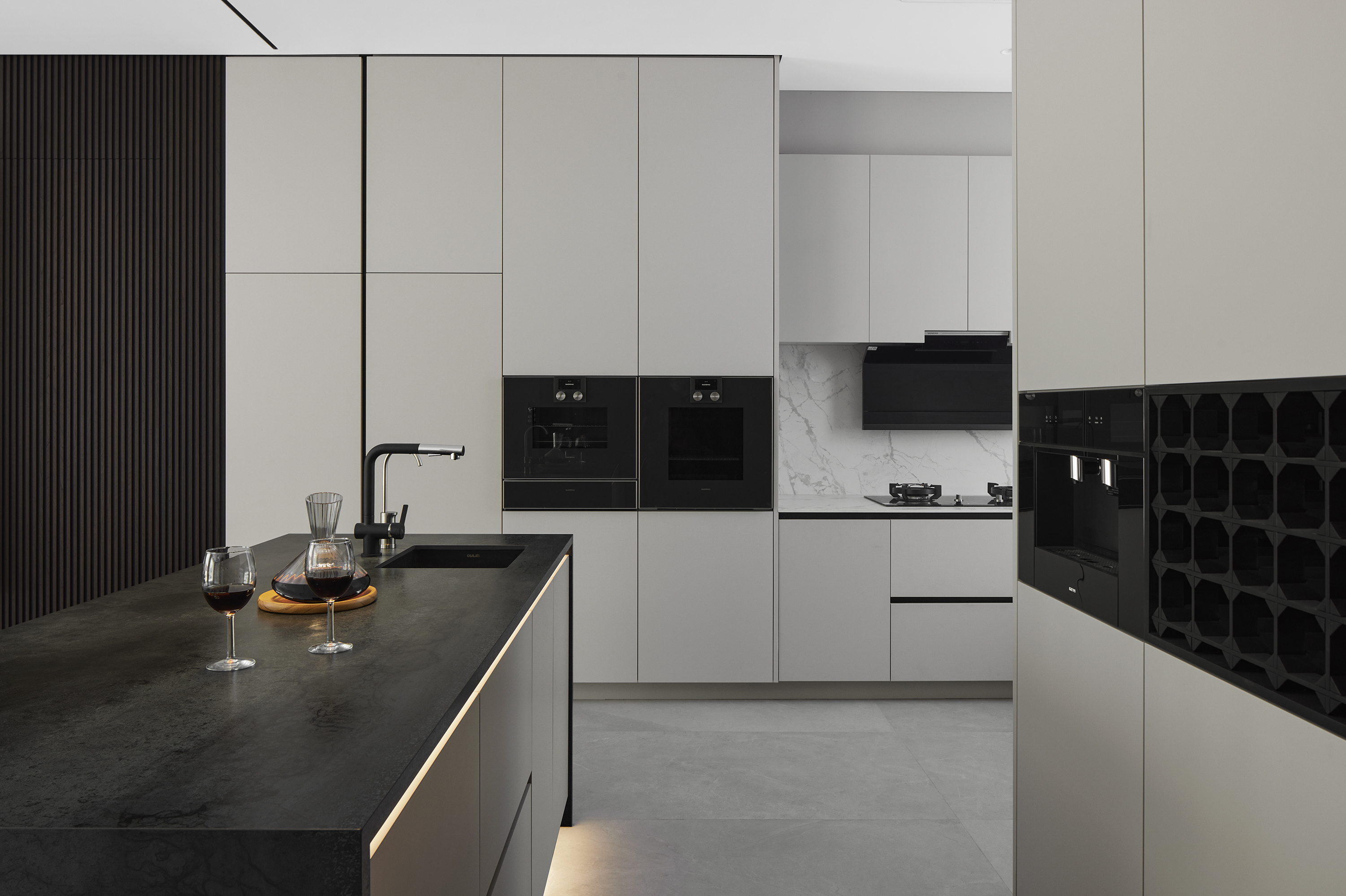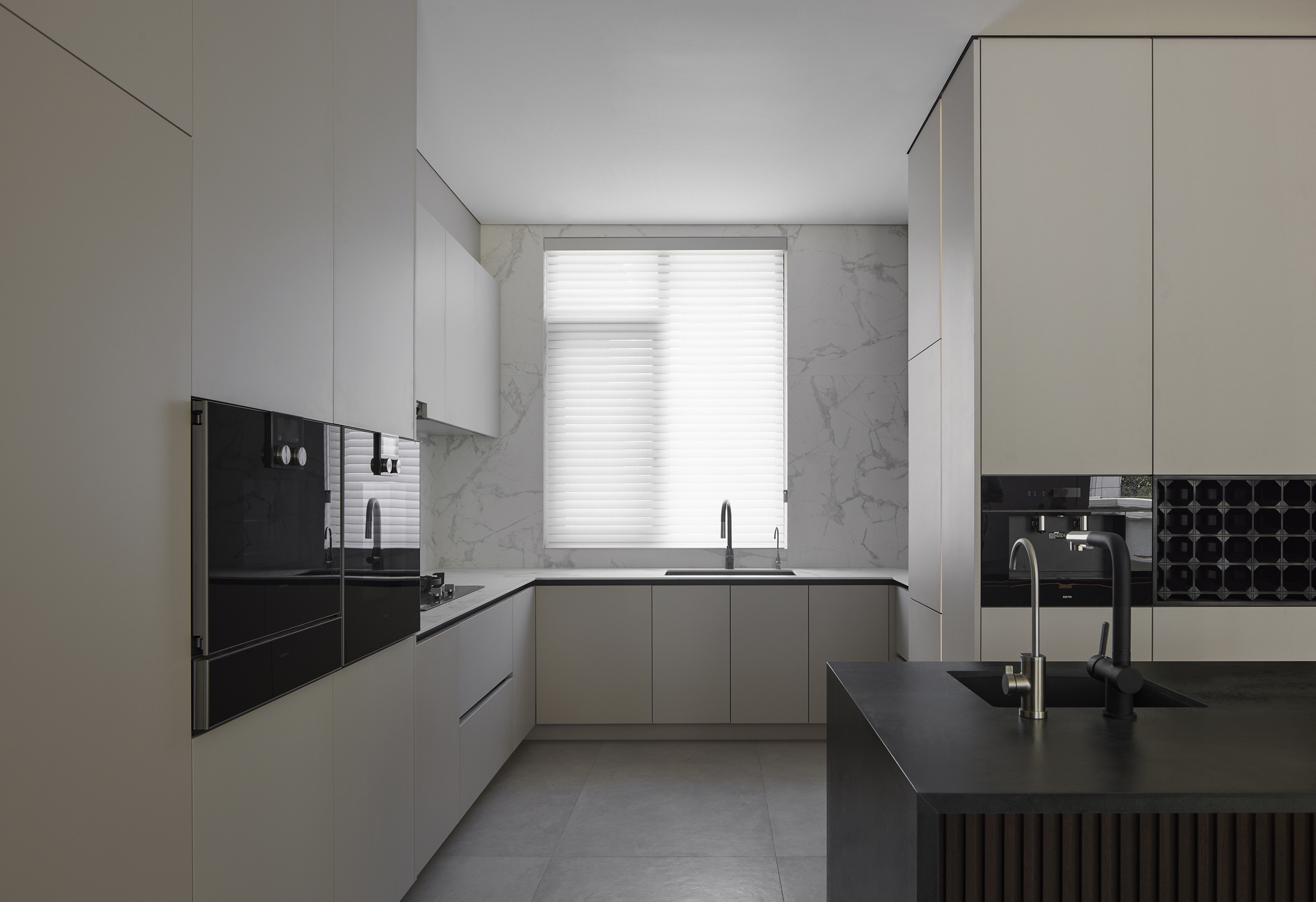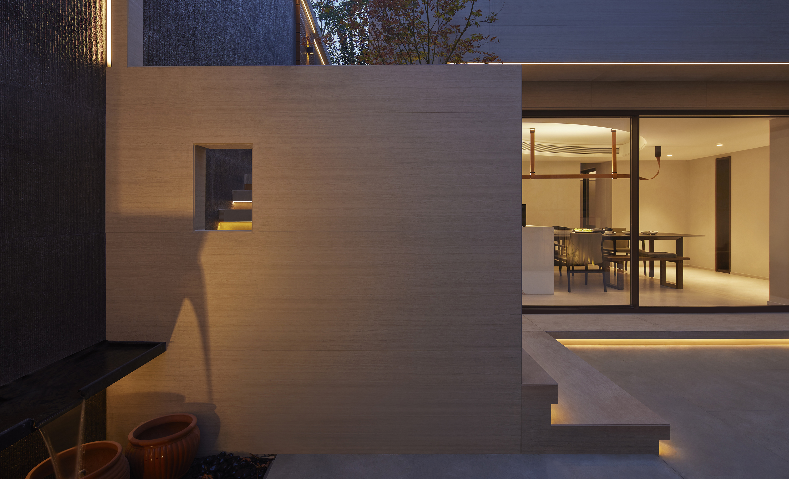 设计选材:设计中,公共空间多处使用镂空透景的设计手法,满足各空间独立的同时将空气和自然光引入地下空间,甚至在中午前后的四五个小时里日光都能从南侧直接照射到负二层北入户的门口,减少了地下空间对灯光的需求。入户的金属玄关做了可以旋转的拨片,避免引入地下的光对人眼产生不适的眩光。且通透的空间调用了地下空间的温度,在夏日与冬日对地上空间温度进行平衡调节。