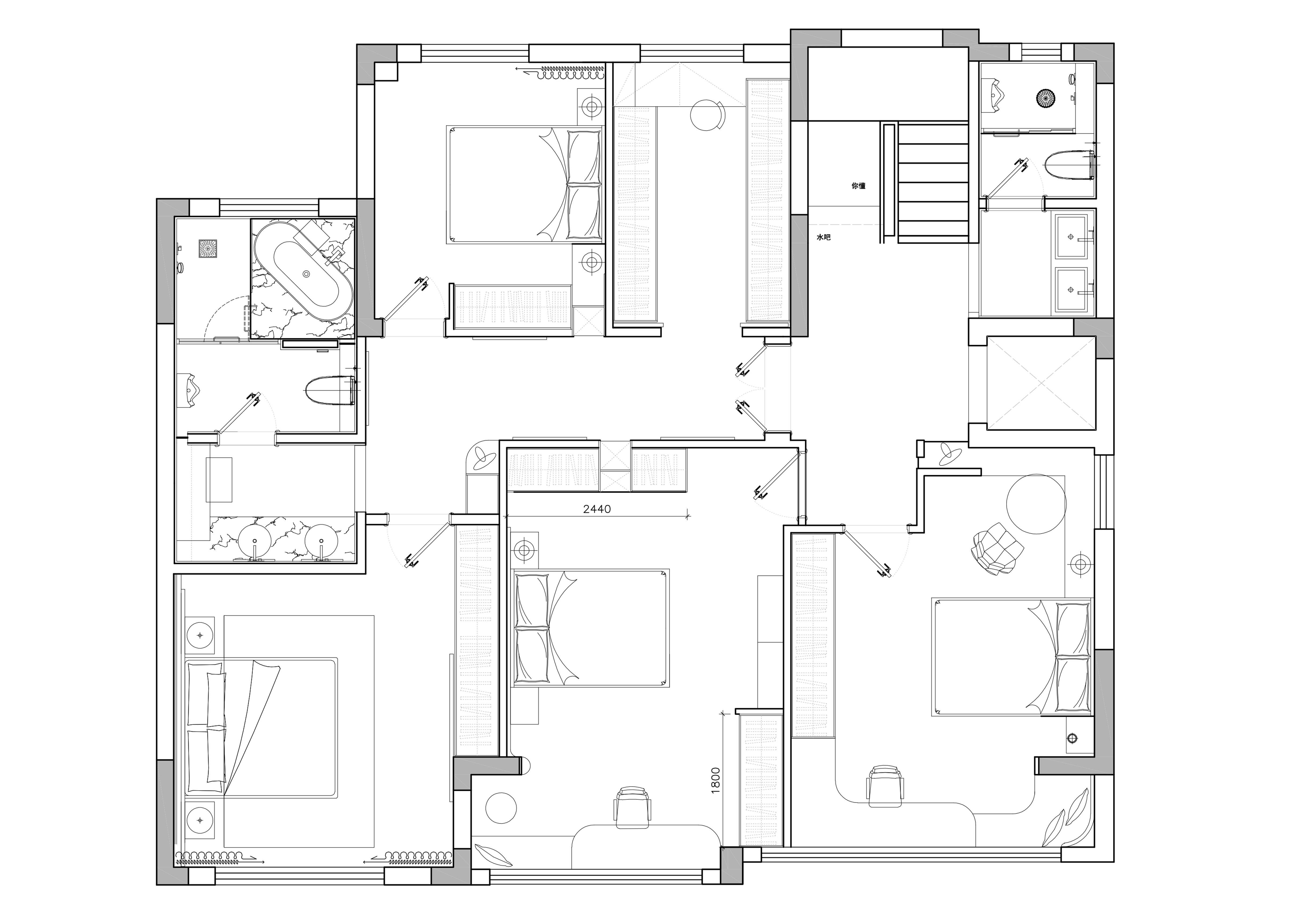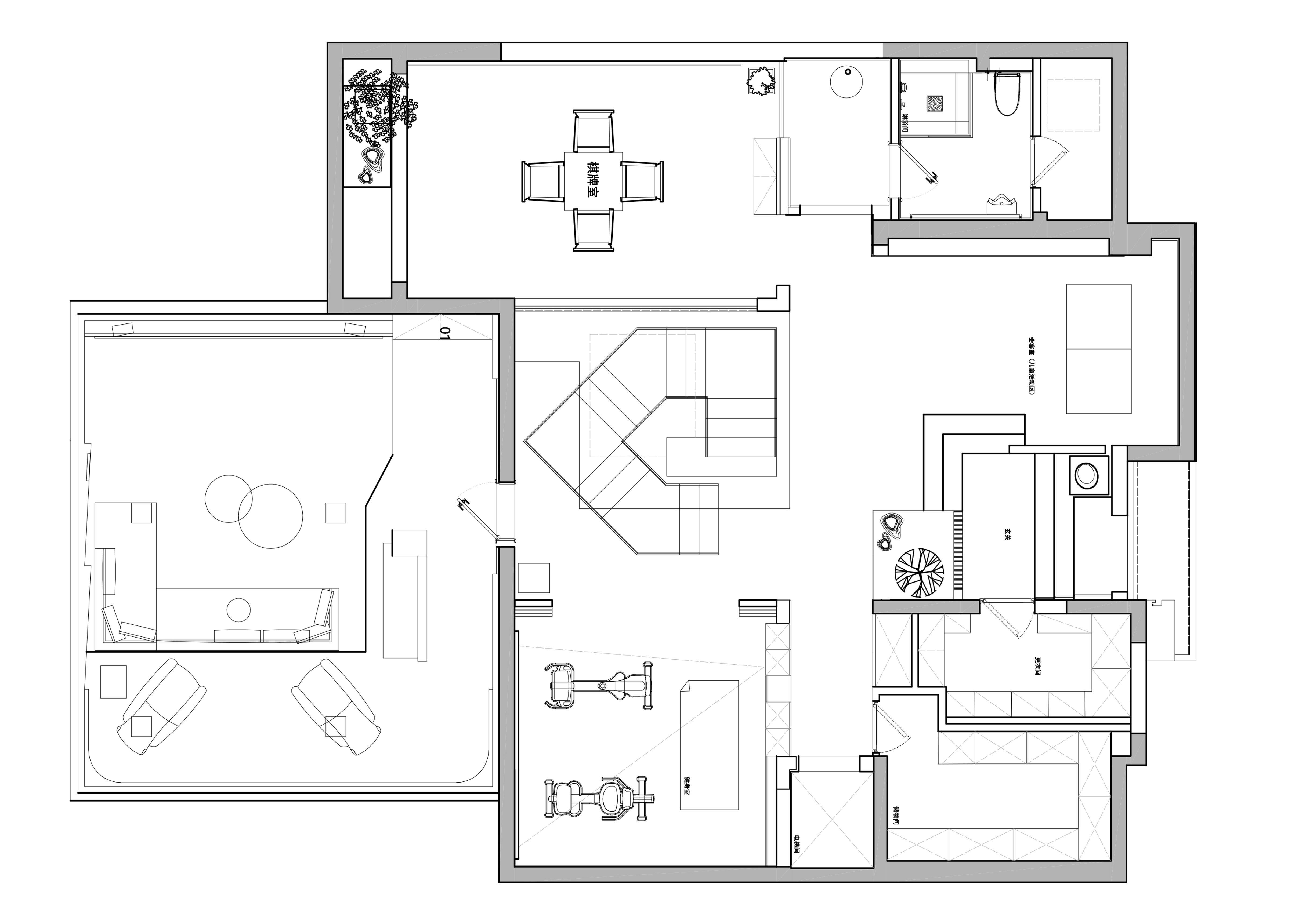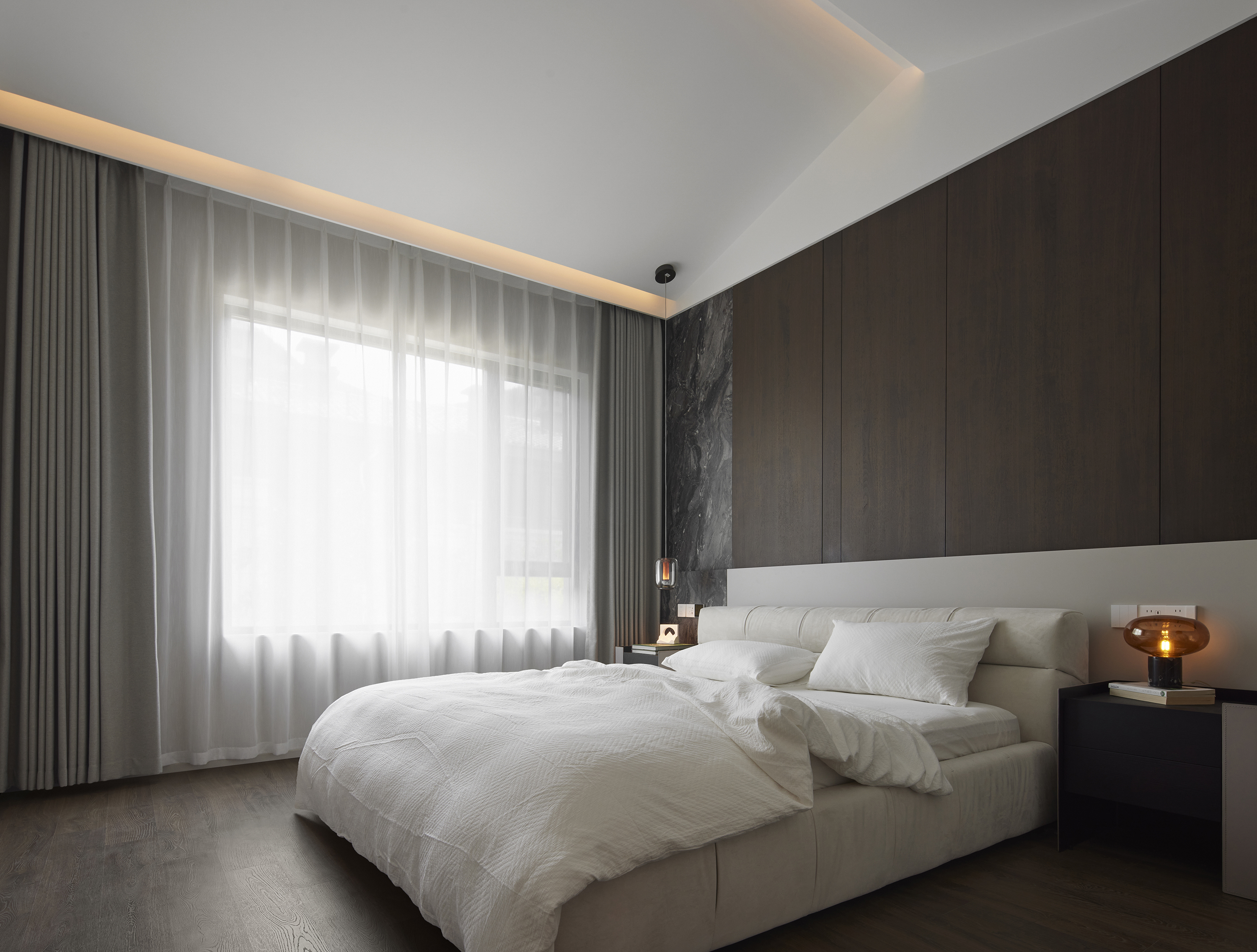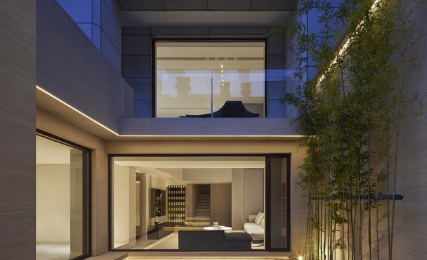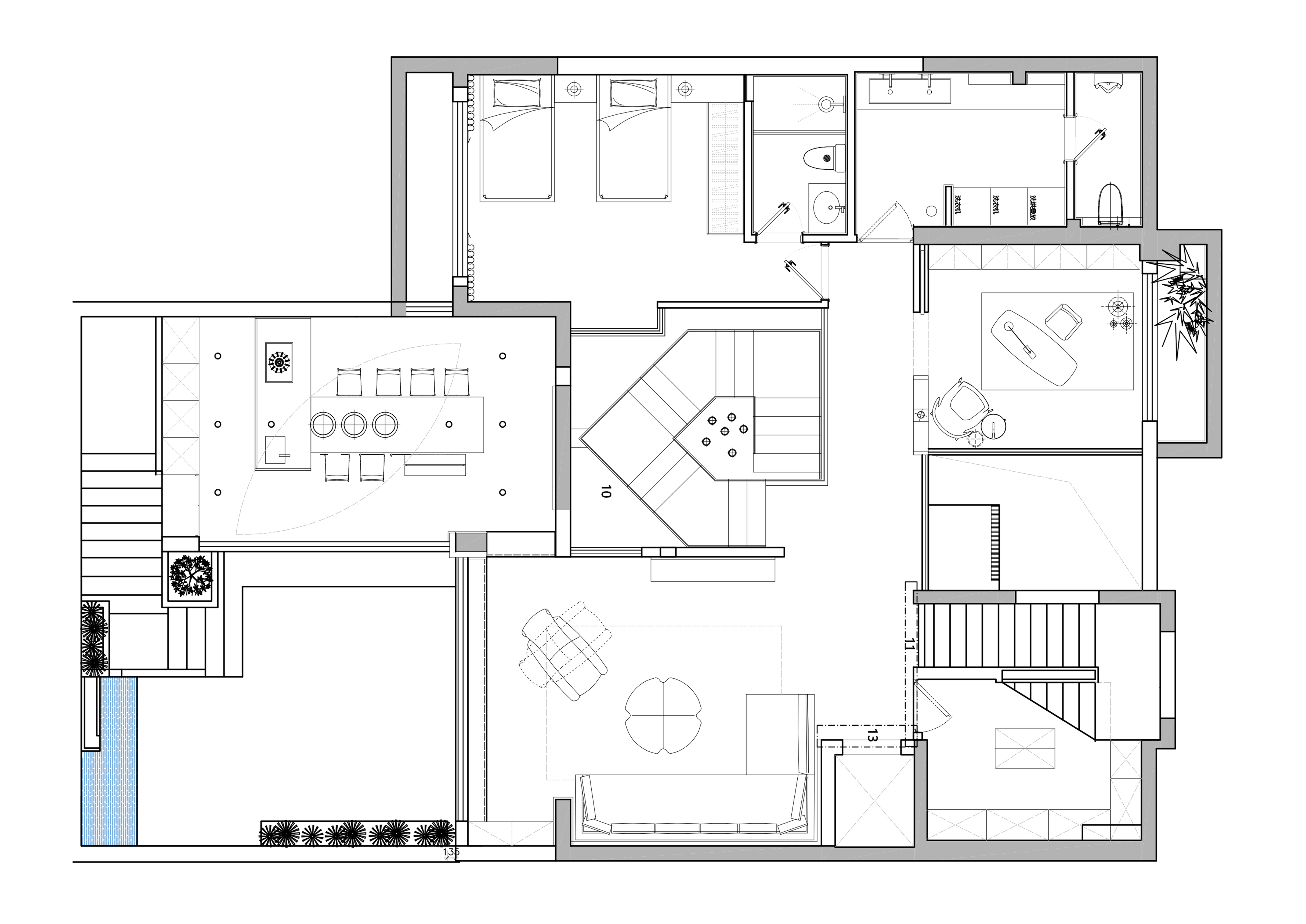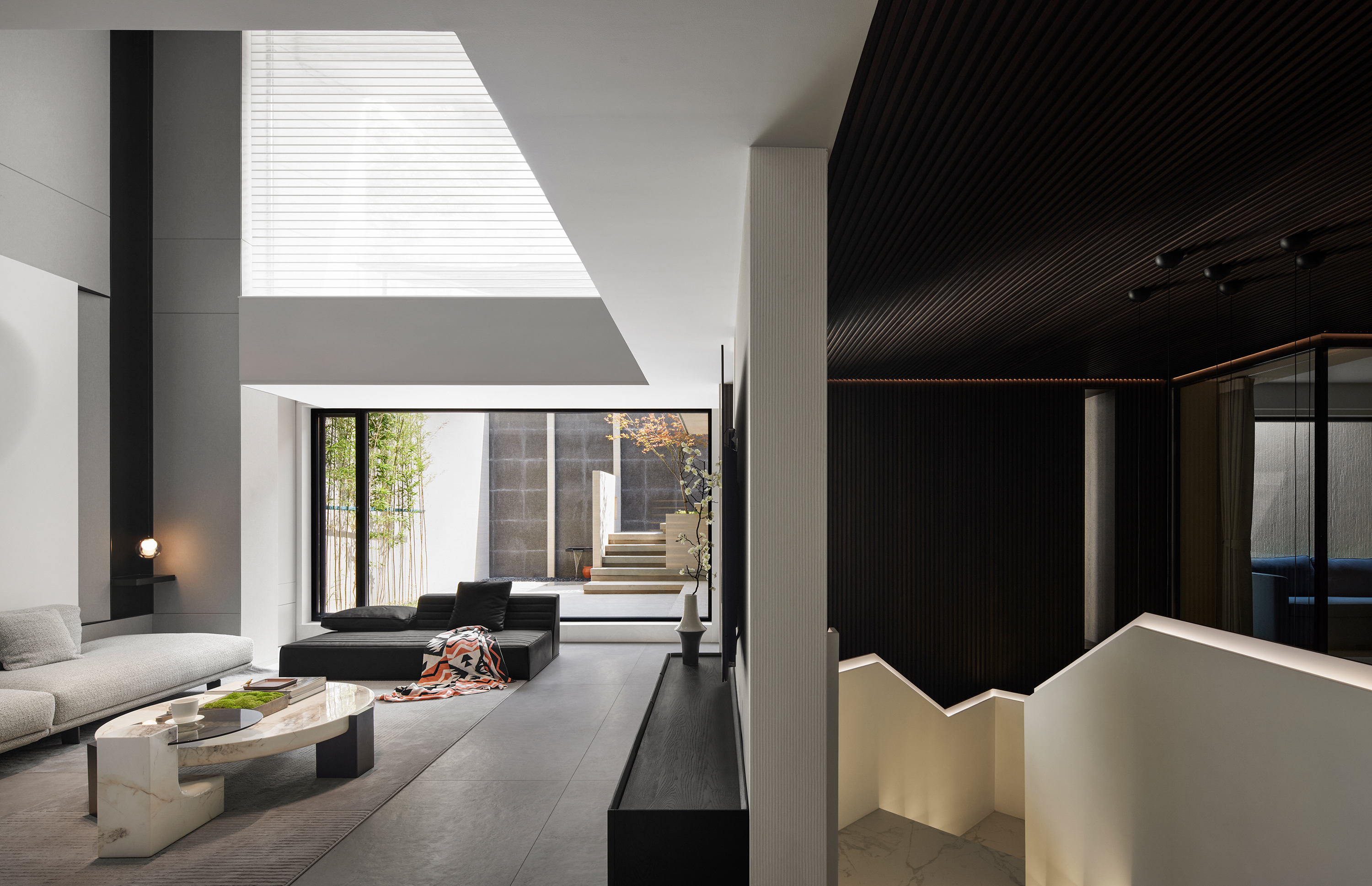 空间意境:项目原结构属于地上2层,地下2层各一半的双拼别墅。且地上结构挑空空间占比25%。所以就导致房子的60%的使用面积是地下空间。亟待解决的问题就是业主的7个房间的需求是无法在地上两层里安排下的,而卧室安排在地下空间一定存在先天的居住条件的劣势。