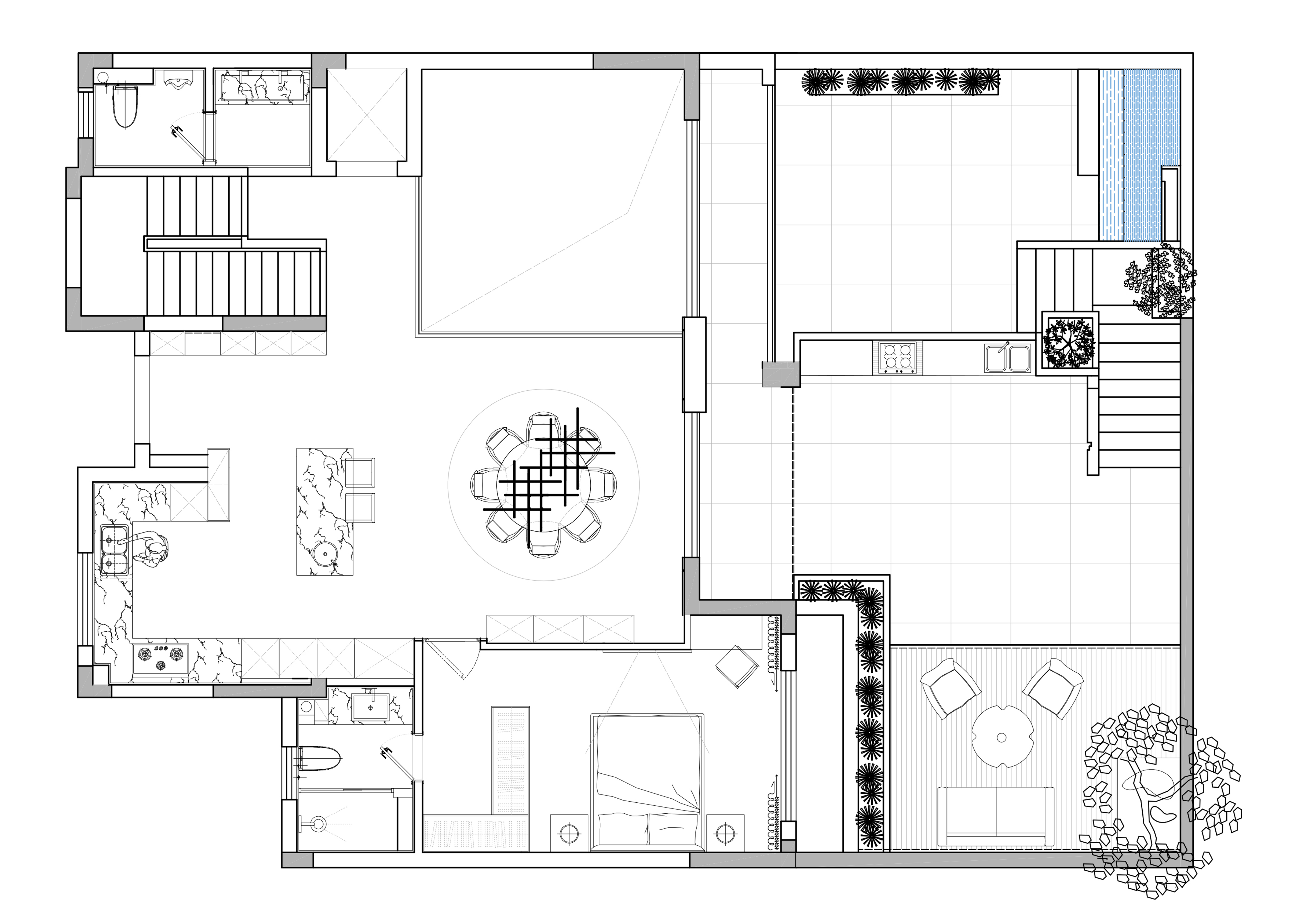 所以在空间改造时,首先将部分区域改为下沉庭院,把原有的地下一空间改造成地上一层的感受。增大了自然采光通风的区域。