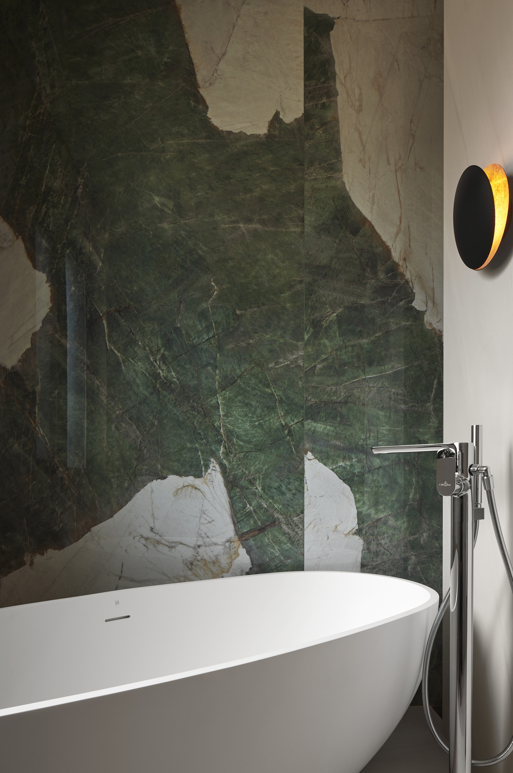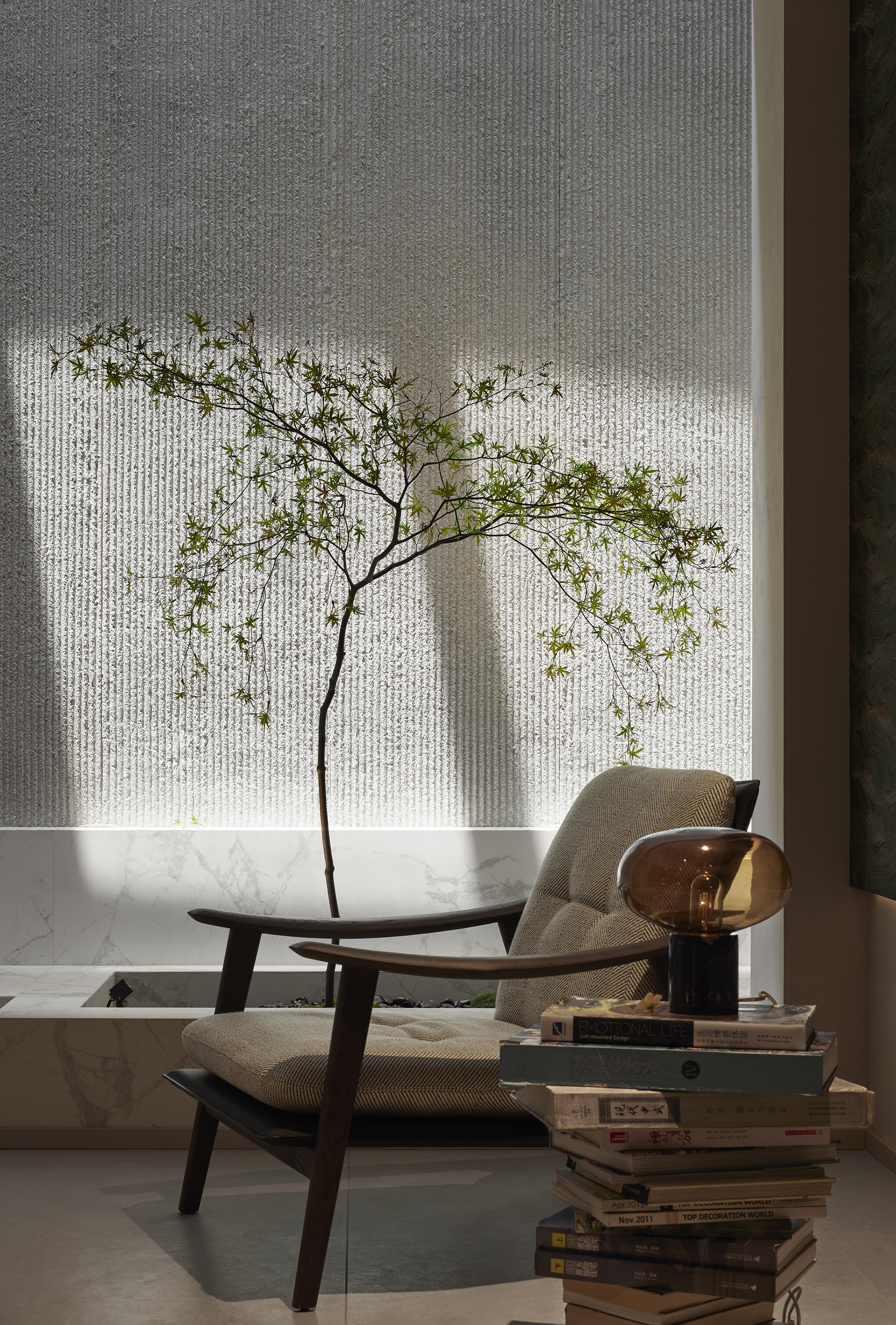 天井墙面使用了人造的可再生柔性石材材质,该材质有较好的阻热功能,能有效地减少临土墙面的冷凝水的产生,从而降低地下空间的湿度。 -