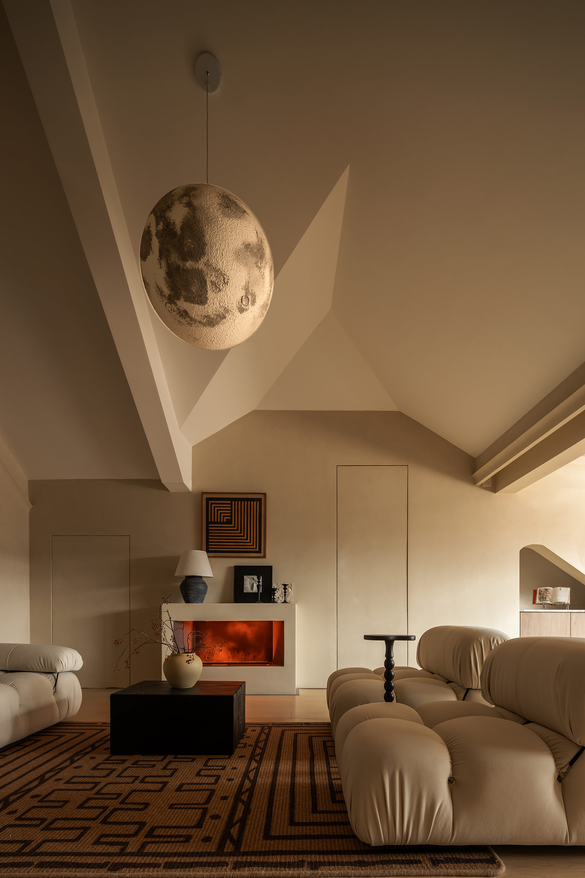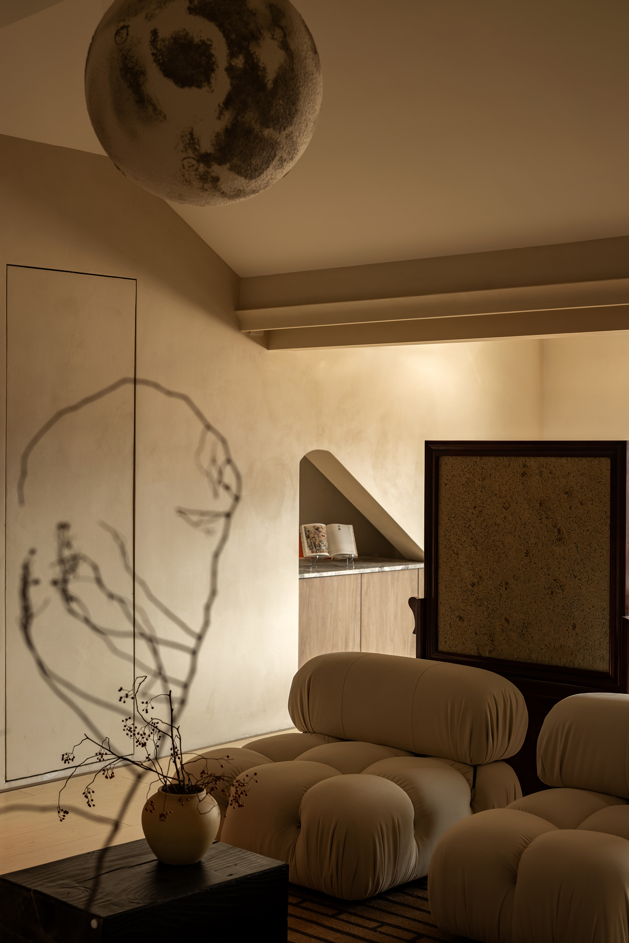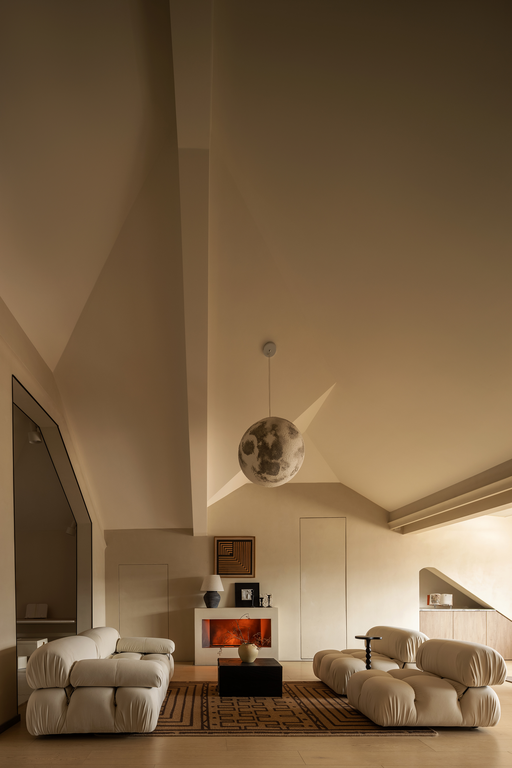 2.顶复结构采光比较好,尽可能的借助阳光和室内的软装与墙体结构来营造不同光线变化下的空间变化,让它成为一个“活”空间,让自然光能够和室内的绿植区,舒适休闲区来做多维度亲和。