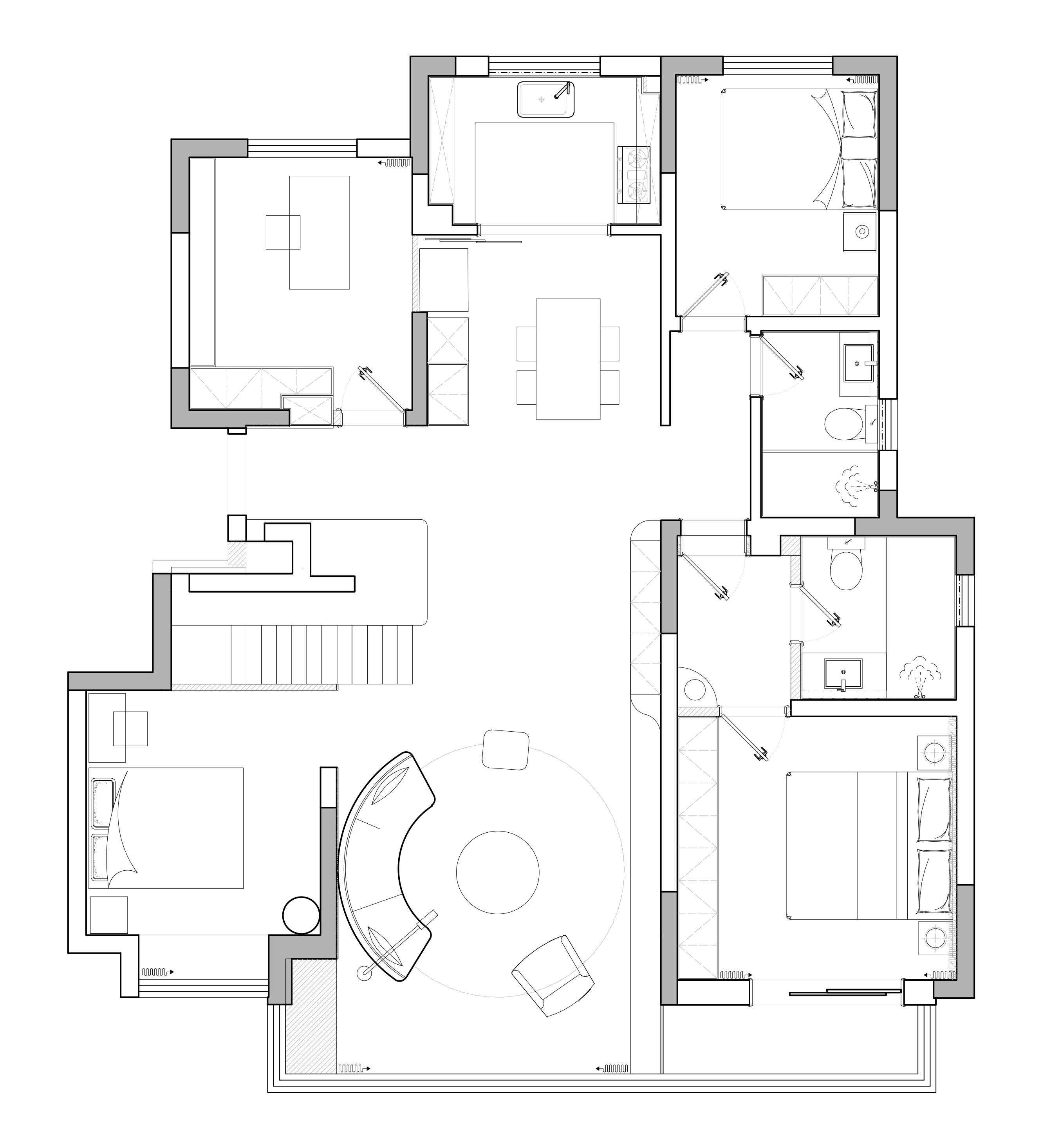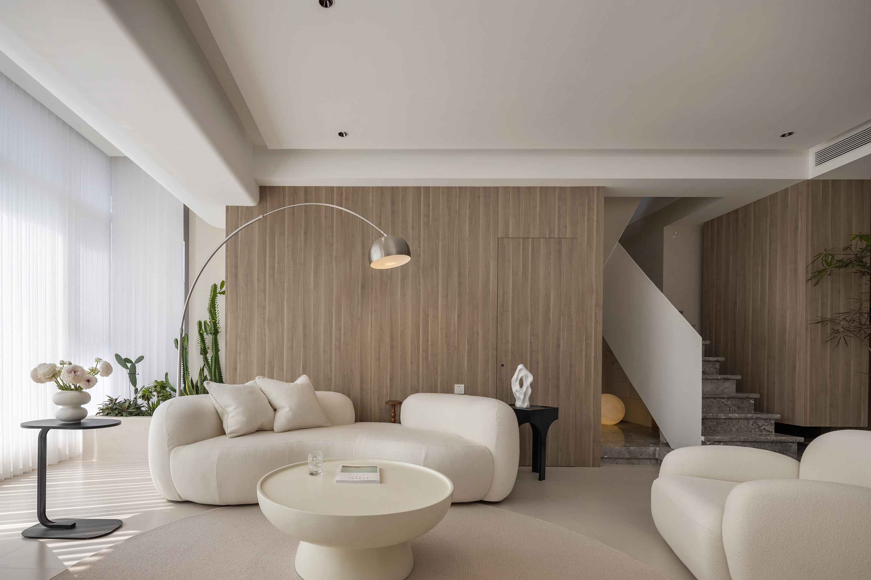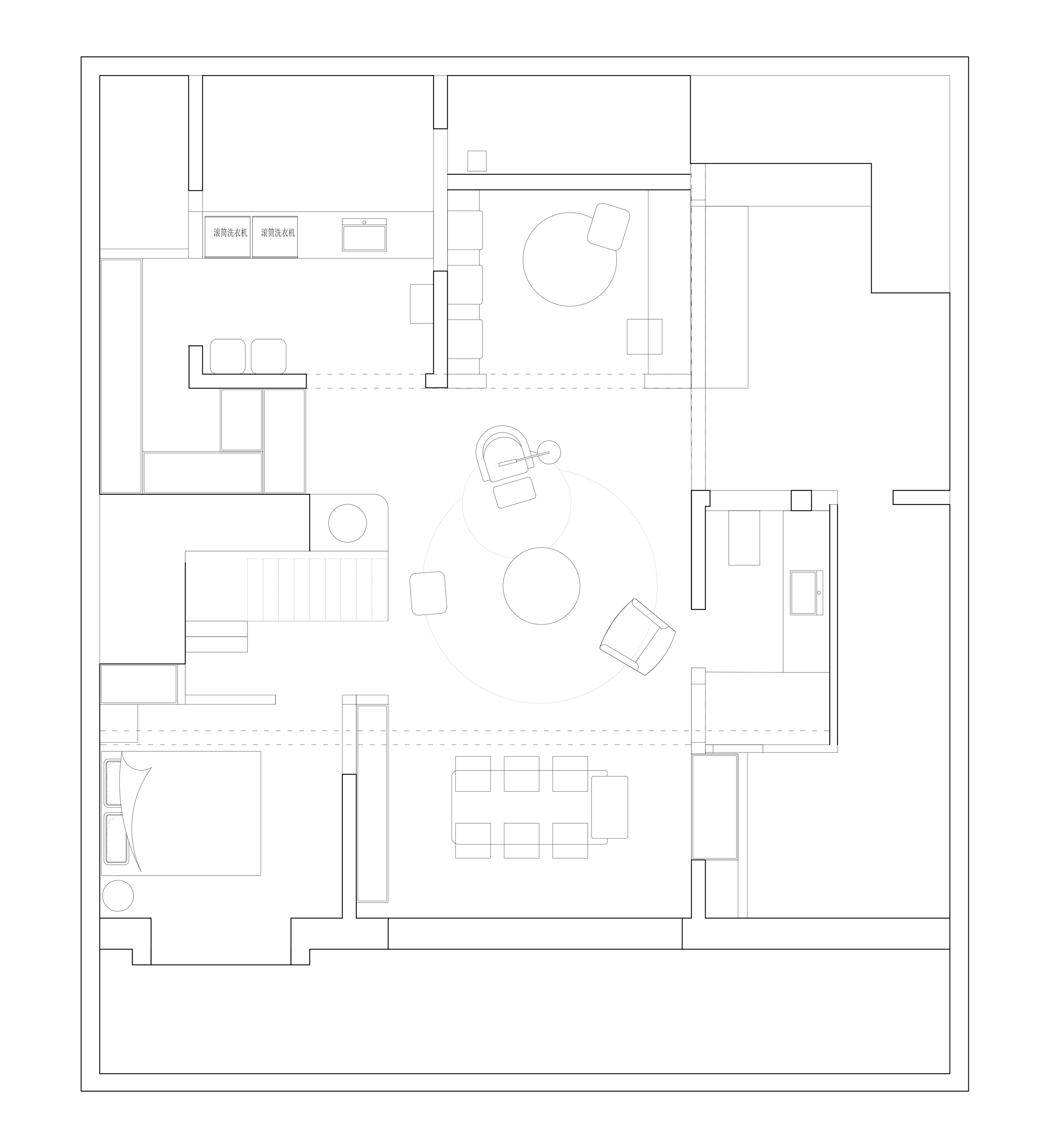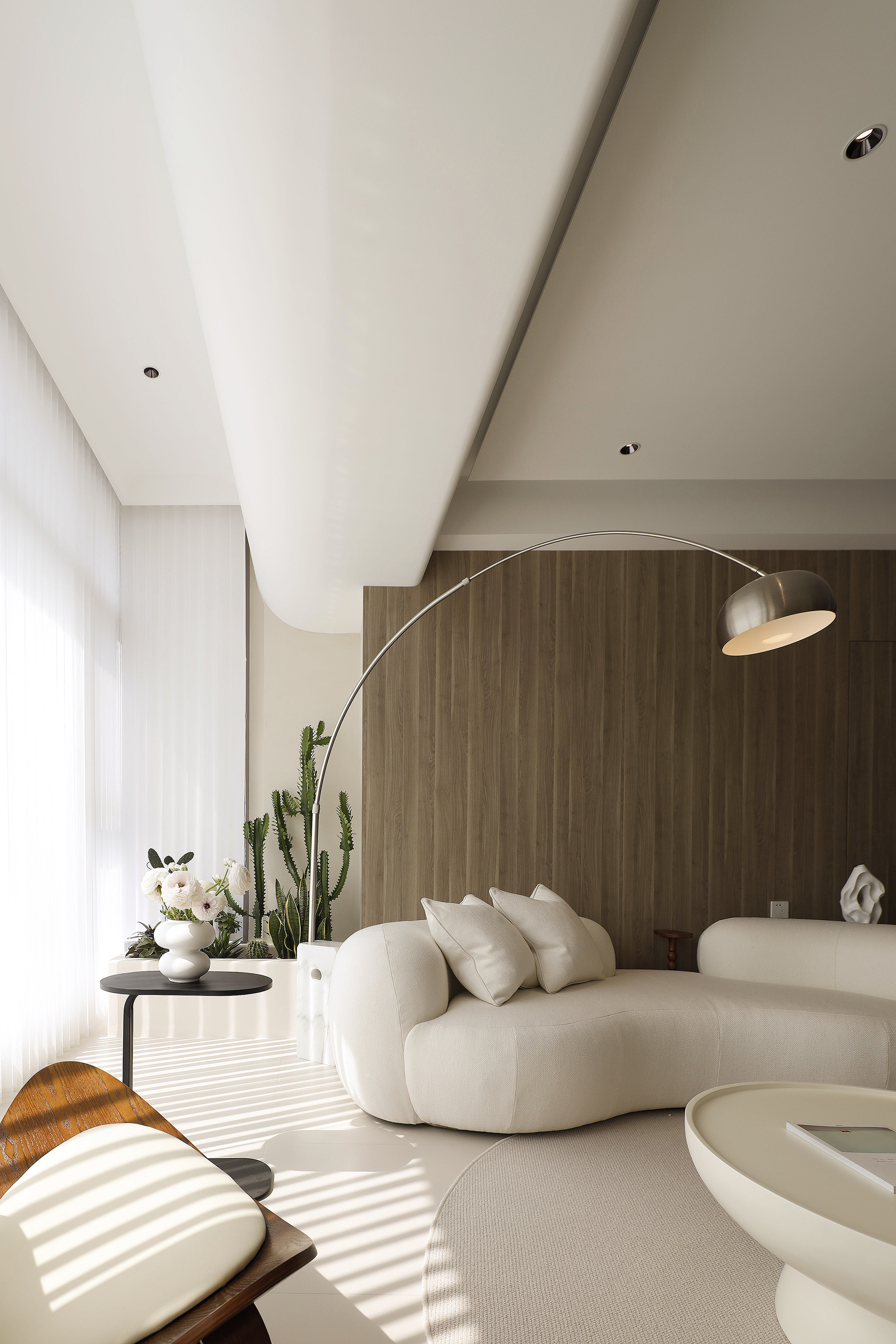 2.顶复结构采光比较好,尽可能的借助阳光和室内的软装与墙体结构来营造不同光线变化下的空间变化,让它成为一个“活”空间,让自然光能够和室内的绿植区,舒适休闲区来做多维度亲和。