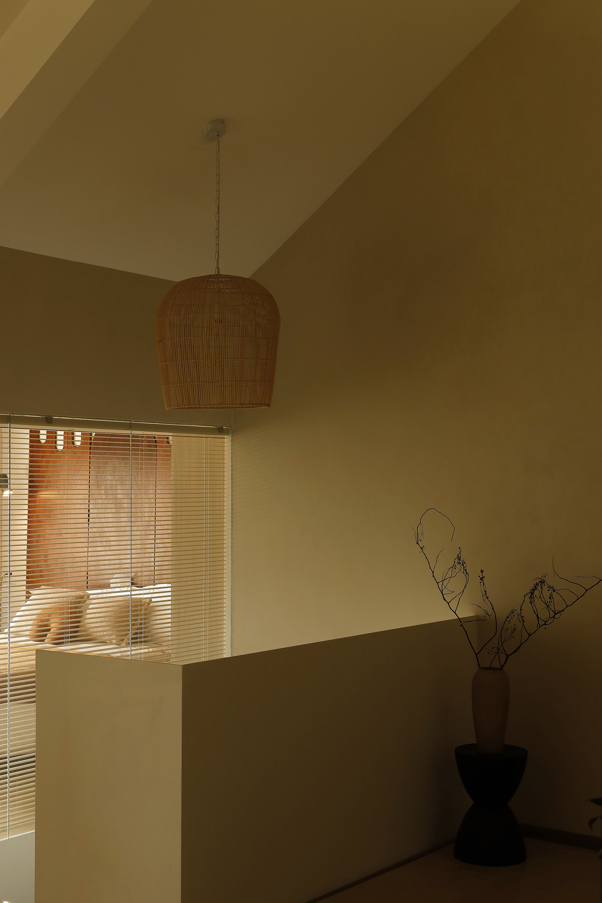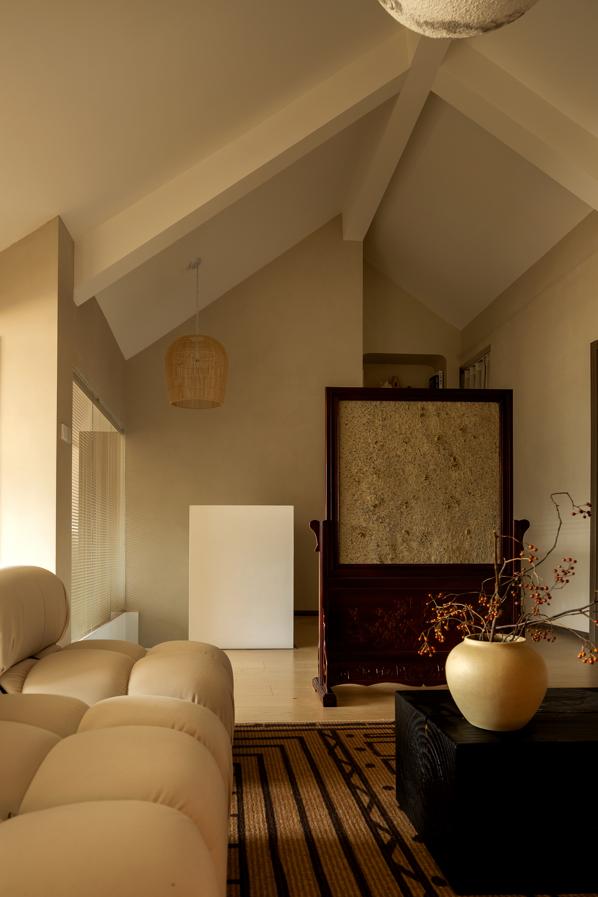 3.二层空间原本为坡顶,借用建筑本身的结构,充分裸露来营造空间的张力,让“柔”与“和”的室内装饰和其对比来制造“矛盾”,期望引发空间内人的思考。 -