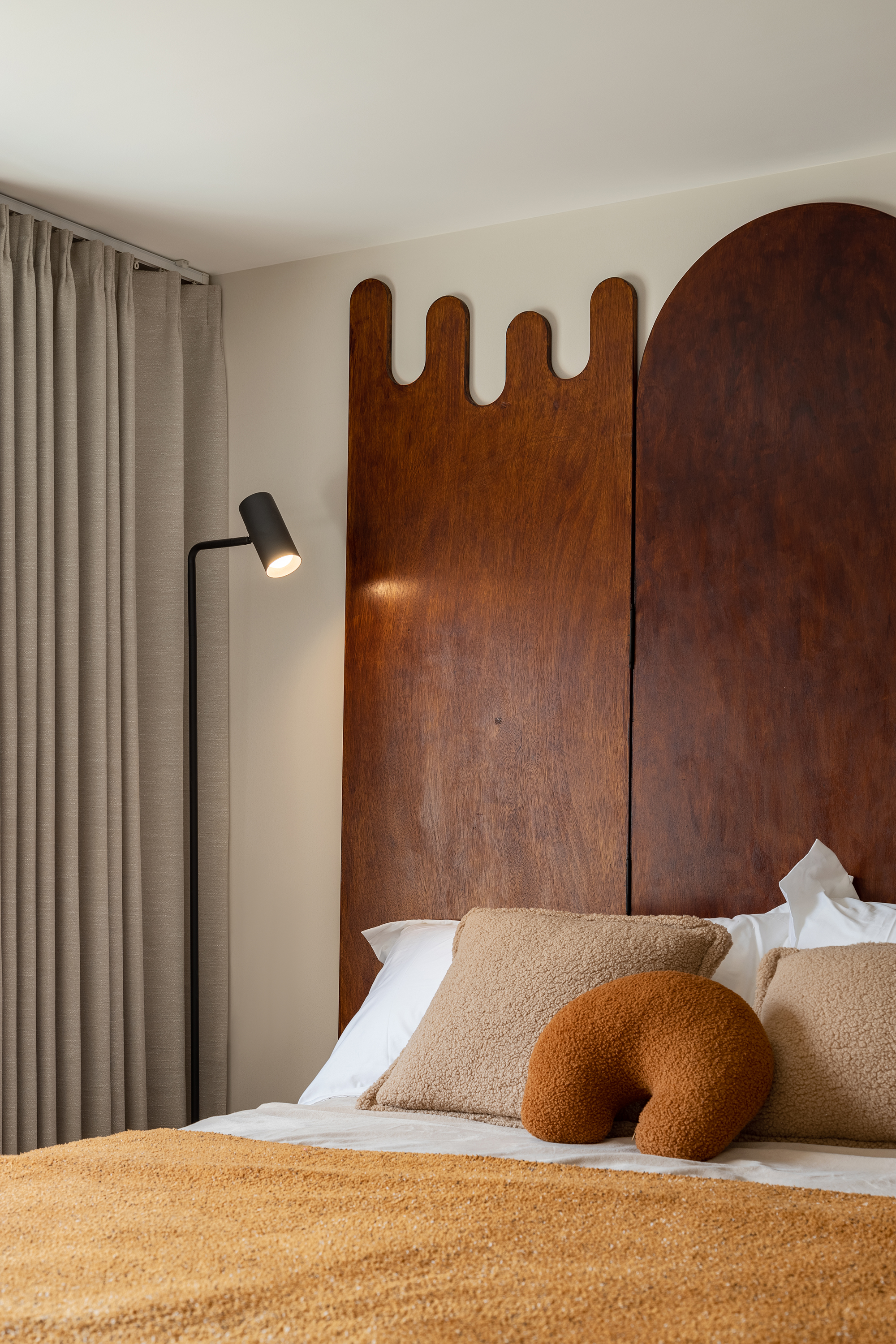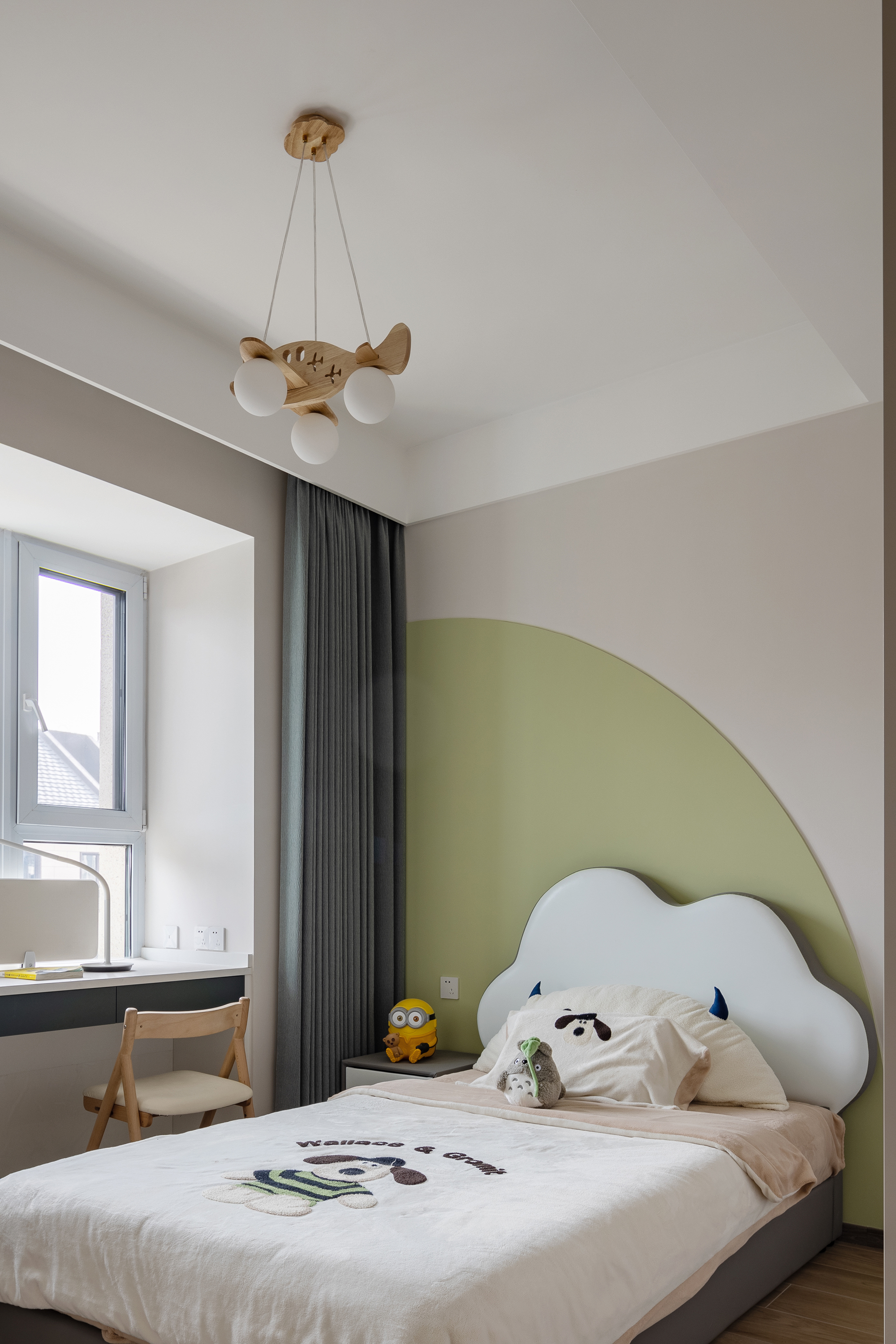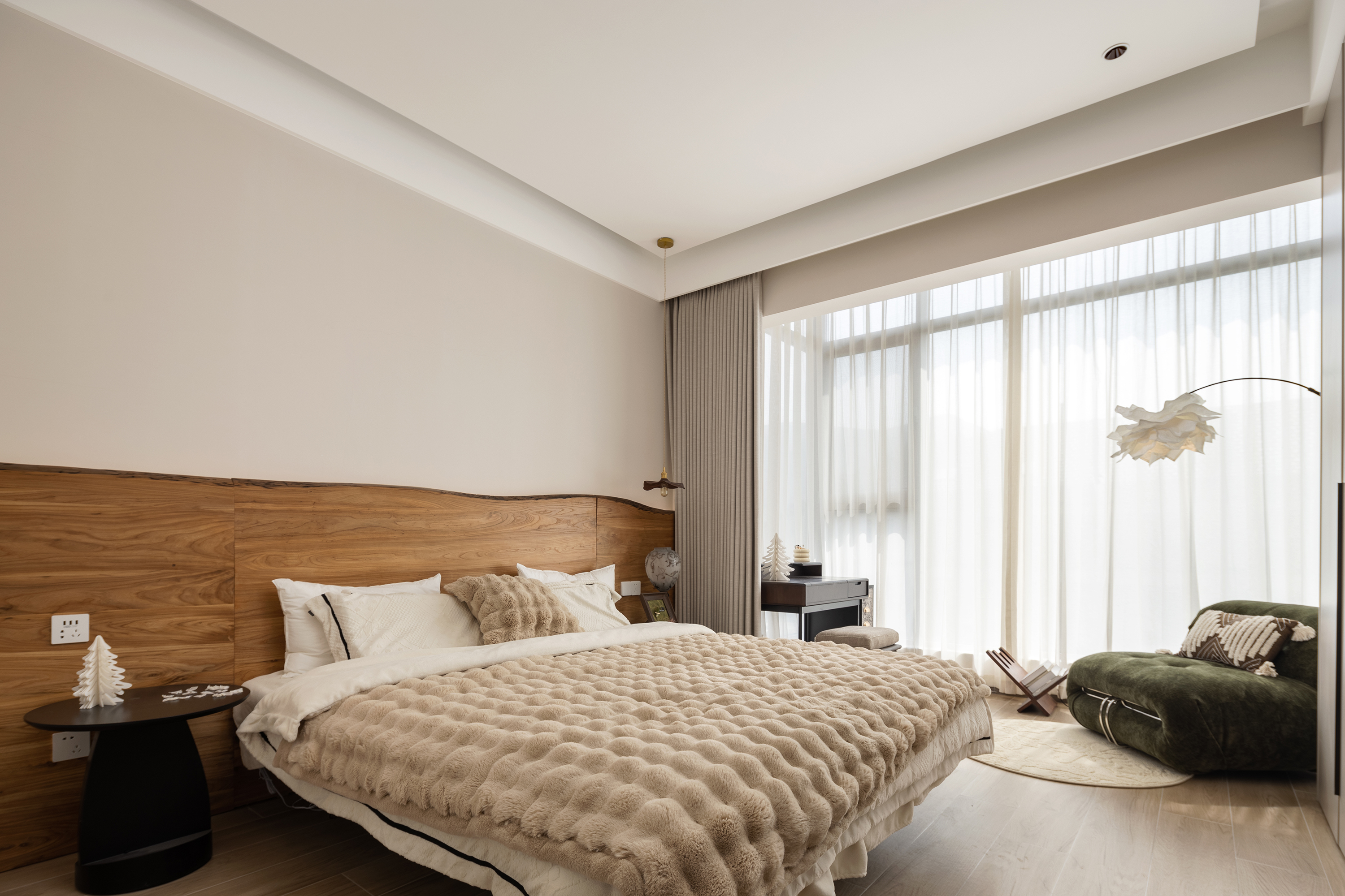 设计选材:一楼主卧的床头选用了一块原木自然边的实木板,来做卧室空间的“柔”