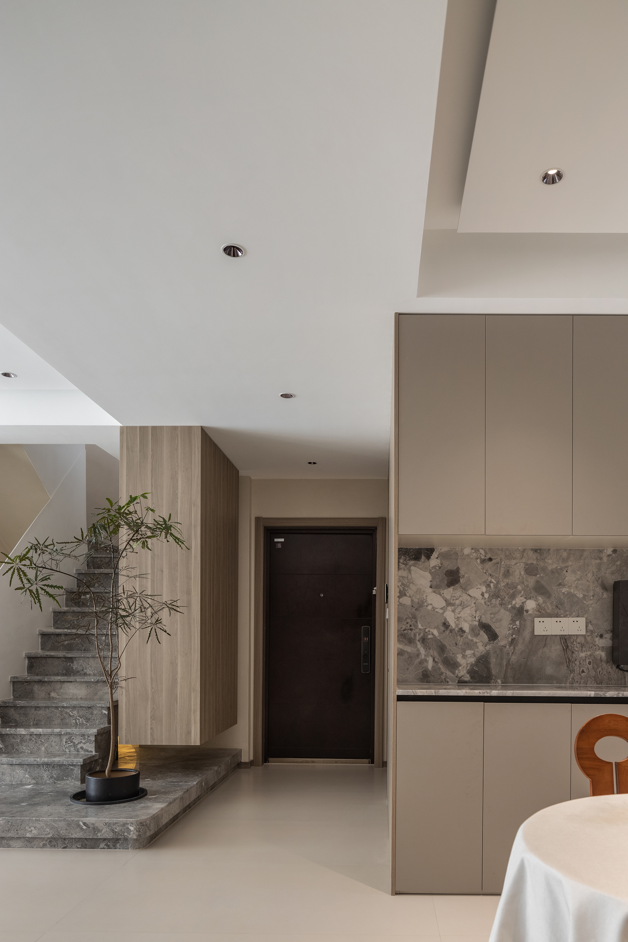 1.进门之后楼梯上方有一个储物柜,和墙做离缝,留有一些呼吸感,同时把它悬挑,留有窥探的欲望。