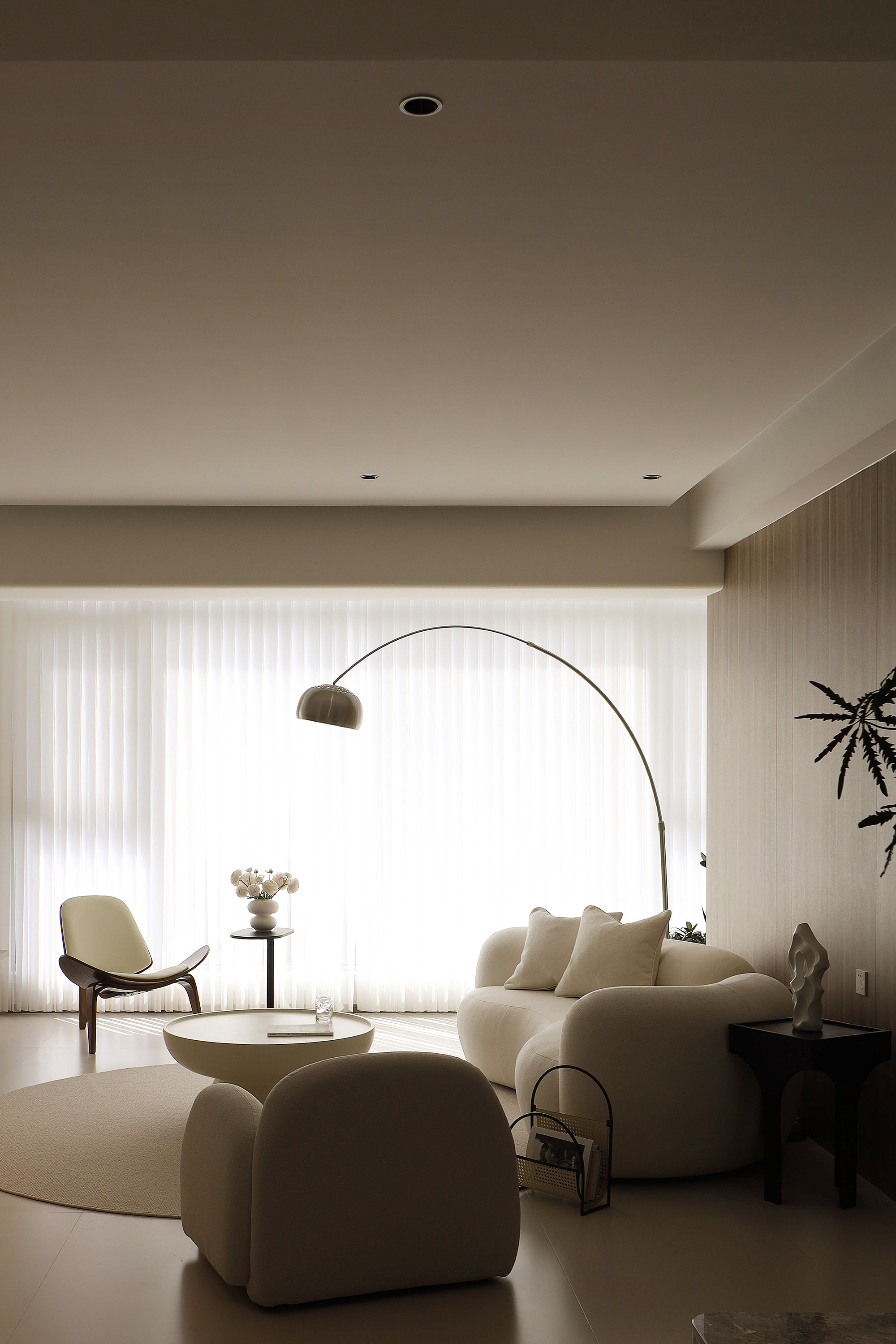 2.走到客厅往南看,南侧阳台上有一片白色纯净的纱帘给绿植区域扑抹一个干净且质朴的背景底色,让绿色的生机能够传递到我们感官上。