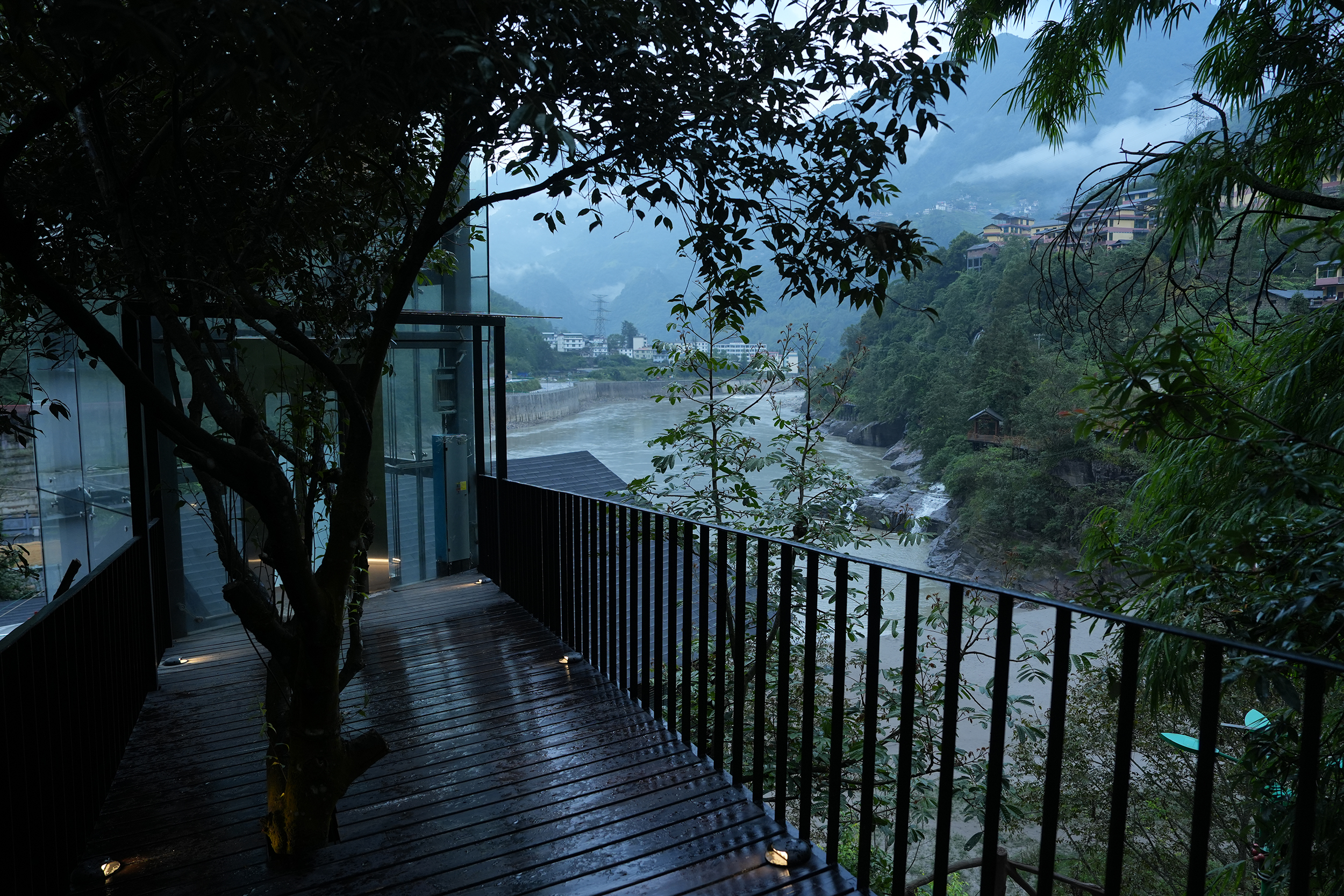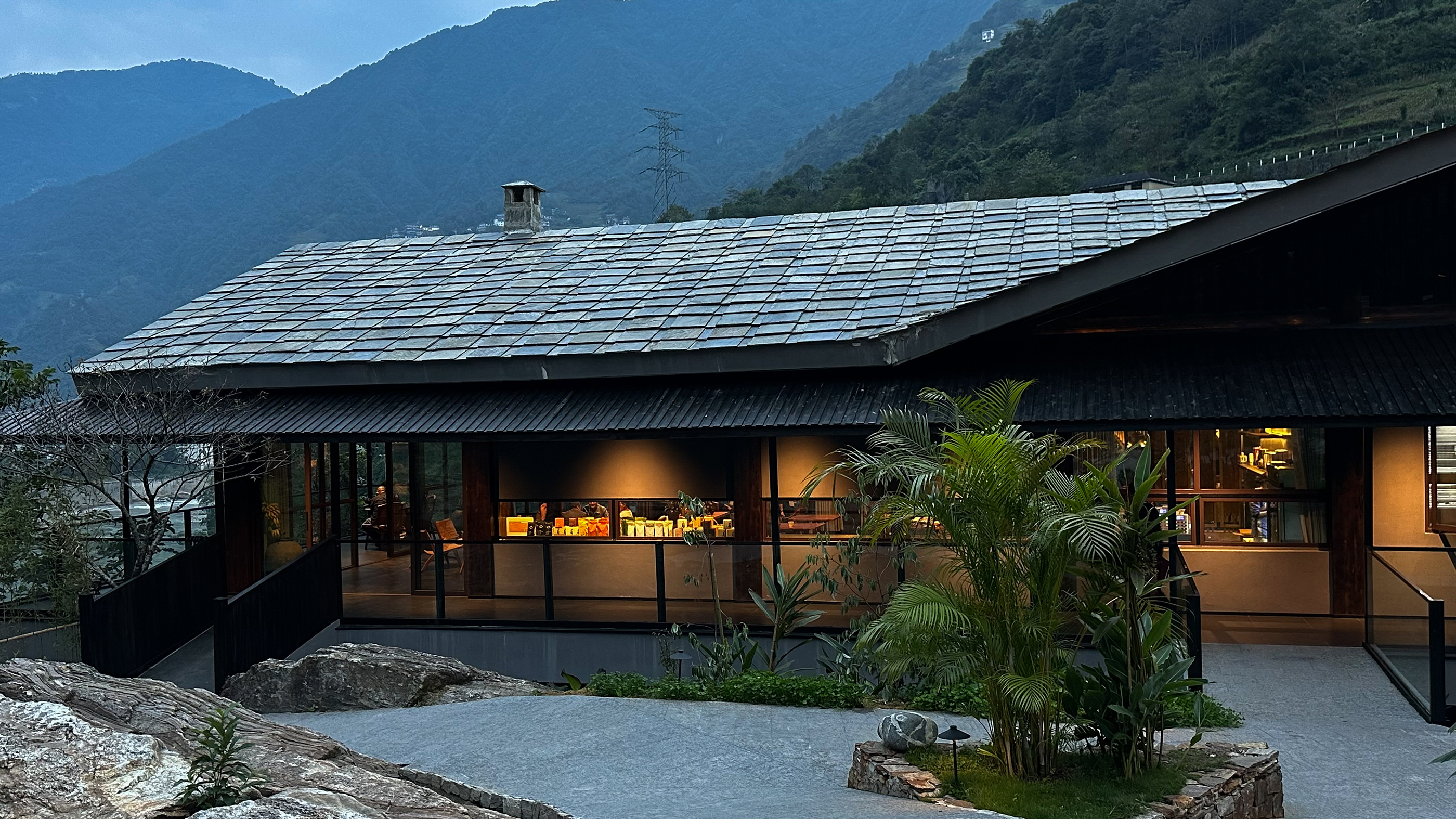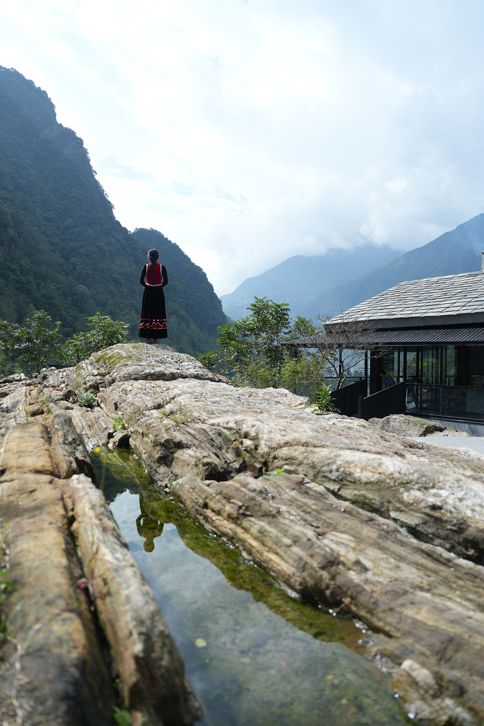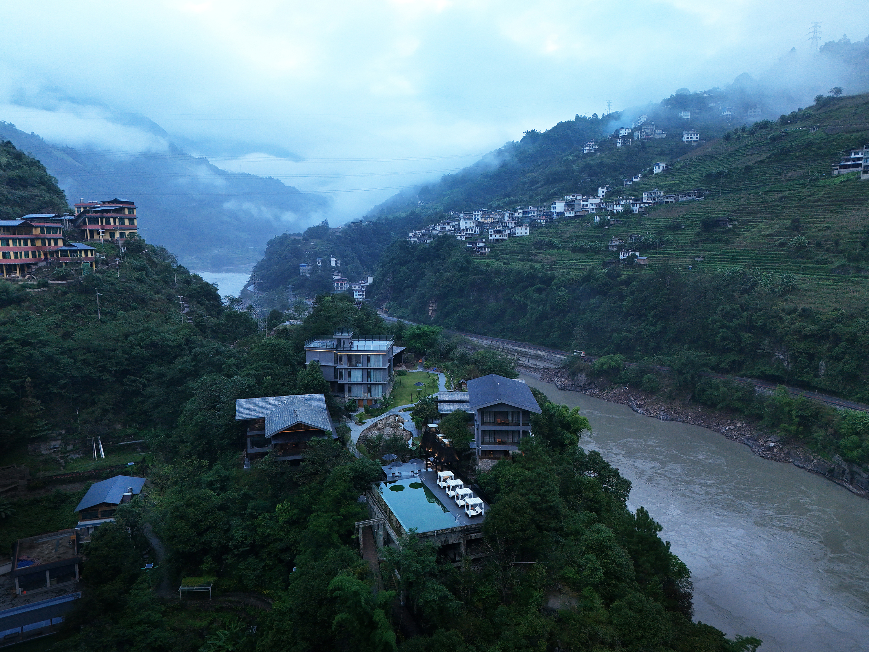 设计比较克制,以自然为底色,弱化建筑物于自然场景的存在感。深灰色为主调建筑立面,将建筑消隐在山林里,与傈僳族、怒族传统建筑的结合,吊脚楼、低矮的瓦檐、石板瓦,赋予建筑沉稳、低调的气质。客人到来车停在对岸,步行经过50长的软桥跨过怒江,在桥头接待厅体验傈僳族的迎客之道,然后乘坐18米高的观光电梯到半山腰,步行走过空中木栈道,此时可以看到飞瀑、听着鸟鸣,感受着自然的气息,沿道而上,要经过悬崖泳池底部,到达餐厅、悬崖泳池,视线豁然开朗。