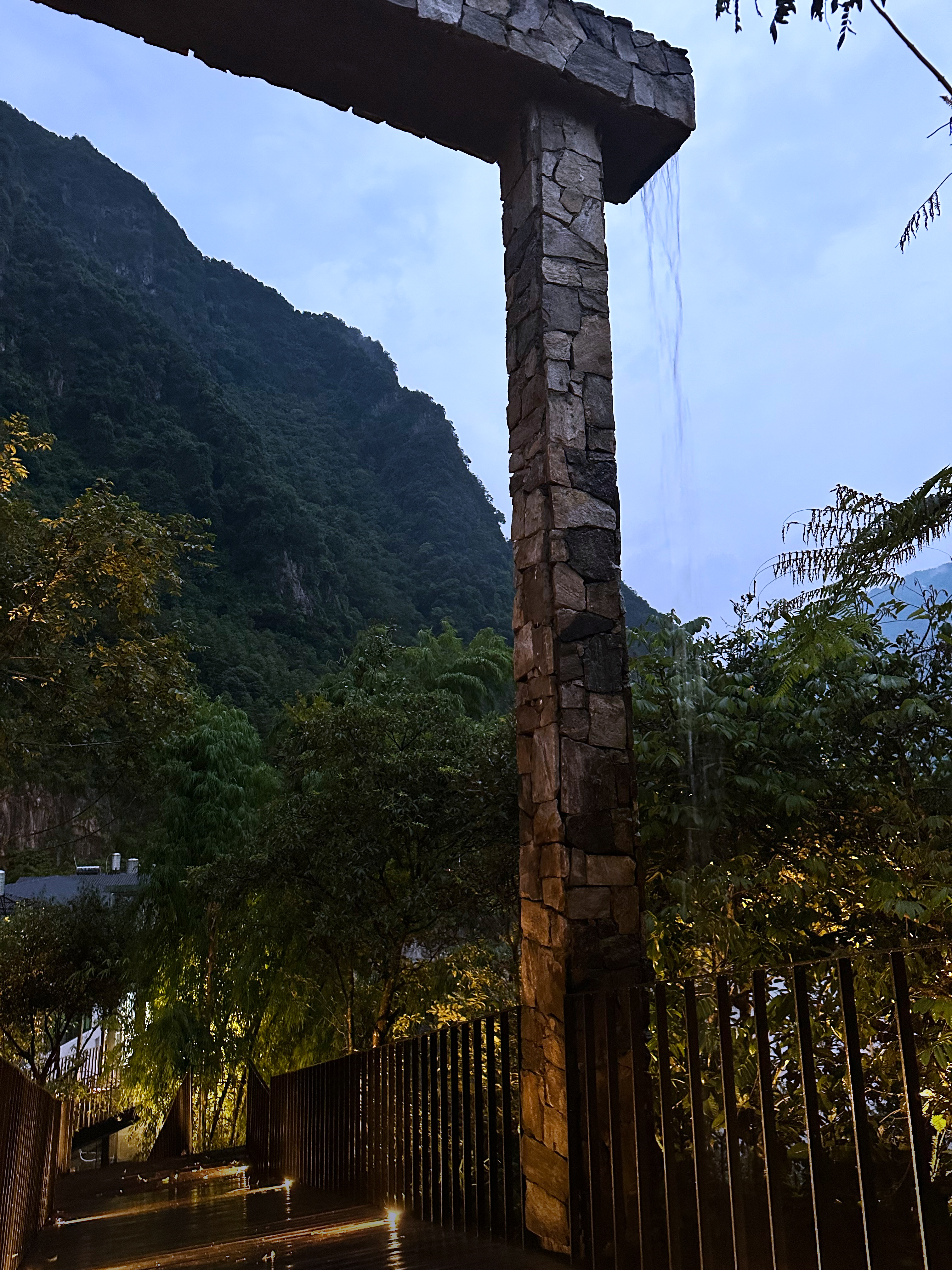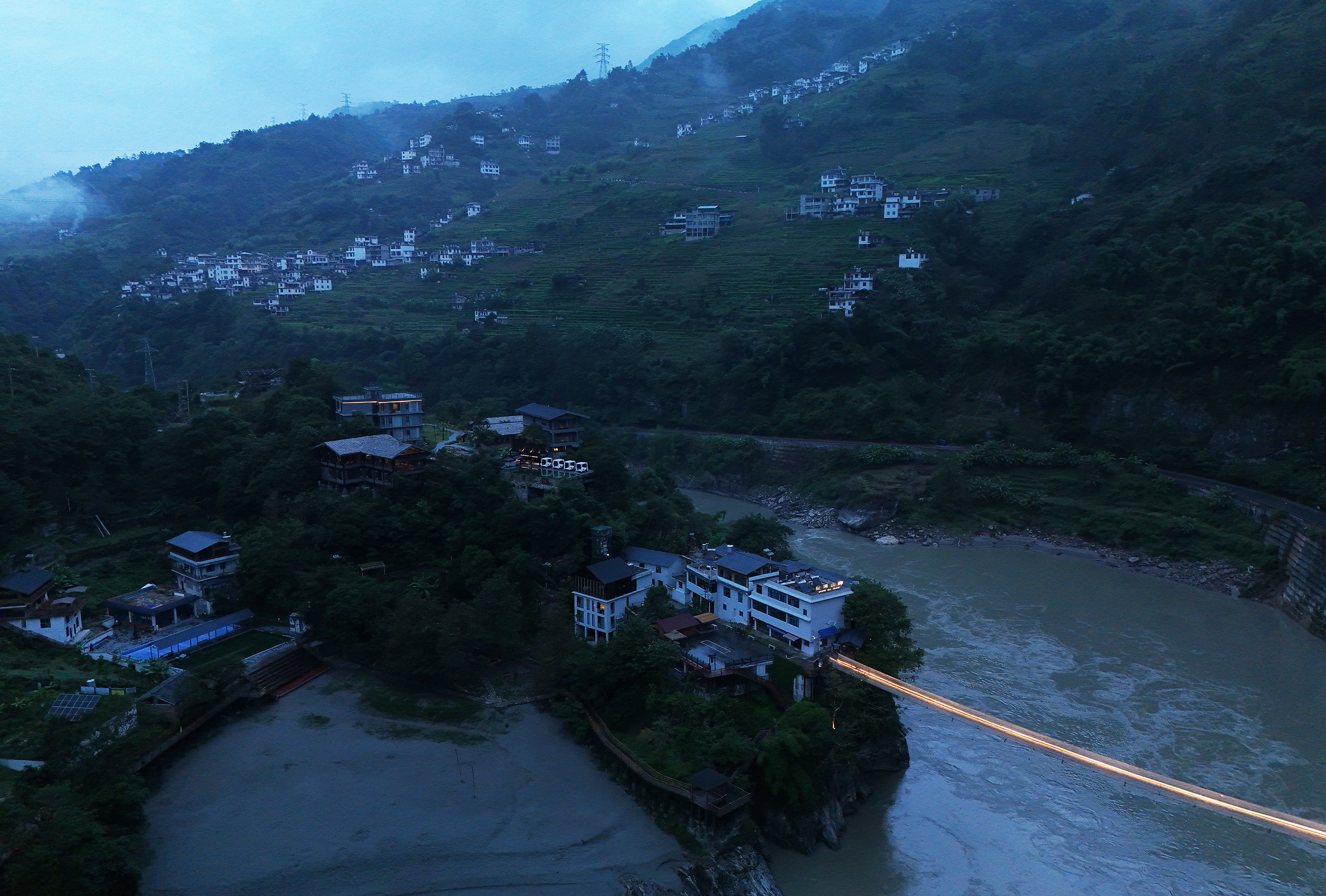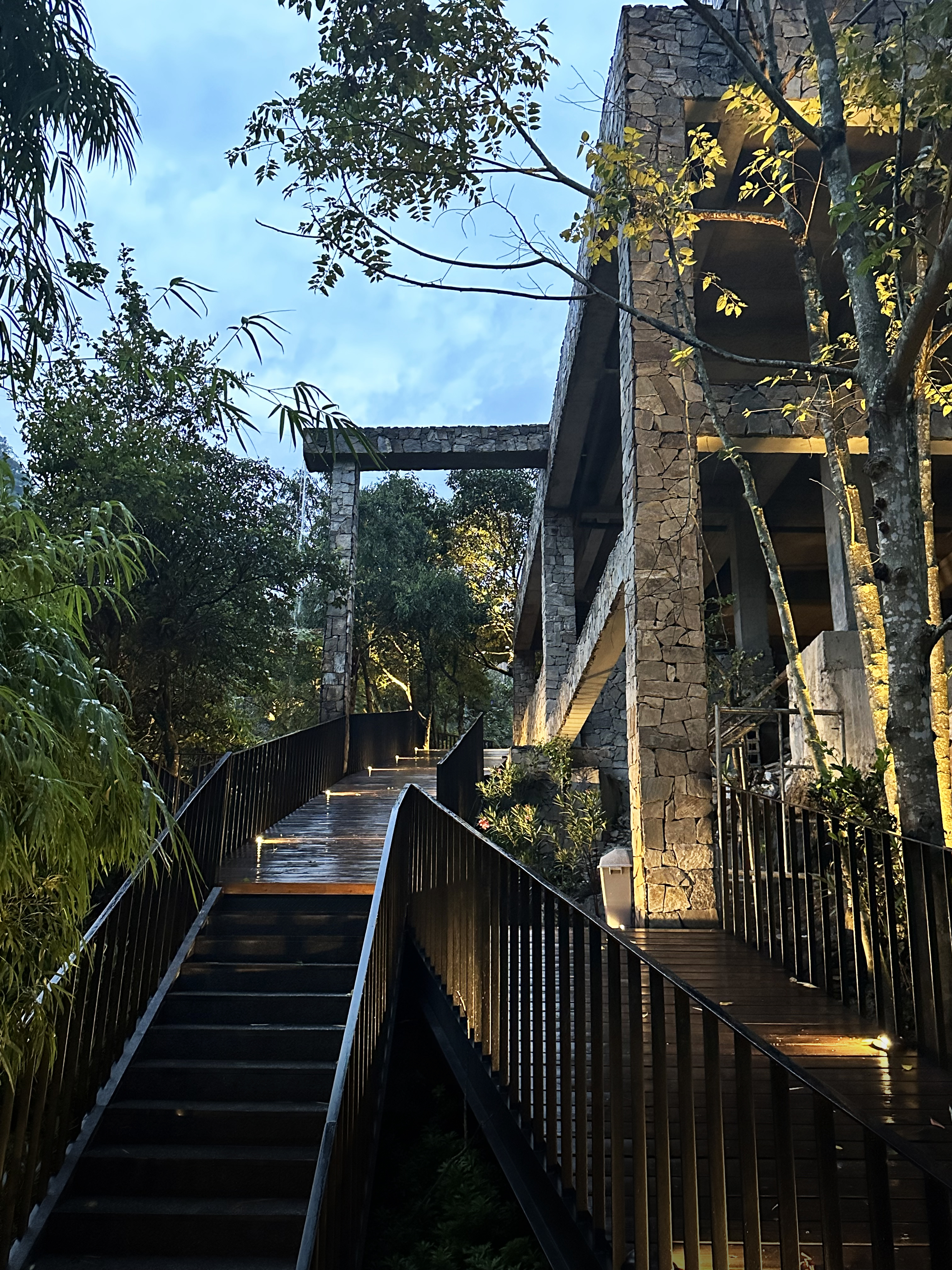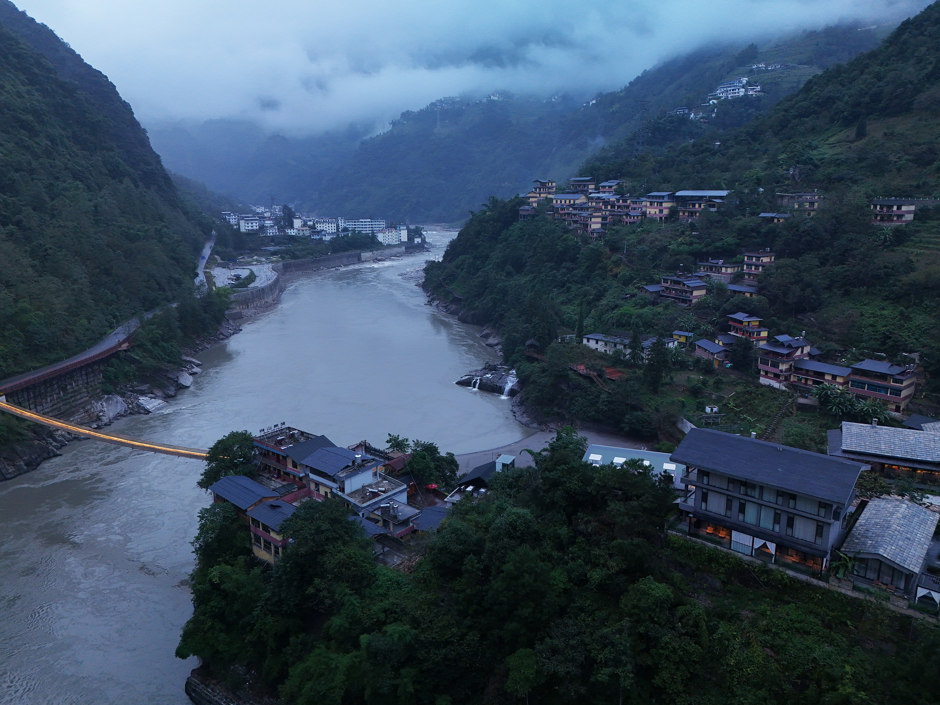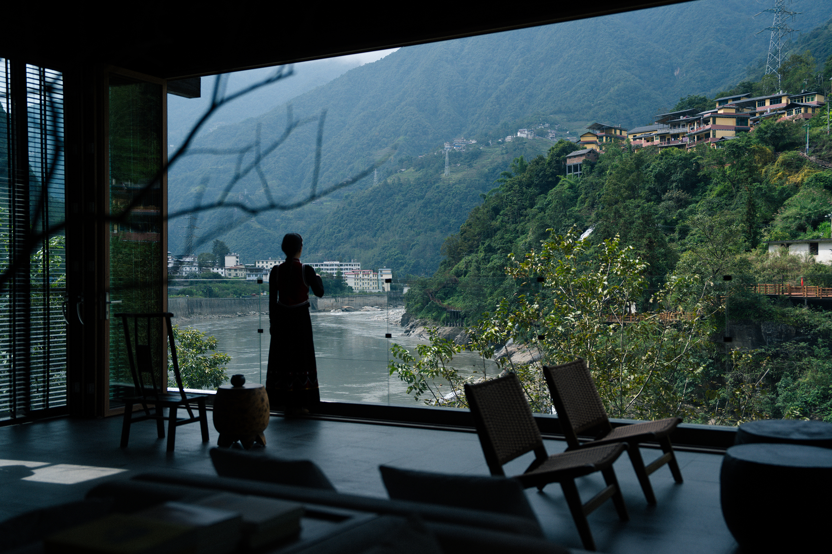 设计比较克制,以自然为底色,弱化建筑物于自然场景的存在感。深灰色为主调建筑立面,将建筑消隐在山林里,与傈僳族、怒族传统建筑的结合,吊脚楼、低矮的瓦檐、石板瓦,赋予建筑沉稳、低调的气质。客人到来车停在对岸,步行经过50长的软桥跨过怒江,在桥头接待厅体验傈僳族的迎客之道,然后乘坐18米高的观光电梯到半山腰,步行走过空中木栈道,此时可以看到飞瀑、听着鸟鸣,感受着自然的气息,沿道而上,要经过悬崖泳池底部,到达餐厅、悬崖泳池,视线豁然开朗。