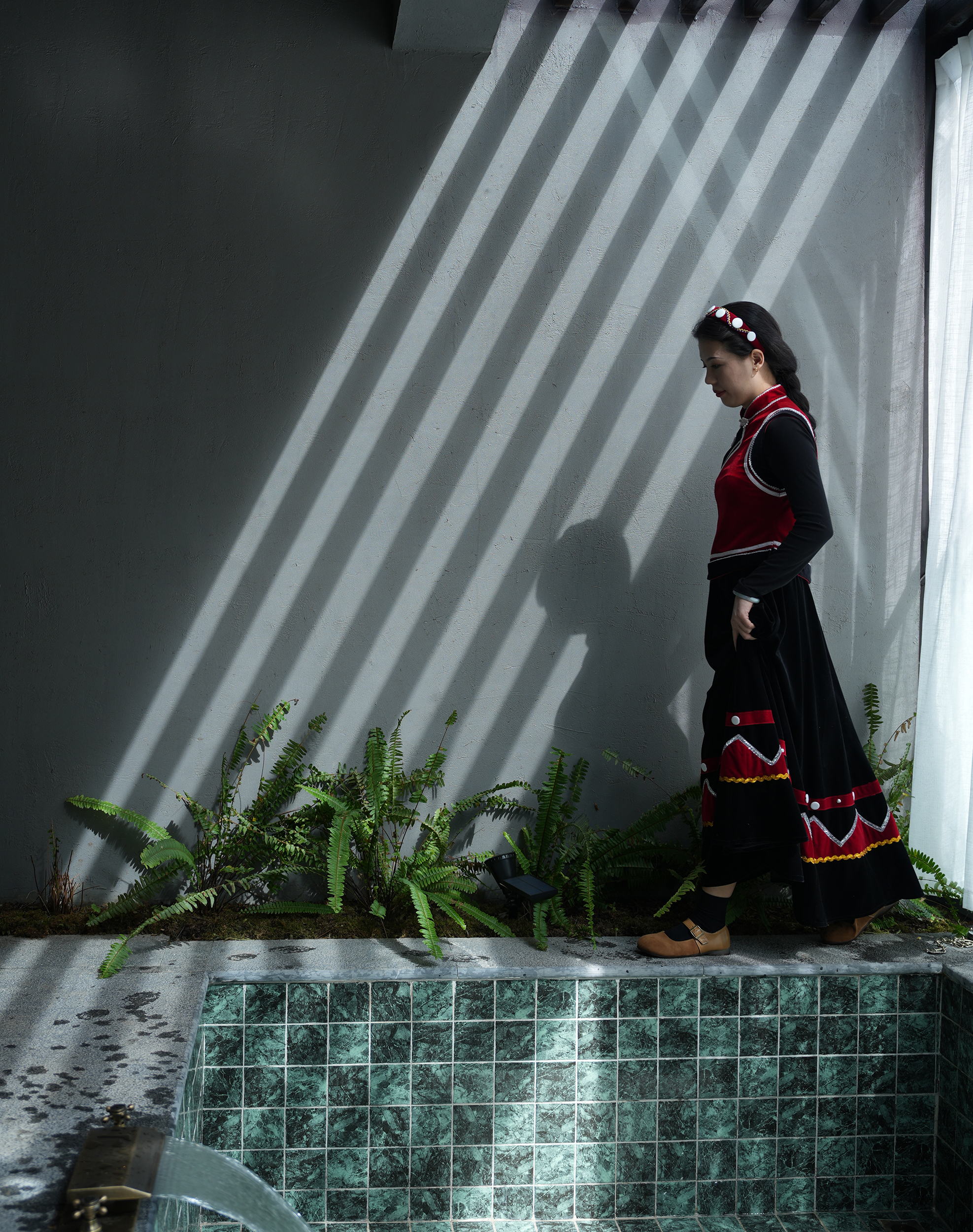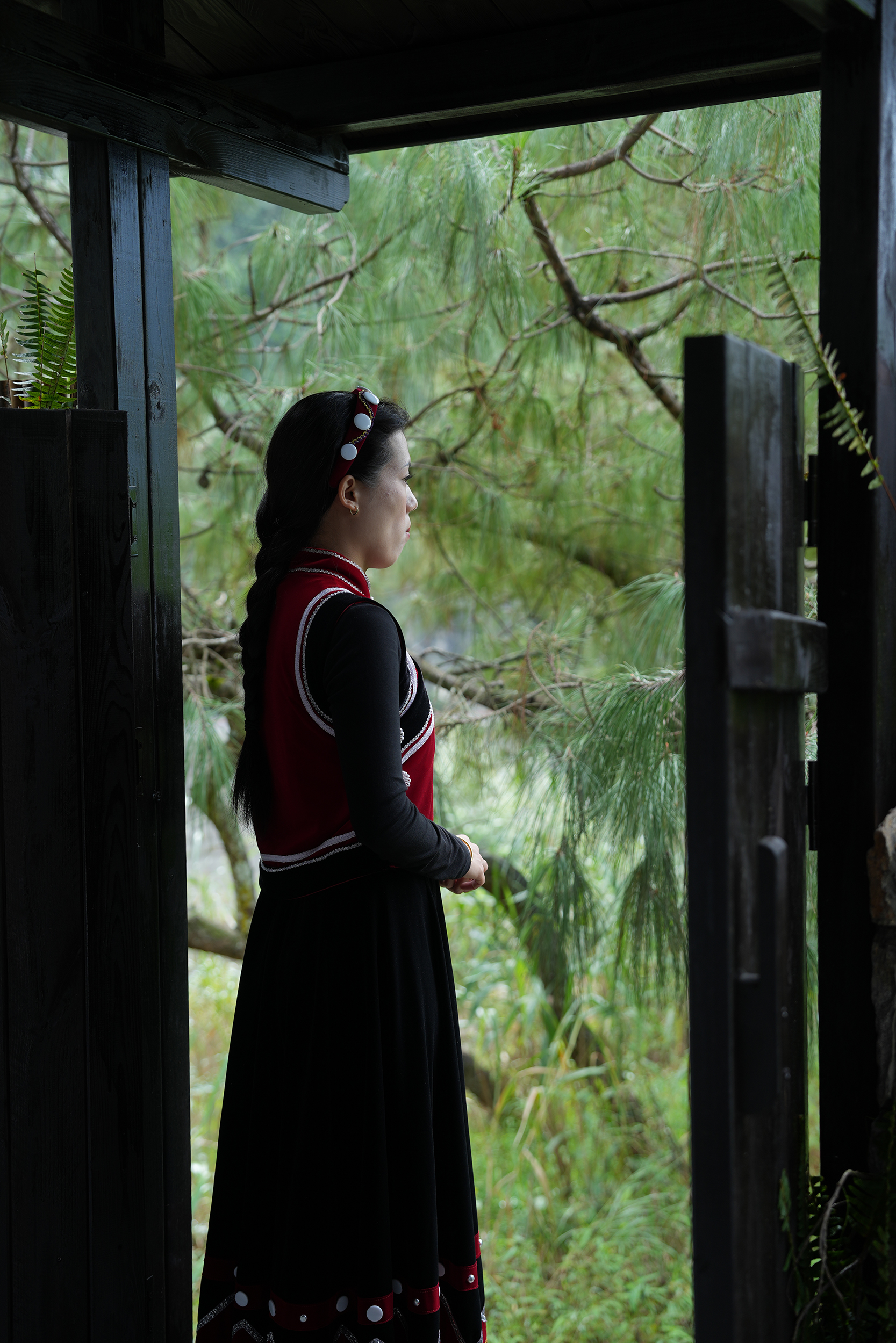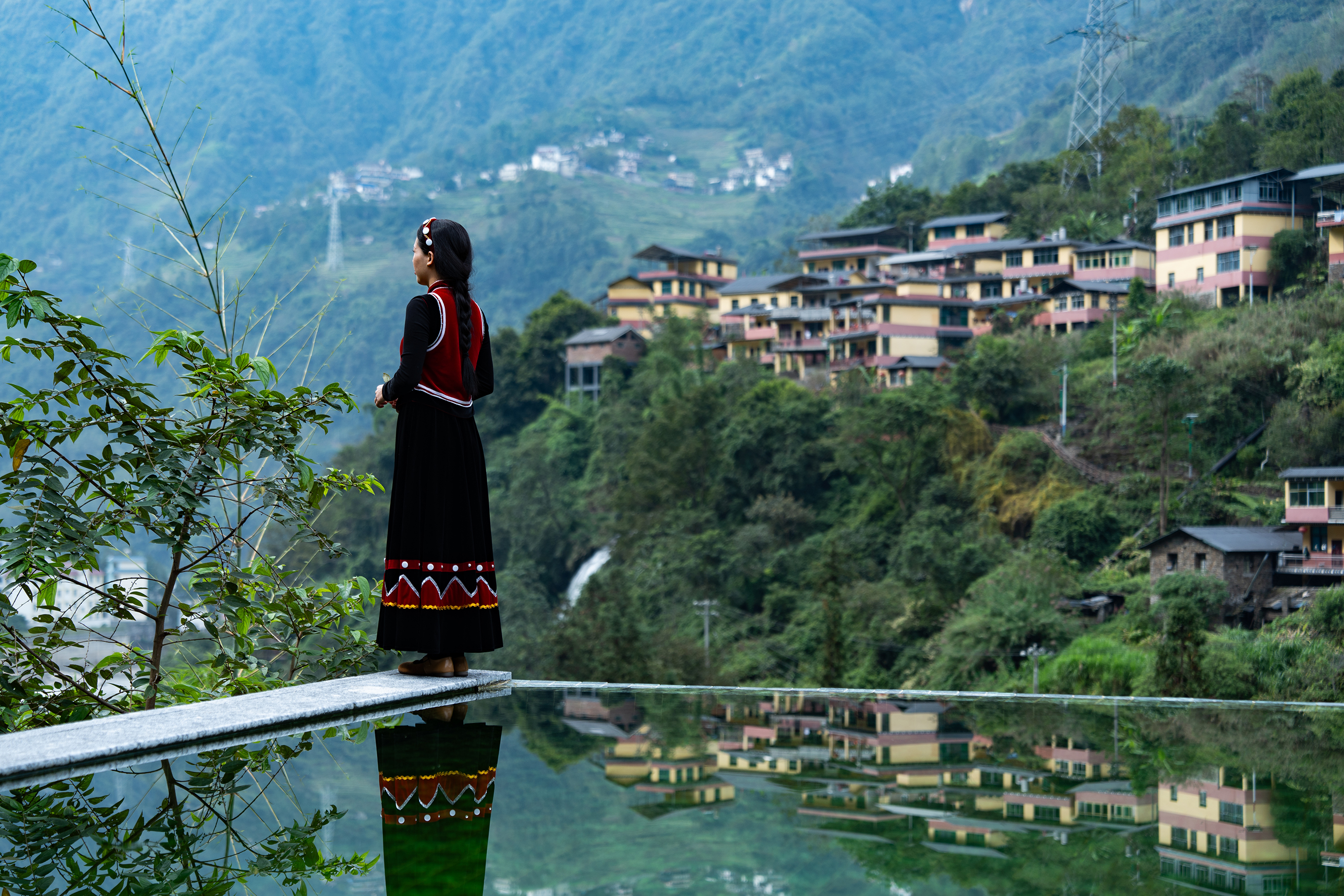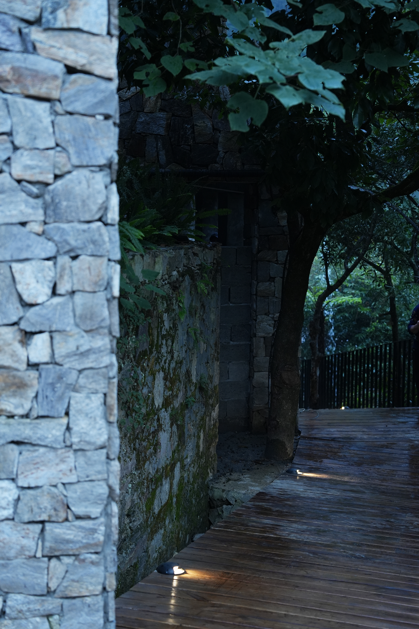 设计比较克制,以自然为底色,弱化建筑物于自然场景的存在感。深灰色为主调建筑立面,将建筑消隐在山林里,与傈僳族、怒族传统建筑的结合,吊脚楼、低矮的瓦檐、石板瓦,赋予建筑沉稳、低调的气质。客人到来车停在对岸,步行经过50长的软桥跨过怒江,在桥头接待厅体验傈僳族的迎客之道,然后乘坐18米高的观光电梯到半山腰,步行走过空中木栈道,此时可以看到飞瀑、听着鸟鸣,感受着自然的气息,沿道而上,要经过悬崖泳池底部,到达餐厅、悬崖泳池,视线豁然开朗。