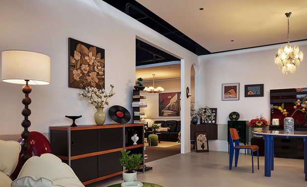 红色元素贯穿室内外,以地面高低错层,区分L形空间的接待区与主营业区。红色艺术漆和水泥碰撞,制作不规则墙面造型。