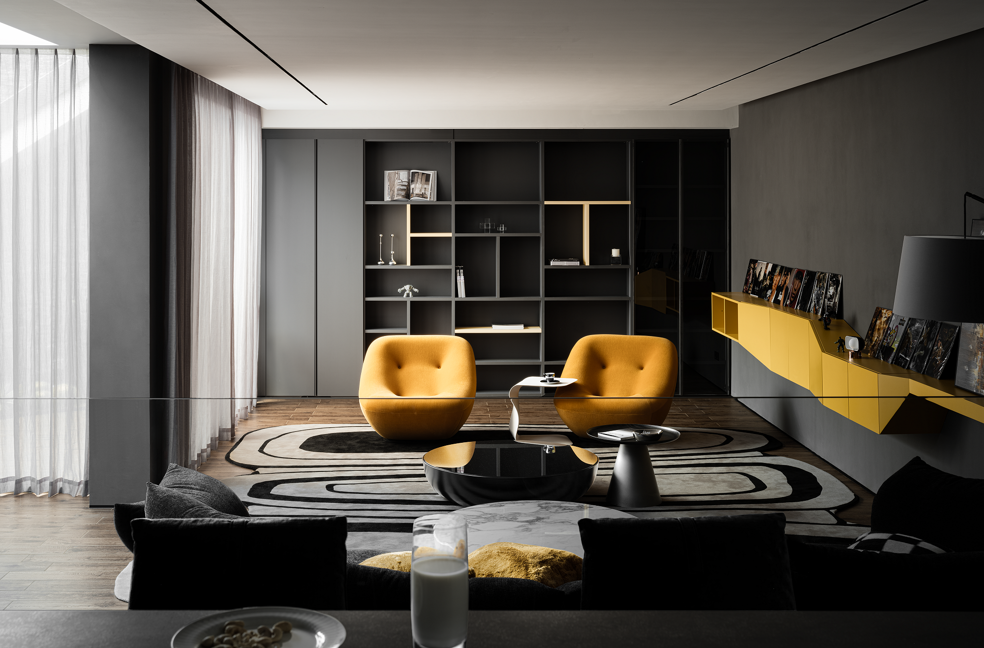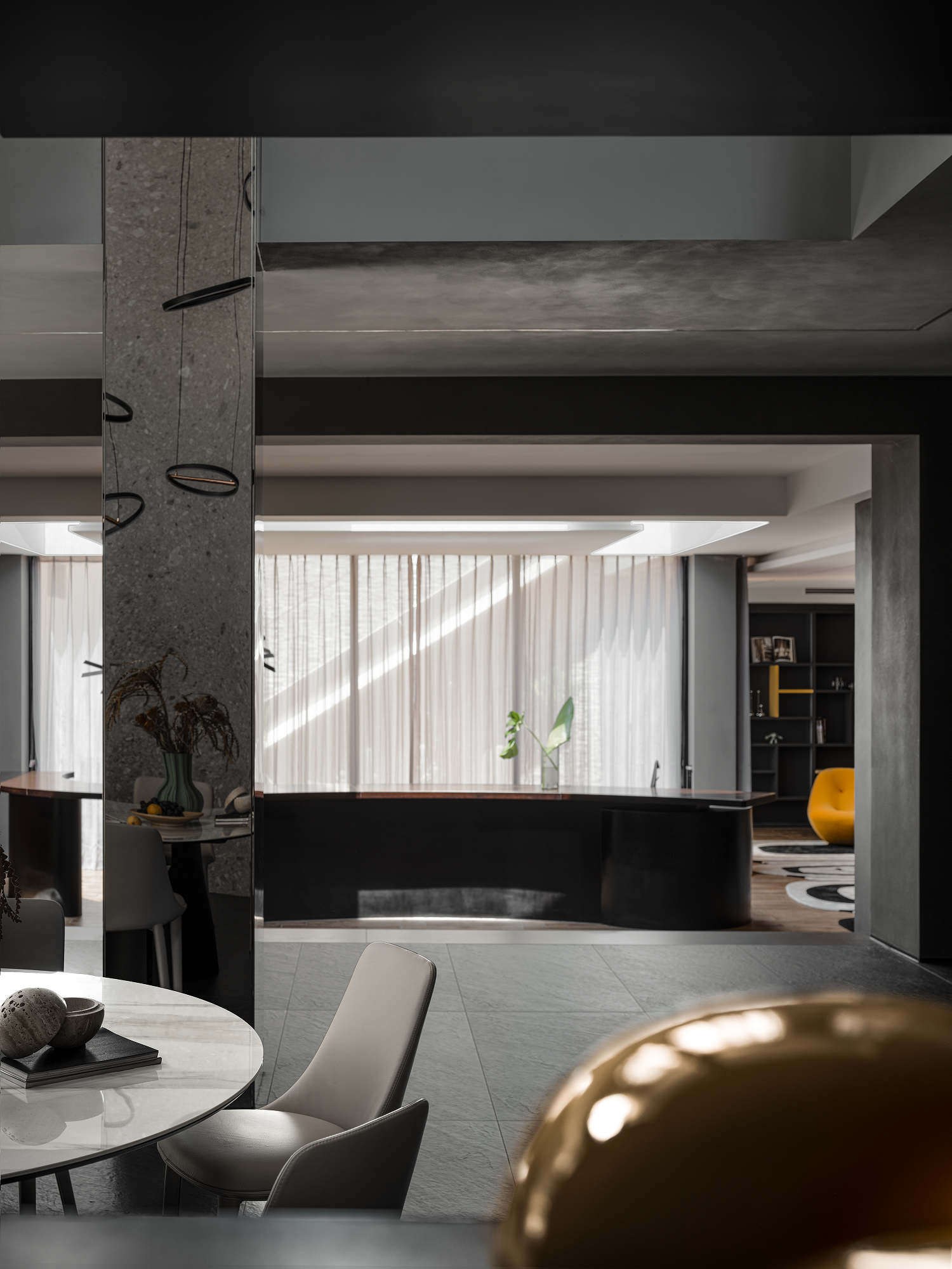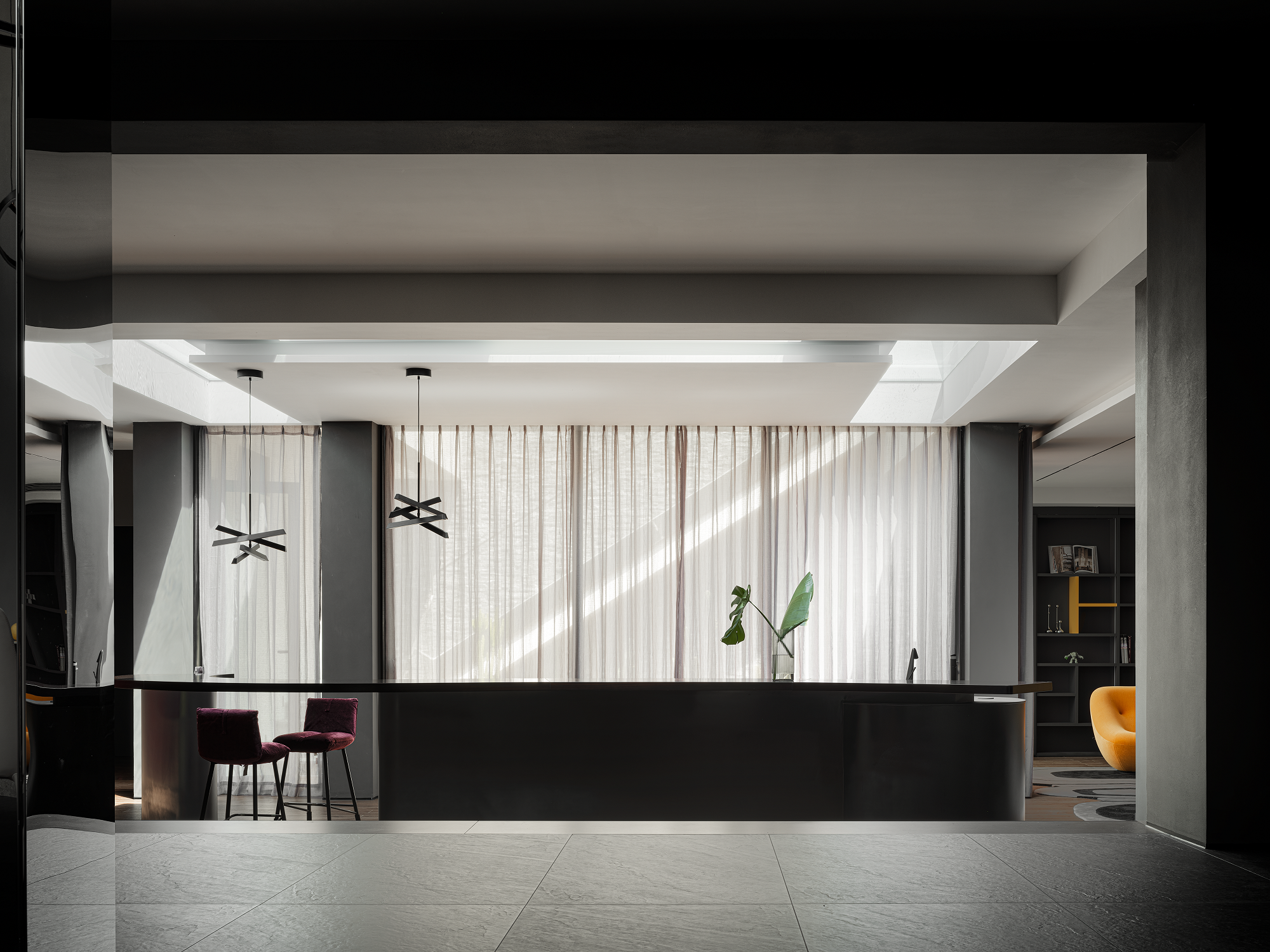 餐厨、影视厅、会客厅、攀爬区...供家人生活的功能区没有完全封堵的墙,都已完全开放或半开放形式打开,整个空间通透且极具互动性。