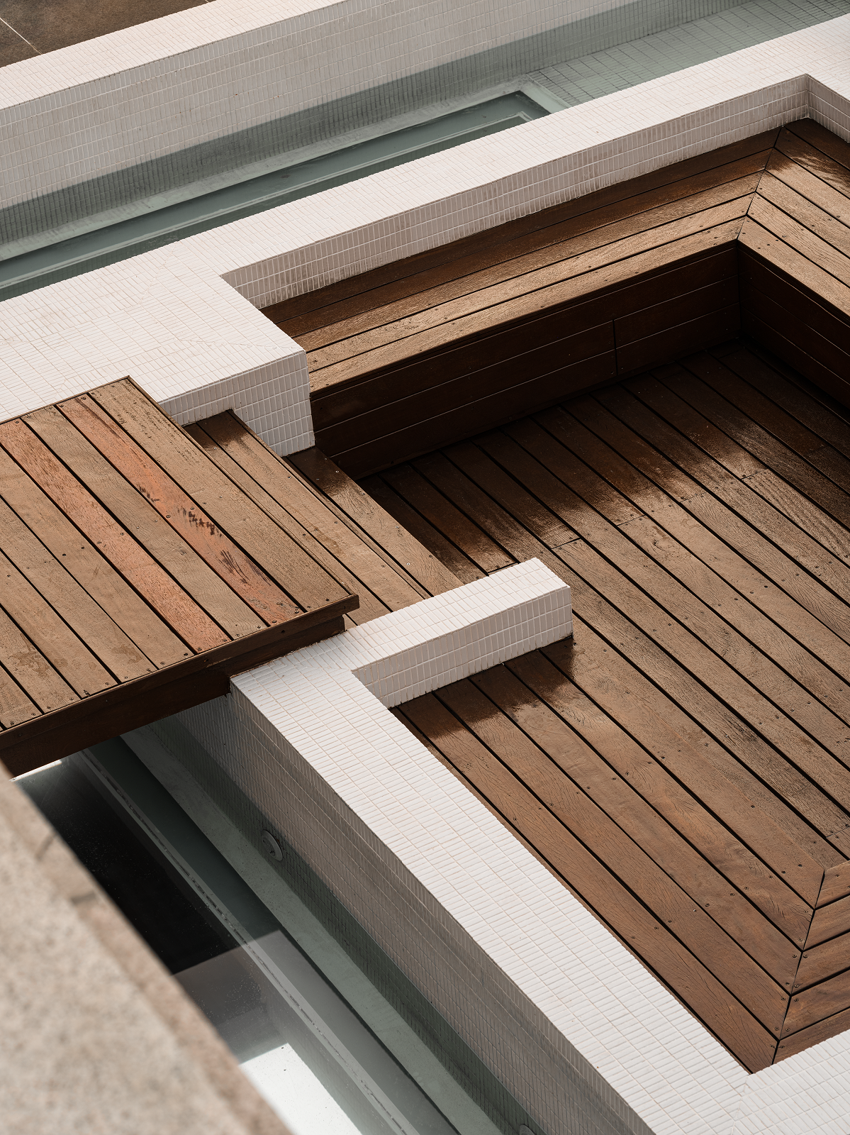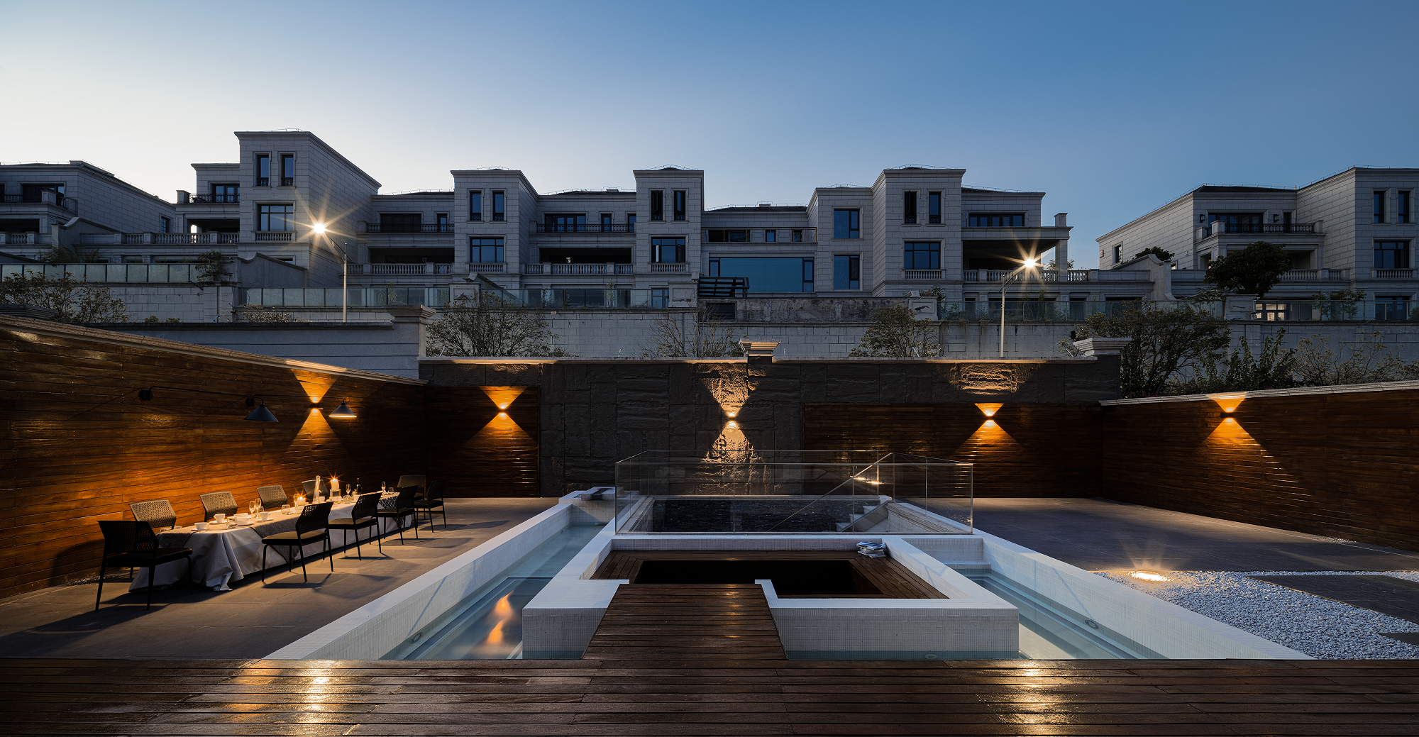 户外花园采用下沉手法给人包裹围合感,围绕回形座位以玻璃打造水景,白天光打在水面上,印照在负一楼形成熠熠光影,让室内空间变得灵动活泼。
