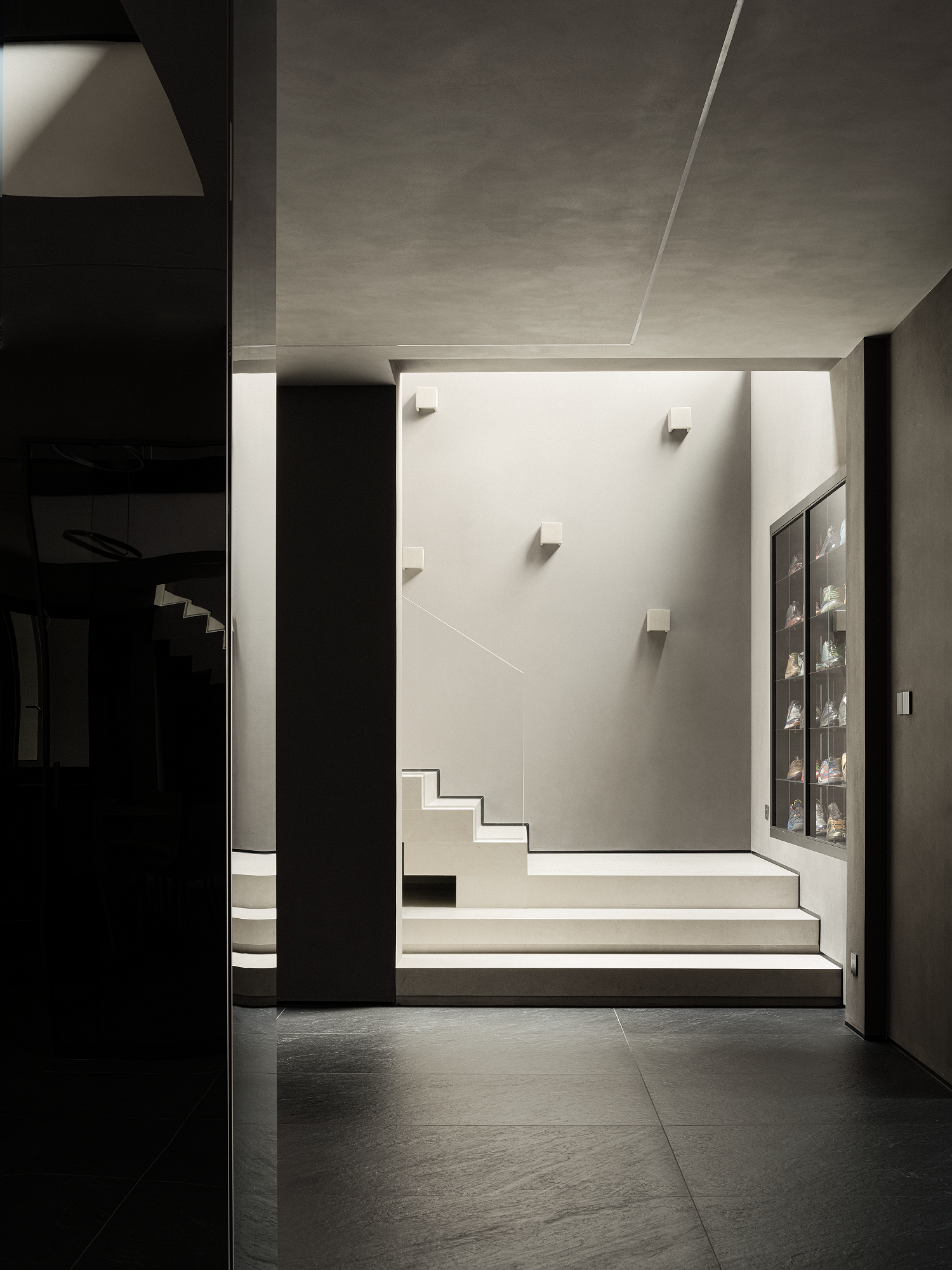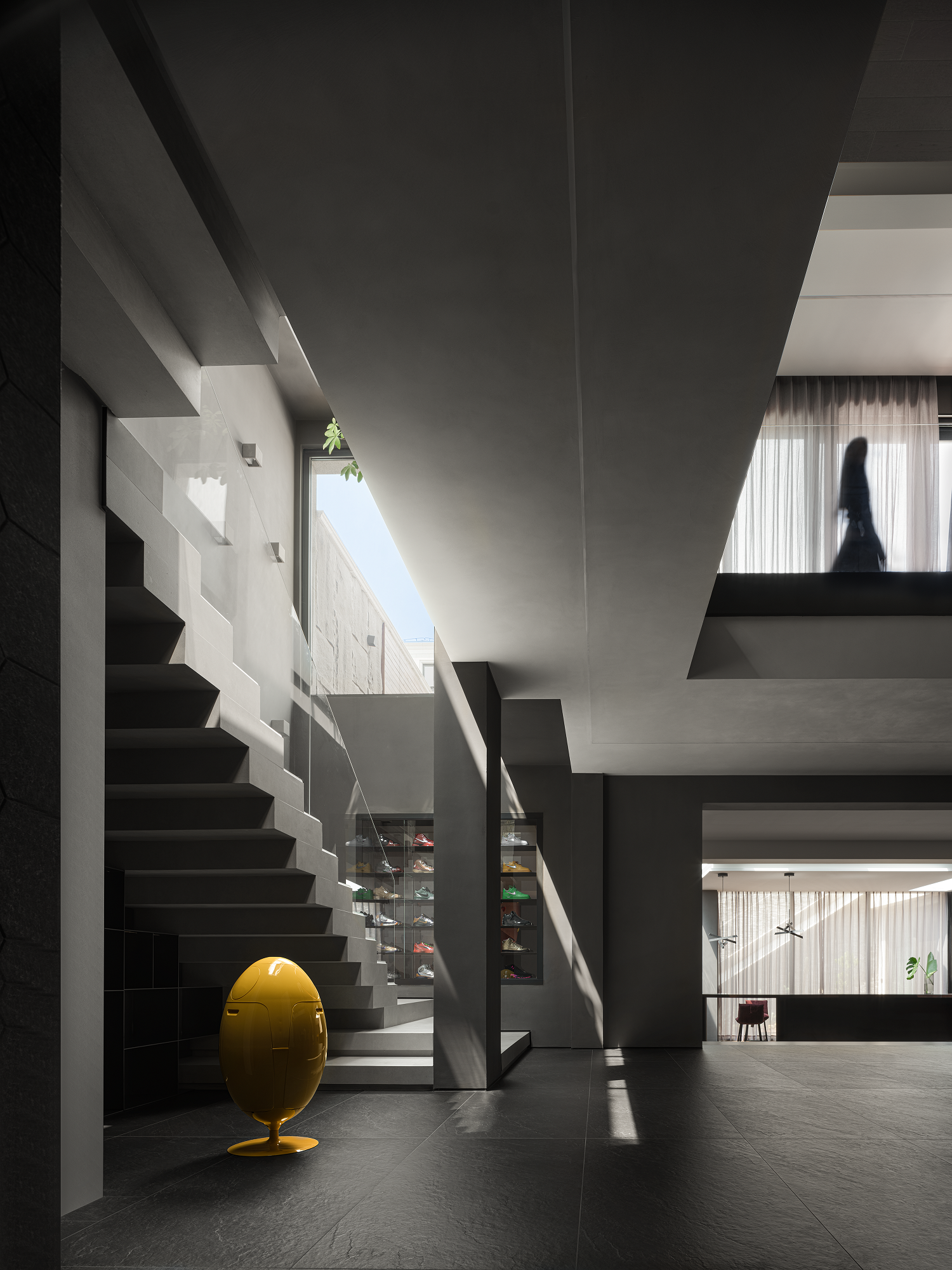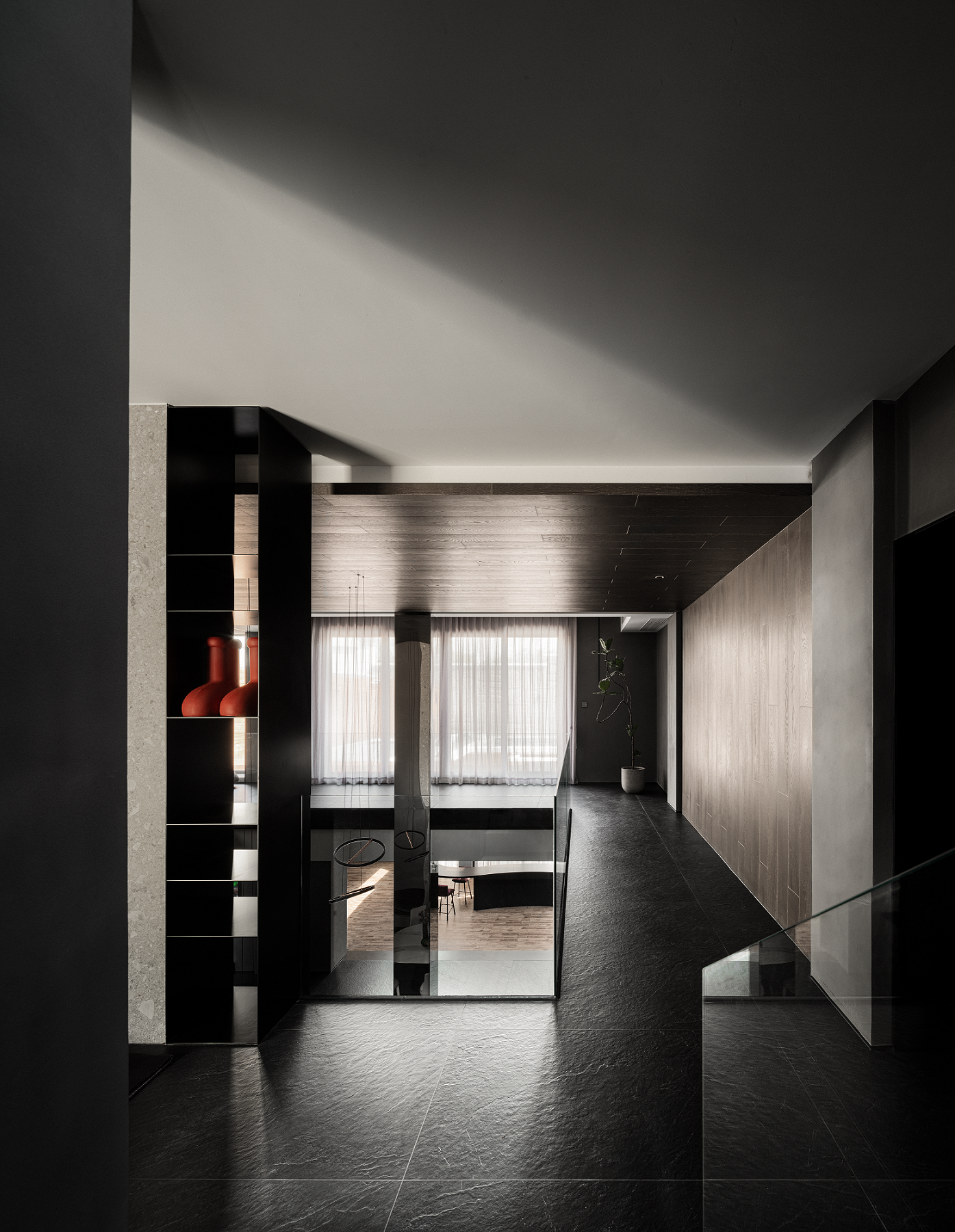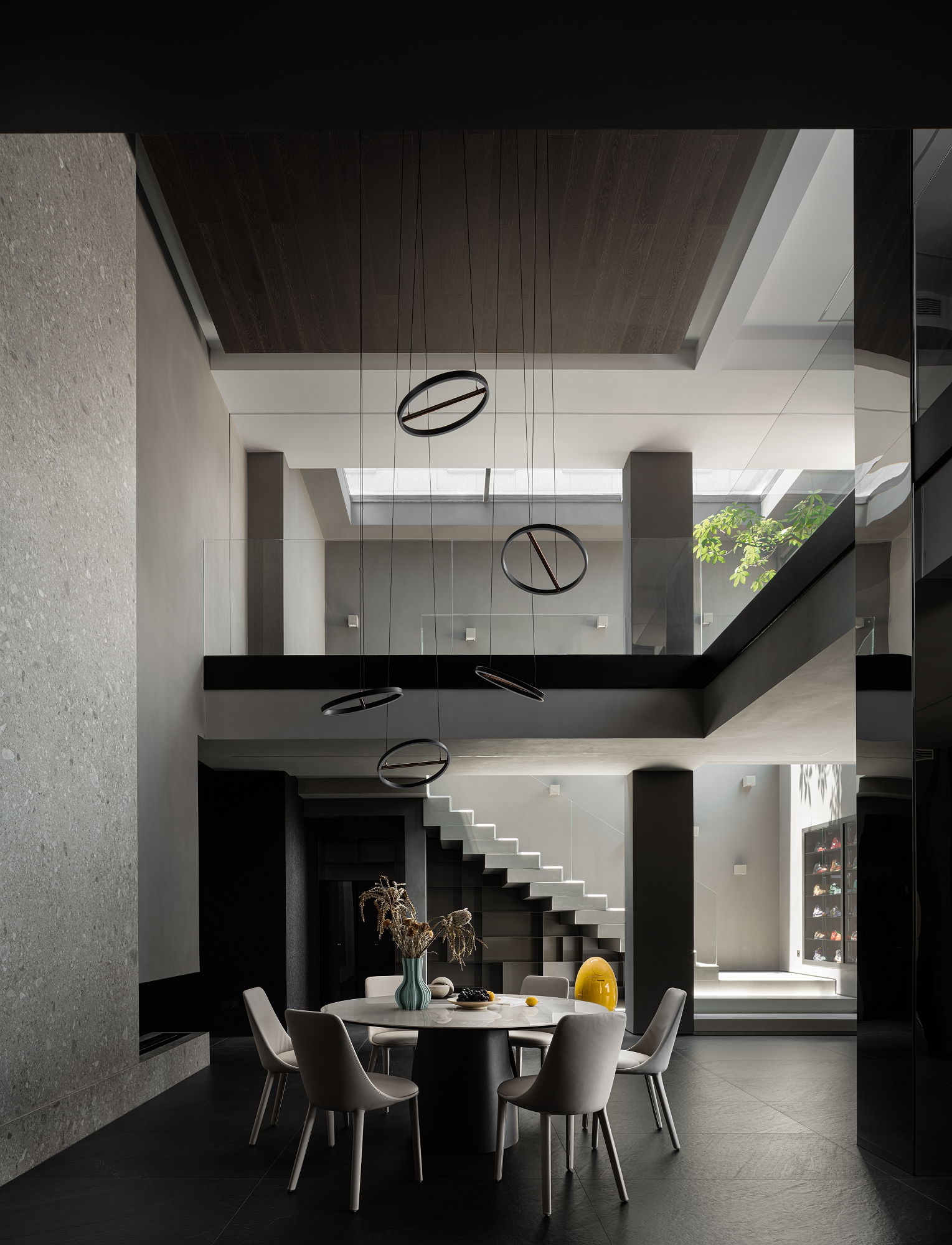 设计师打开一楼中庭,让一楼直接形成洄游走廊,增加入户仪式感的同时,与户外花园和负一楼通透互动。