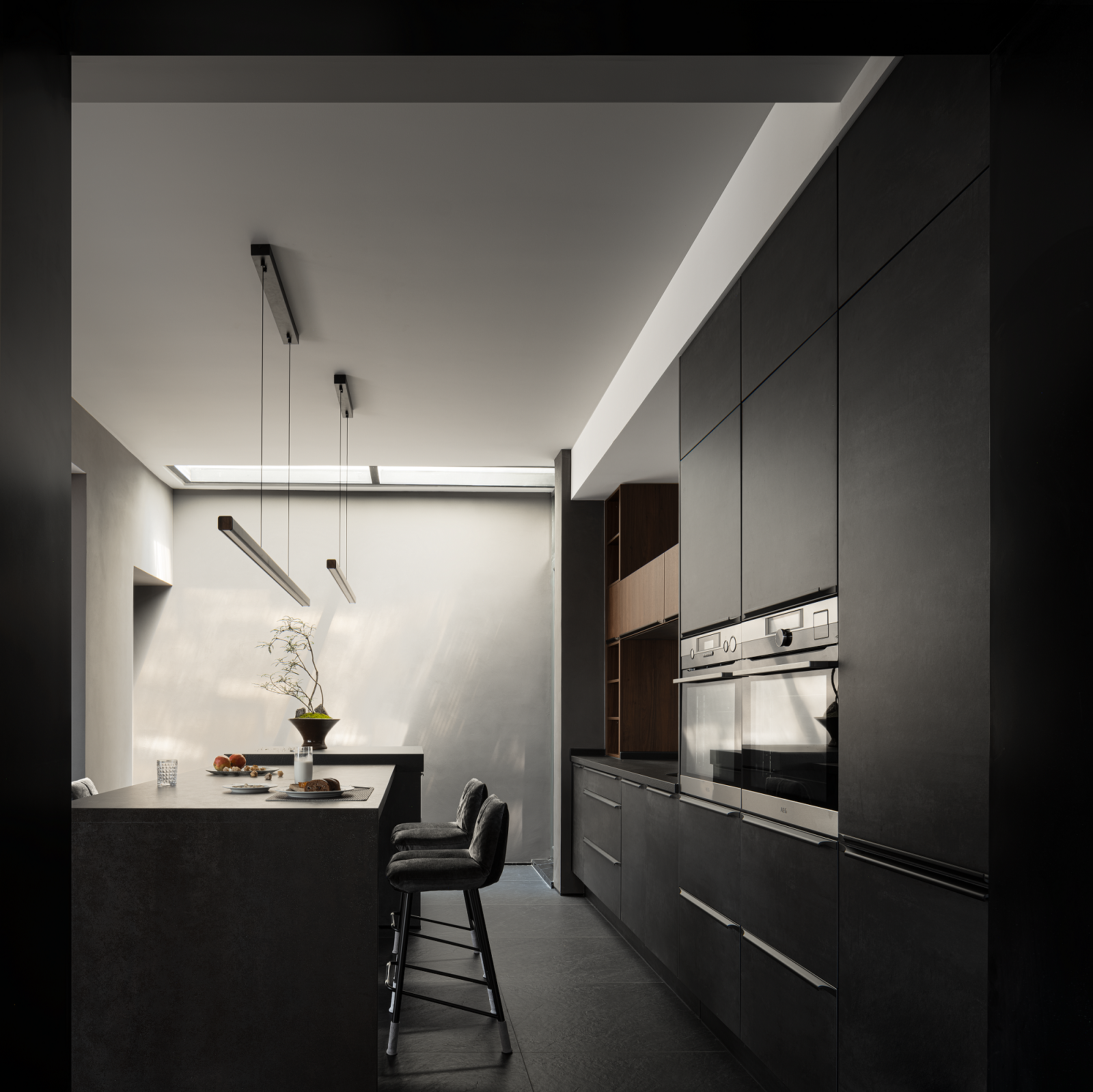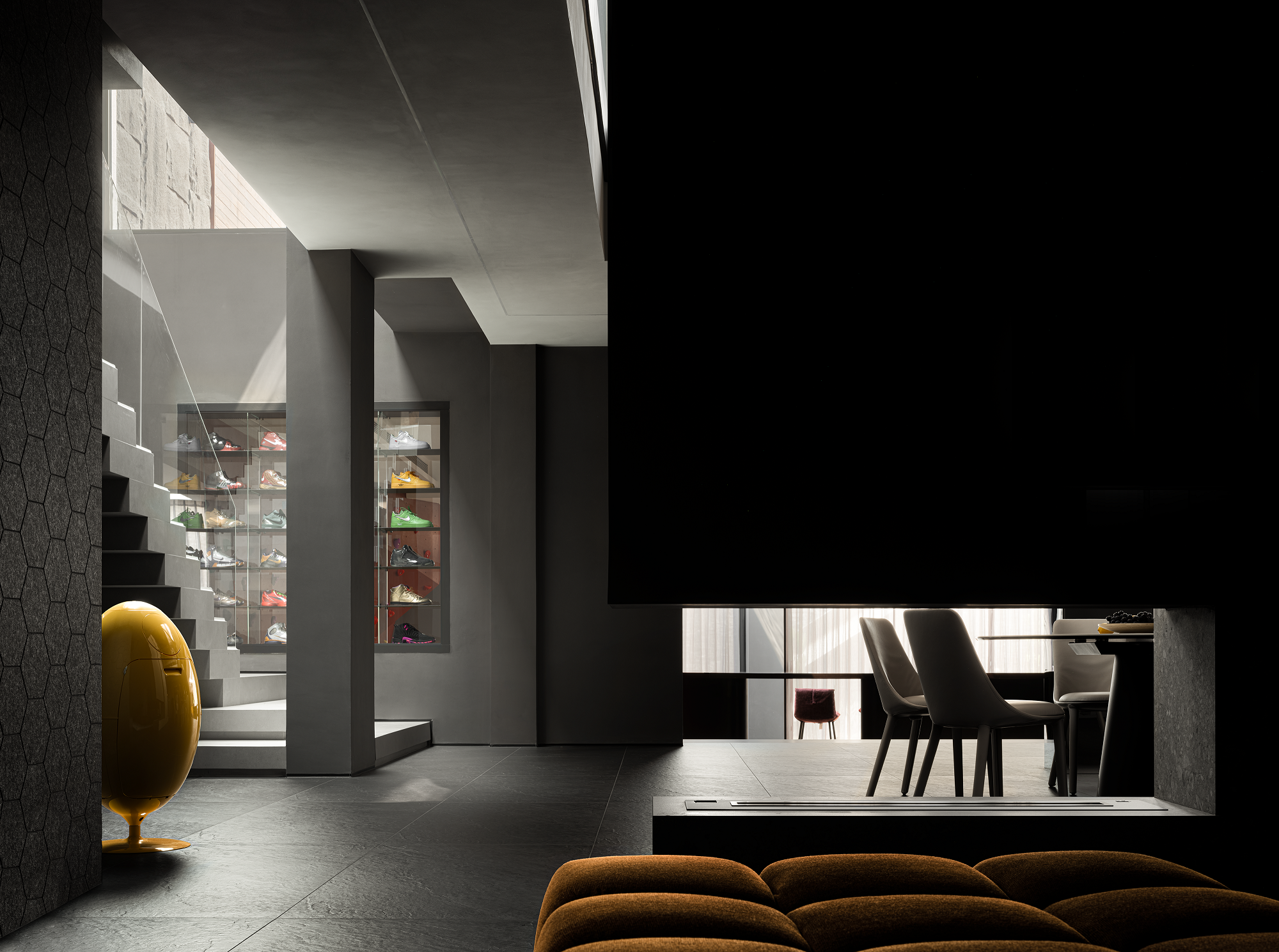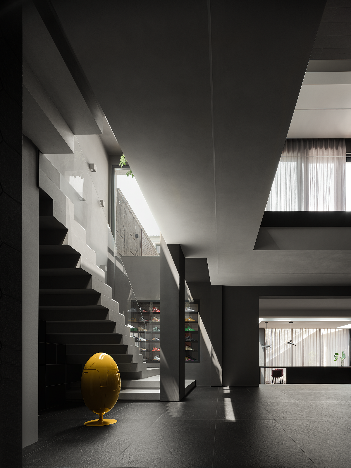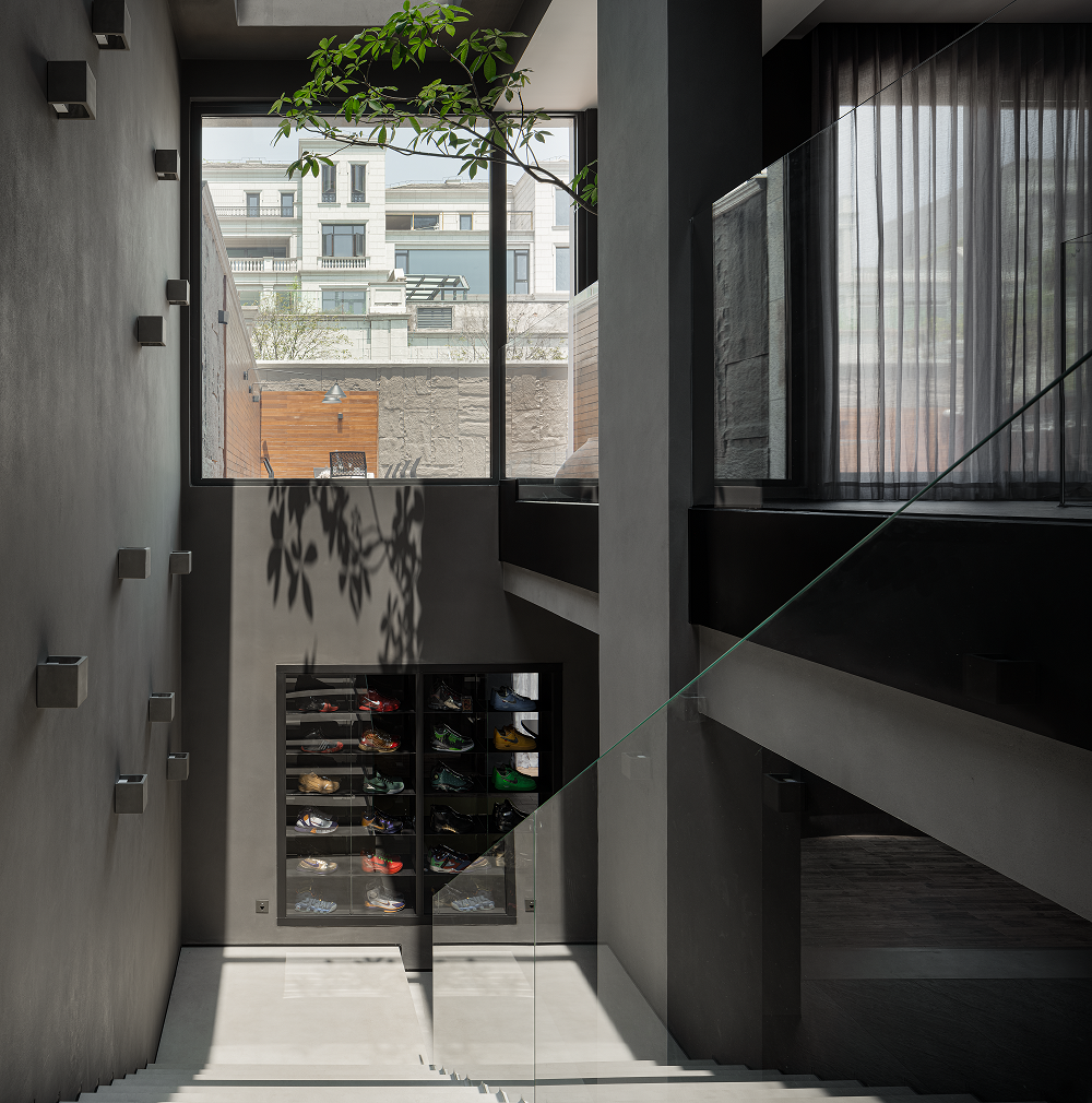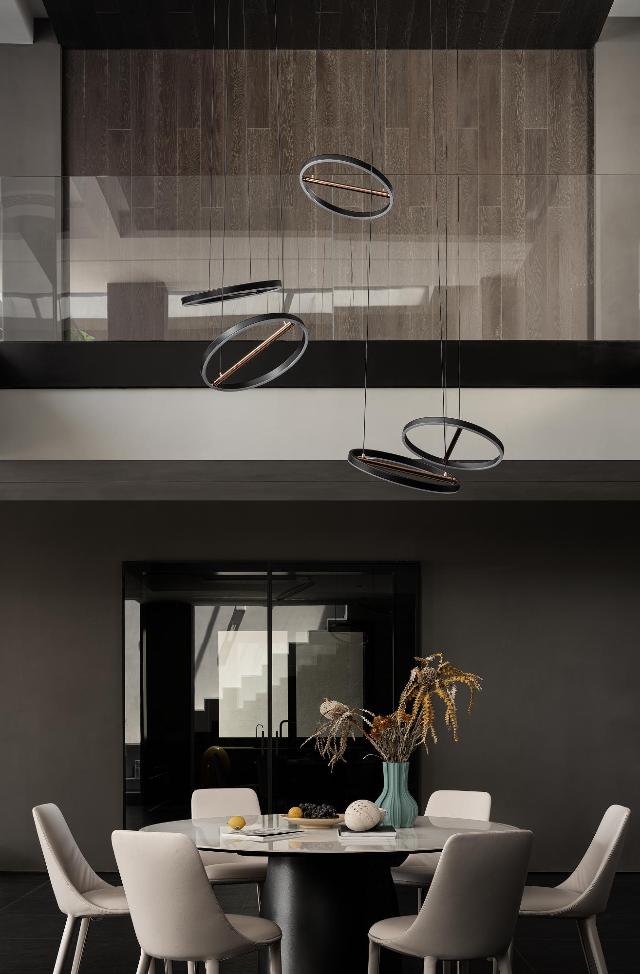 设计师打开一楼中庭,让一楼直接形成洄游走廊,增加入户仪式感的同时,与户外花园和负一楼通透互动。