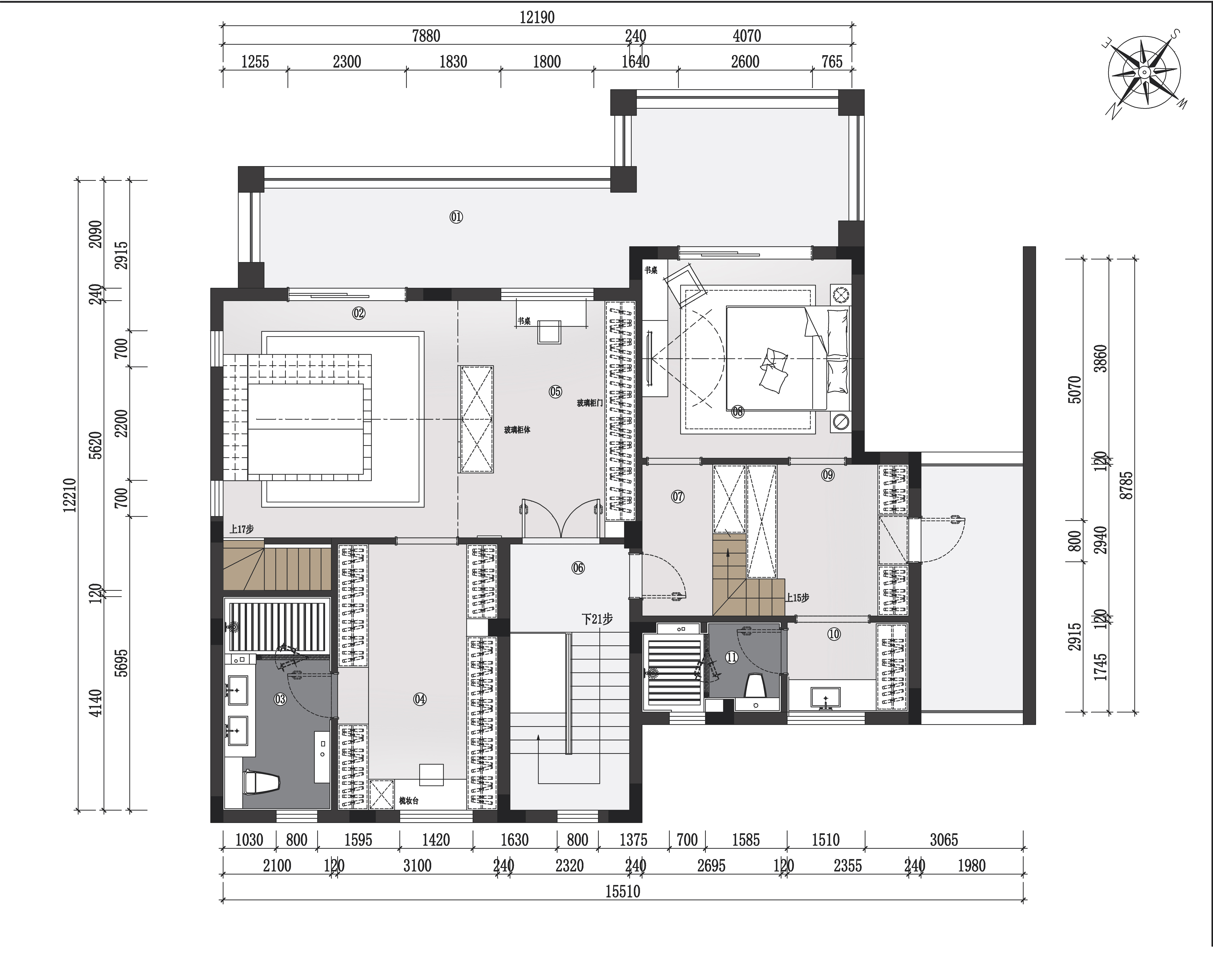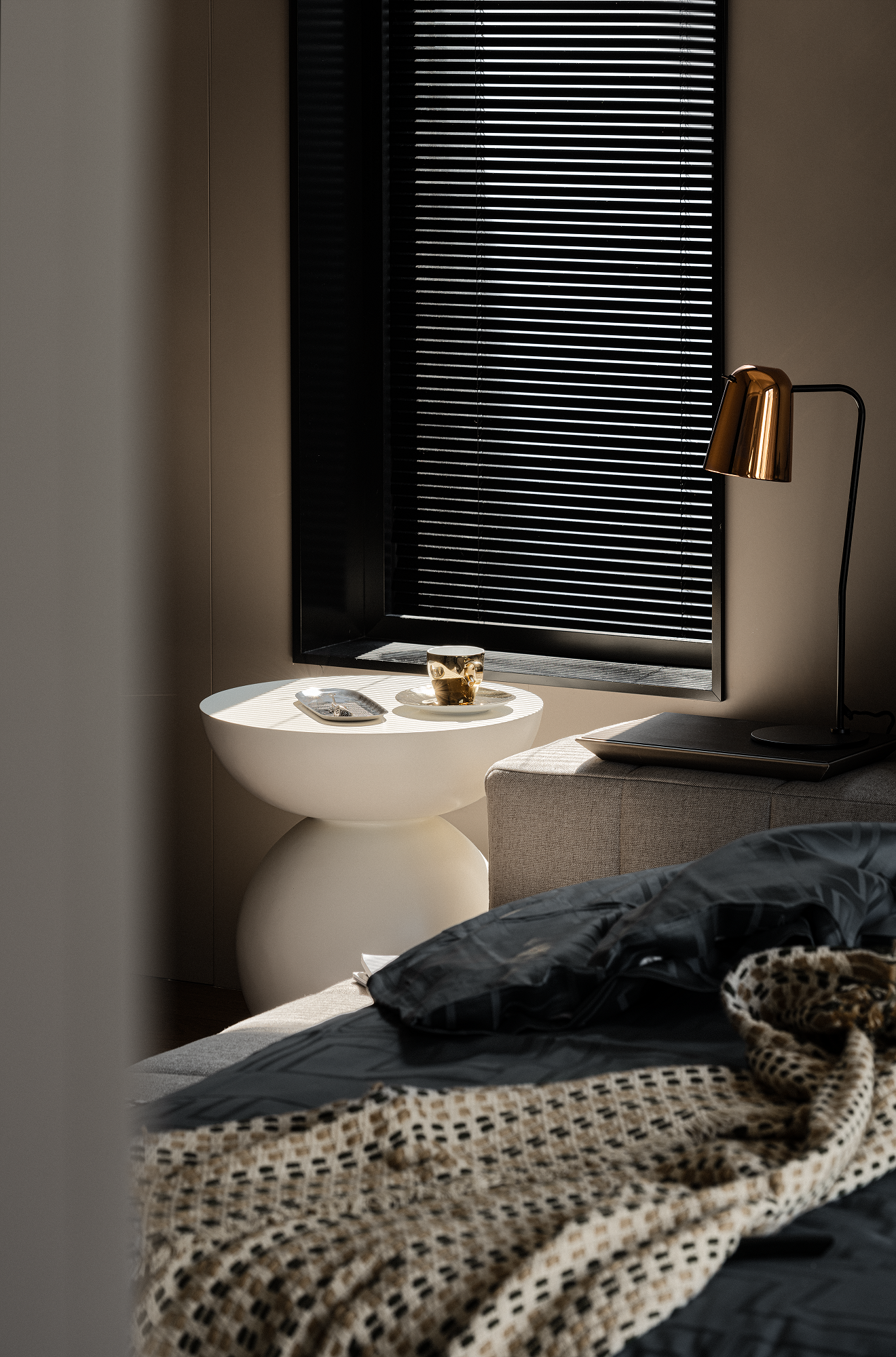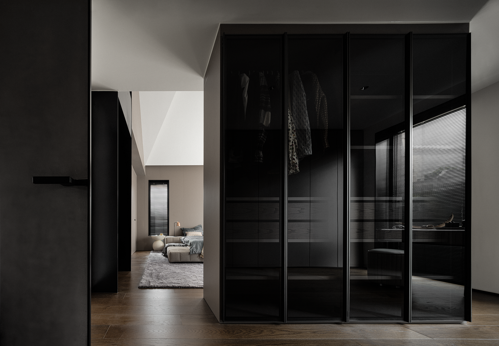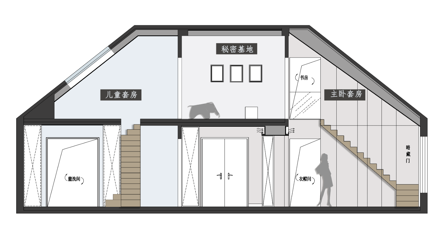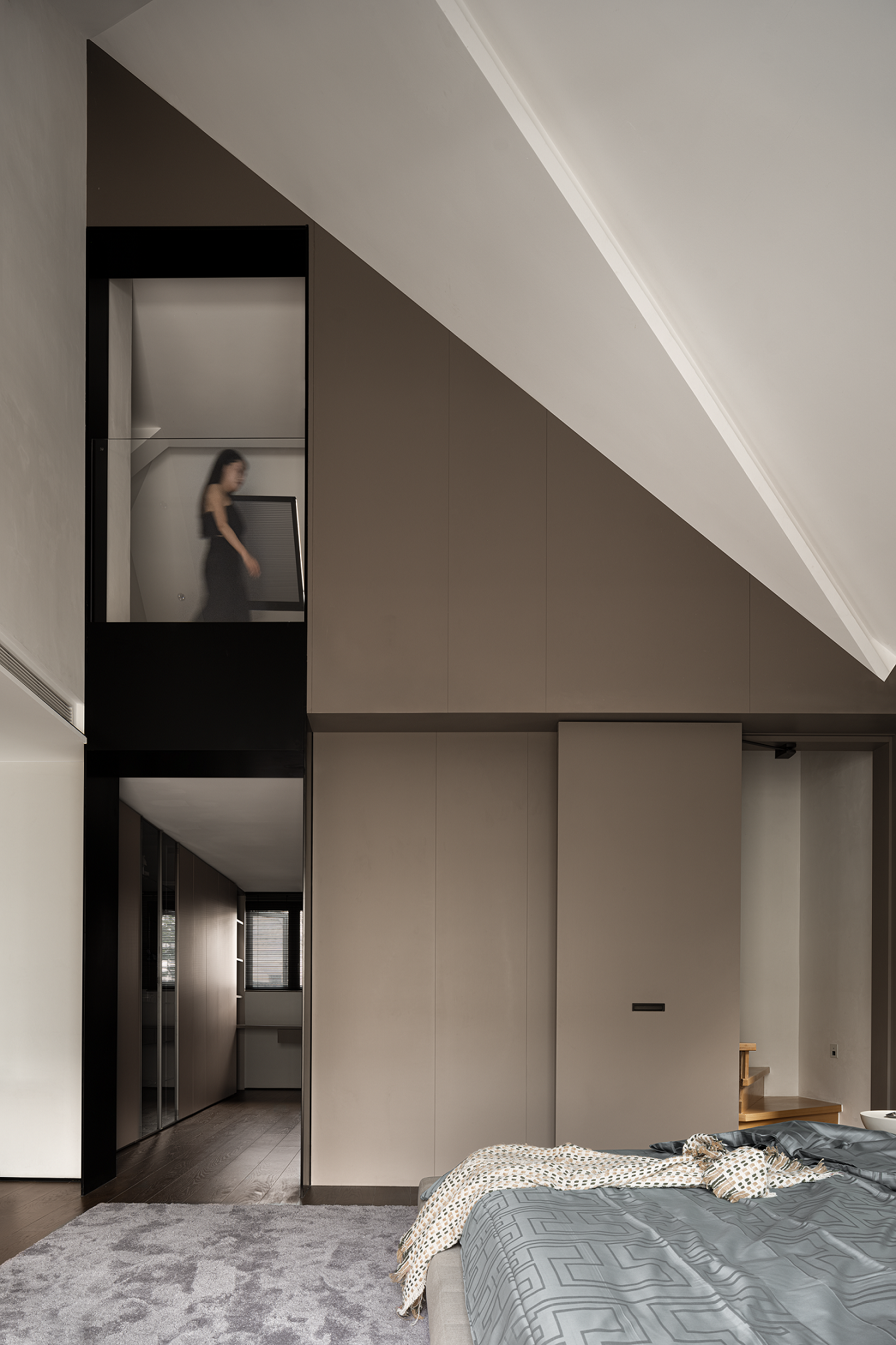 包括主卧空间,设计师巧妙利用阁楼区域打造书房,并打造通道让人可以在主卧与阁楼间自由穿梭,增加小朋友在空间里的趣味性与探索性,在空间里都是家人间互动的场景。