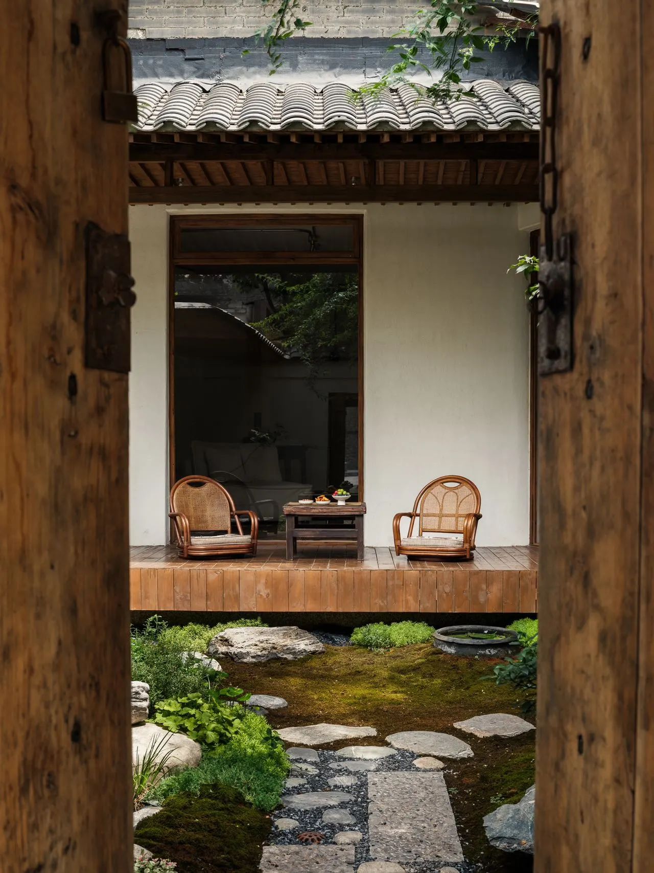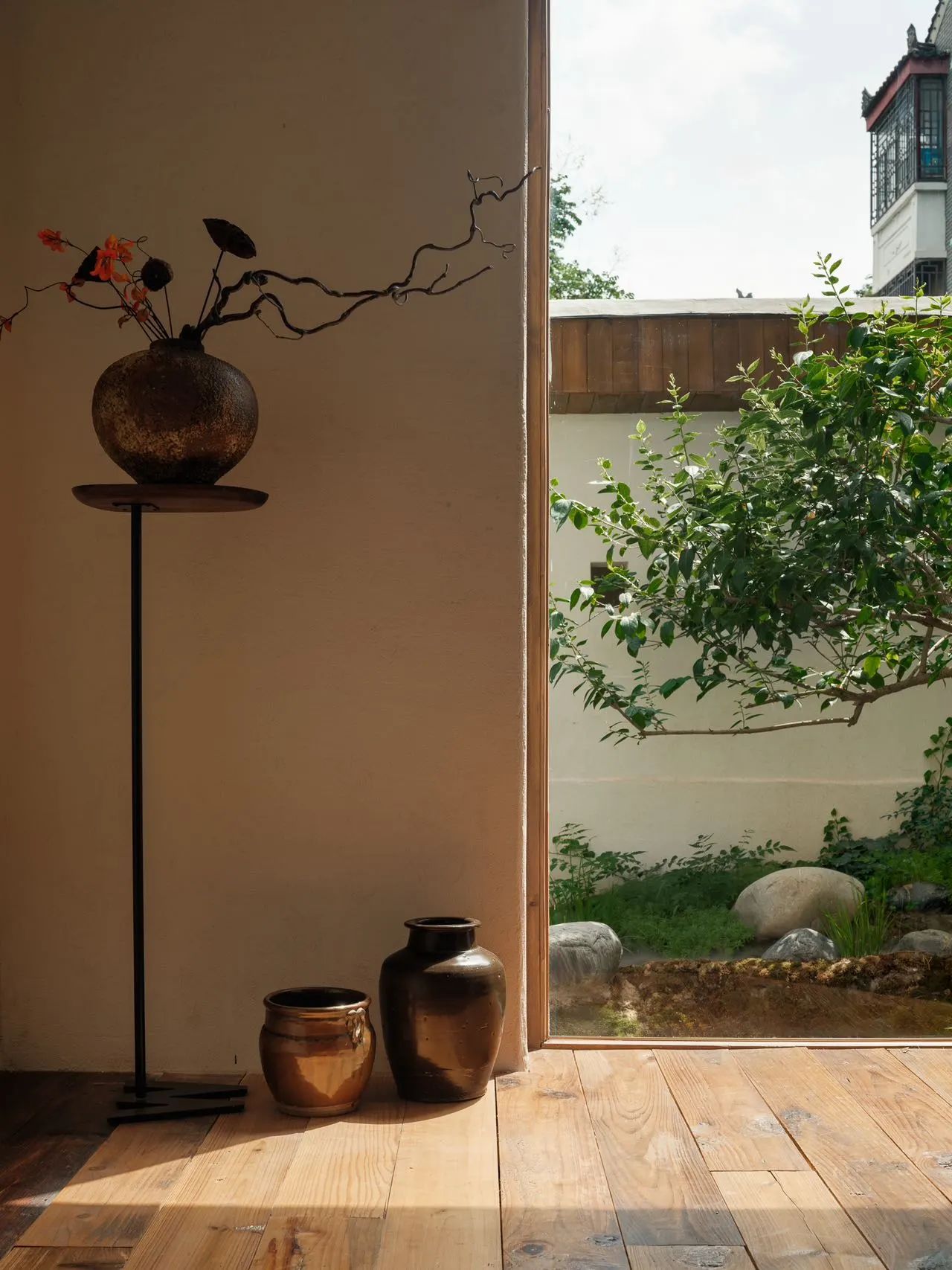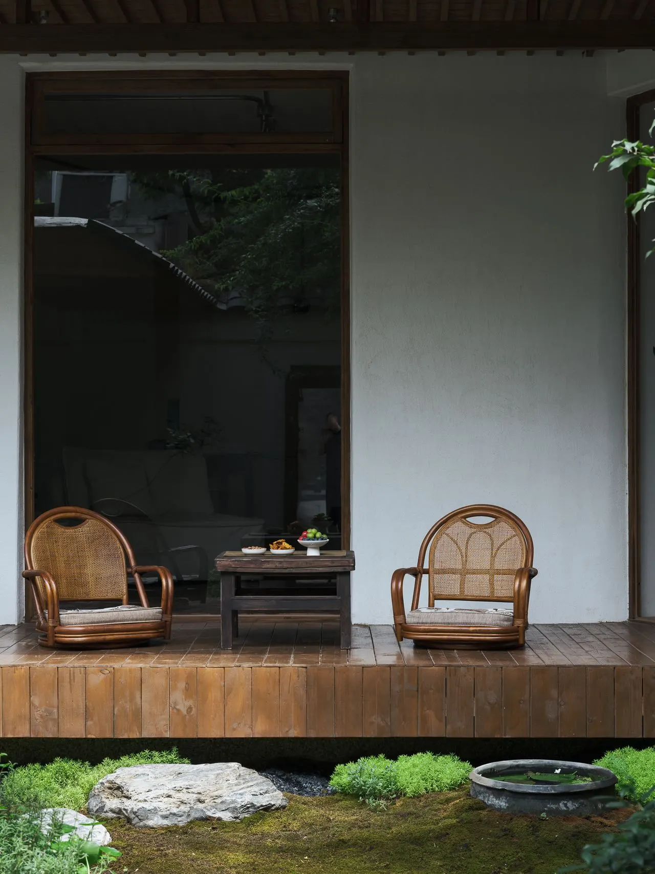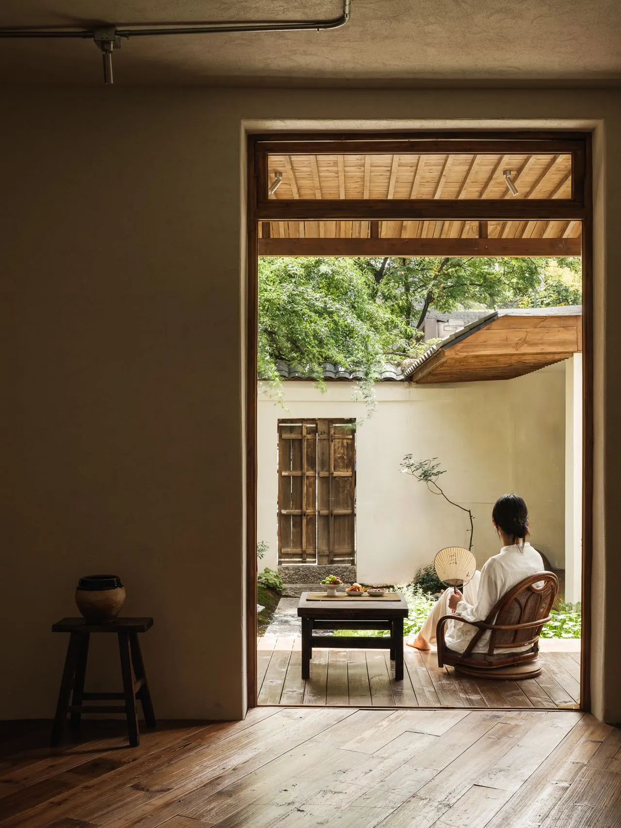 屋檐下被抬高的木质地台,放置一张茶桌,可供三两好友在此烹茶闲聊,享受阳光与清风,偷得浮生半日闲。