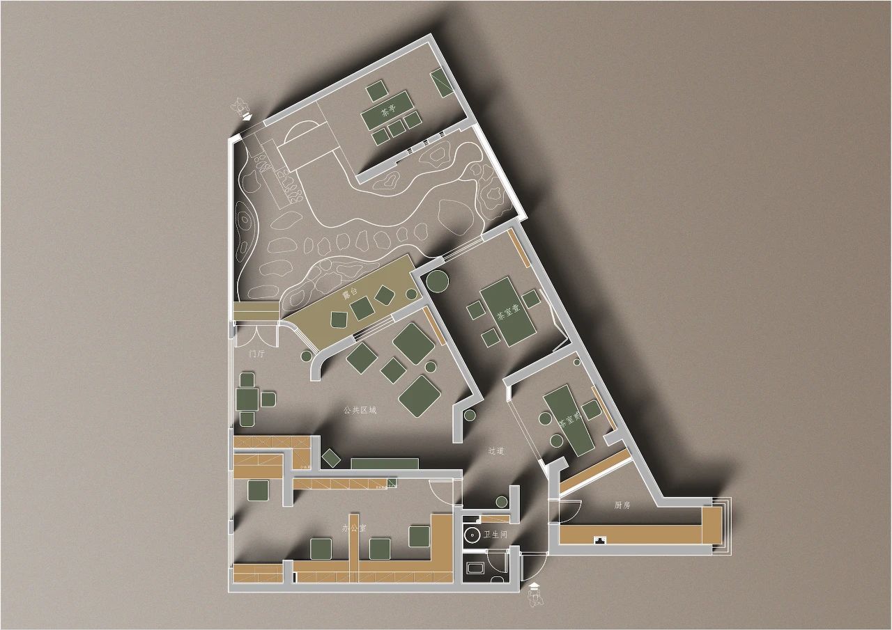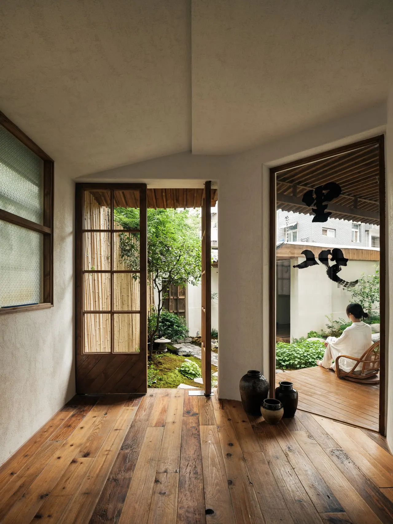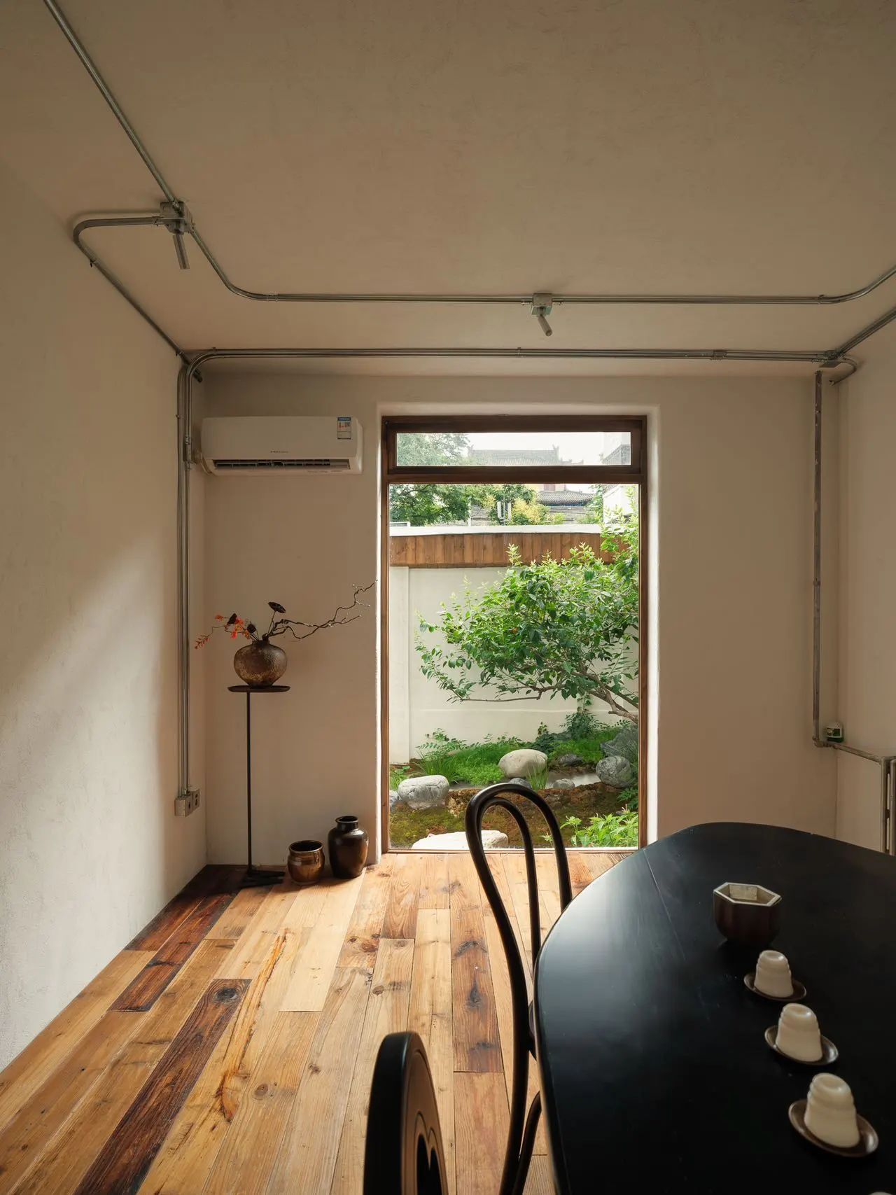 在空间规划上,仅留有一个房间作为办公使用,除去厨房和卫生间,开辟为三块茶室区域。几扇落地窗的改造,实现了室内外视野的联通,使面积不大的室内更加开阔。 -