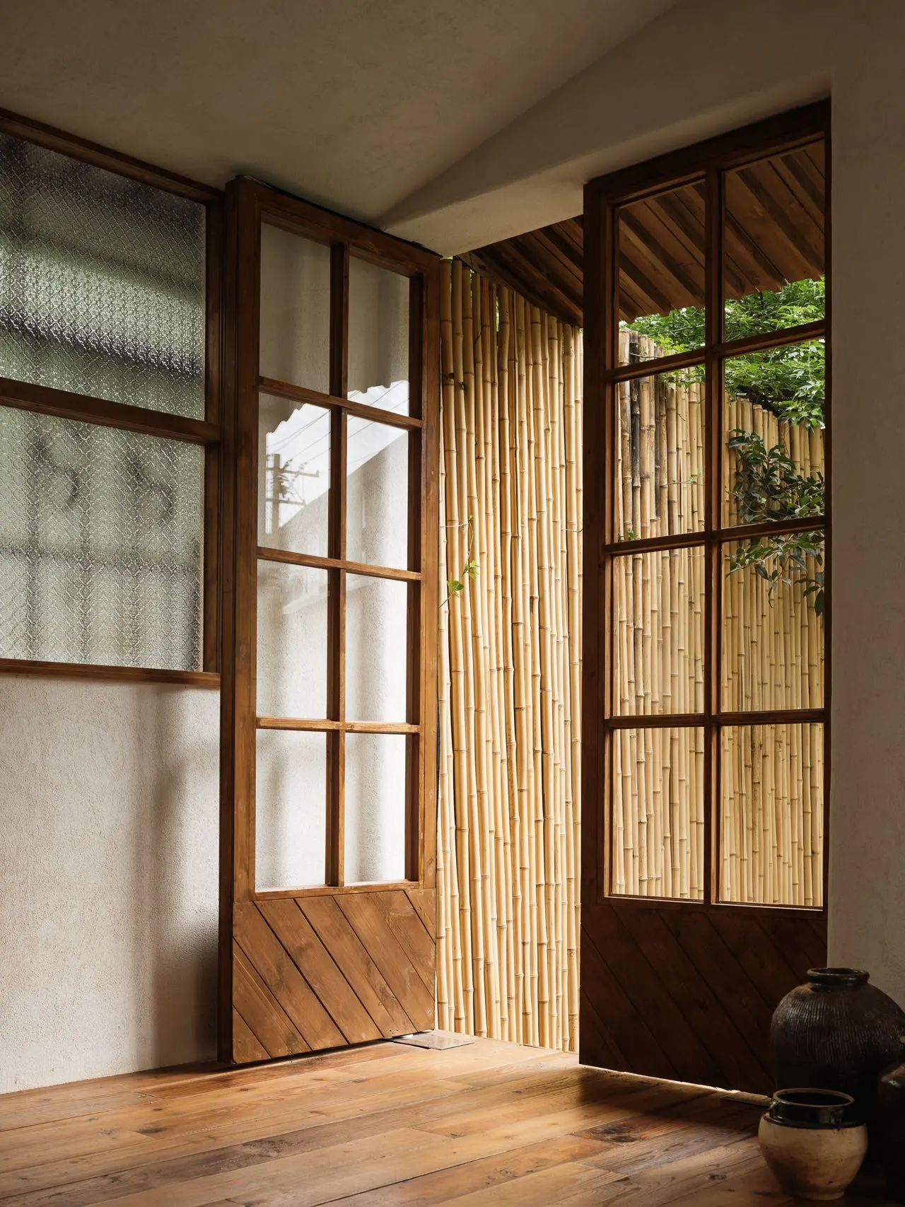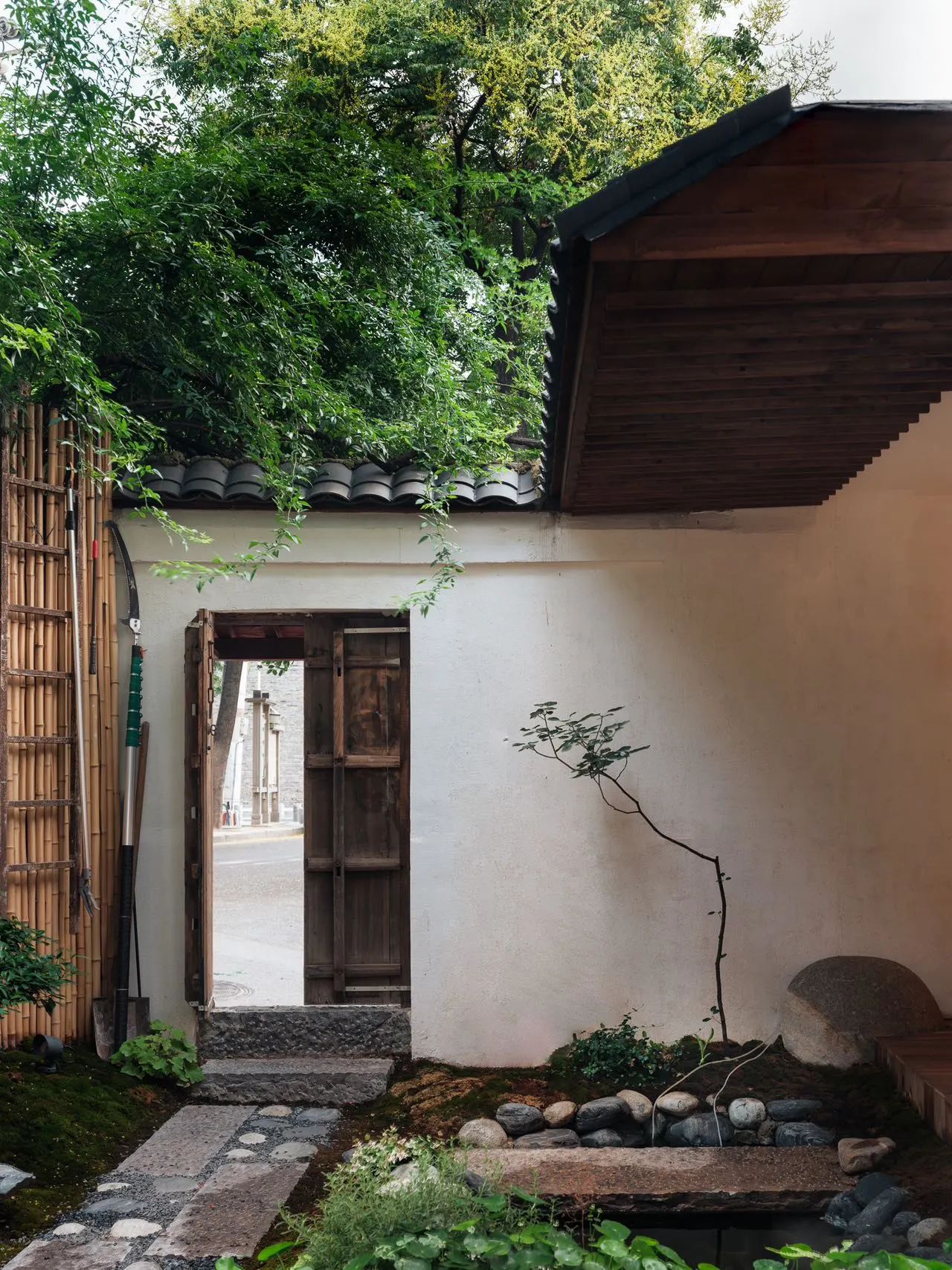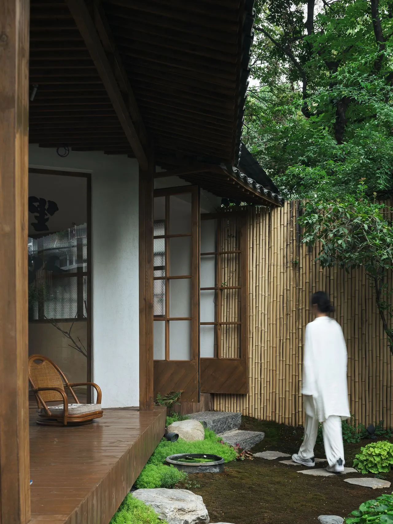 空间意境:新的茶室和办公室,原本是一栋老小区的民宅,一层带后院,室内面积在100平米左右。房屋后面的院子,被设计师改造为入户前院,推开木门,隐逸于闹市的一方庭院跃入眼前。竹竿围成一圈篱笆作为墙面,是投射光影的绝佳材质,几块青石蜿蜒在苔藓之中,延伸至入户台阶处。