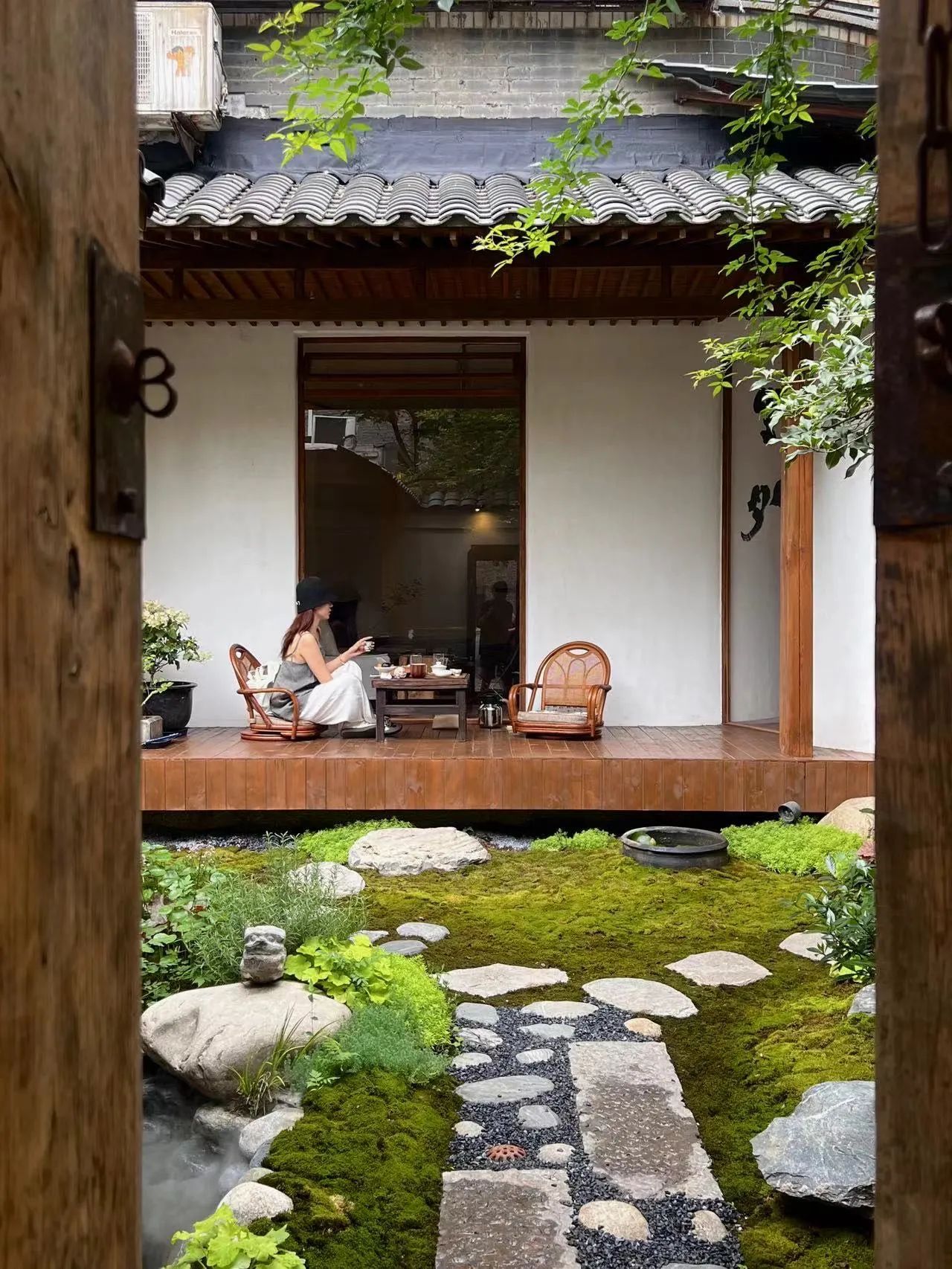 空间布局:庭院一角,设计师改造了原来的库房,作为半户外的茶室使用,叠石理水,覆盖青苔点点,有山水之意。石头围成的水池,几条锦鲤游弋其中,树影斑驳,活泼灵动。