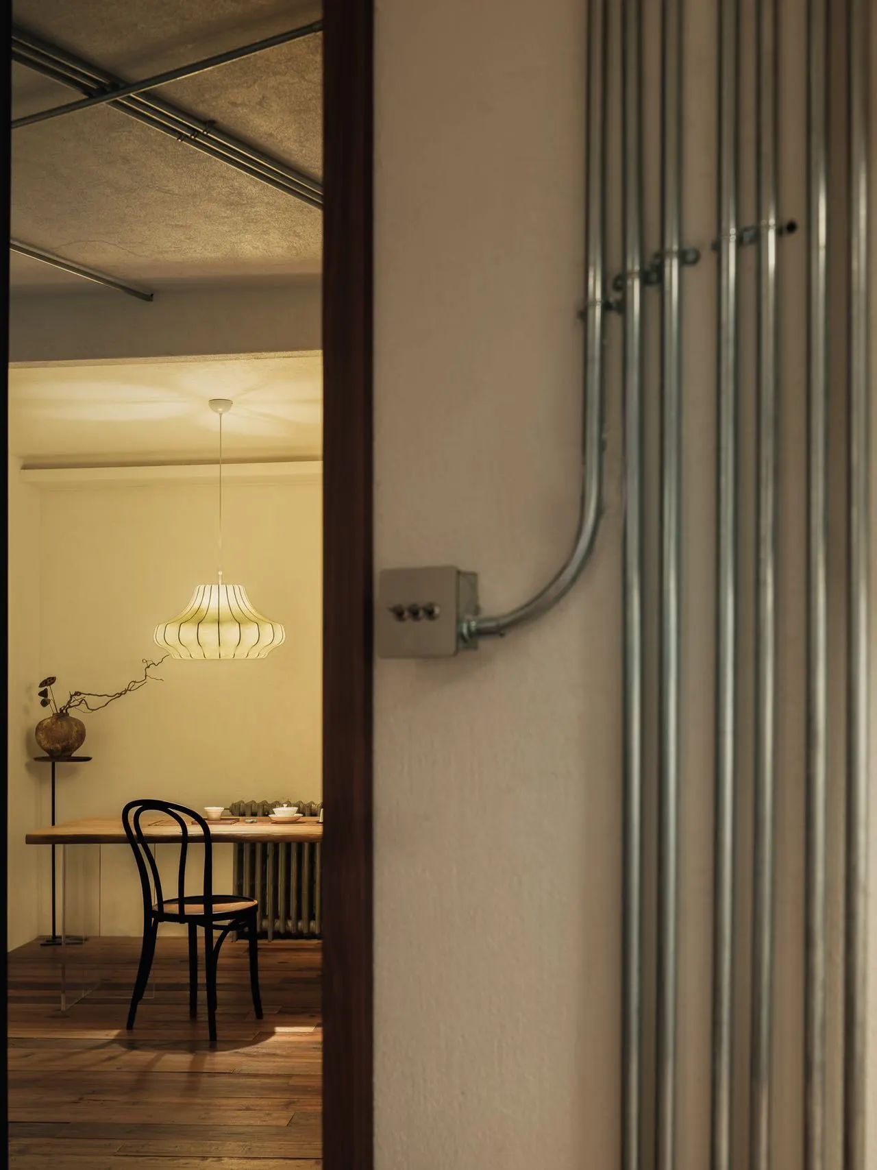 混着石英砂的墙面肌理粗糙,在里外茶室中,电线没有隐藏在墙体中,而是用铁管包裹,暴露出来,在纯白色的墙面上,形成一连串的转折走向,丰富了墙的立面层次。同时,墙面和铁管的冷调又与暖调的木头产生碰撞,空间的颜色和质感变得丰富起来。 -
