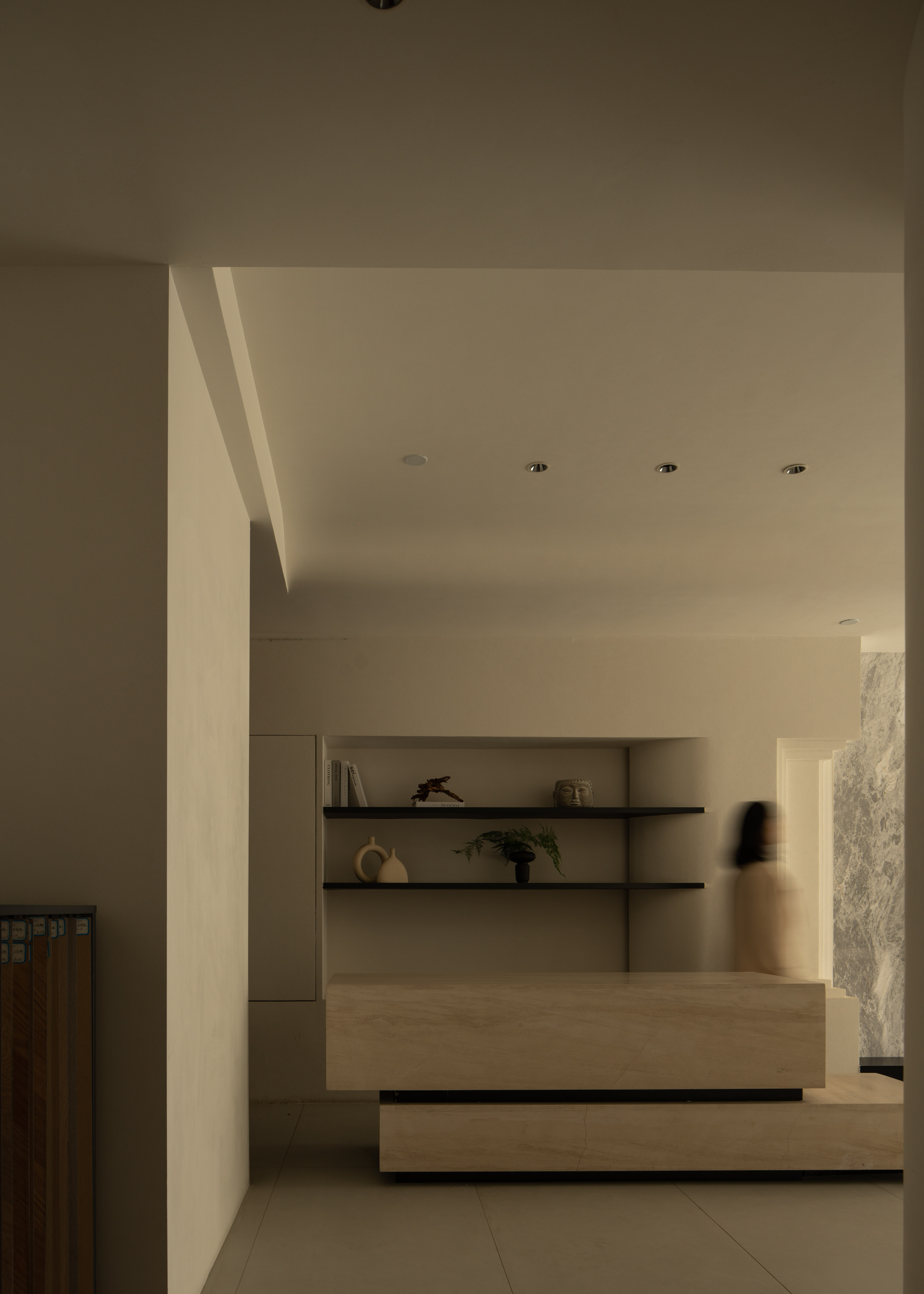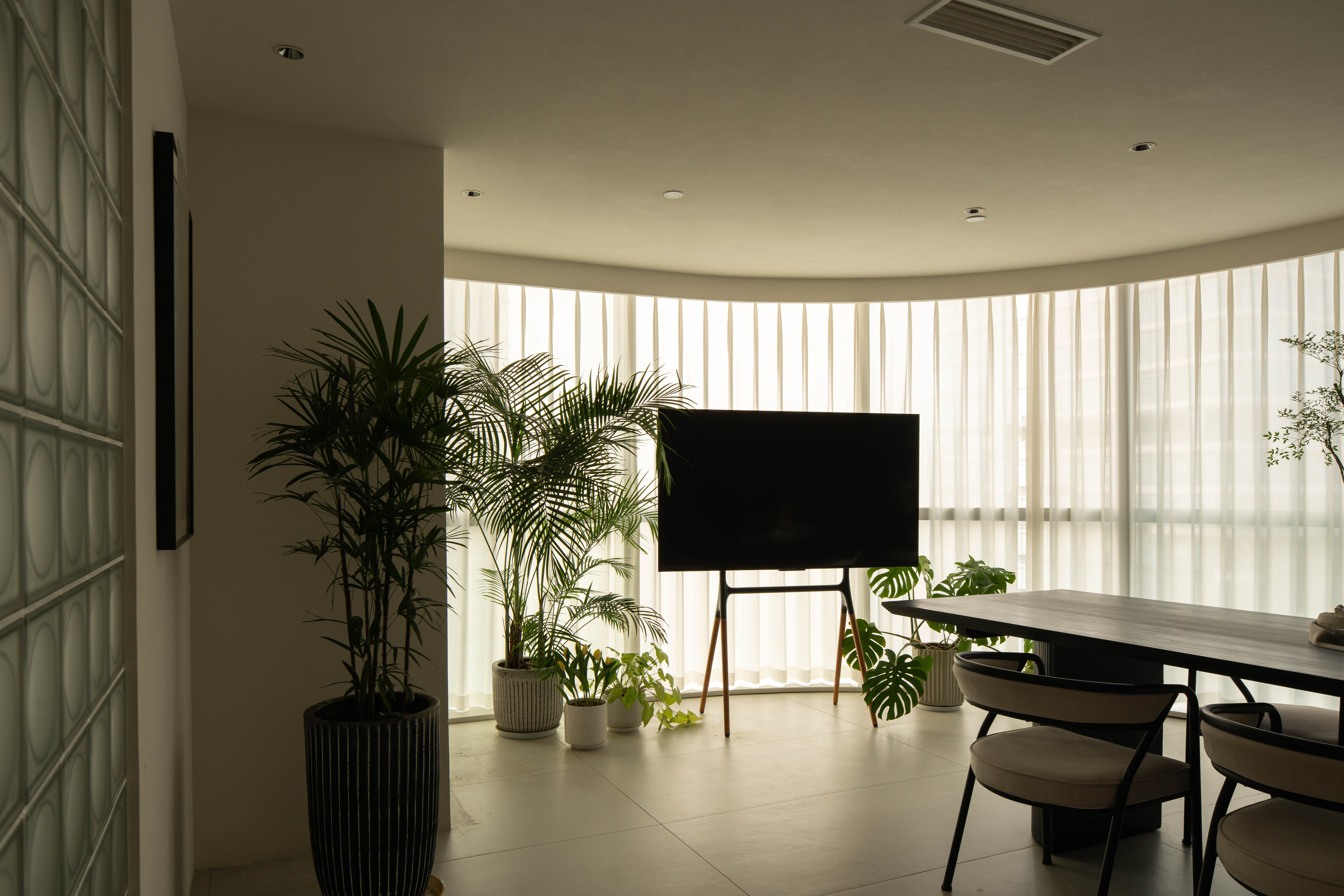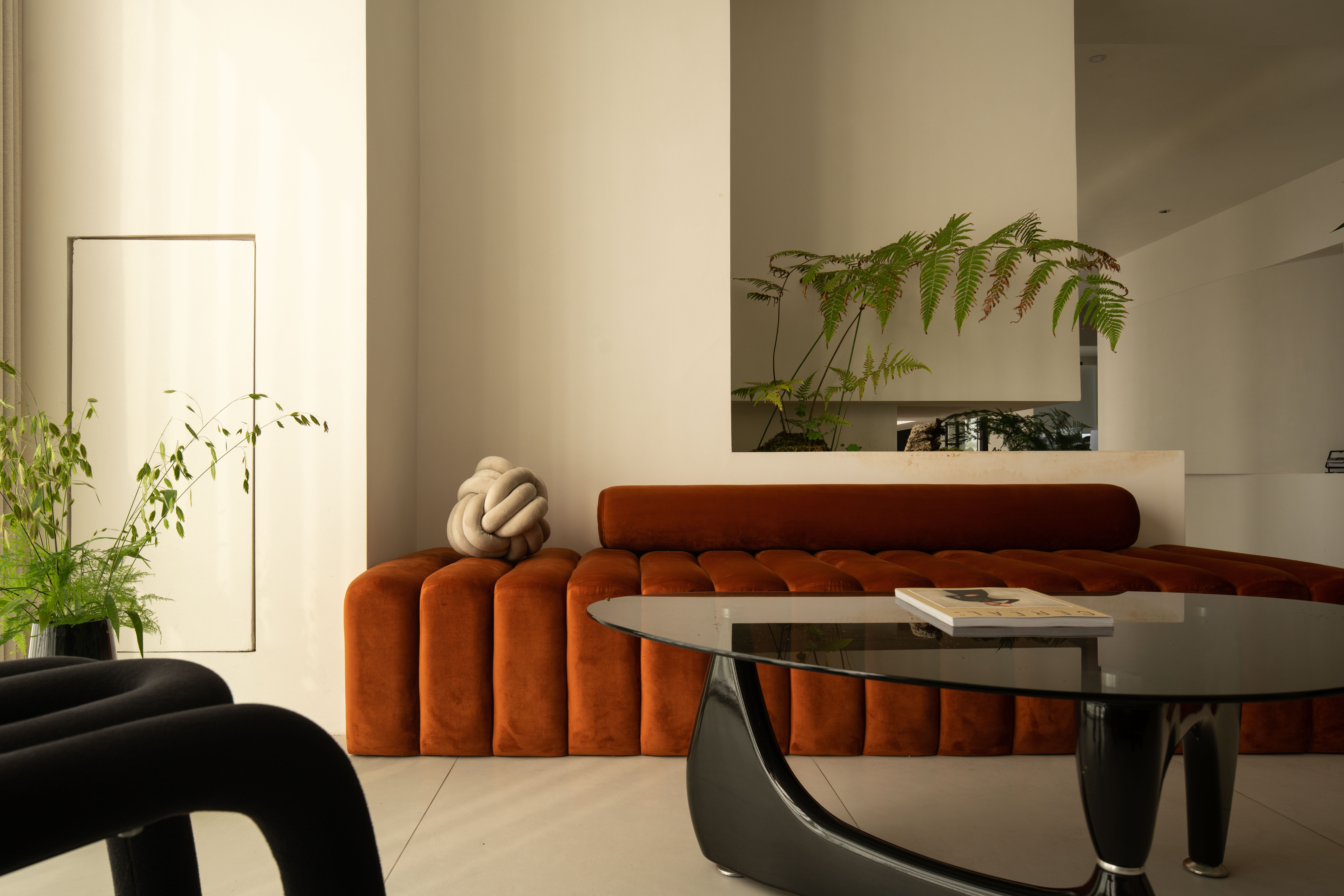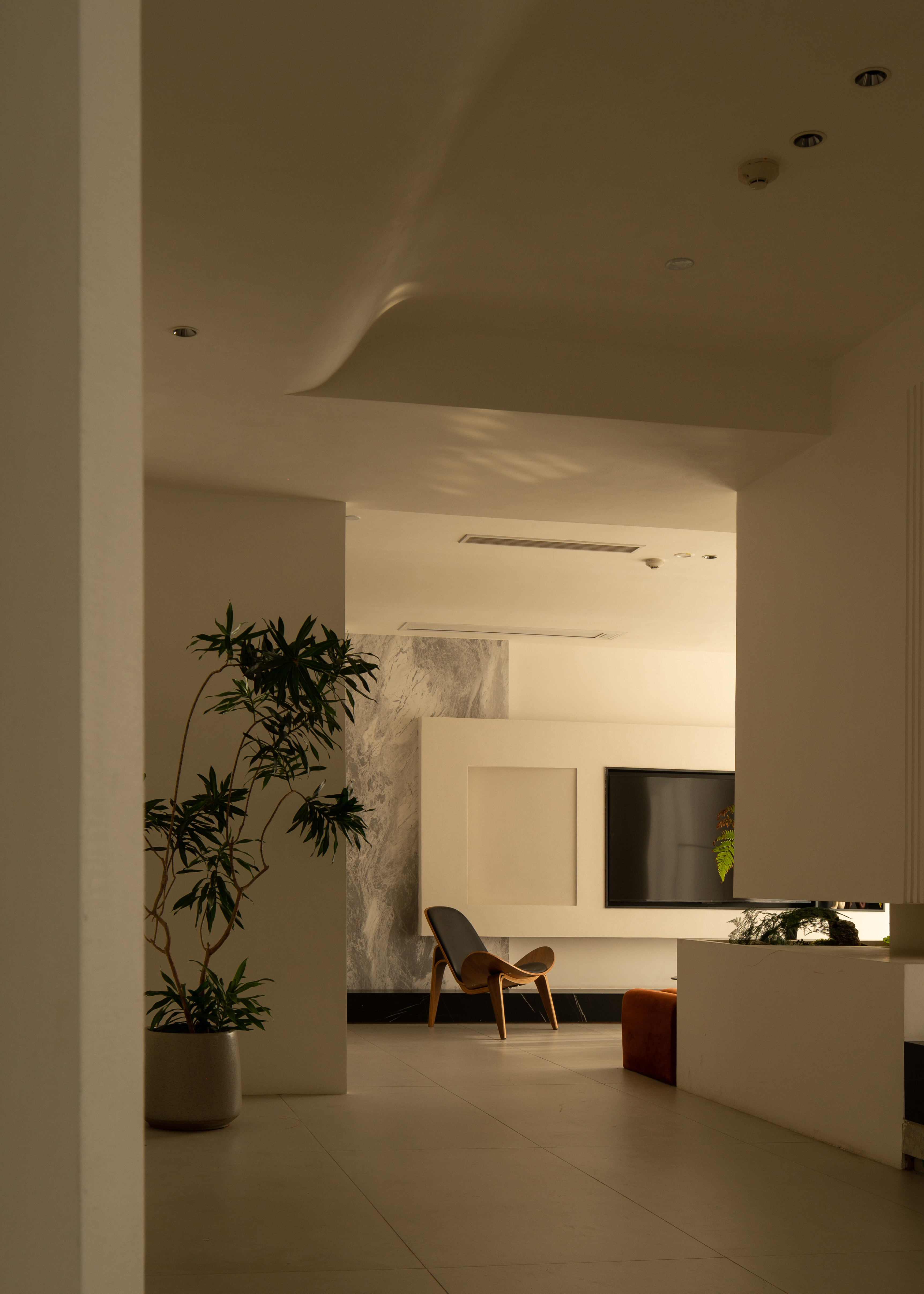 整体空间从入户玄关到接待、中间留有部分可以灵活变动的展示空间过度再到洽谈、汇报、办公空间,整体以家为氛围让客户走进公司有一种自然松弛的感觉,可以很好的放松下来拉近客户关系。也融入了一些解构的手法,去区分每空间的同时让光线能够自然的穿透进我们的每一个区域和我们的一些景观植物结合,让整个空间充满生动的气息,使员工能在此环境下更舒适方式的工作,没有压迫感才能拥有更多灵感去思考设计。
