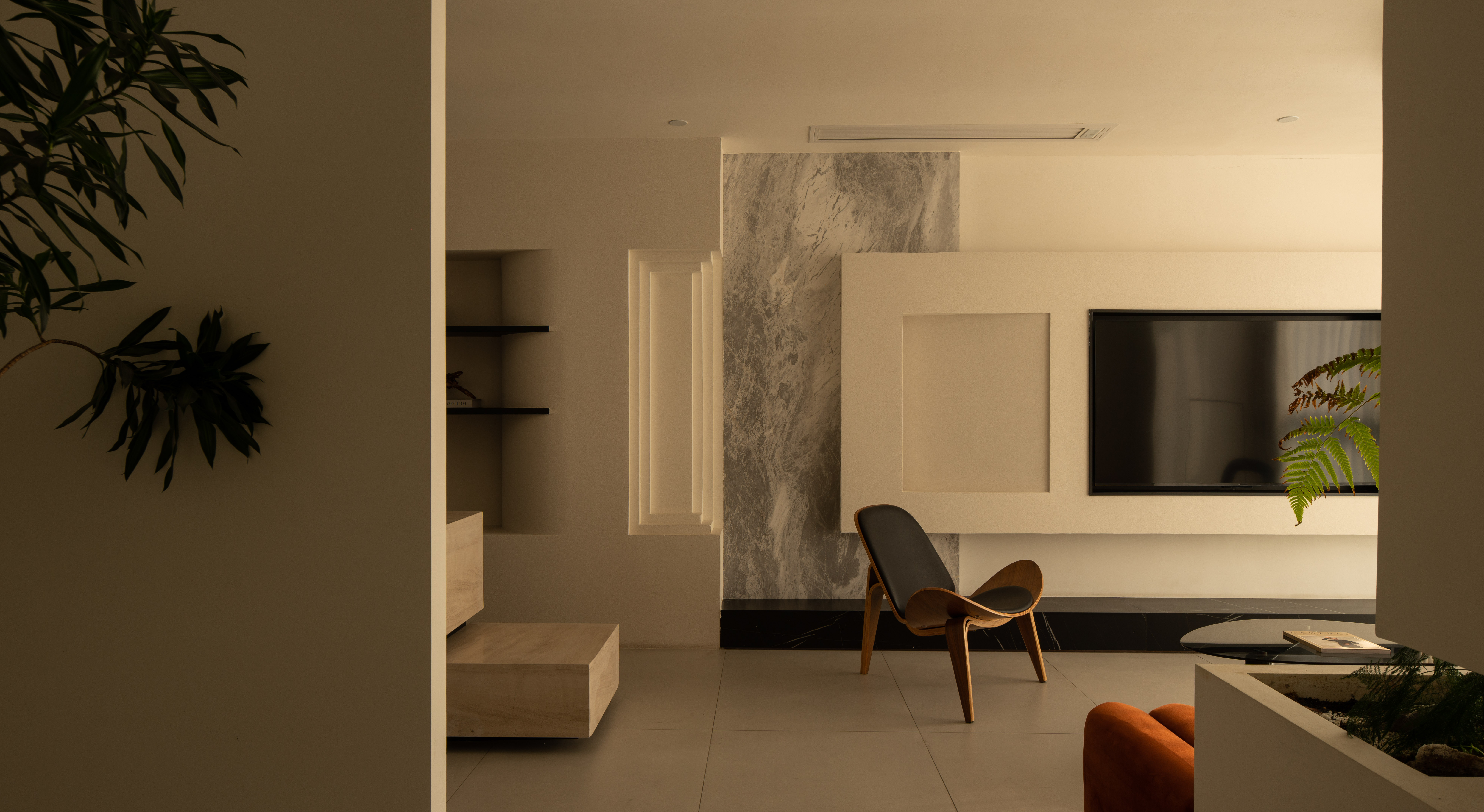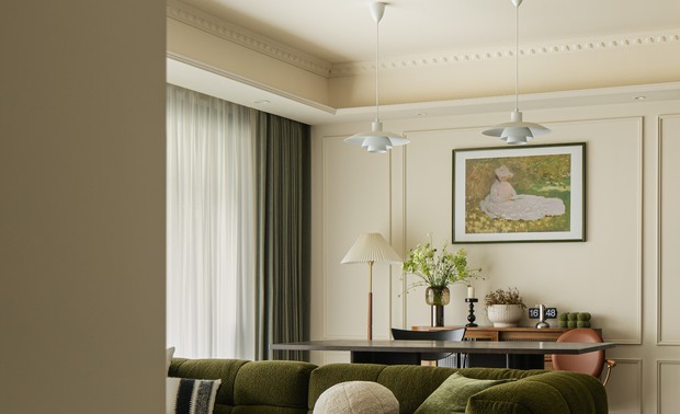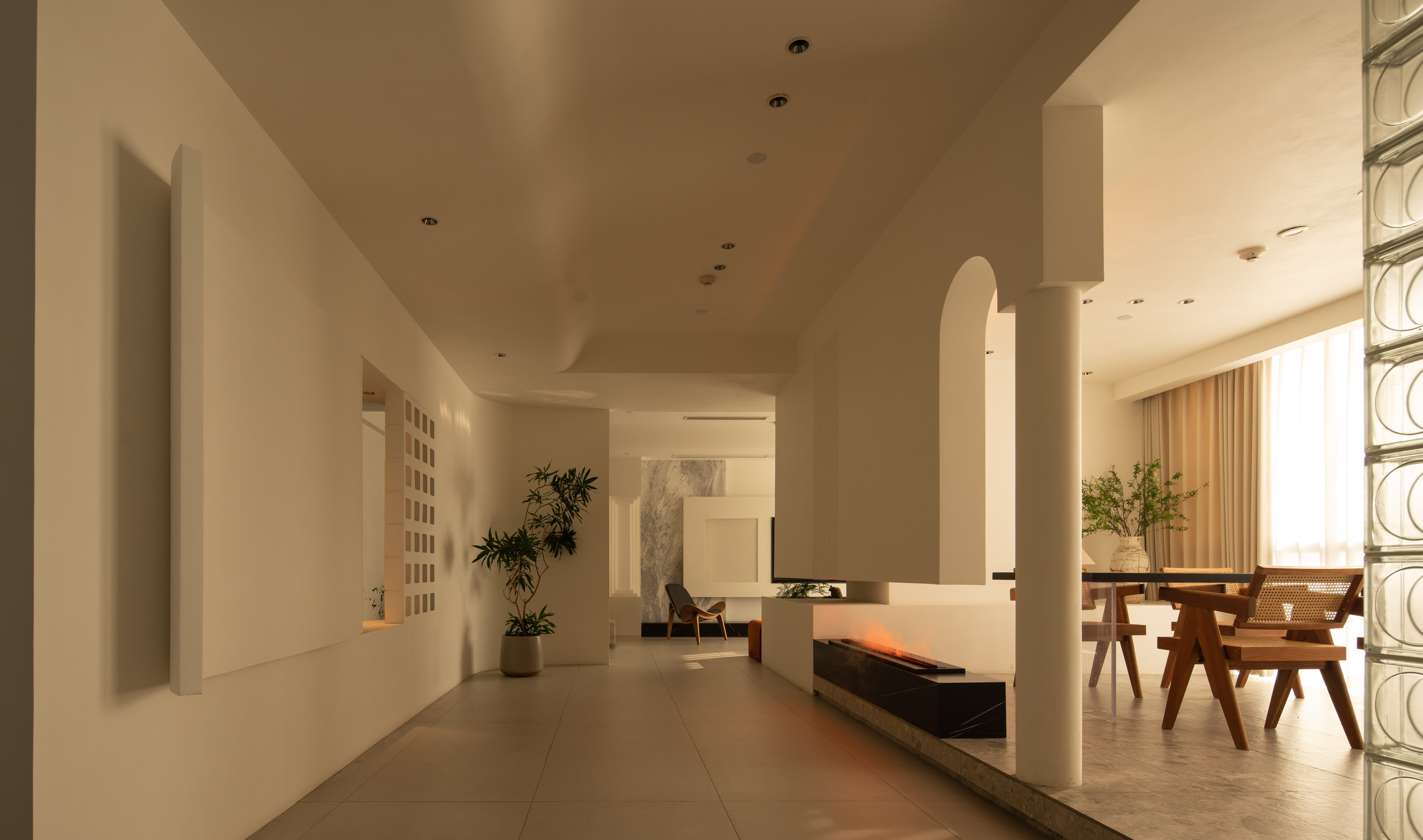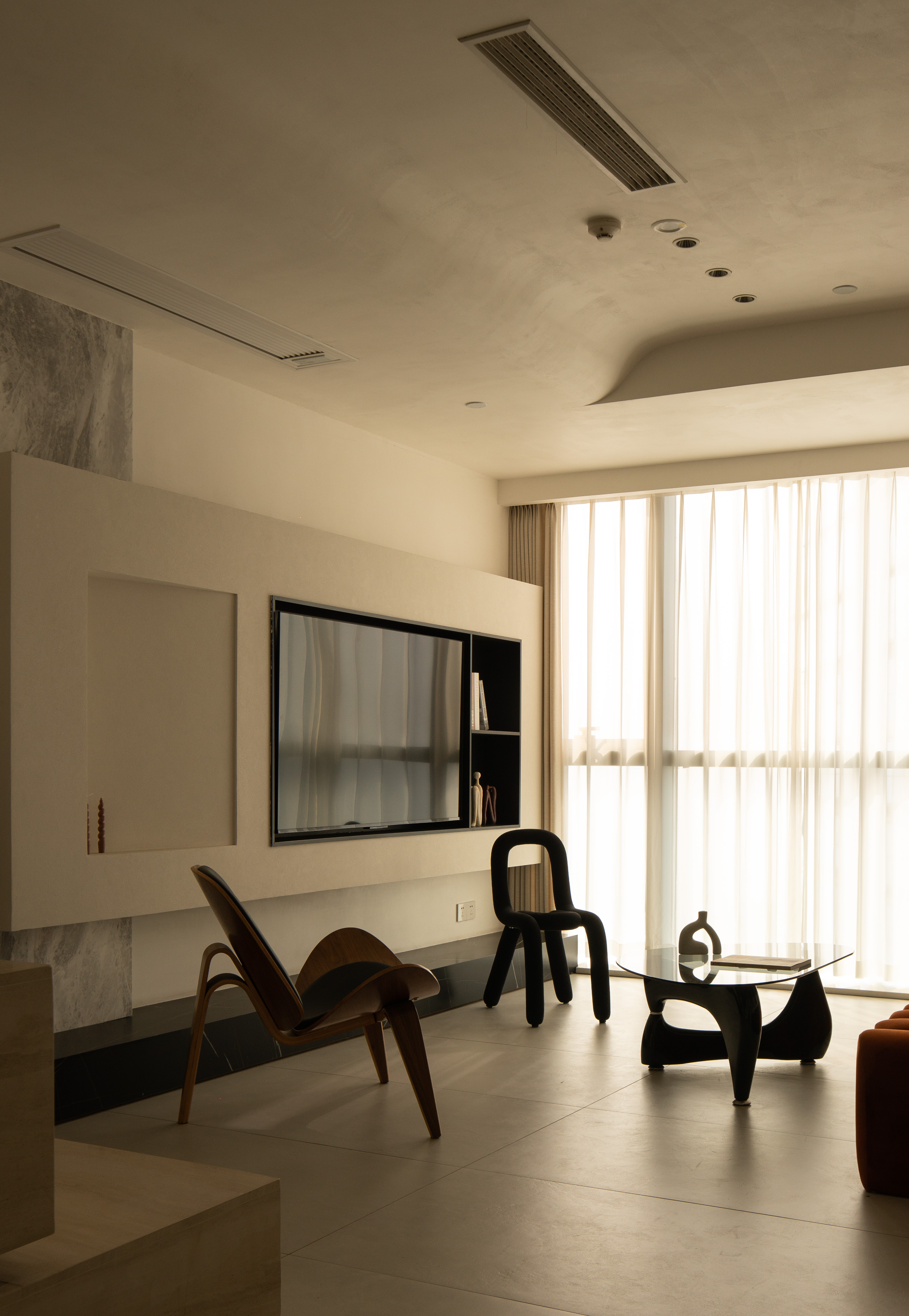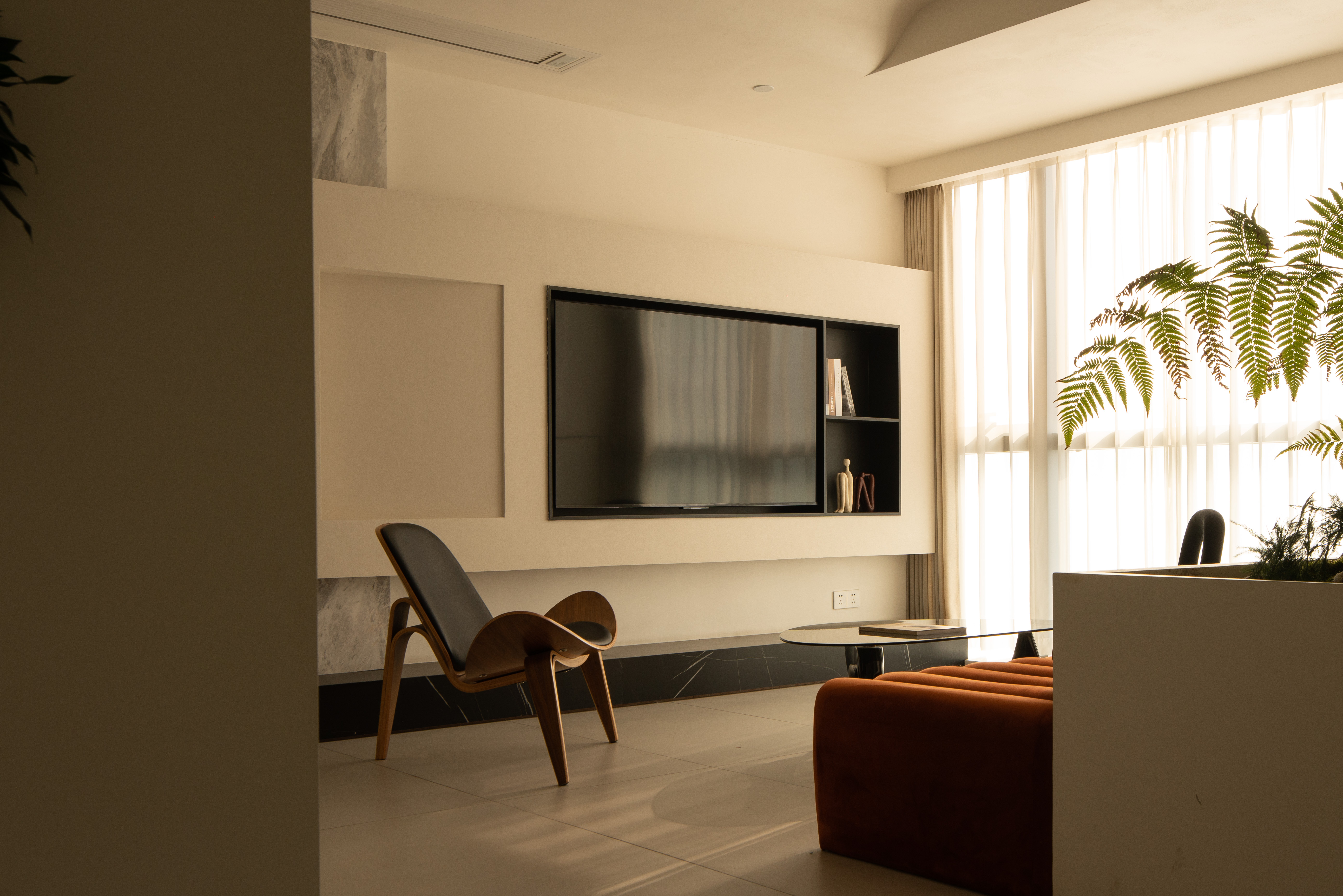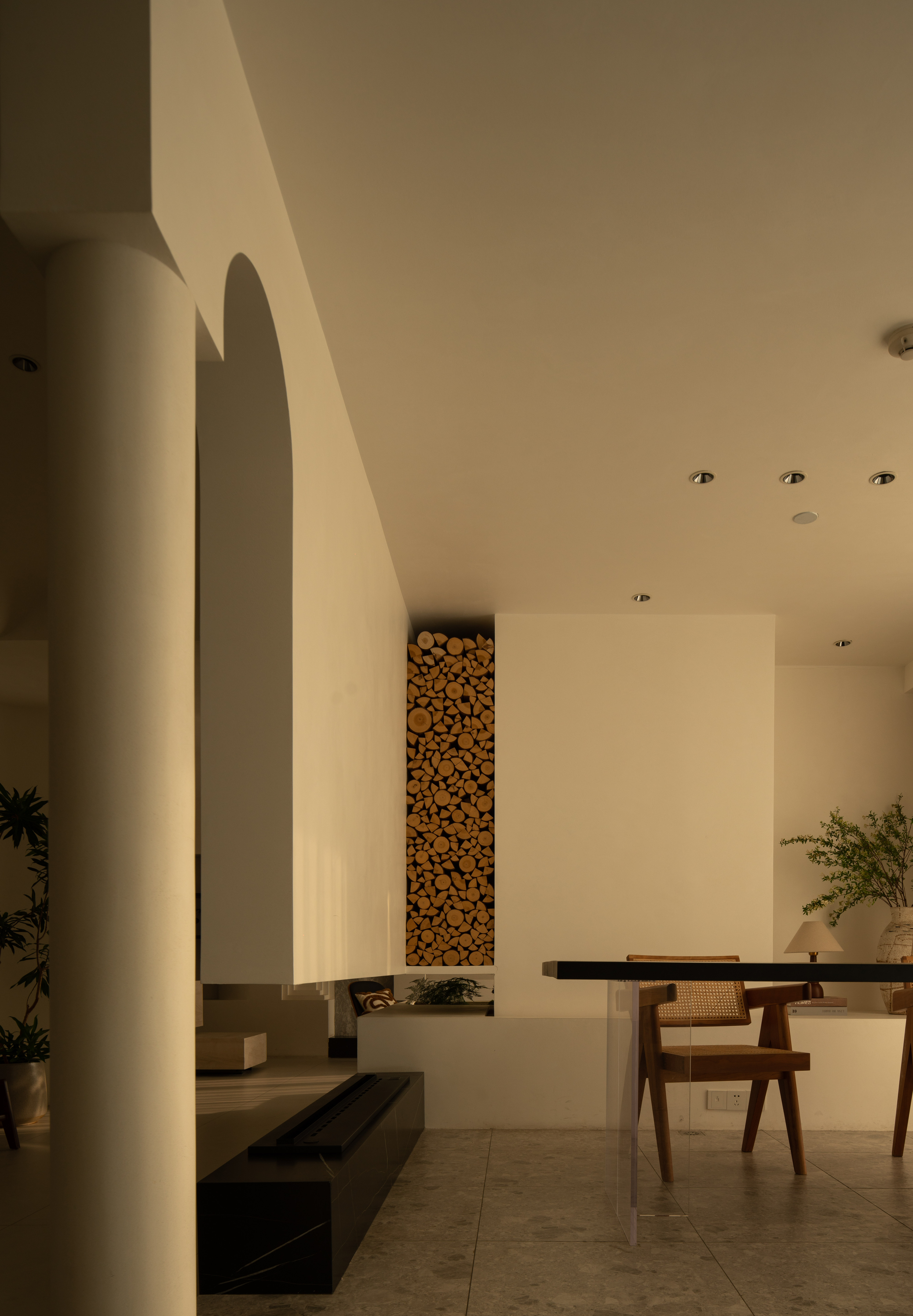 整体选材保证环保安全的前提下,运用的大面积米白艺术漆以及一些石材岩板做点缀,通过一些解构手法让不同材质之间达到收口过度的同时又能增加空间层次感,灯光也都是多以结构光灯带为主,在带来照明的同时也能起到很好的氛围和凸显空间形体。再运用壁炉和绿植让空间显得更加自然不单一。