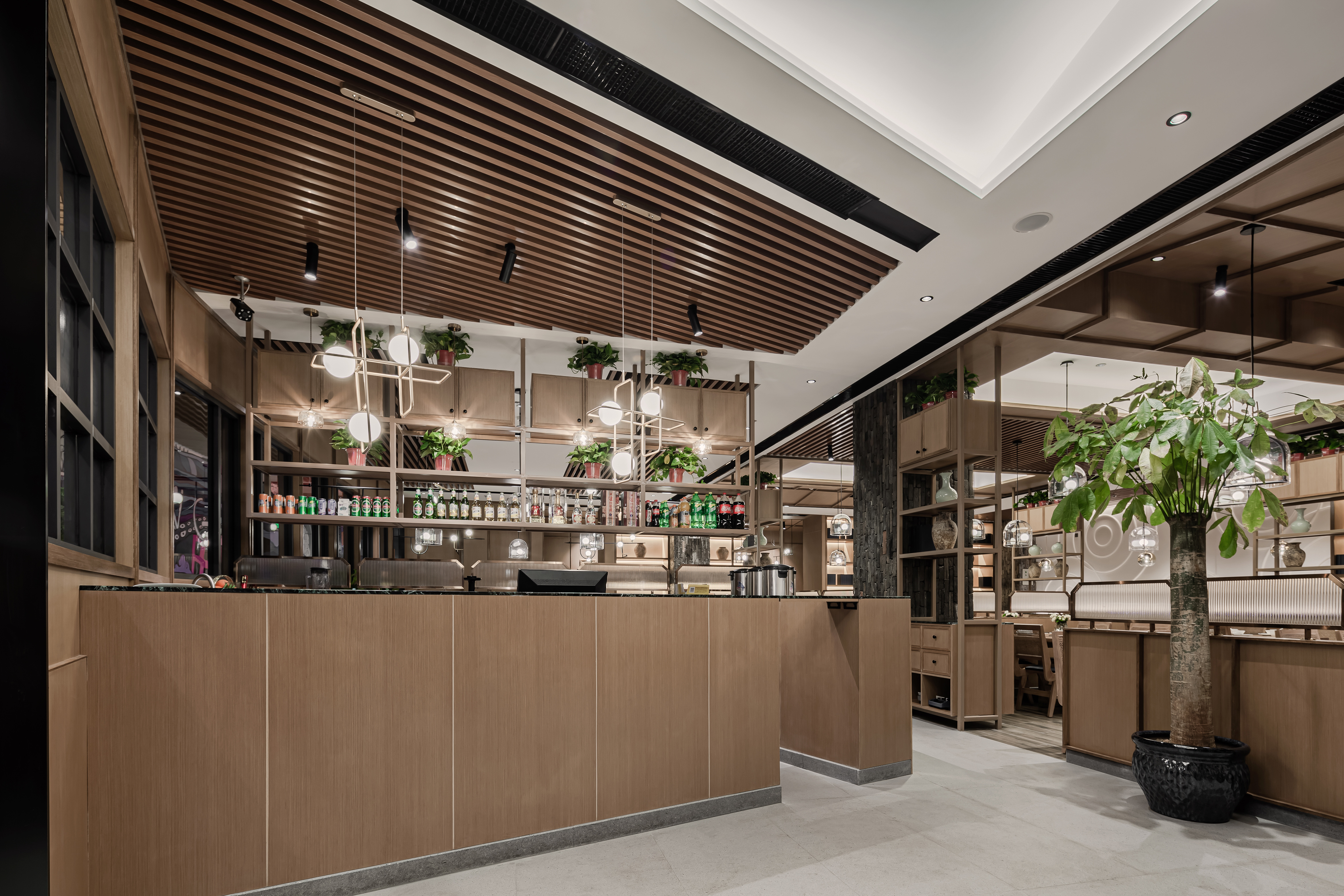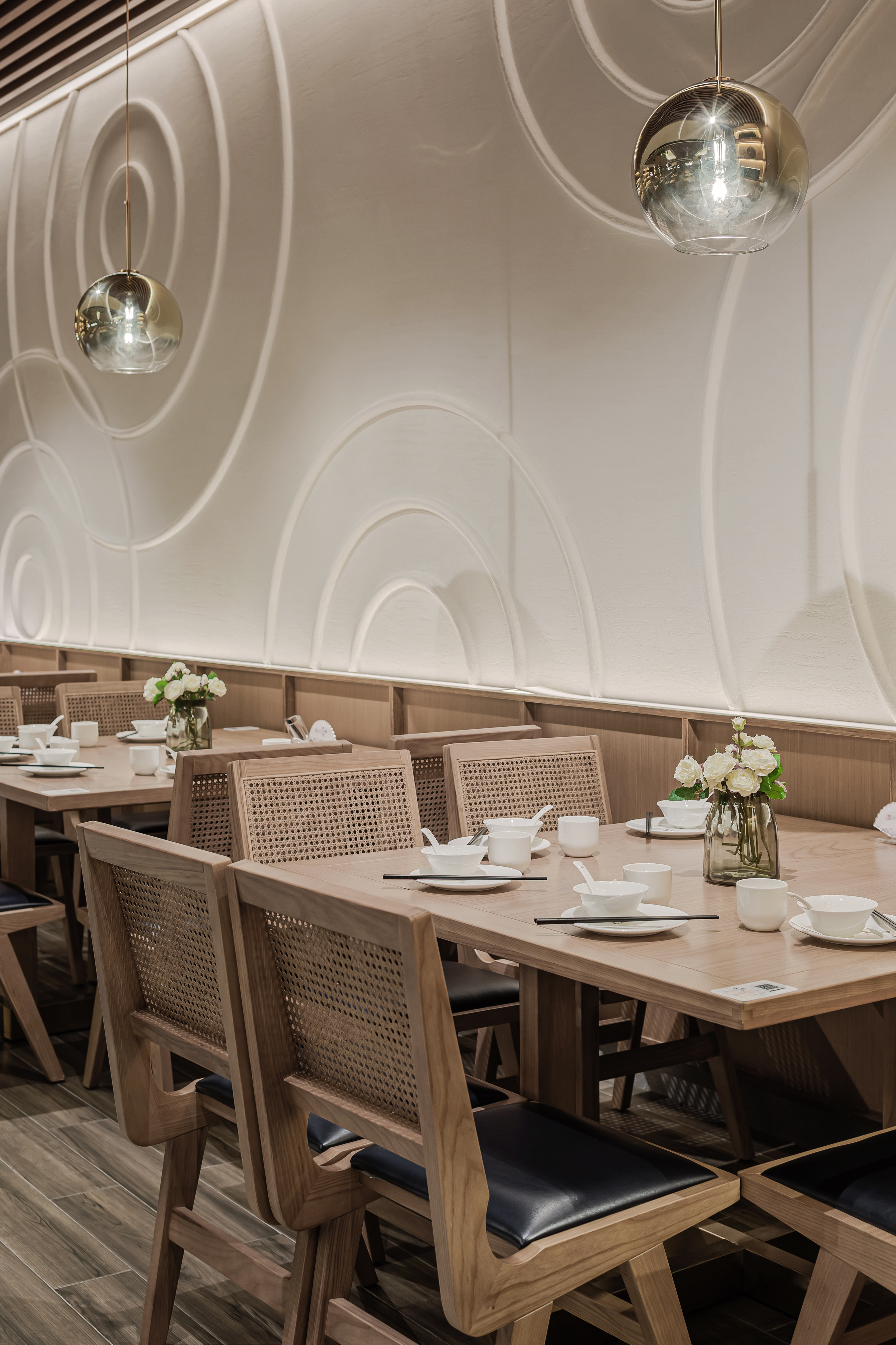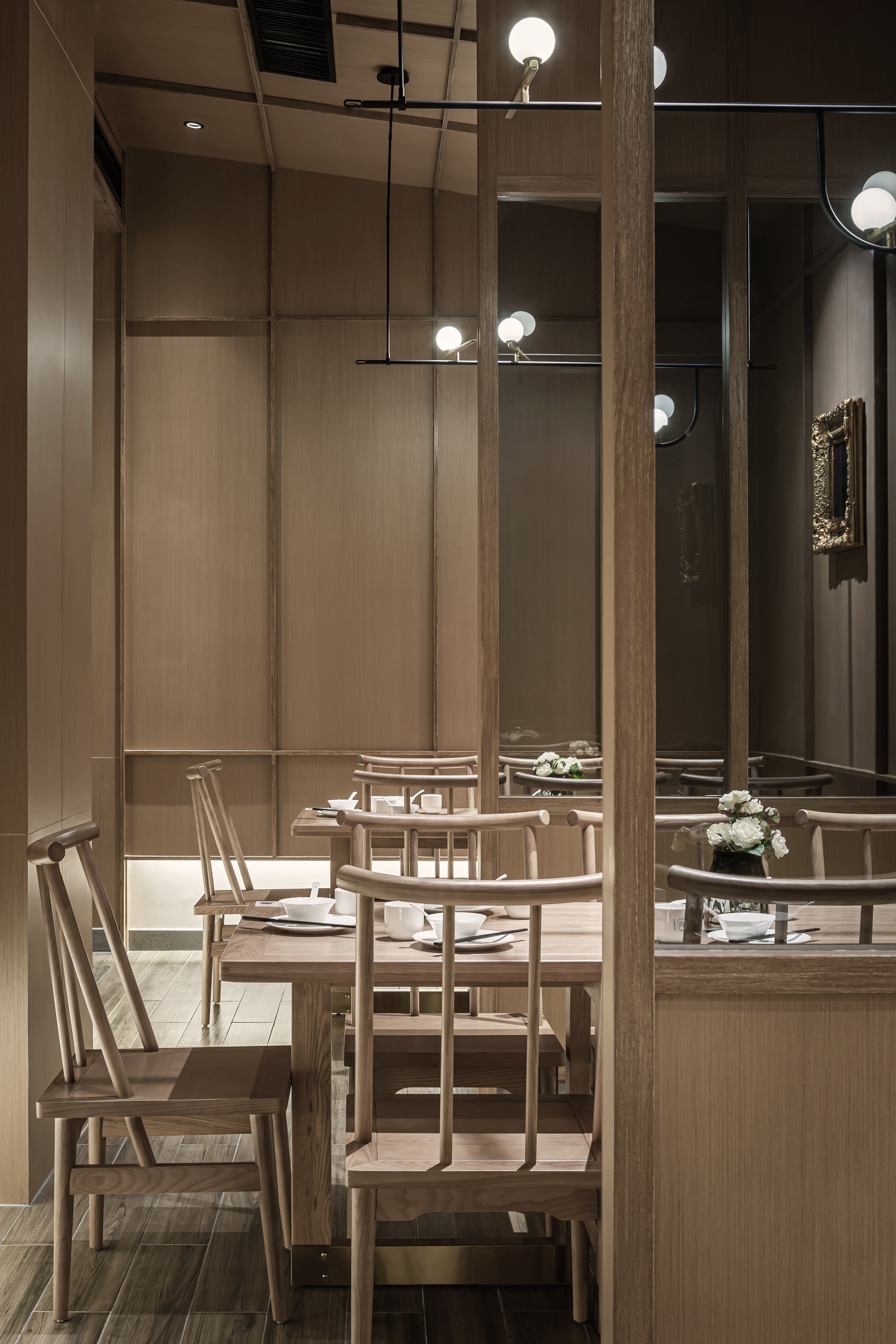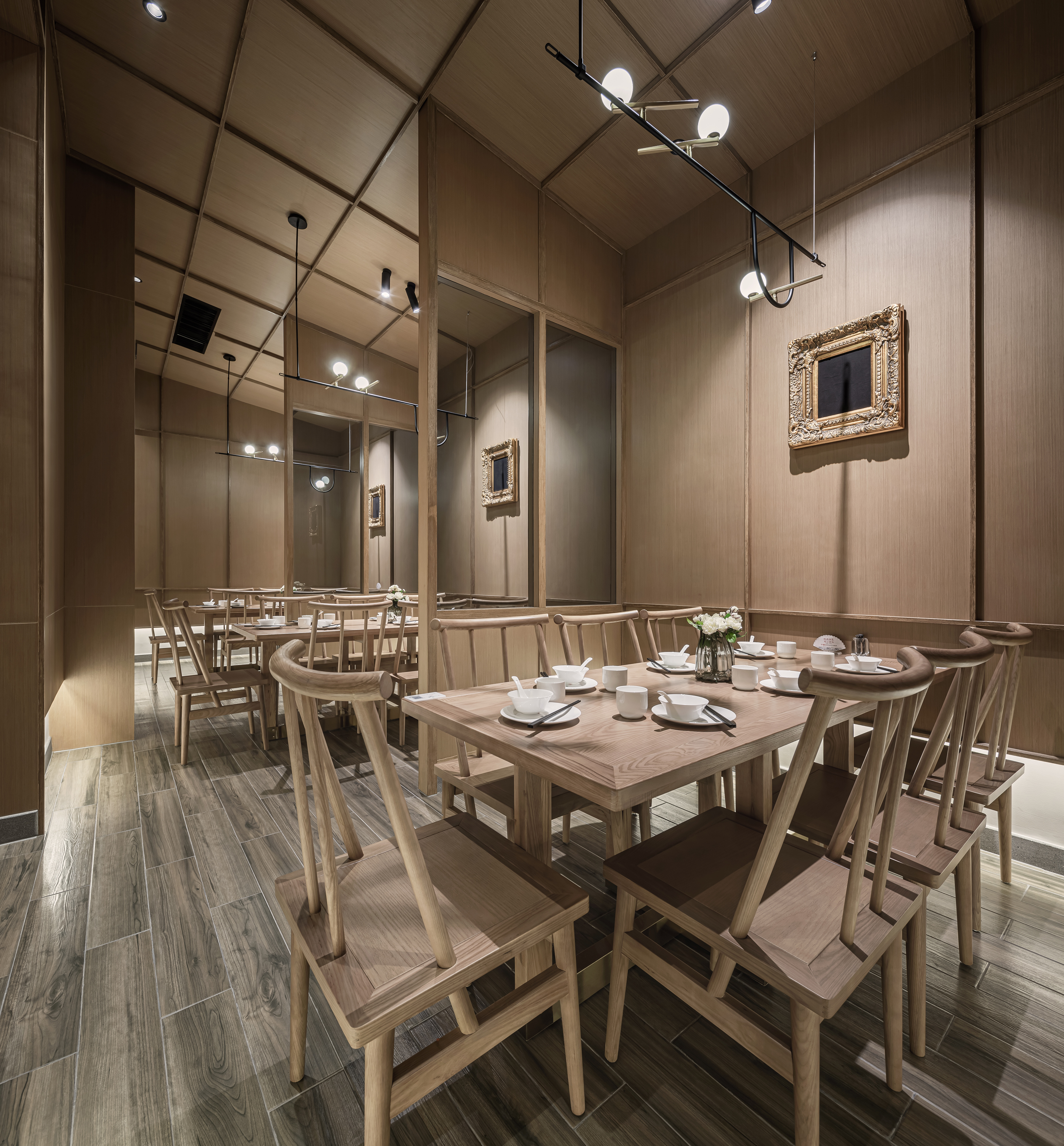 空间布局:在空间中相互冲突与呼应,共同营造出一个有格调的雅致空间,墙上利用树杆的造型与元素,让其空间丰富,创造家的温度带给人归属感;白色圆弧造型装饰成为整体色调中的点睛之笔,空间中的镂空隔板主要作用是把空间细分为不同区块,如此便可把就餐区划分出来,在拥有自己的空间同时带给顾客视觉美观体验