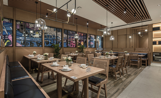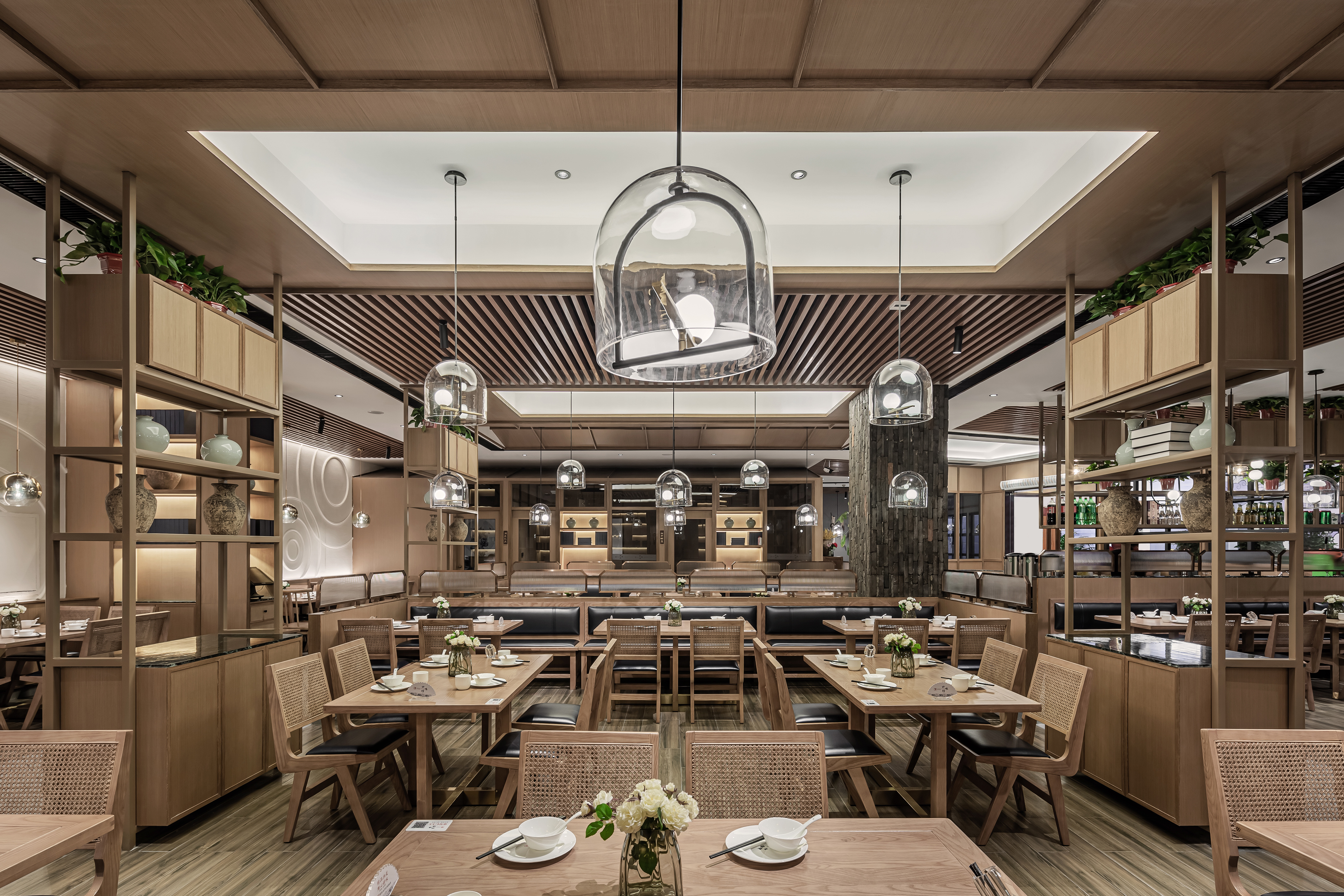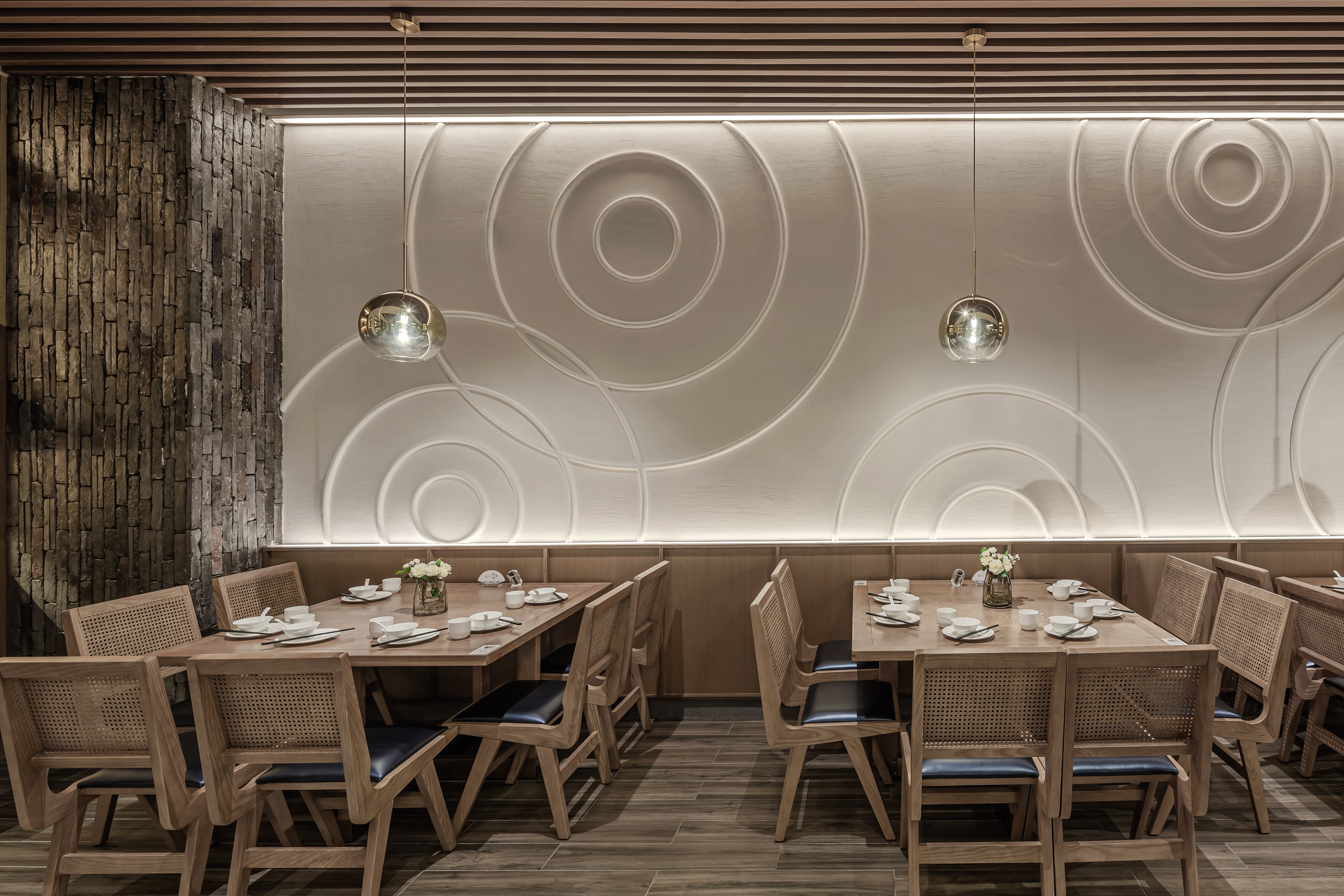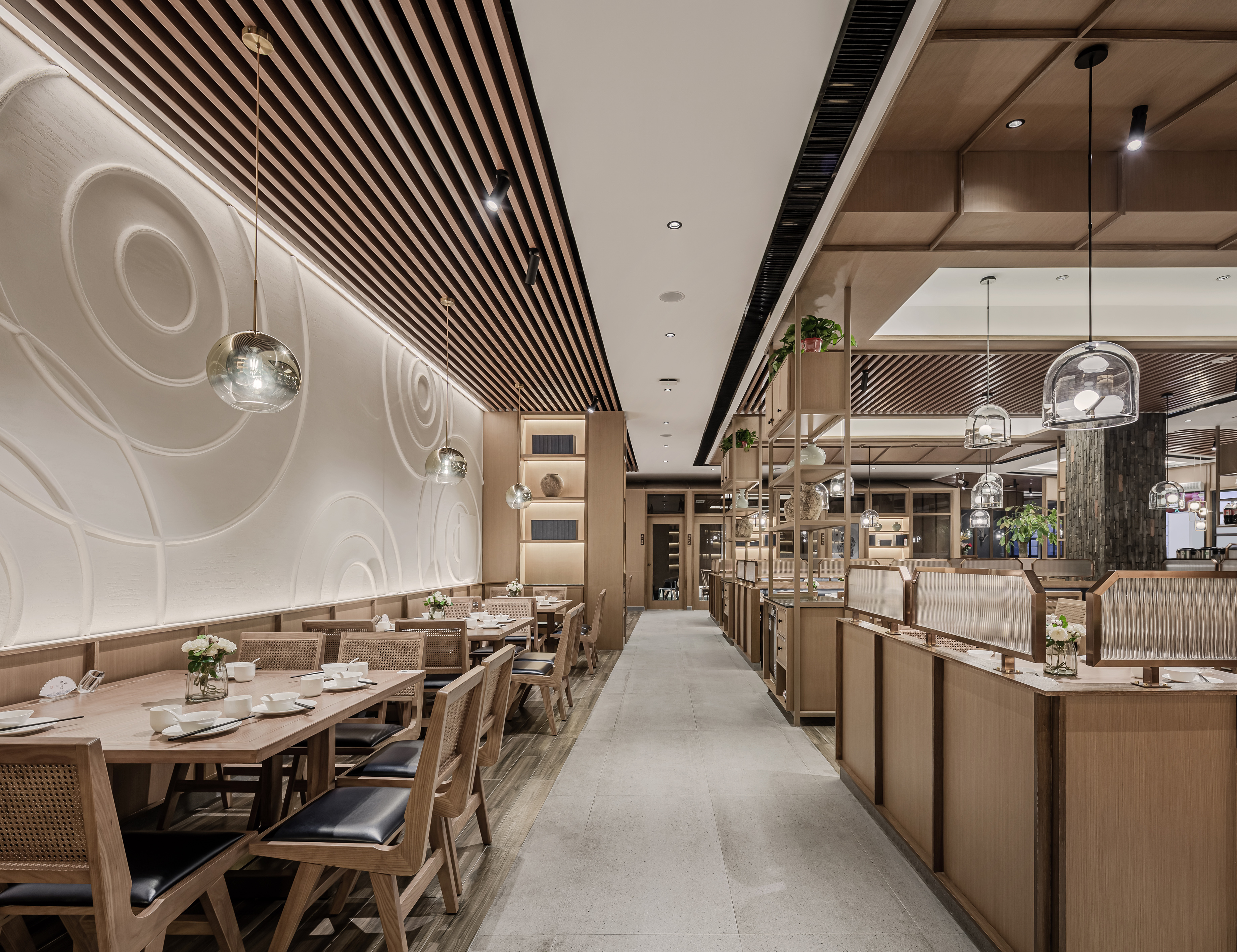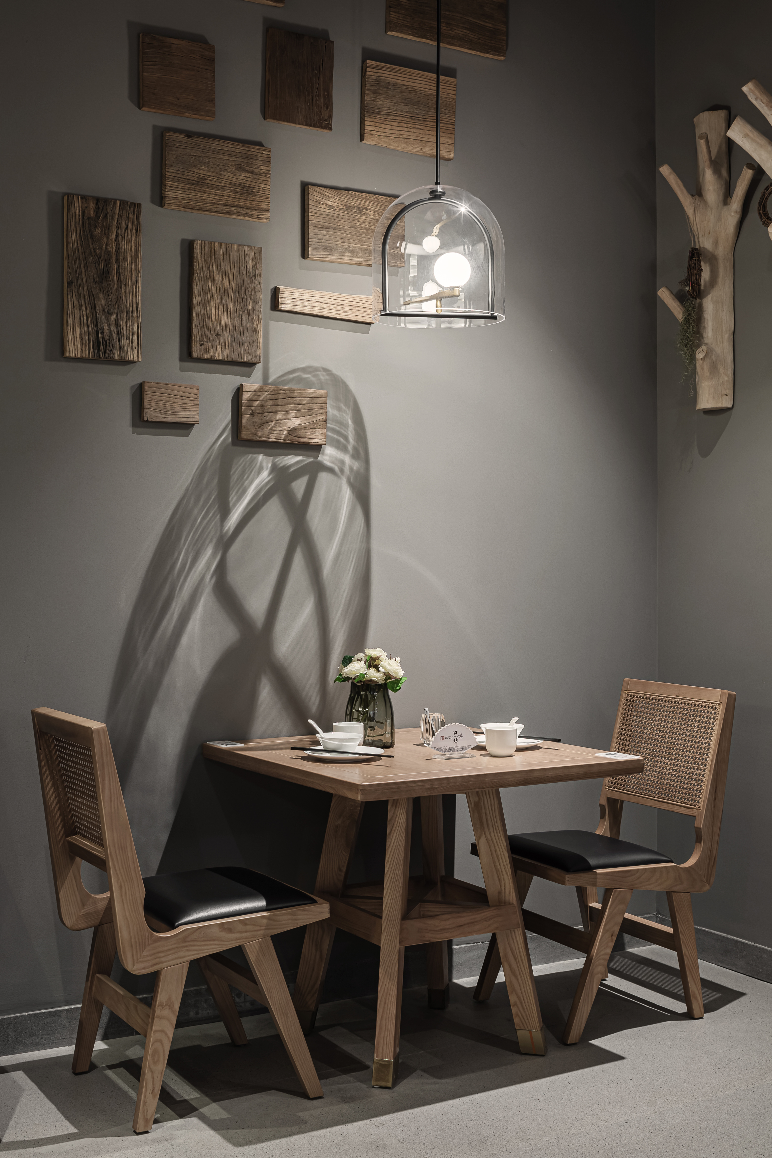 空间布局:在空间中相互冲突与呼应,共同营造出一个有格调的雅致空间,墙上利用树杆的造型与元素,让其空间丰富,创造家的温度带给人归属感;白色圆弧造型装饰成为整体色调中的点睛之笔,空间中的镂空隔板主要作用是把空间细分为不同区块,如此便可把就餐区划分出来,在拥有自己的空间同时带给顾客视觉美观体验