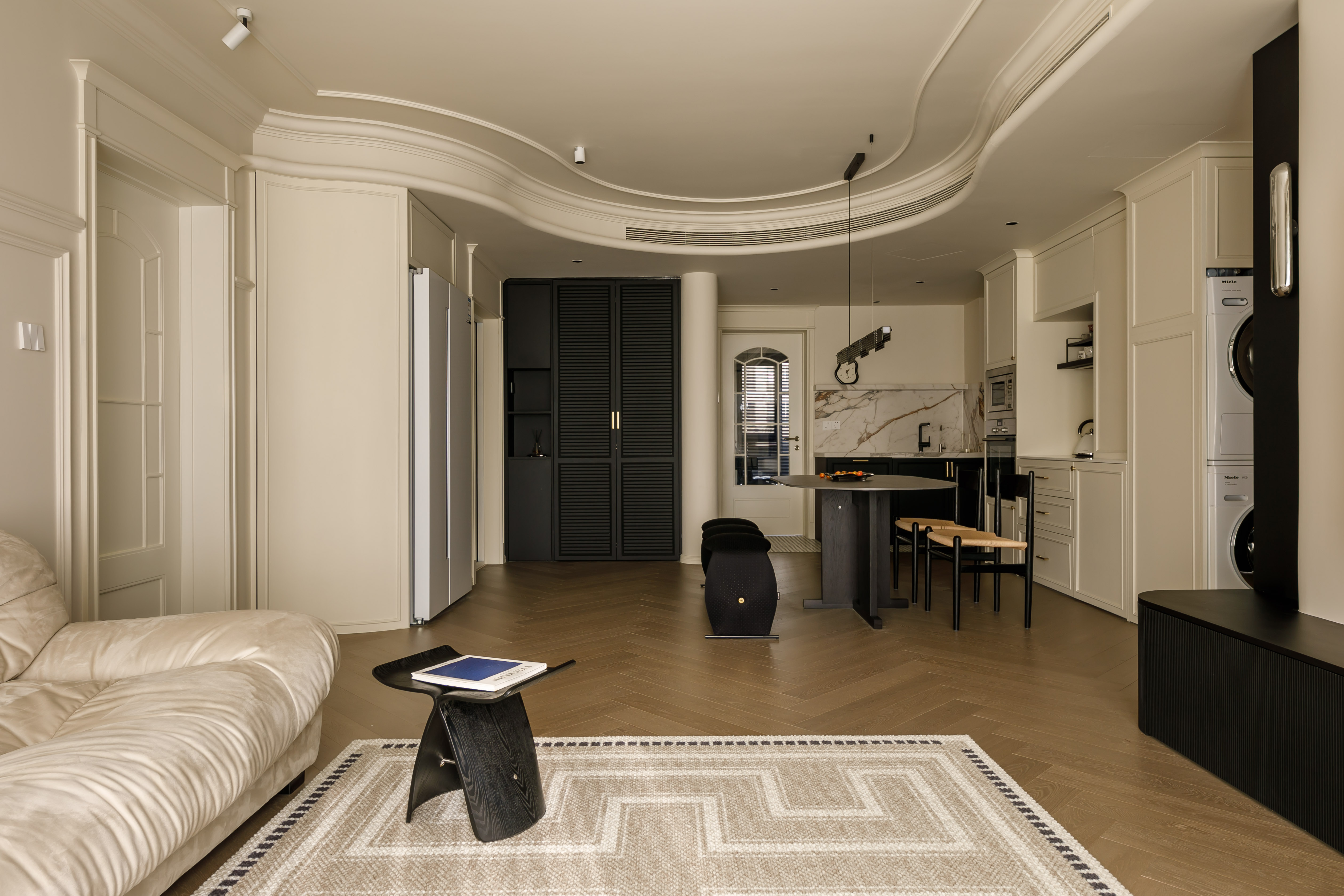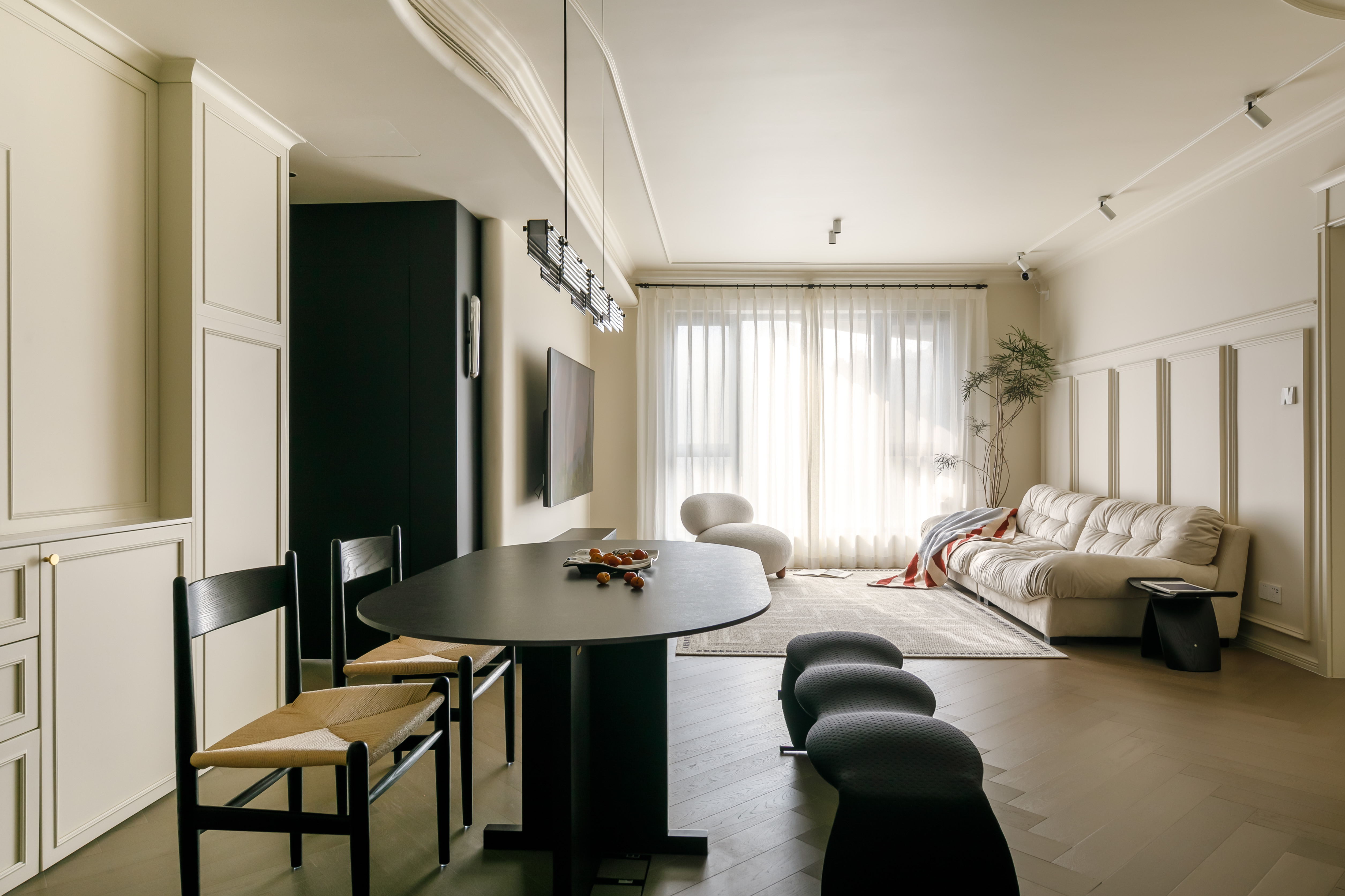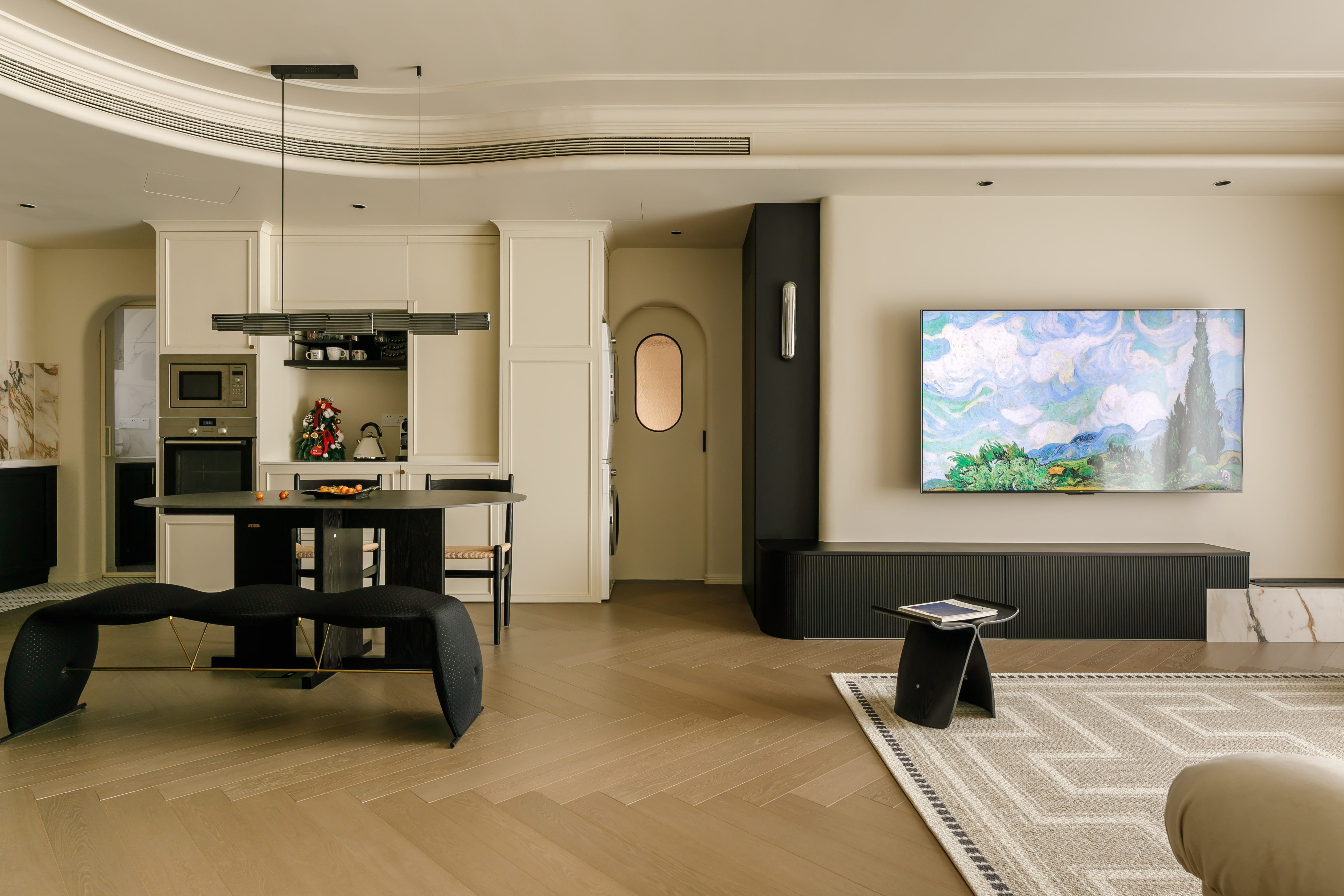 以黑色之“静”衬托奶白之“动”,柜体与家具融汇相生,延伸出一种融合法式、现代与复古的全新体验,既有气势磅礴的张力,又不乏细腻悠然的意趣,营造出丰富的感官体验和直达人心的力量