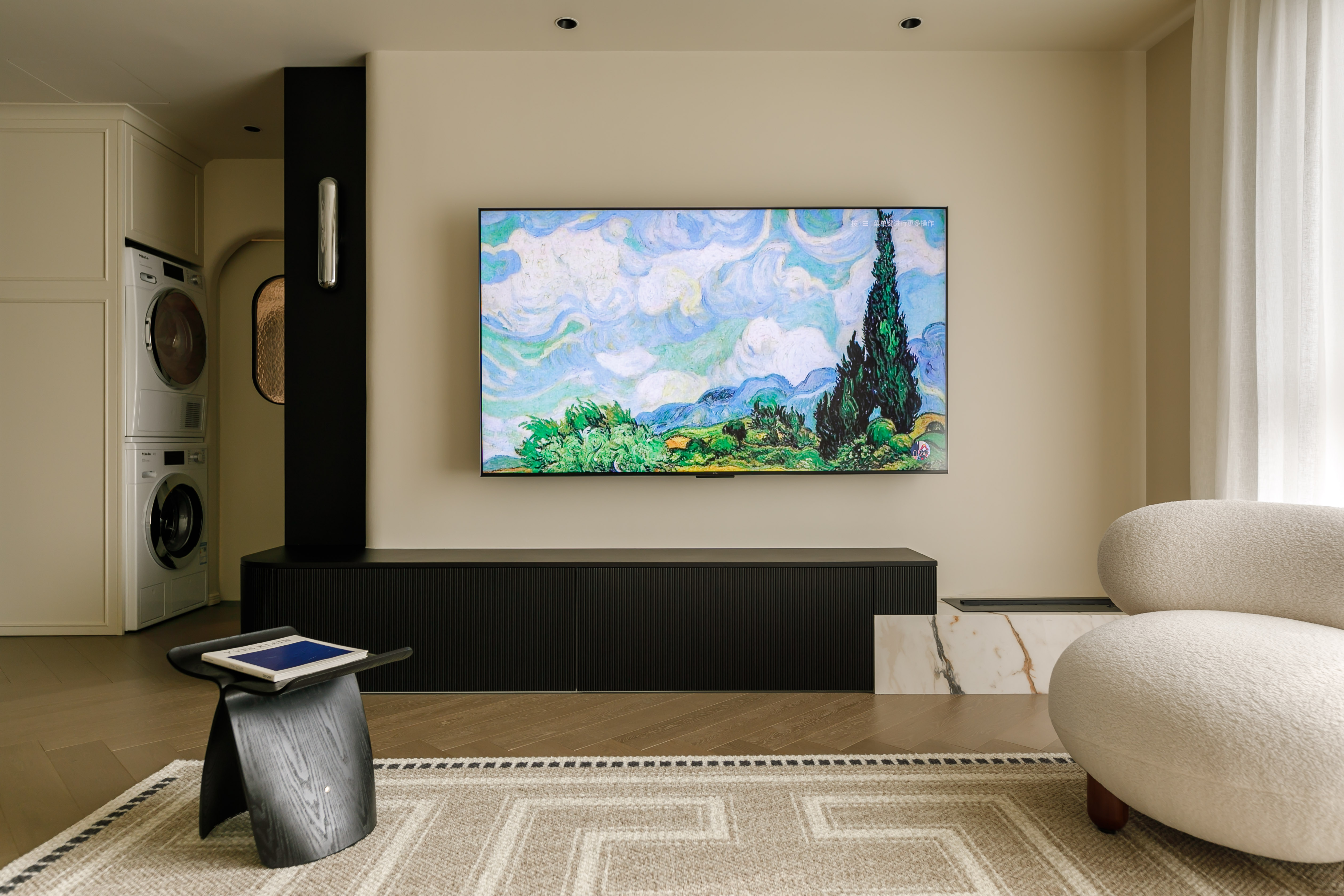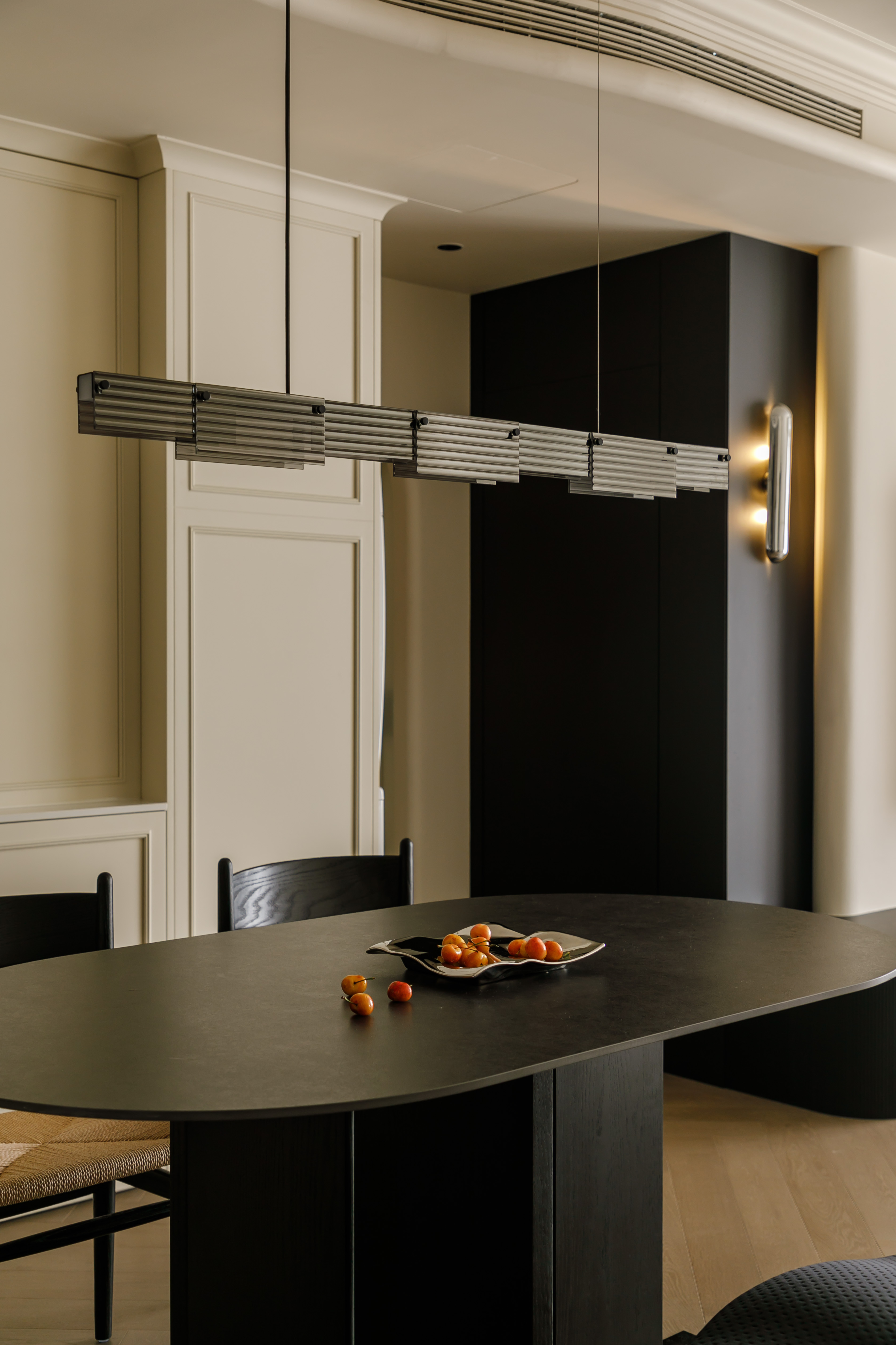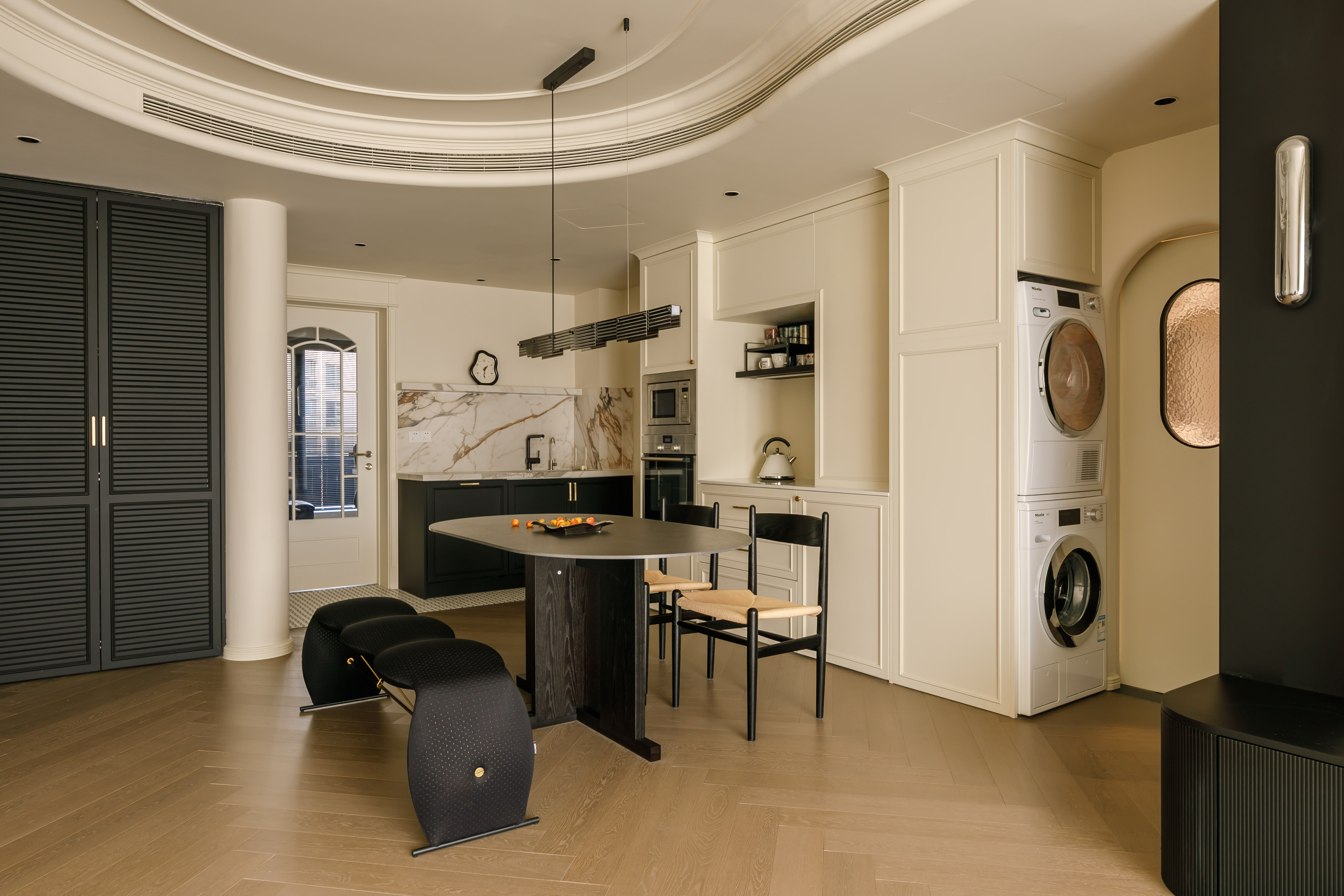 以黑色之“静”衬托奶白之“动”,柜体与家具融汇相生,延伸出一种融合法式、现代与复古的全新体验,既有气势磅礴的张力,又不乏细腻悠然的意趣,营造出丰富的感官体验和直达人心的力量