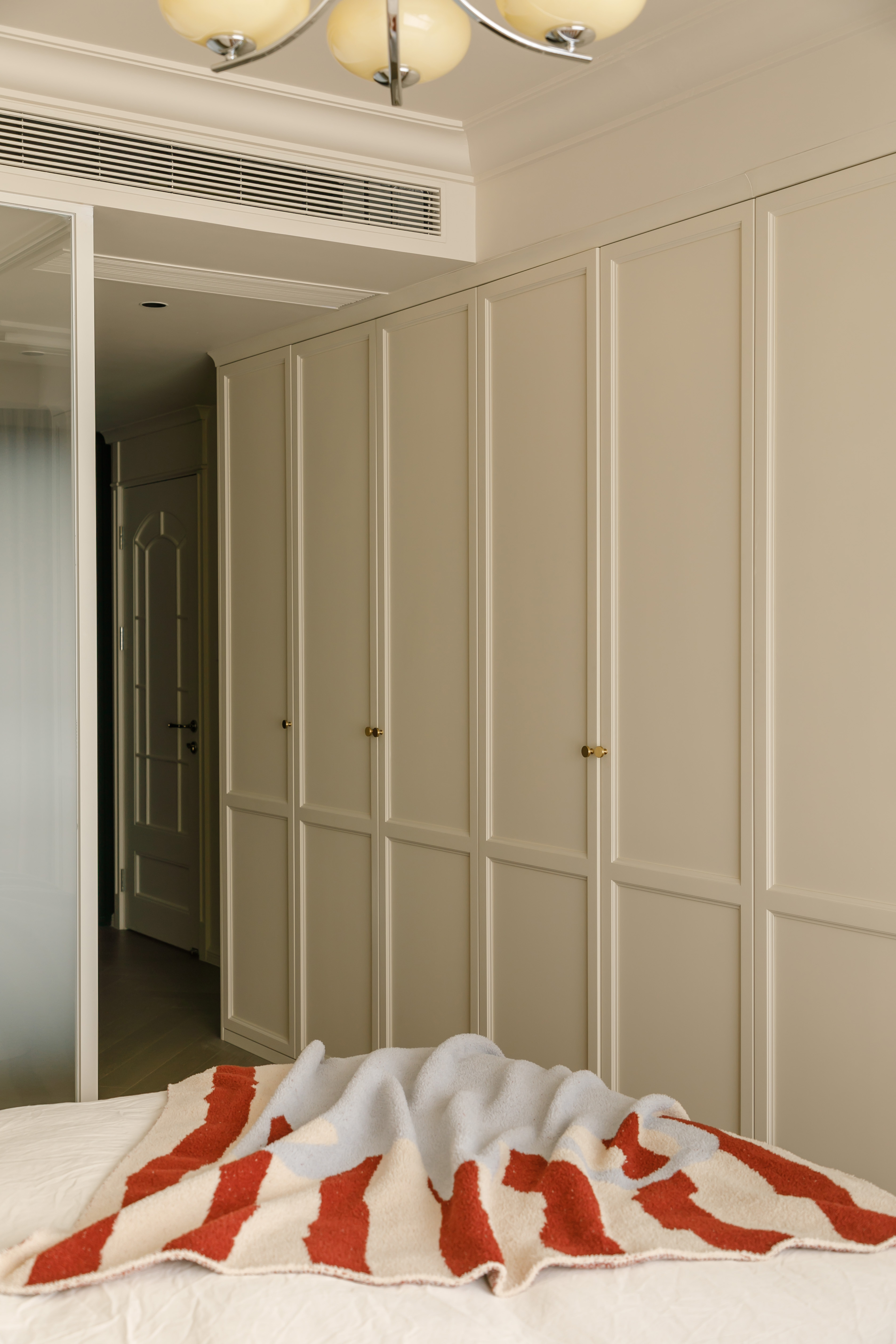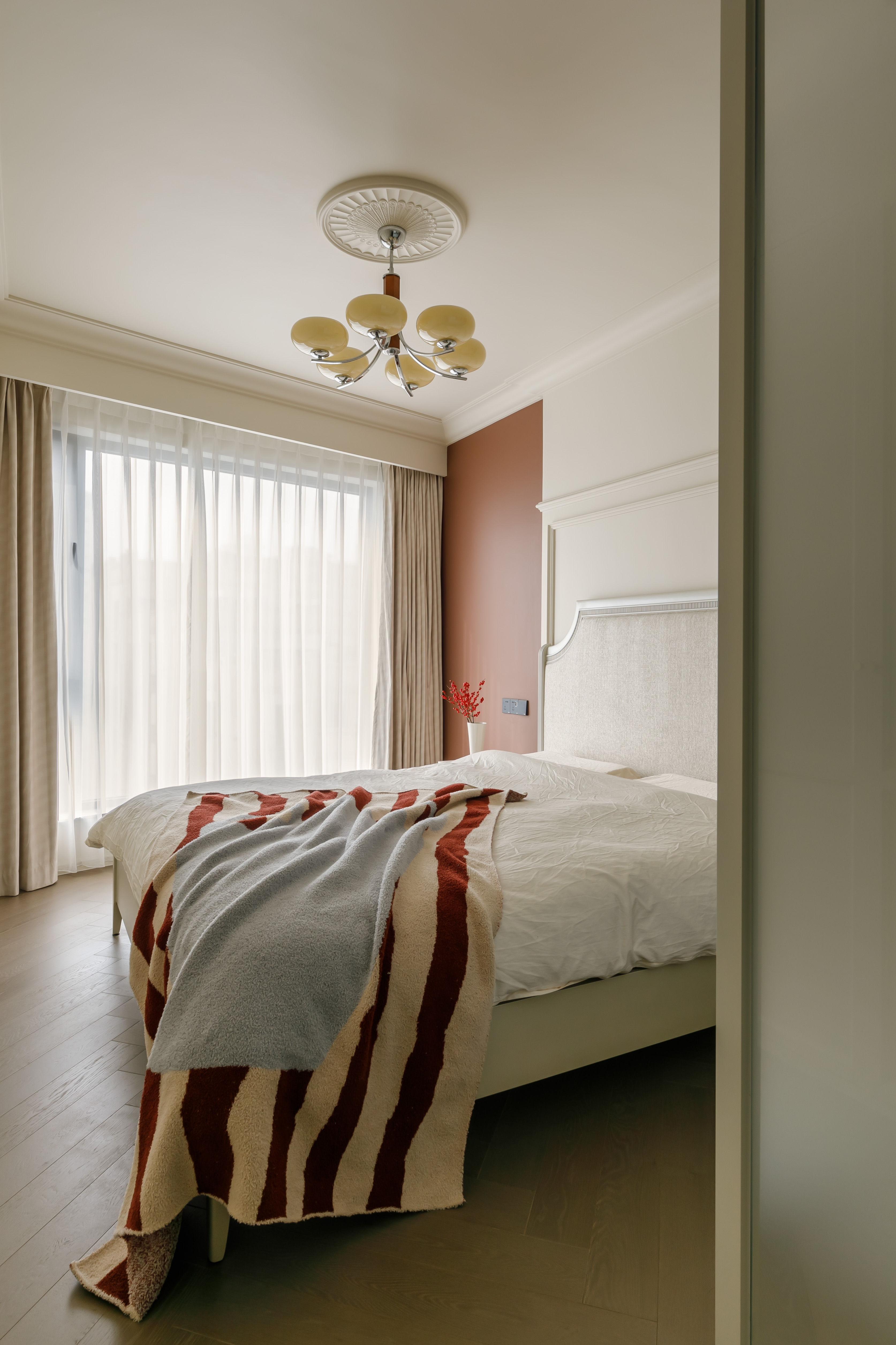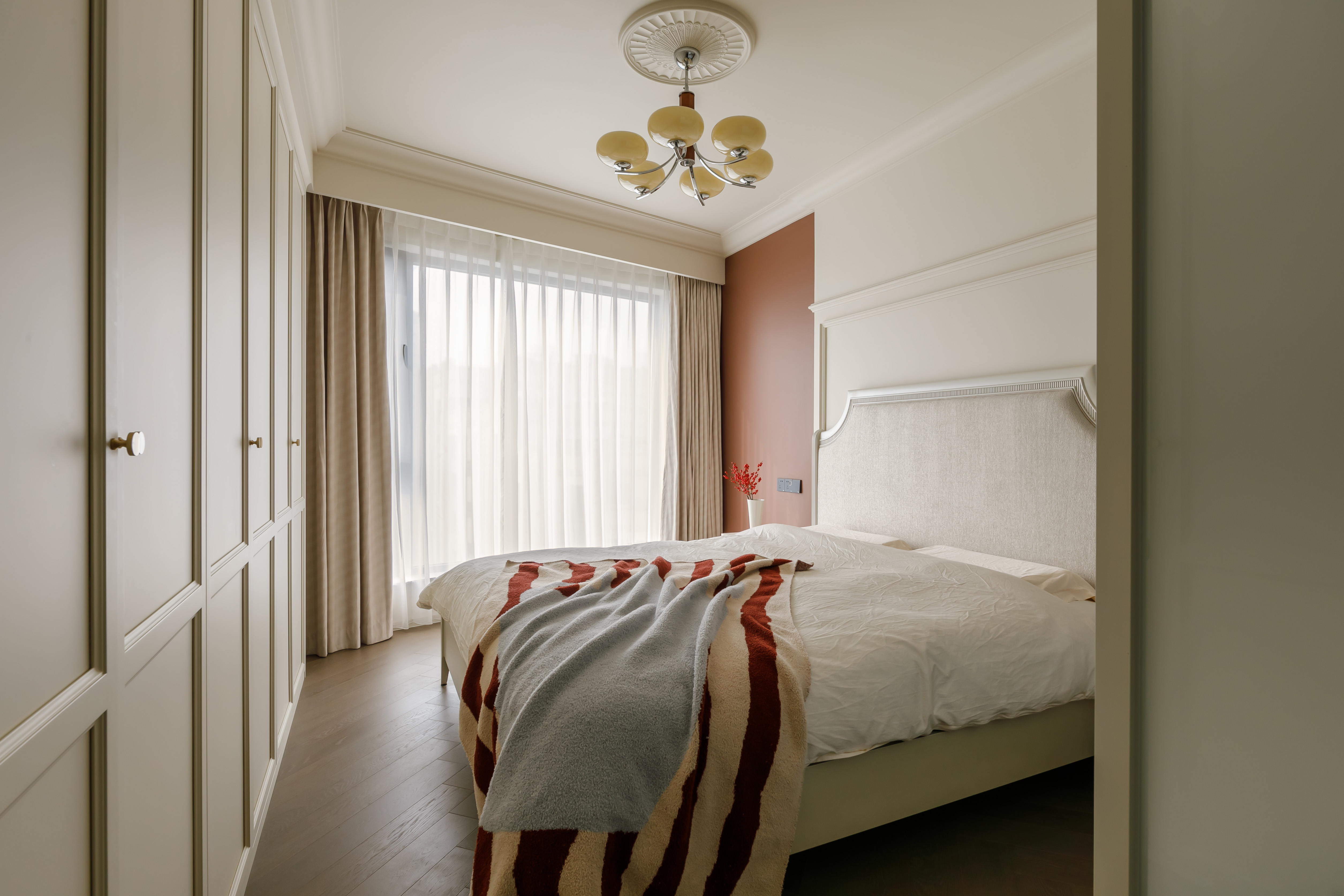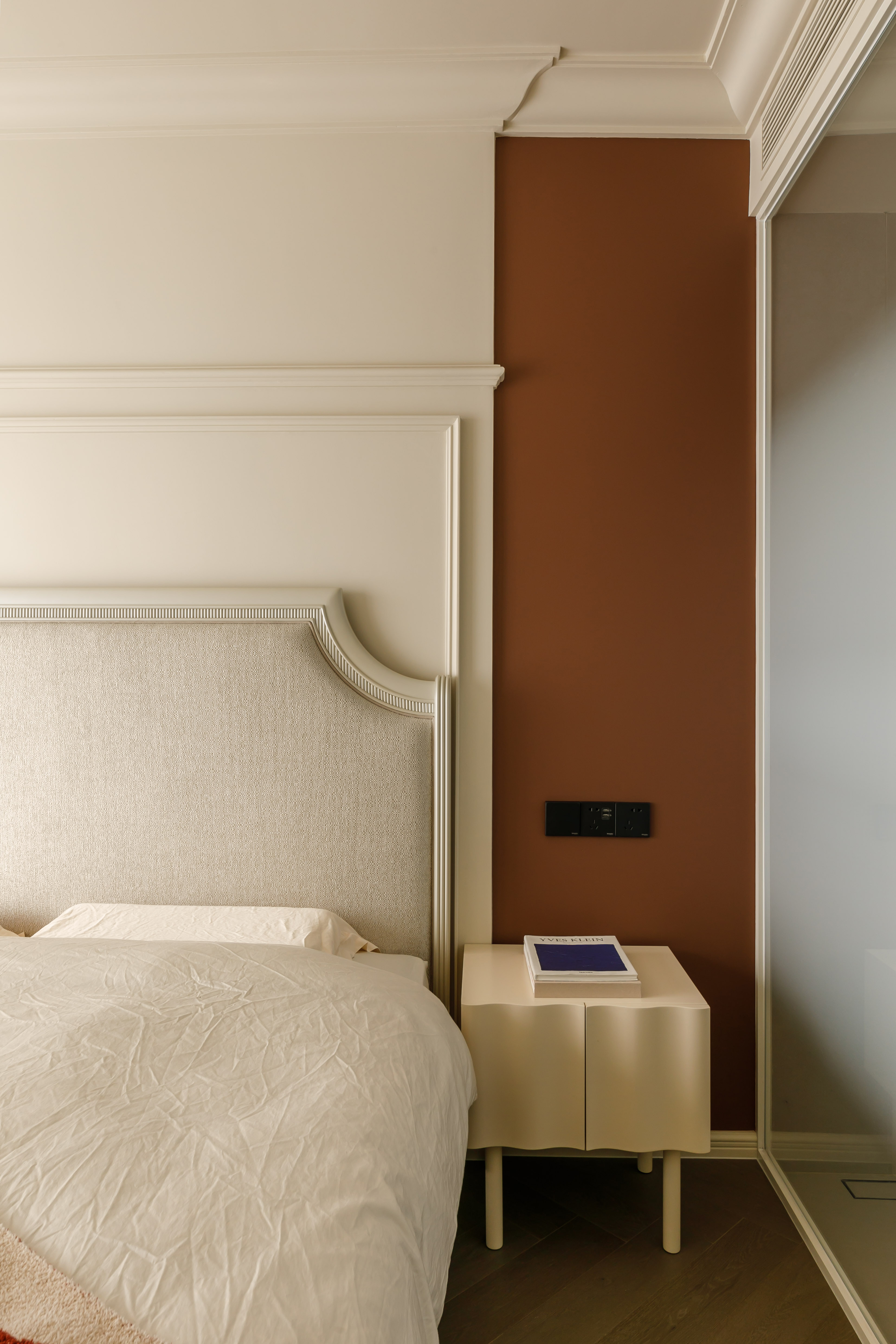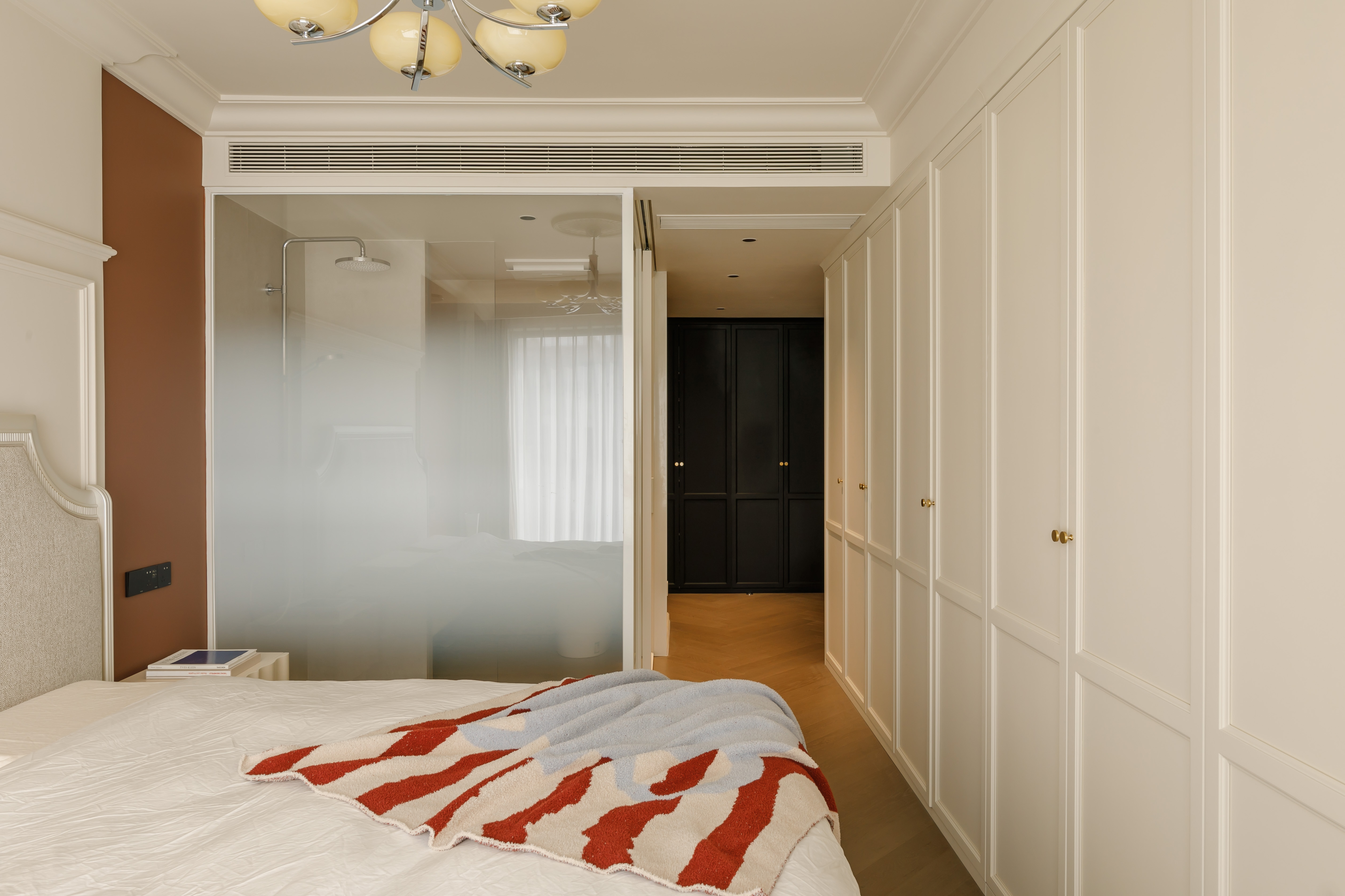 整个主卧空间是女主人喜欢的法式氛围,一抹橘红为整体空间注入了一道浪漫气息。 由于原主卧空间面积较大,“衣帽间+卫生间+睡眠区”最长的跨度达到了惊人的8米,非常狭长,因此,即便我们将主卧整体靠窗移,不仅没有影响主卧空间的舒适体感,反而让主卫更加宽敞。
