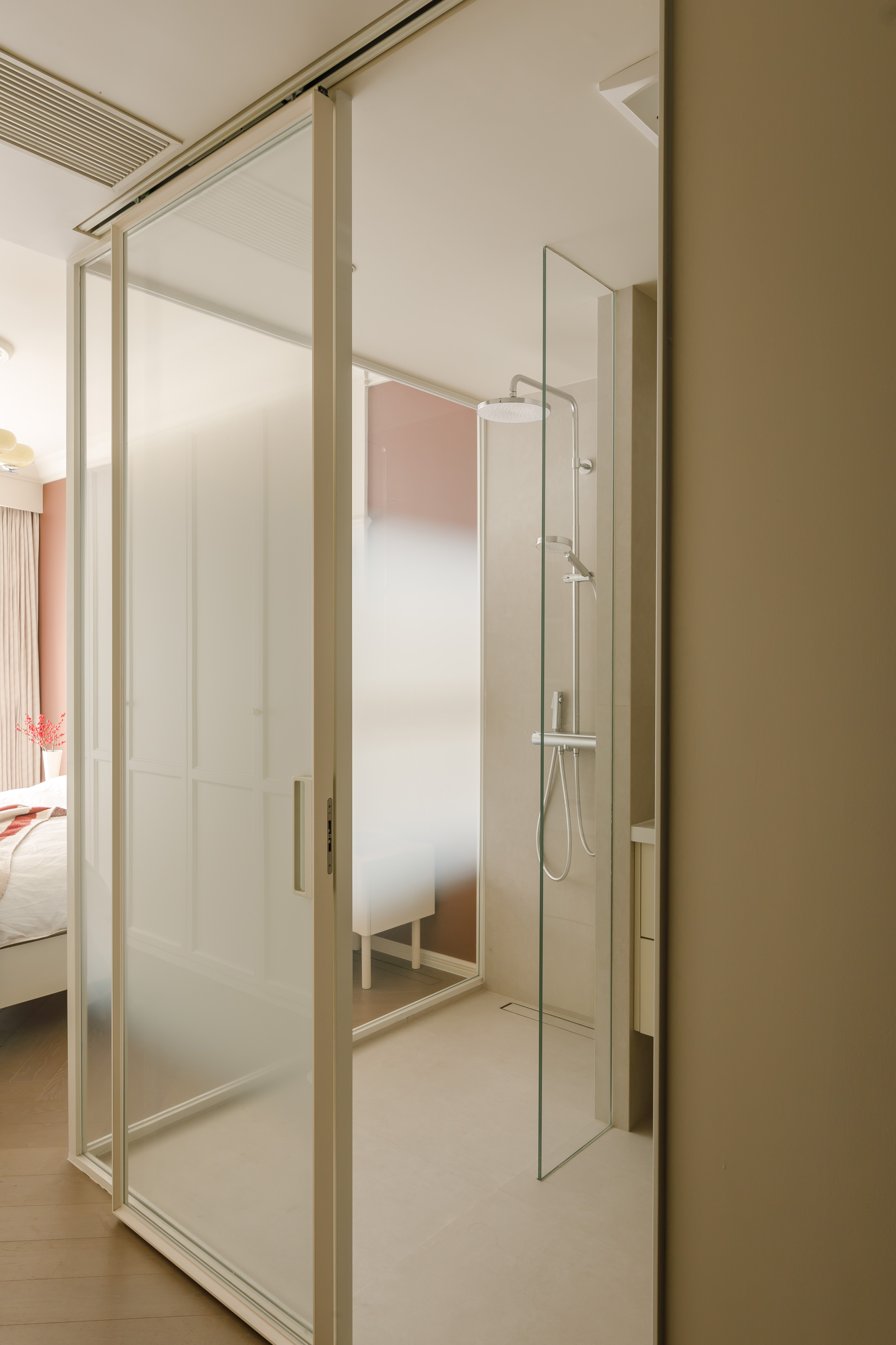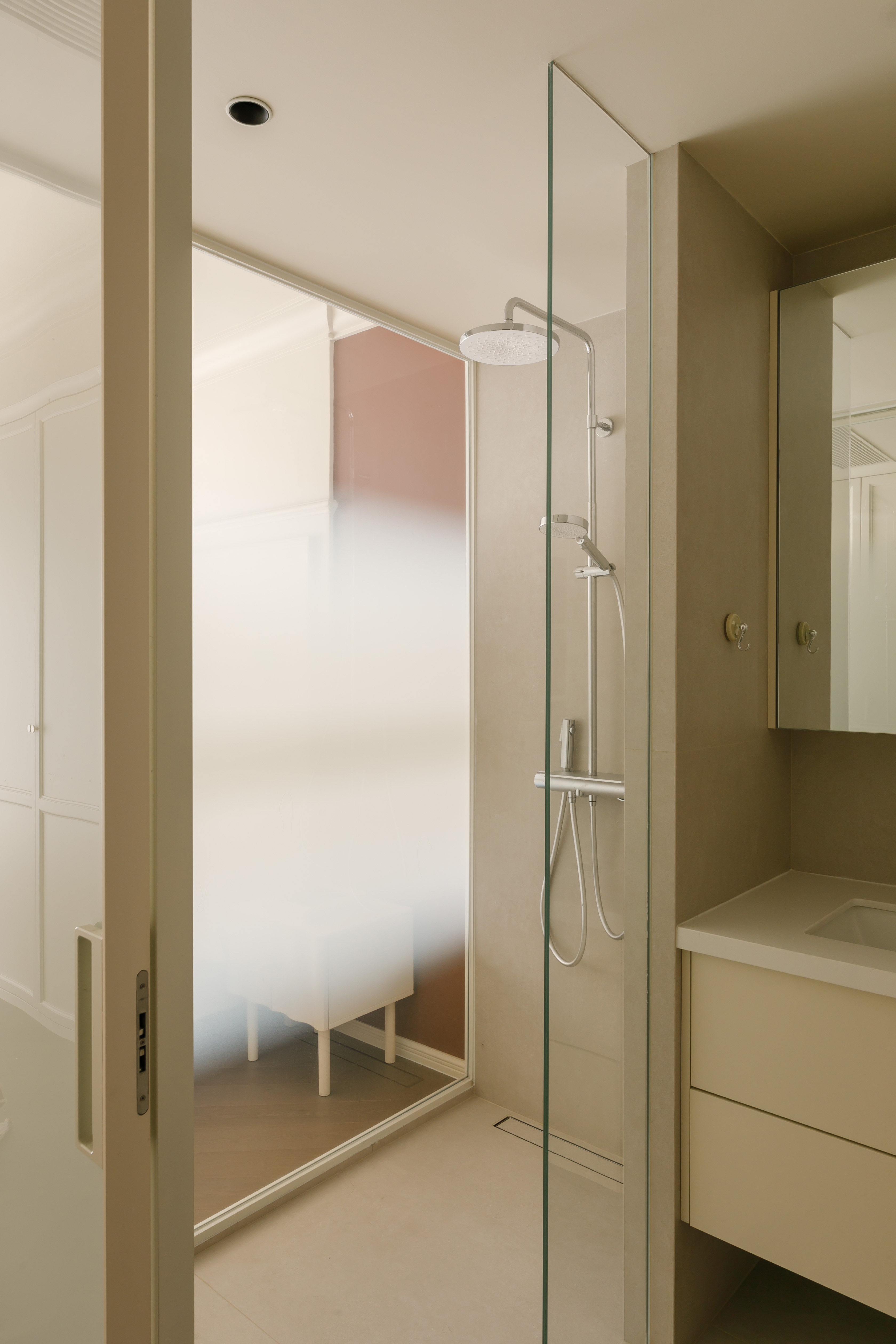 为了防范主卫漏水等隐患,设计之初便为淋浴房做了整体下沉式设计,保留其原始顶面,并在墙顶地全部做了两边防水,玻璃边框全部采用室外防水加固处理。下沉淋浴房巧妙消隐了空间意义上有形的“域”,使湿区与干区之间达成了一种非连续的连续性,开合之间,达成“隔而不隔,界而未界”的状态。