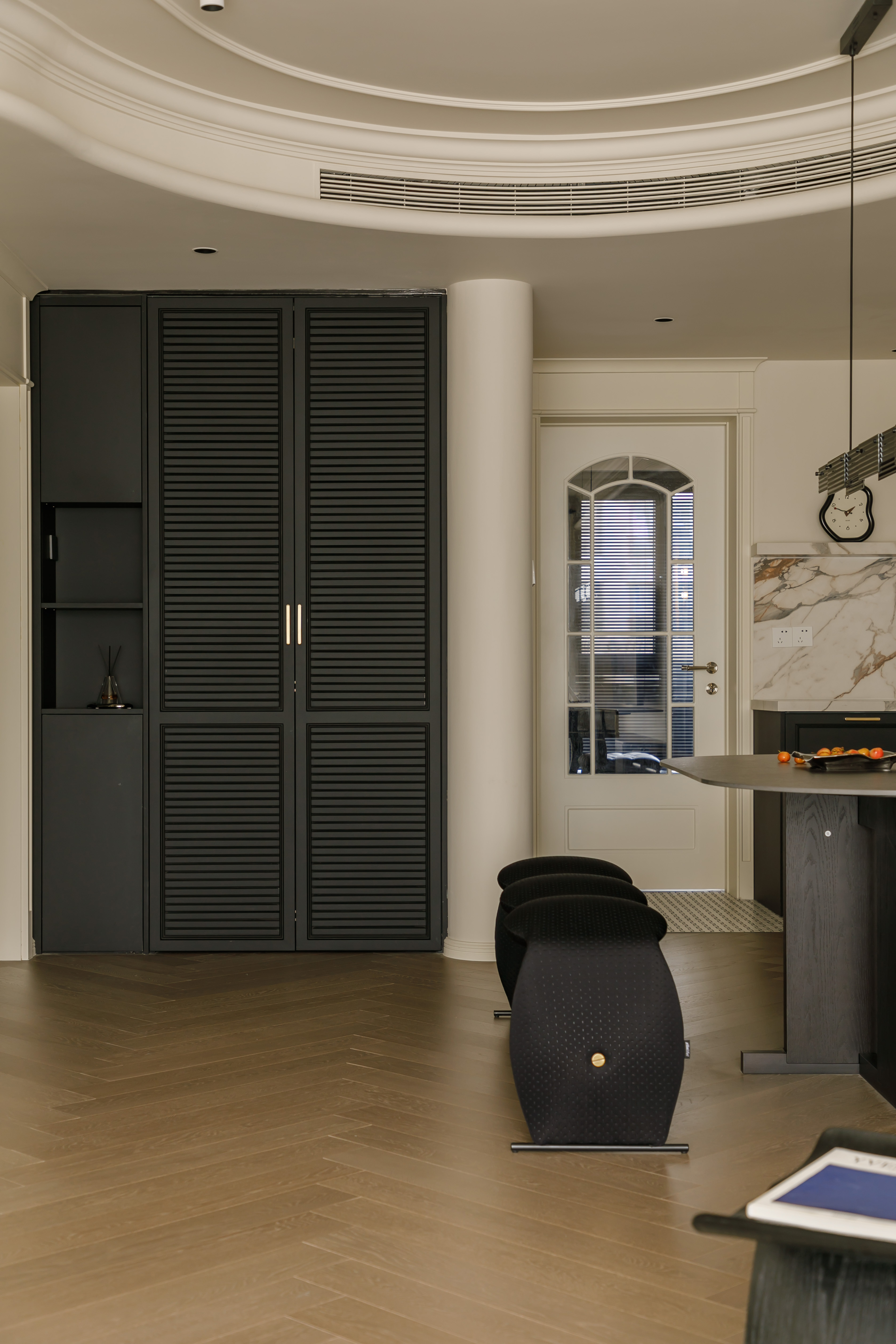 黑色柜体顶天立地嵌入其中,格栅门复古优雅,为空间的中性法式复古氛围定下来基调。