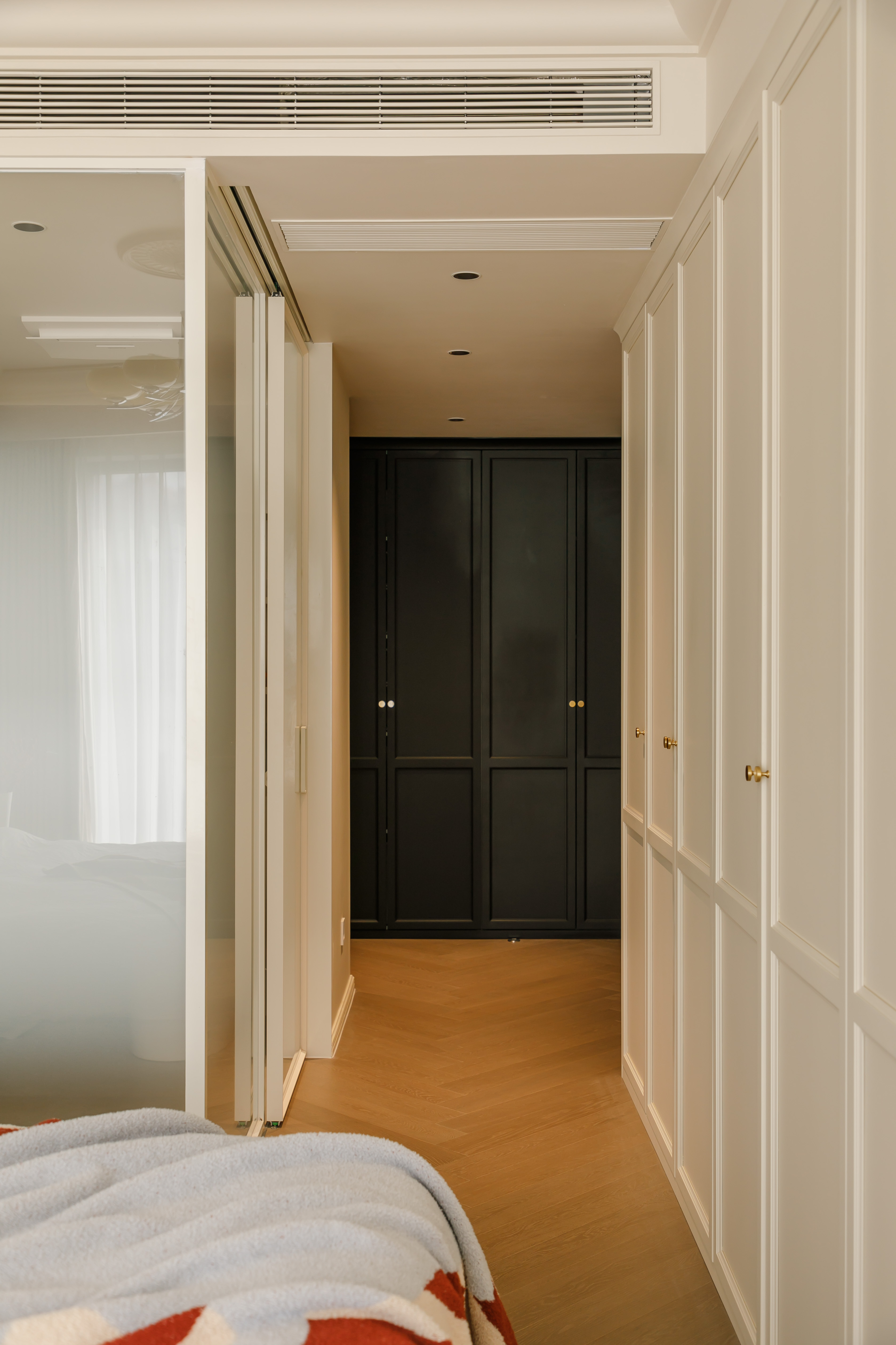镜头拉近,可以看到主卧进门处的衣帽间。一黑一白,一纵一横,两个体块共同构筑了主卧的巨量储物空间。 柜门设计与玄关处柜门属同款,主卧的浮灰和被褥粉尘比较多,所以一般建议用全封闭的柜门。格栅式的还是适用于鞋柜等需要透气的空间。
