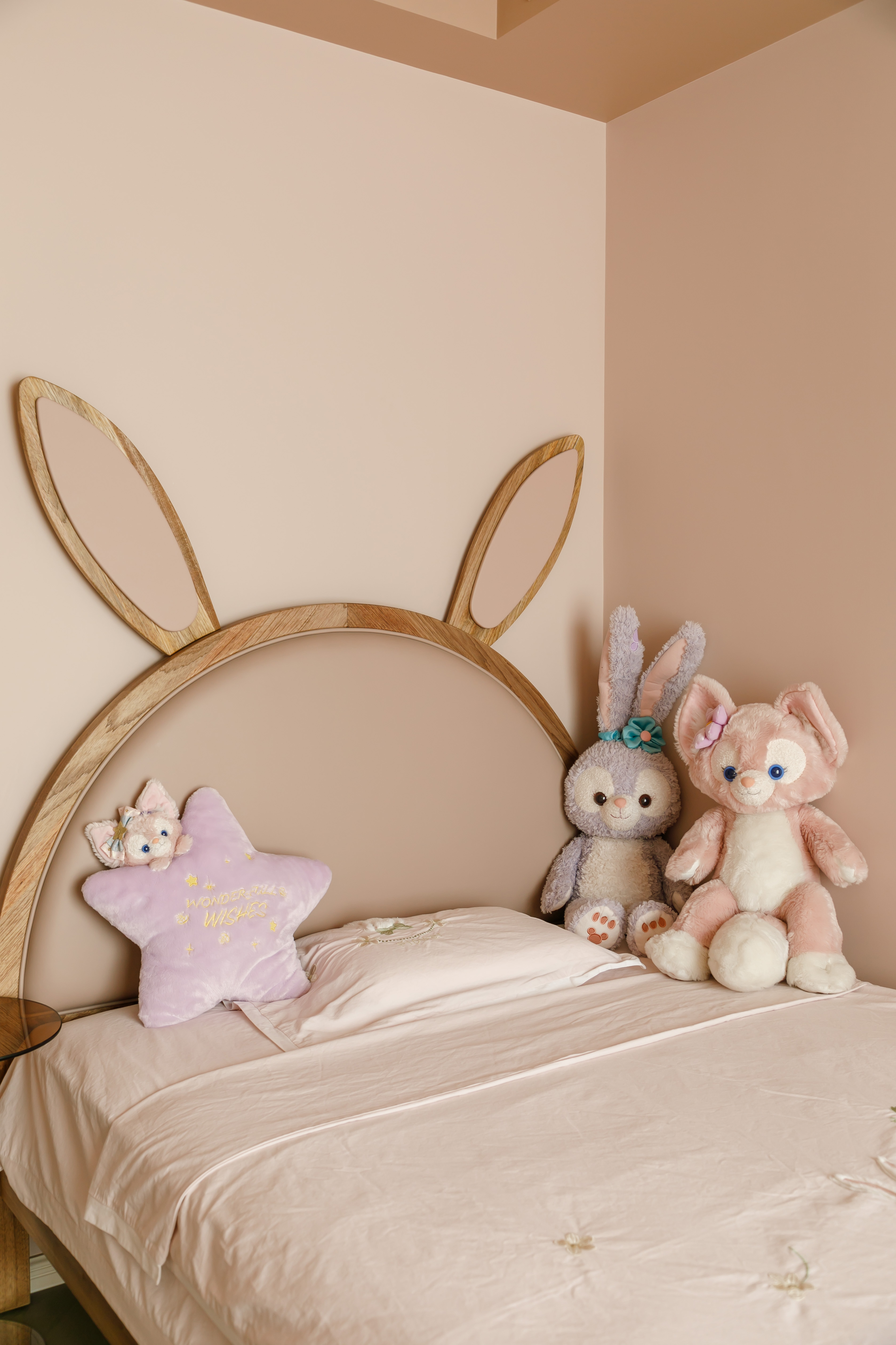 原来的儿童房是个不规则的梯形,床不管怎么摆都有缝隙,所以特地做了兜方处理,将床和衣帽柜一侧的墙拉直,让空间成为一个规整的长方形。这样,女儿喜欢的兔兔床就能严丝合缝的靠墙摆放啦~~