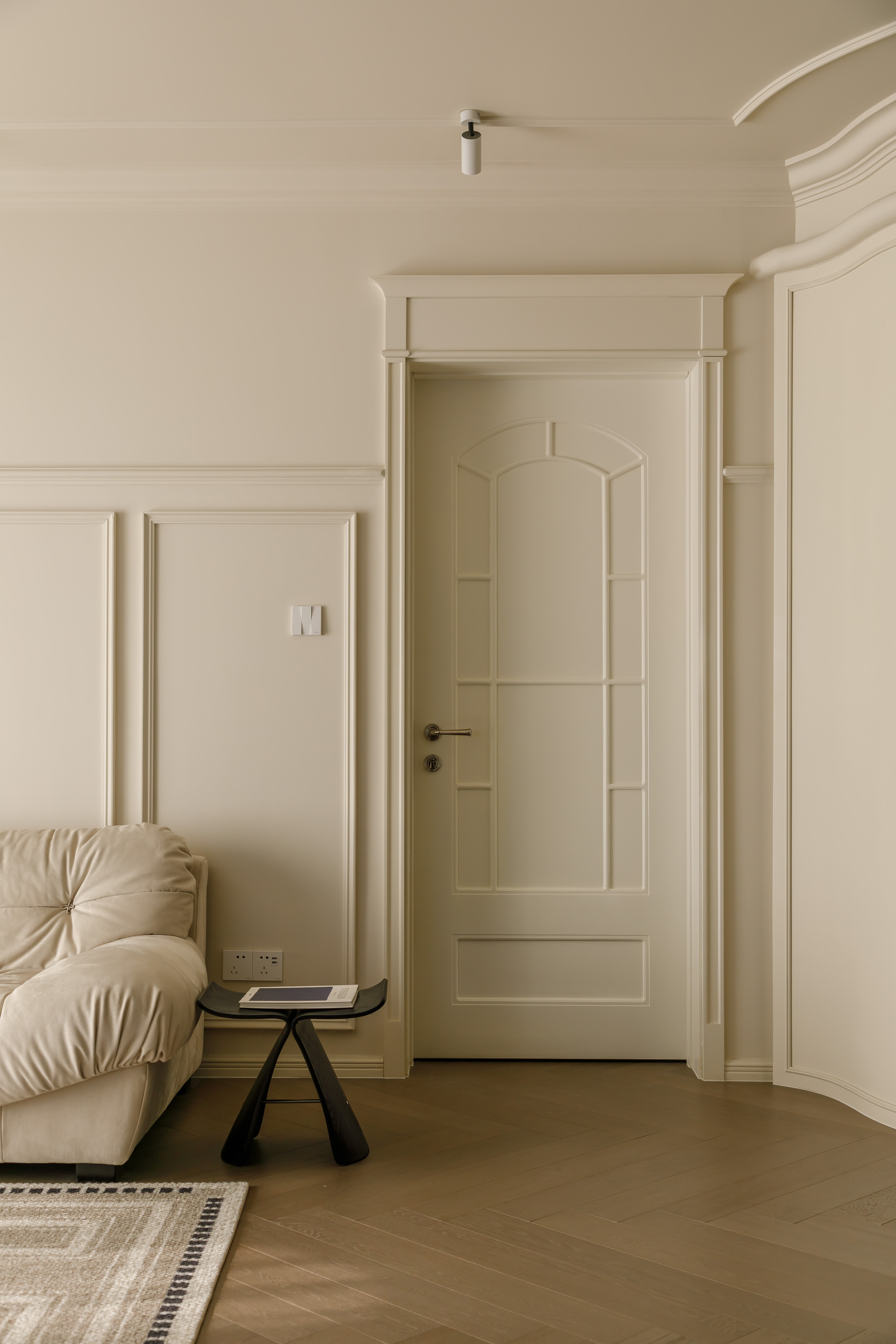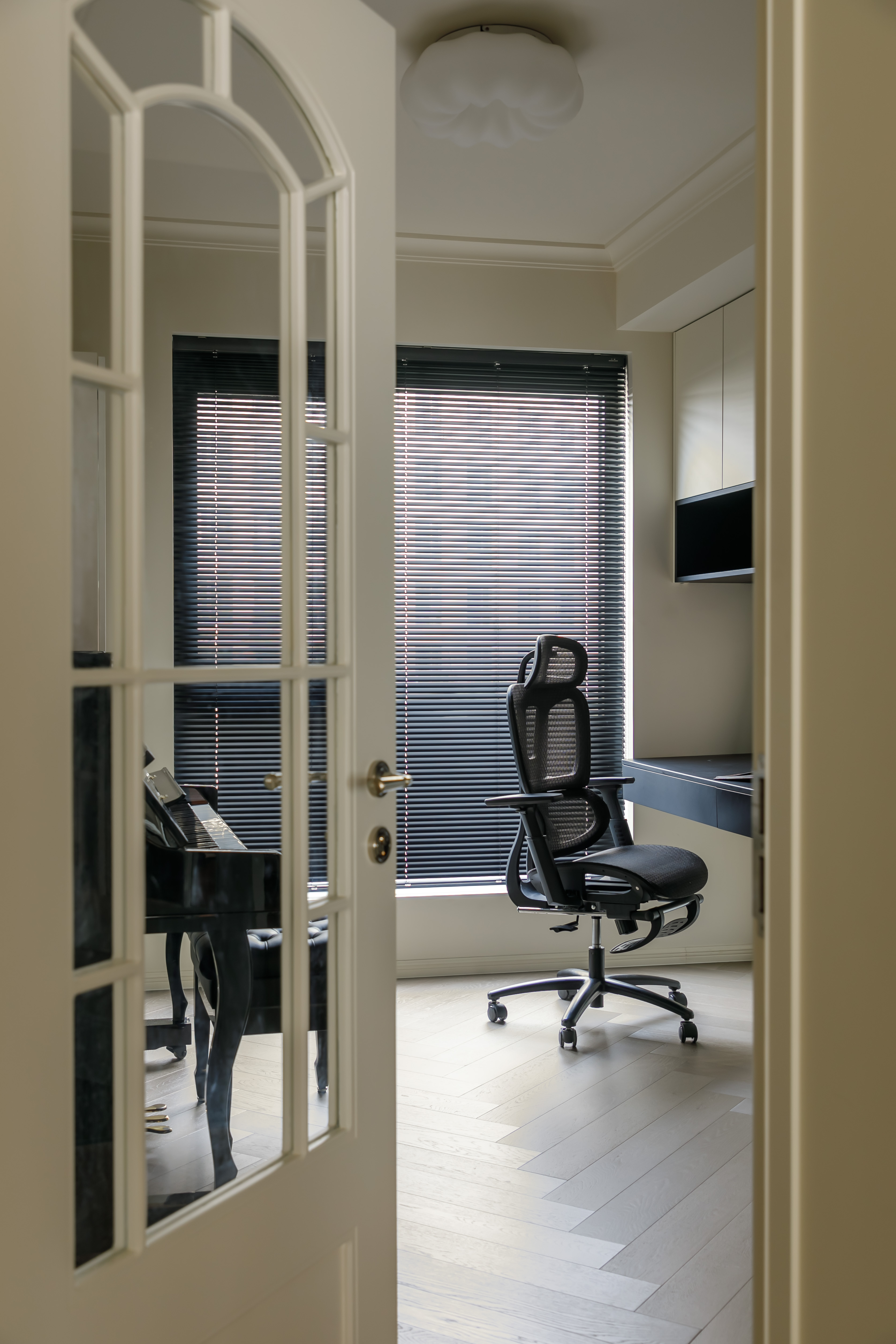 书房朝北。由于空间整体狭长,为了增加采光,特地为书房门设计了一款半透明的法式木框门,到顶门头、门上花纹和线条跟主卧门都是一模一样的,只是这里改成了半木半玻