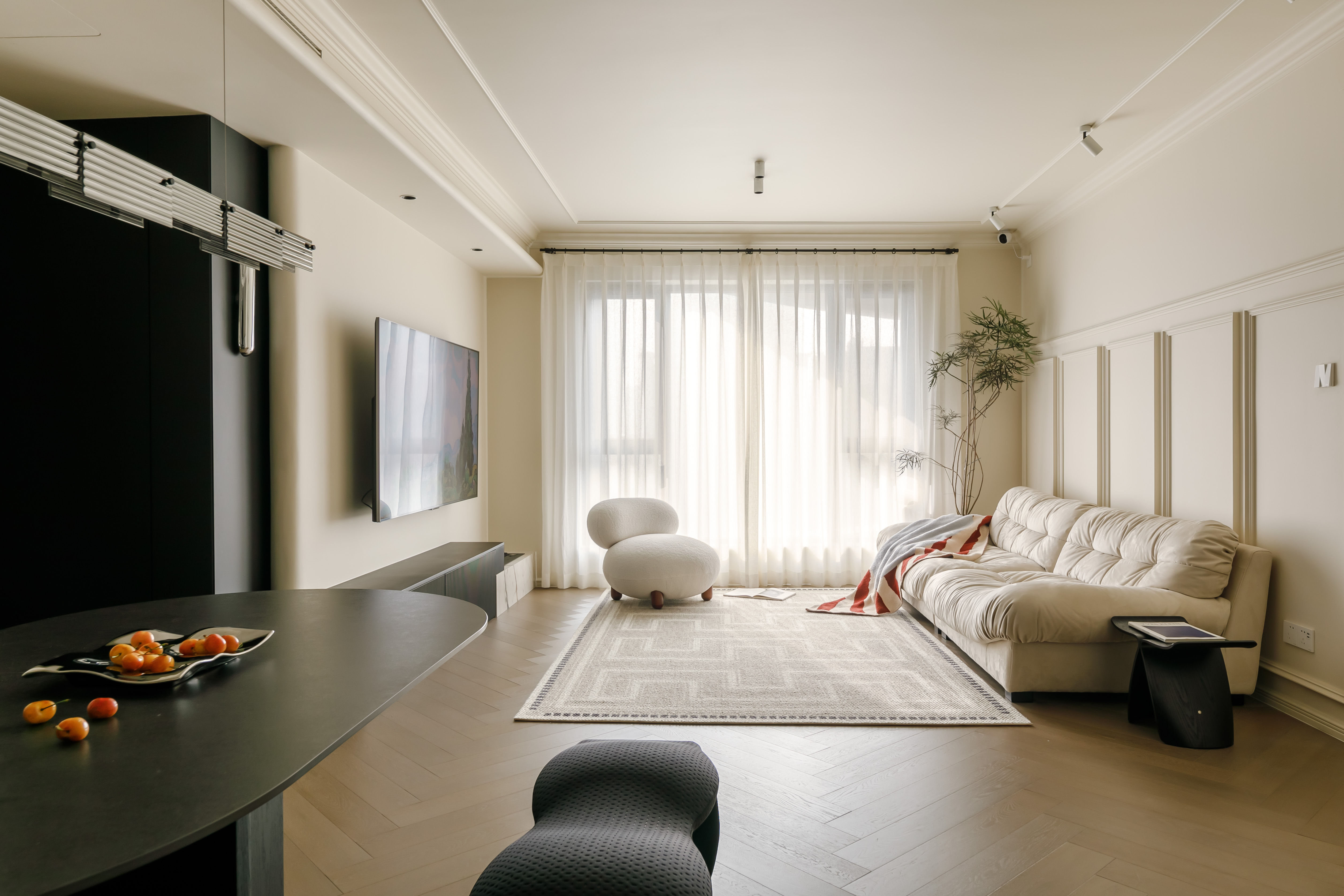视线转向另一侧,视野突然明亮开阔起来,客厅因为电视背景墙的拓宽而变得更加宽广。奶白色皮沙发和羊毛单人椅,与木色的完美融合,营造出一种温柔而浪漫的氛围,透露出一种自由自在的生活态度。