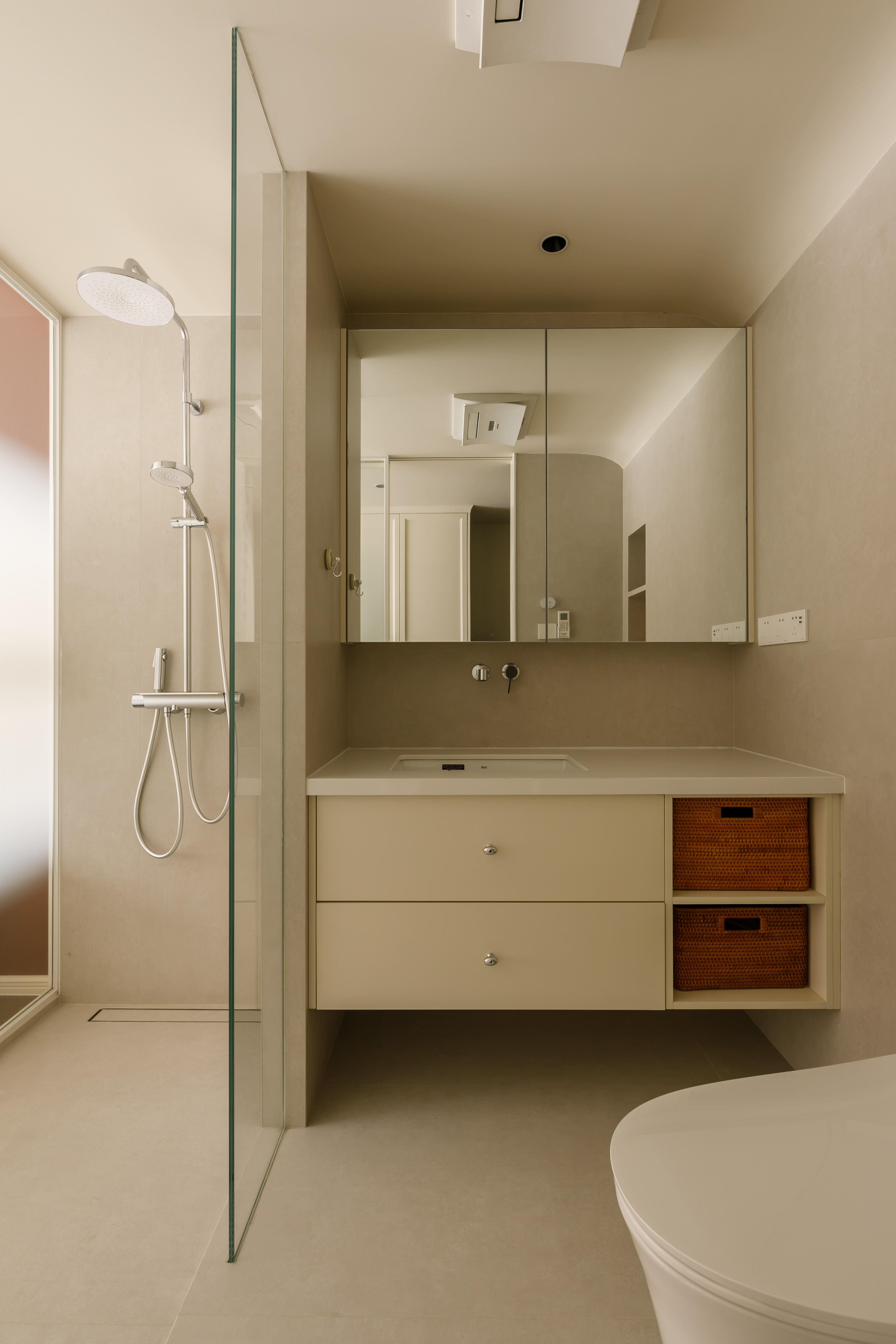 主卫依旧是奶白色系。镜柜和台盆柜各自承担着不同的储物功能,极简线条和上下留缝的设计,让低层高的卫生间显得不那么压抑