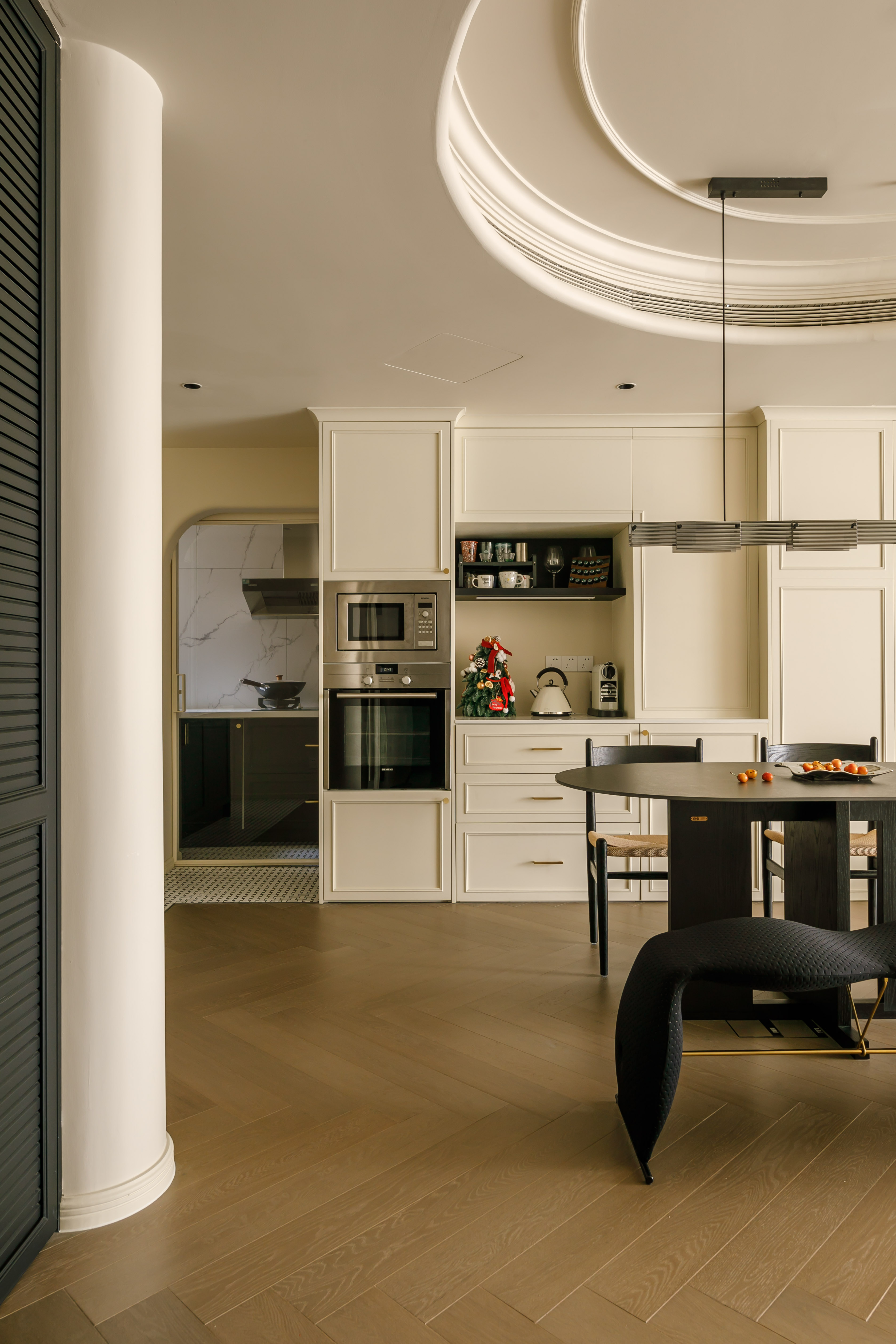入户即餐厨,开敞的空间一秒入画。空间氛围的营造即空间的艺术,从进门这一刻便开启了艺术的叙事之旅。 推开门以圆形立柱和陈列柜的形式打造入户玄关,为了弱化承重墙的体量感,我借鉴了罗马柱的设计思路,用圆润的造型创造出轻松的氛围。同时,用它的张力支撑起整个曲线吊顶,成为视觉中心。